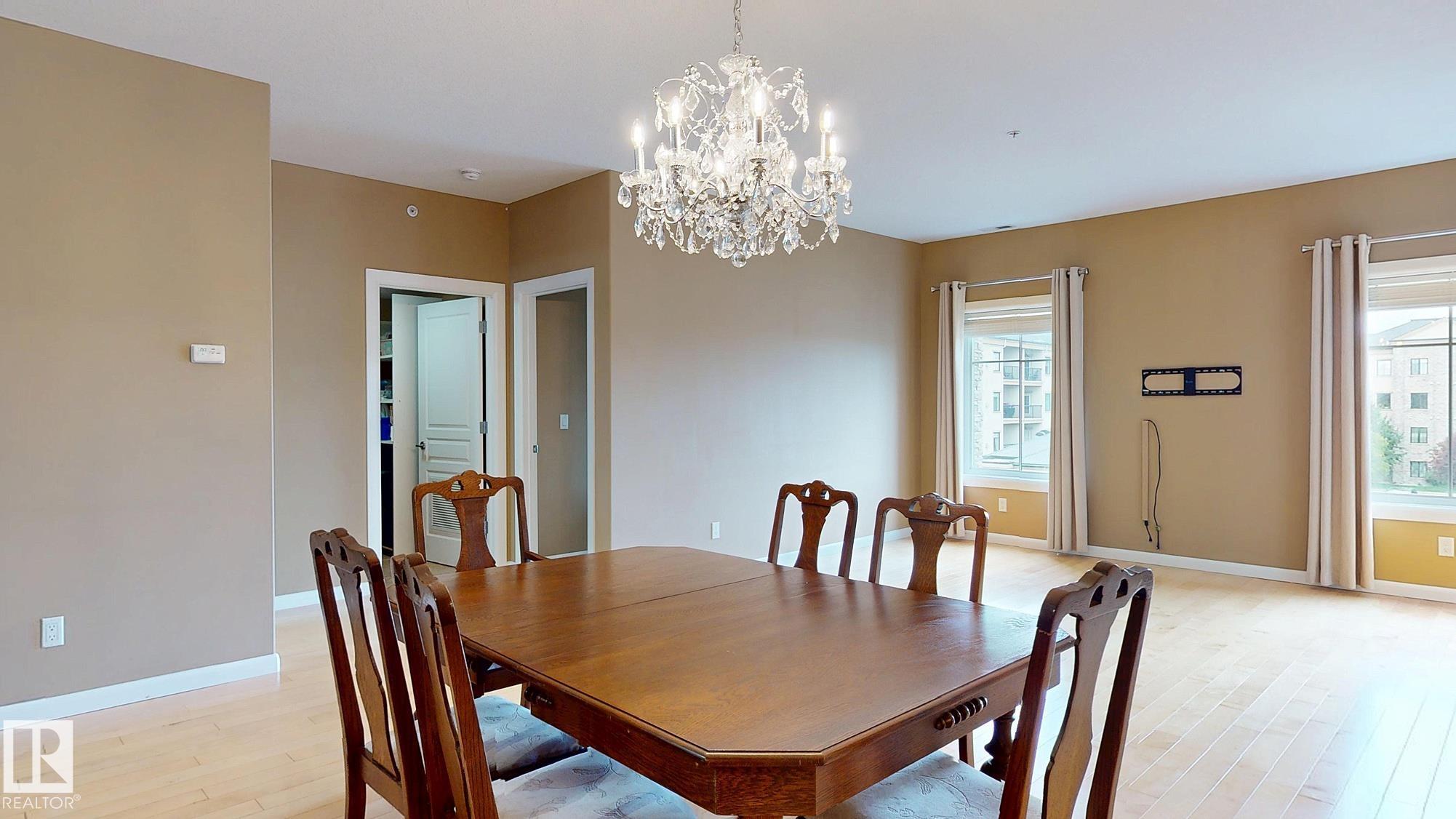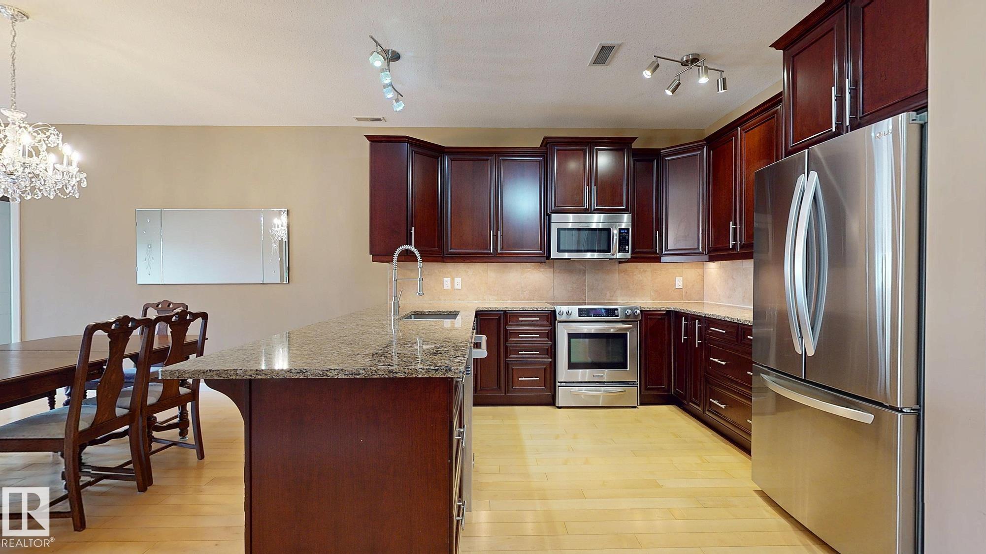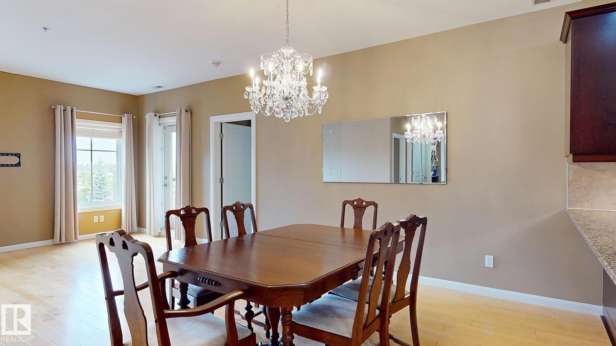 A rare find in MAGRATH MANSION! This beautiful EXECUTIVE (18+) condo features 2 bedrooms, 2 bath + DEN. Plenty of natural light throughout with an open concept floor plan and 9 foot ceilings offer an airy feeling throughout. The spacious kitchen boasts attractive cherry wood cabinetry with granite countertops and stainless steel appliances. The dining area will accommodate a large table + China cabinet for entertaining. There is an in-suite laundry/storage room. Primary bdrm features a 4 pce ensuite with jetted tub PLUS a huge walk-in closet. Private west facing balcony access from LR and bedroom. Amenities include gym, sauna, hot tub, theatre, outdoor entertainment area with fireplace & social room. Steel & concrete building with fan coil heating and cooling system. Heated underground titled parking with storage locker & convenience of a car wash. SECURE building, all professionally managed. Walking distance to ample Shopping, restaurants, Magrath Creek Park and Ravine with lots of walking trails!