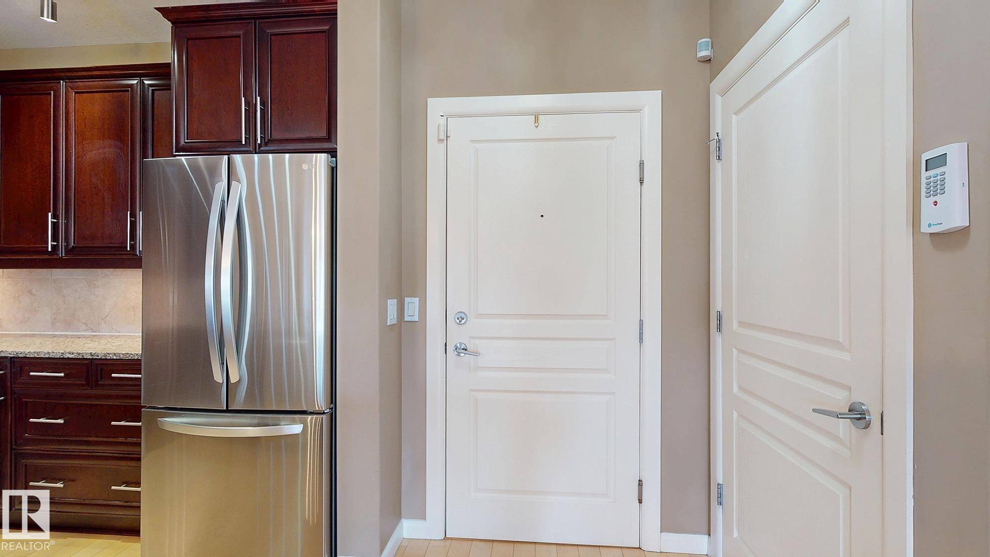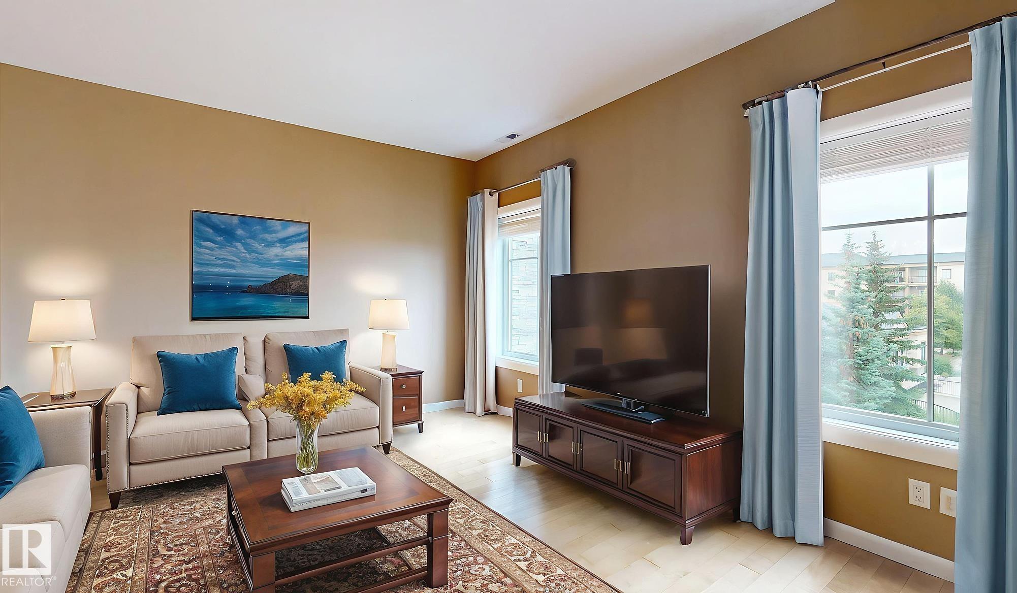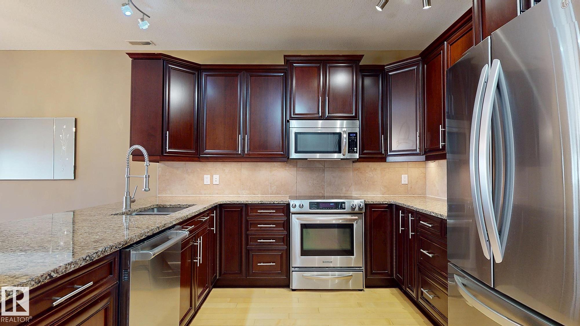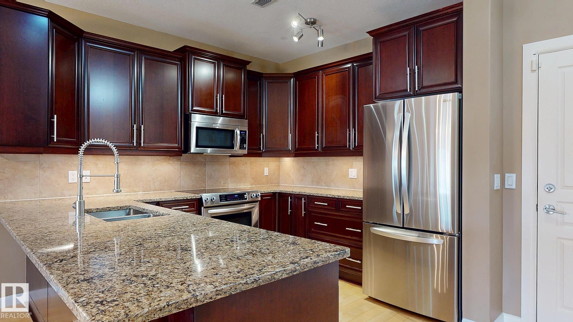 A rare find in MAGRATH MANSION! This beautiful EXECUTIVE (18+) condo features 2 bedrooms, 2 bath + DEN. Plenty of natural light throughout with an open concept floor plan and 9 foot ceilings offer an airy feeling throughout. The spacious kitchen boasts attractive cherry wood cabinetry with granite countertops and stainless steel appliances. The dining area will accommodate a large table + China cabinet for entertaining. There is an in-suite laundry/storage room. Primary bdrm features a 4 pce ensuite with jetted tub PLUS a huge walk-in closet. Private west facing balcony access from LR and bedroom. Amenities include gym, sauna, hot tub, theatre, outdoor entertainment area with fireplace & social room. Steel & concrete building with fan coil heating and cooling system. Heated underground titled parking with storage locker & convenience of a car wash. SECURE building, all professionally managed. Walking distance to ample Shopping, restaurants, Magrath Creek Park and Ravine with lots of walking trails!