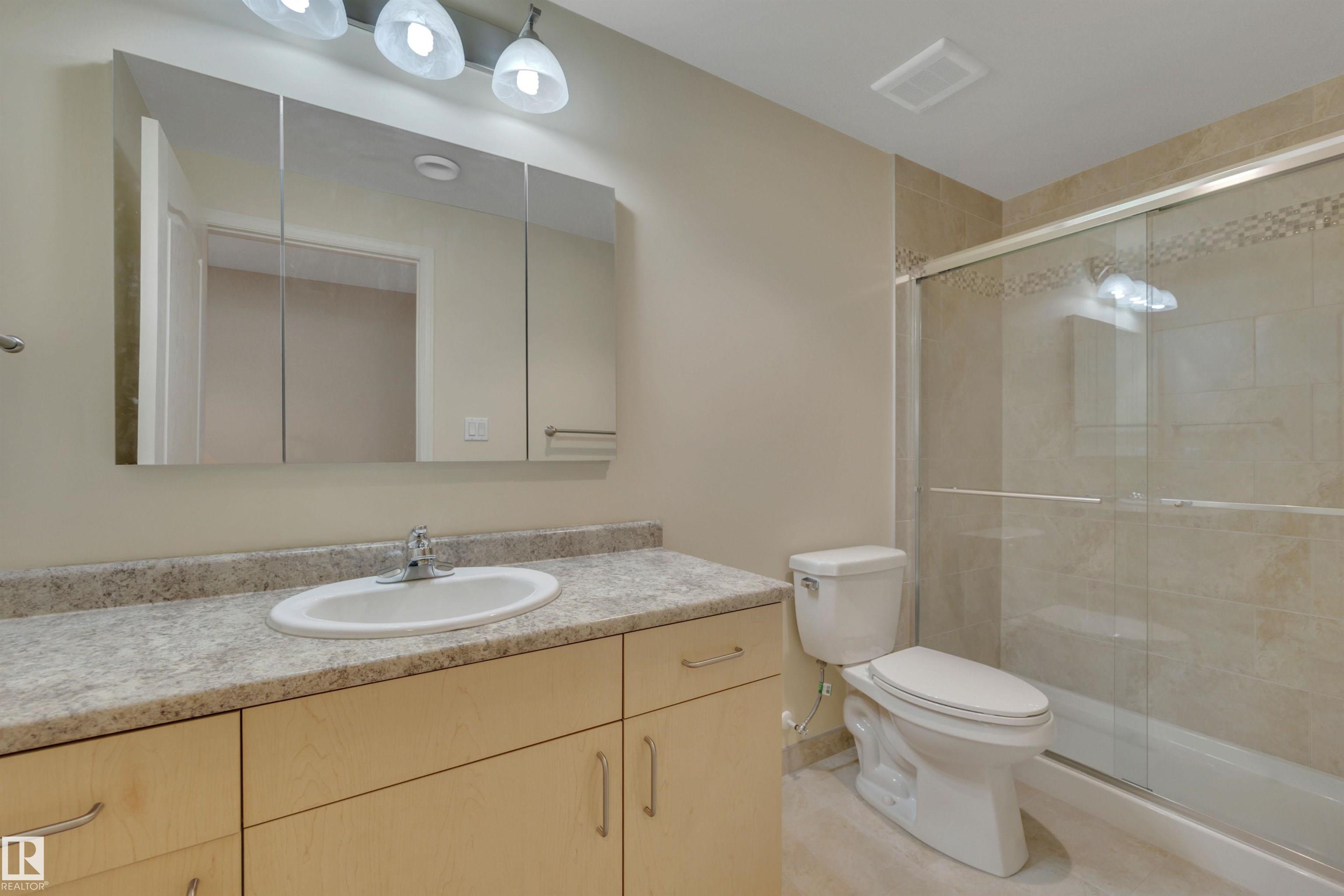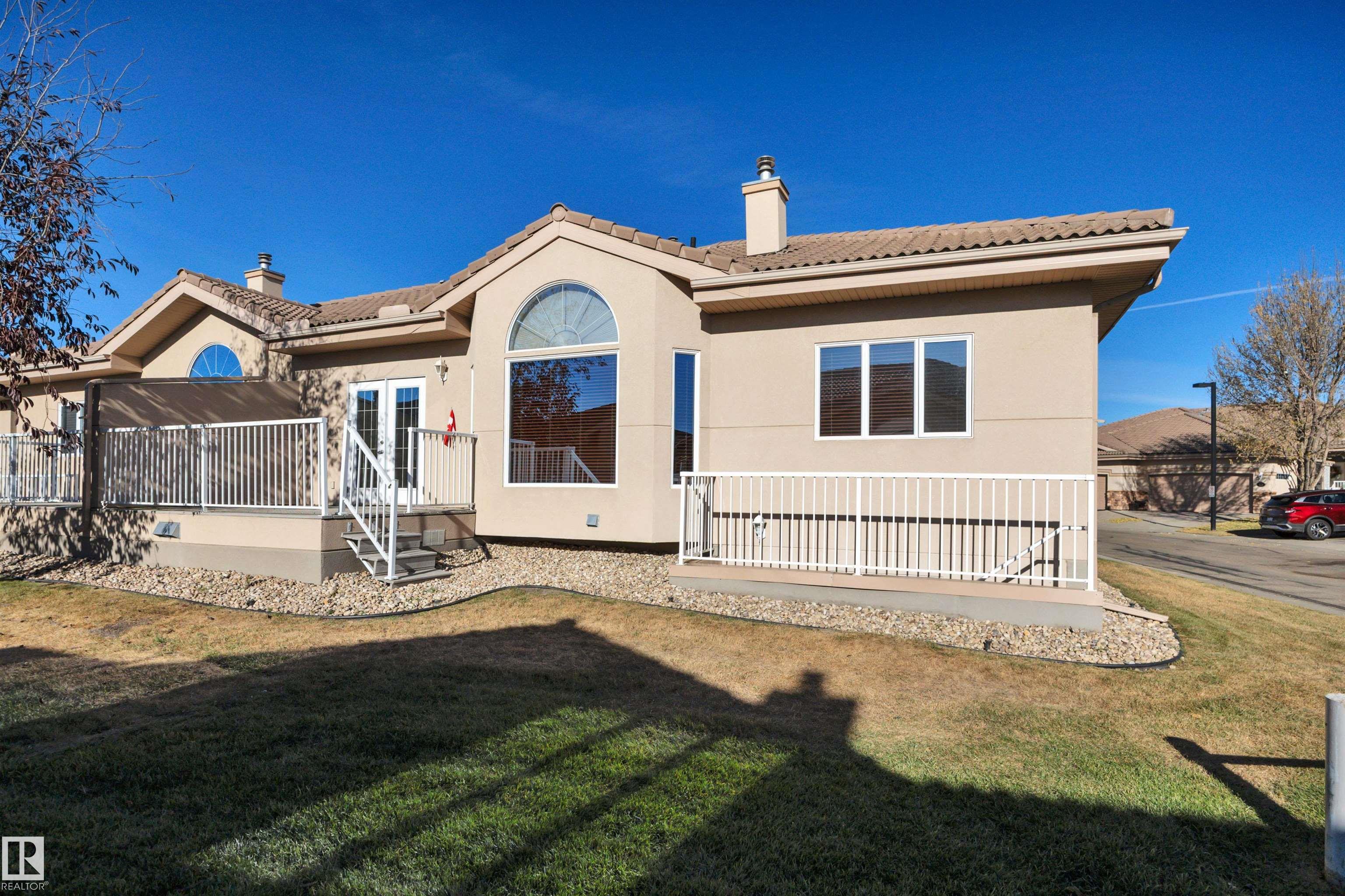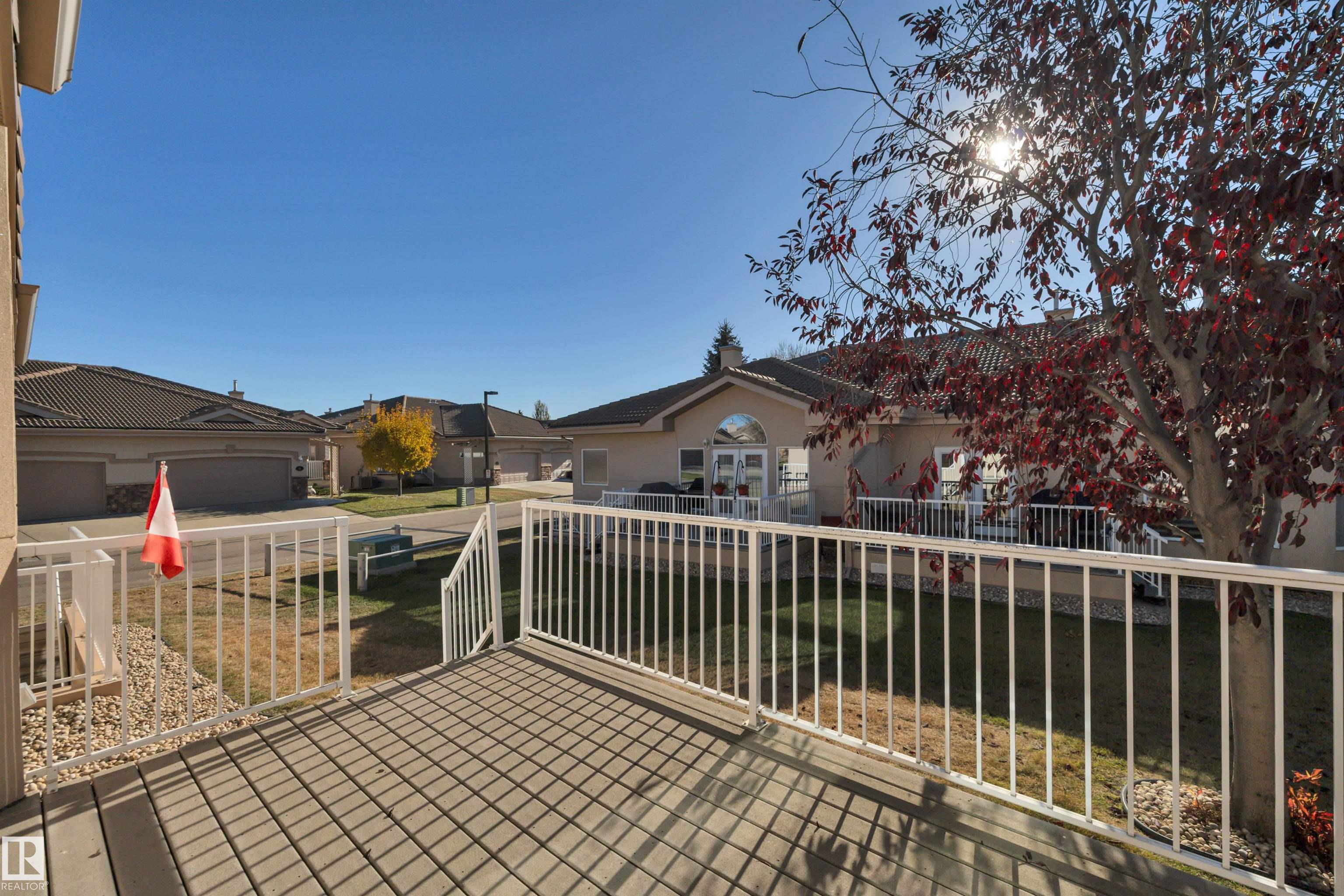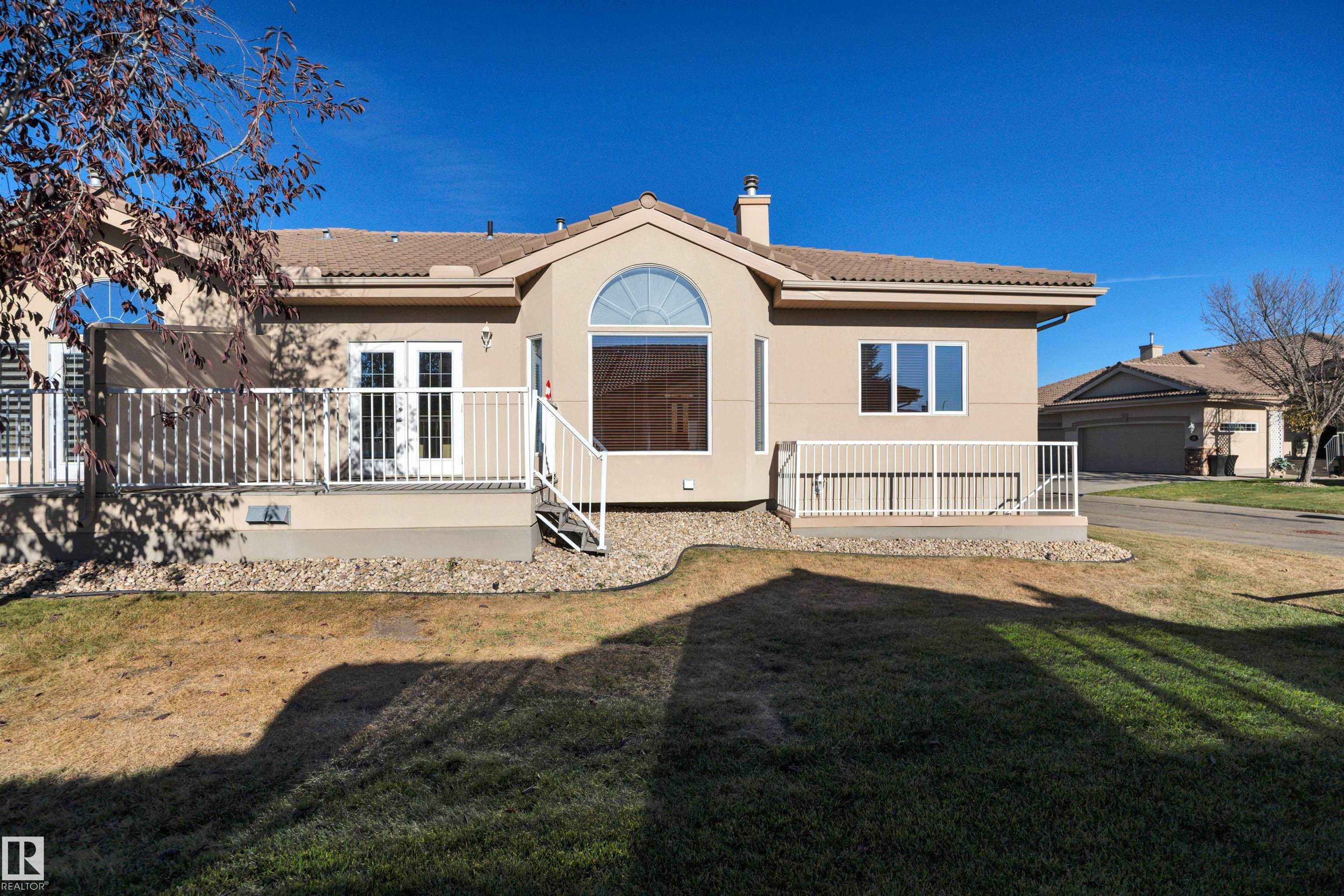 DOWNSIZING? EMPTY-NESTER? Carlton Villas on the Lake, one of Edmonton?s best 18+ adult BUNGALOW DUPLEX with acrylic stucco, irrigation, clay tile roofing. Close to shopping, public transport, walking trails, & Henday. Larger End Unit Condo is 1330sf of living space, with kitchen, living rm & dining rm all sharing one large space. Kitchen is a great functioning work space with lots of GRANITE counterspace & ample storage. Also able to look out onto the SOUTH BACKING green space off the deck while in the kitchen. Living rm is generous with gas fireplace with mantel & patio doors to the deck. Primary bedroom has massive walk in closet & spacious ensuite. Nice sized 2nd bd/den, spacious 4pc bath along with MAIN FLOOR LAUNDRY to round off the main floor. Basement is COMPLETELY DEVELOPMENT (+/-$100k 2016) with 3rd Bd, 4pc bathroom, & large rec room with the walkout to the backyard. PERFECT FOR GUESTS! Double garage is insulated WITH EXTRA LARGE DRIVEWAY. Complex is Pet friendly with low condo fees!