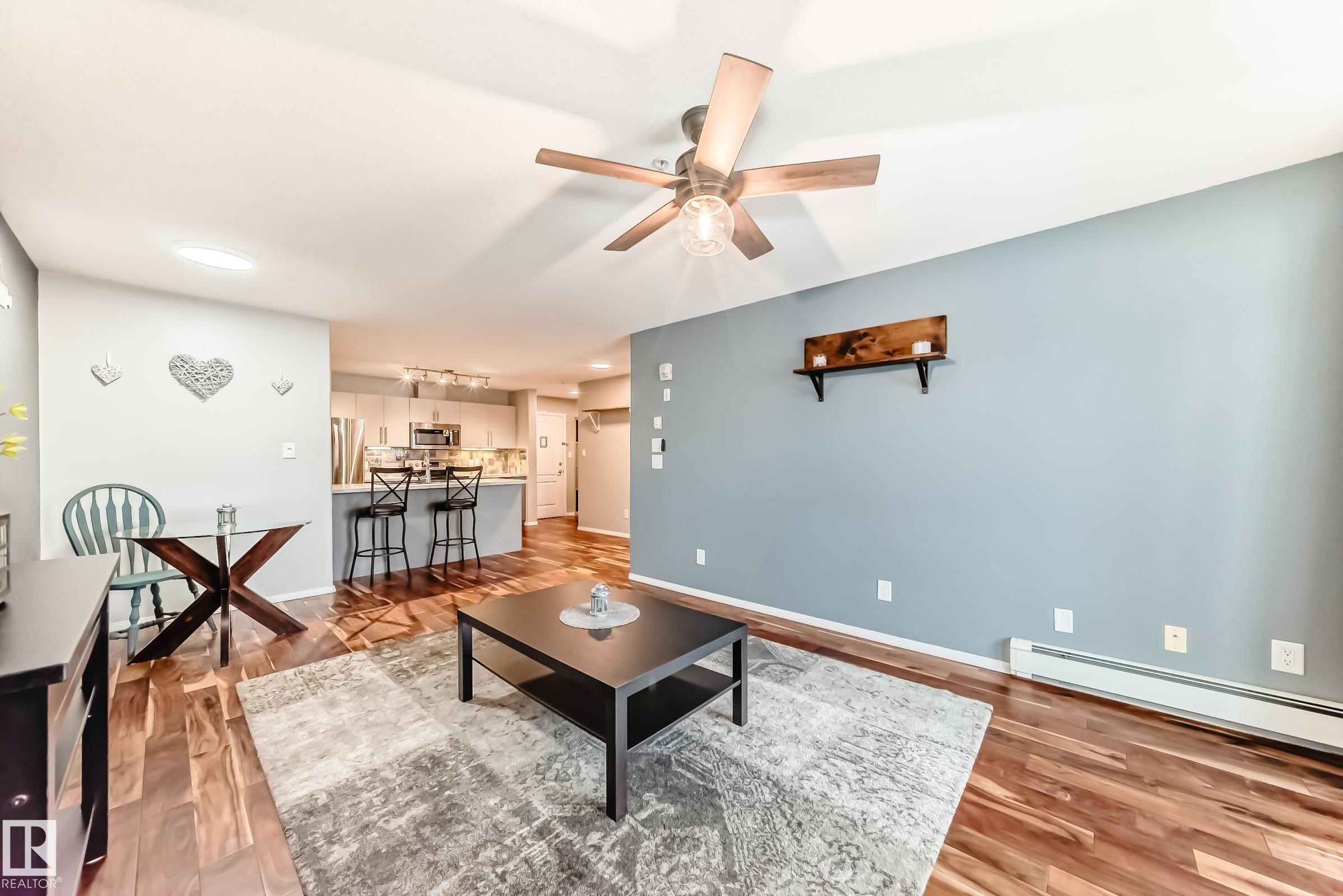 STUNNING & beautifully RENOVATED 1 bedroom, 1 bathroom condo in The Ravines at Hermitage with TWO TITLED parking stalls?one heated underground with storage and one covered, energized surface stall near the front entrance. Extensive renovations include new sinks, upgraded laminate countertops with eating bar, ceramic tile backsplash, modern hardware, soft-close drawers, resurfaced cabinetry, and custom pots & pans drawers. Gorgeous engineered hardwood flooring flows through the living area, kitchen, and bedroom, with durable vinyl plank in the bathroom and laundry room. All closets feature custom built-ins and new doors. Windows and patio doors are tinted to protect the hardwood. Enjoy the private deck with tile flooring and a natural gas BBQ line. Condo fees include heat and water. Small pets allowed with board approval. Fantastic location close to ravine trails, shopping, Yellowhead Trail, and Anthony Henday.