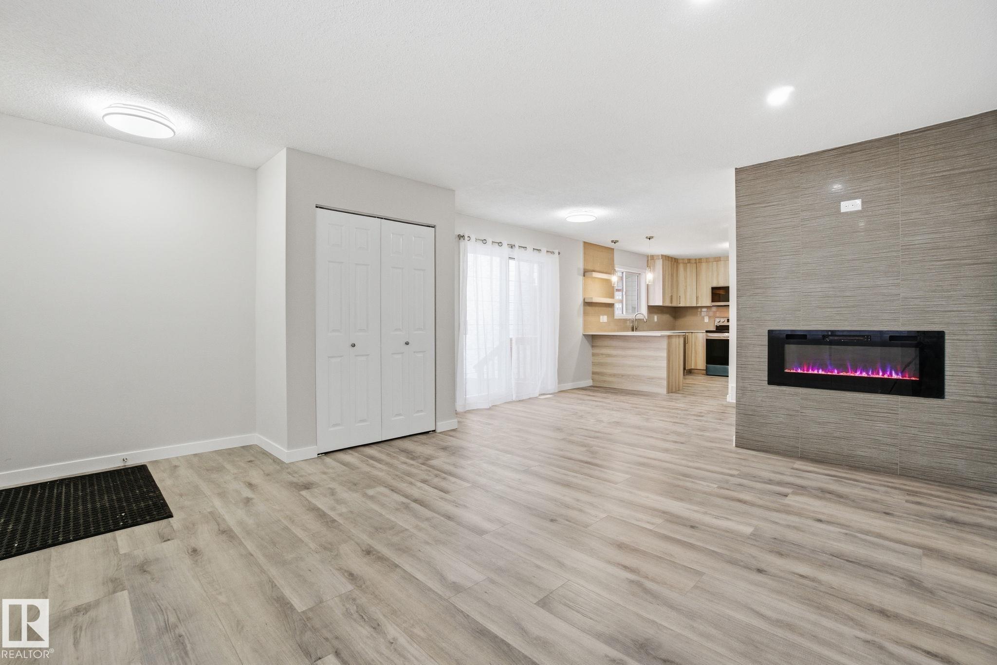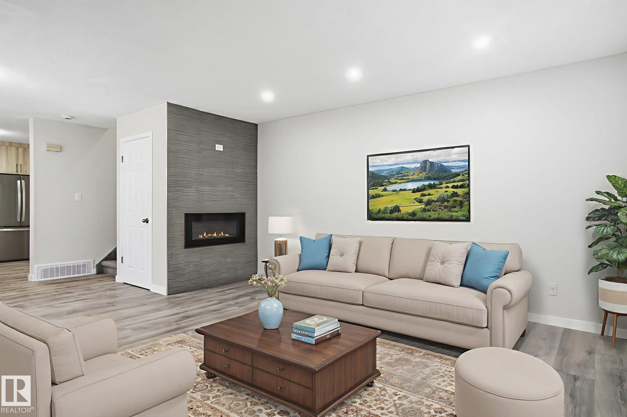 Welcome to this beautifully renovated townhome in an exclusive complex of only 13 units. Offering over 1,925 sq ft of modern living space, this 3 bedroom, 3.5 bathroom home has been transformed from top to bottom. The main floor features new vinyl plank flooring, upgraded LED pot lights, and a sleek electric fireplace with a modern surround. The dining area opens to a private side yard, and the brand new kitchen showcases contemporary cabinetry, quartz counters, and stainless steel appliances. Upstairs, the primary suite includes a gorgeous ensuite with a custom tiled shower, along with two additional bedrooms and convenient upstairs laundry. The fully finished basement offers a recreation room with plush carpet, fresh paint, storage, and a new bathroom. With a high efficiency furnace and a double attached garage, this home is modern, clean, and move in ready. An ideal choice for first time buyers, downsizers, or anyone seeking a stylish low maintenance property. Some photos have been virtually staged.