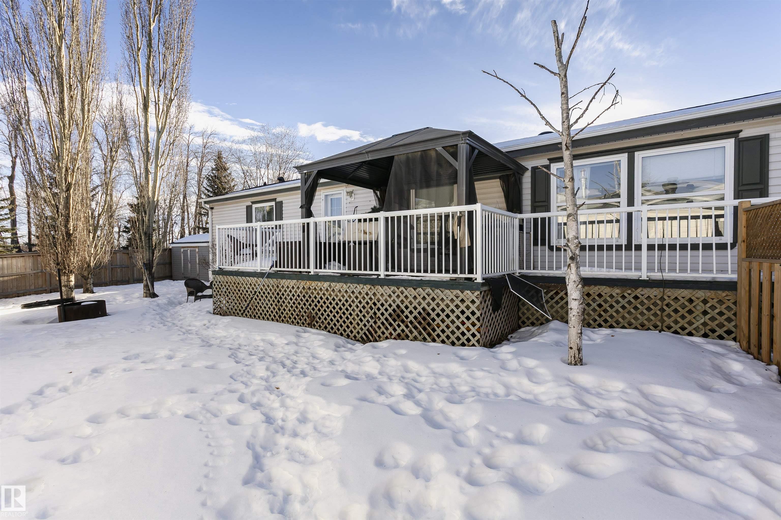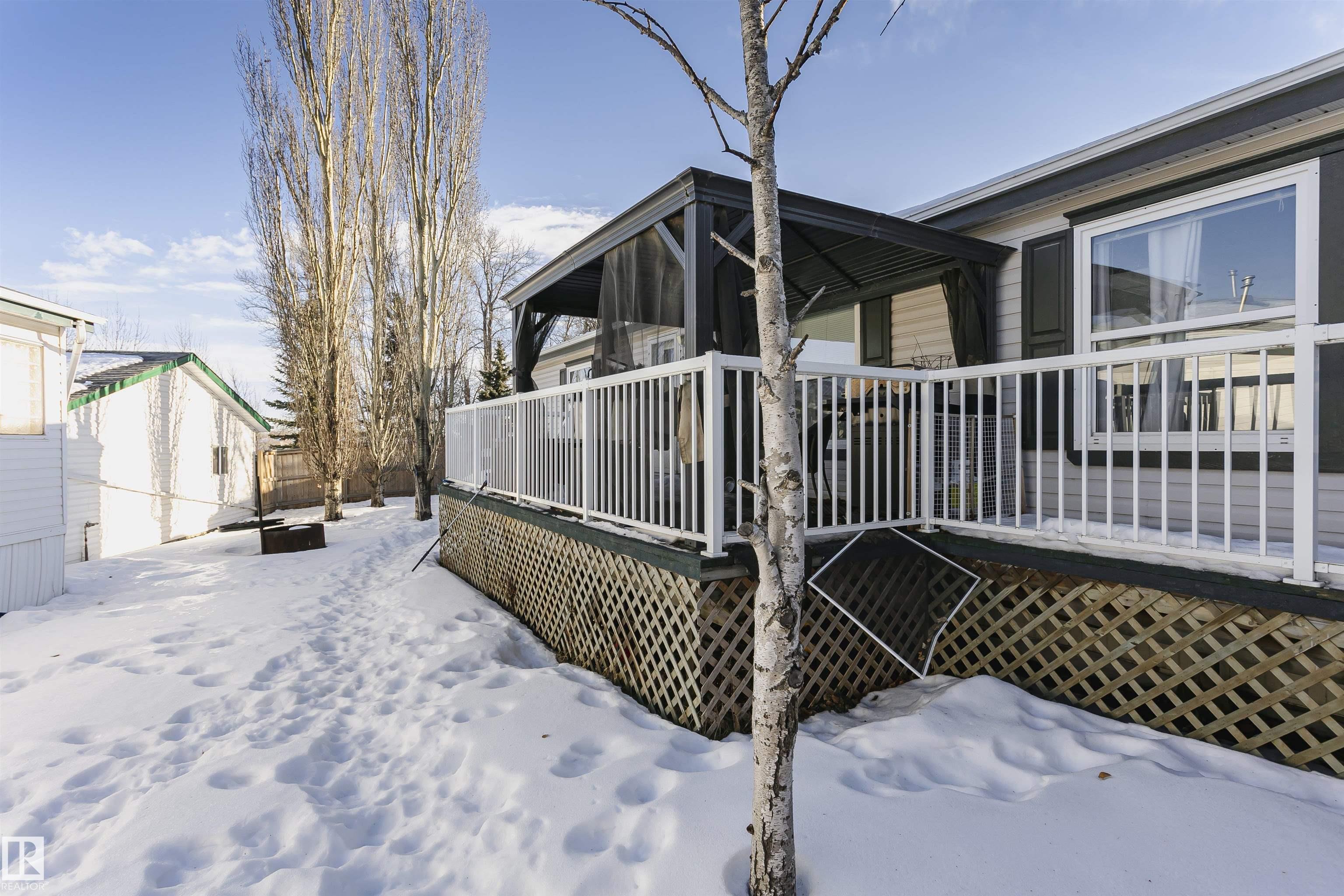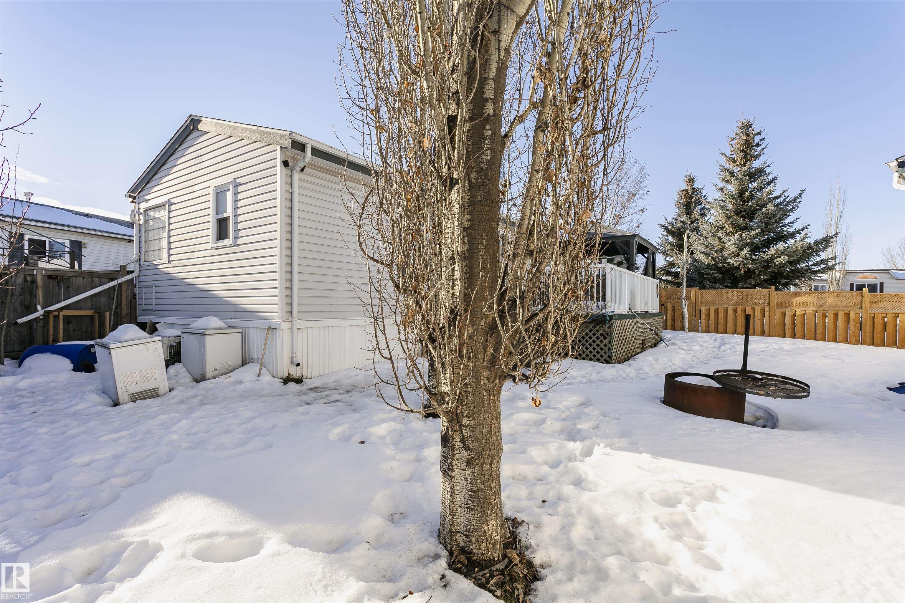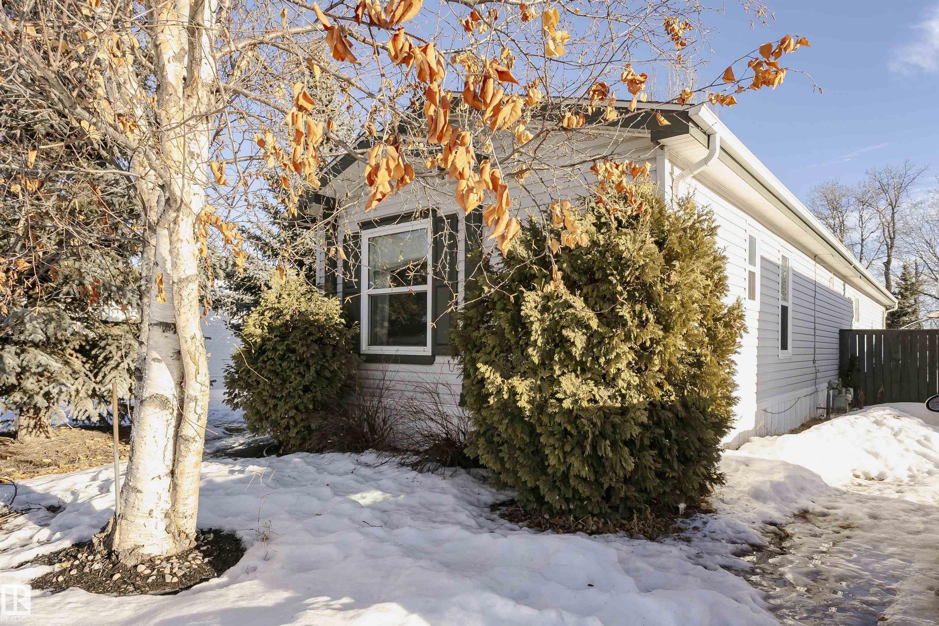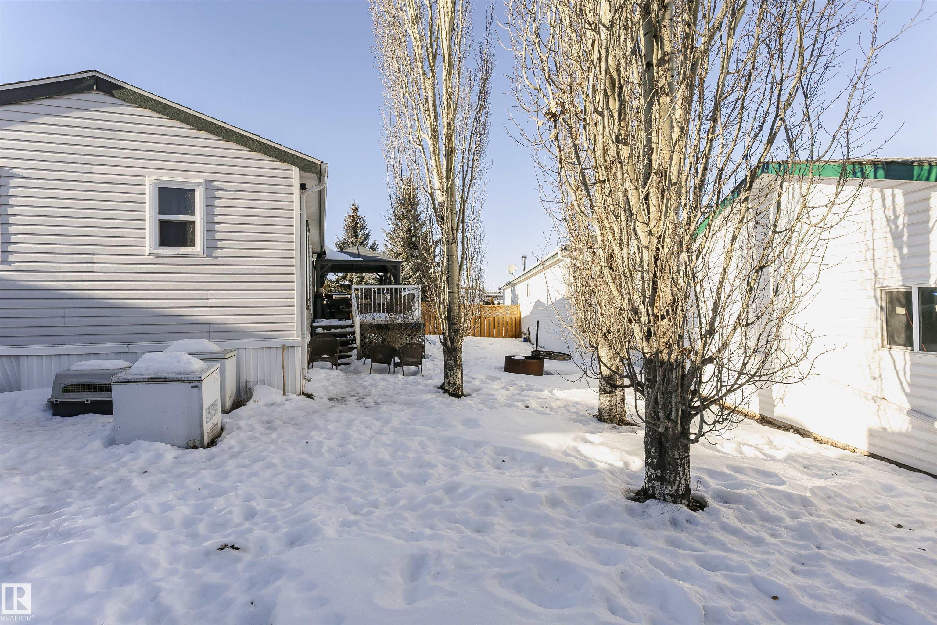 Welcome to Westview! Great value in this 3 bedroom, 2 bathroom mobile, backing Frank Michael park. The floor plan is open and bright, with a vaulted ceiling, skylight and an abundance of windows. The living room is spacious and blends seamlessly into the dining room and kitchen areas. The white cabinet kitchen features some newer appliances, loads of storage and great natural light. The 3 bedrooms are large with the primary boasting a full 4-piece ensuite with tub + shower. The laundry set-up is conveniently located and has great storage also. The yard has a great size deck (22'x10'), mature trees, shed and views of the park. There is a double paved parking pad with additional parking for added convenience. Complete the package with a newer roof (2022) and h2o tank (2019). Close to the lake, shopping center, restaurants & Petro station. Quick access to Winterburn Road. Great potential and value in well laid out in the 2002 mobile. Come have a look and visualize the potential - priced to sell at $68,500!