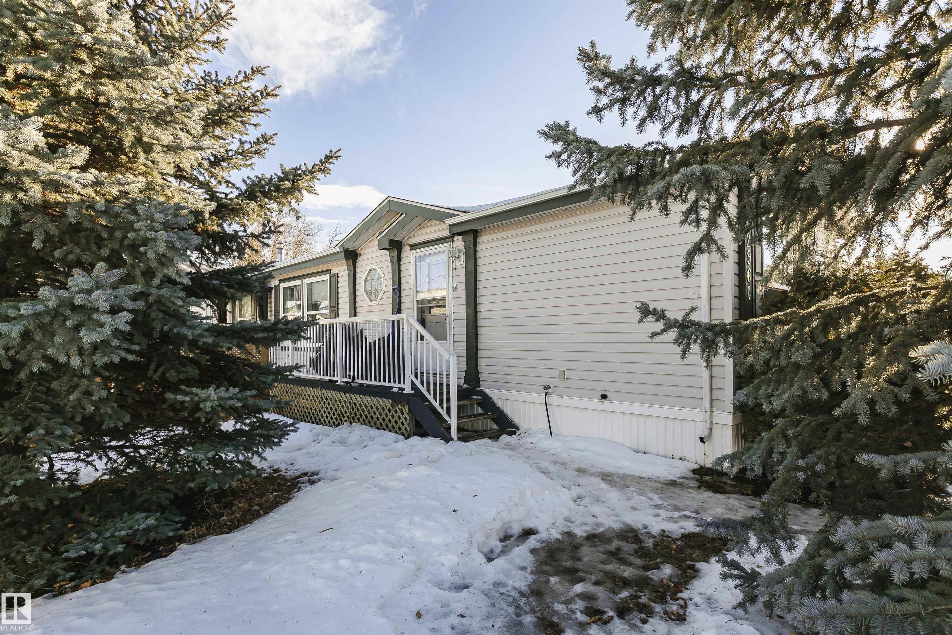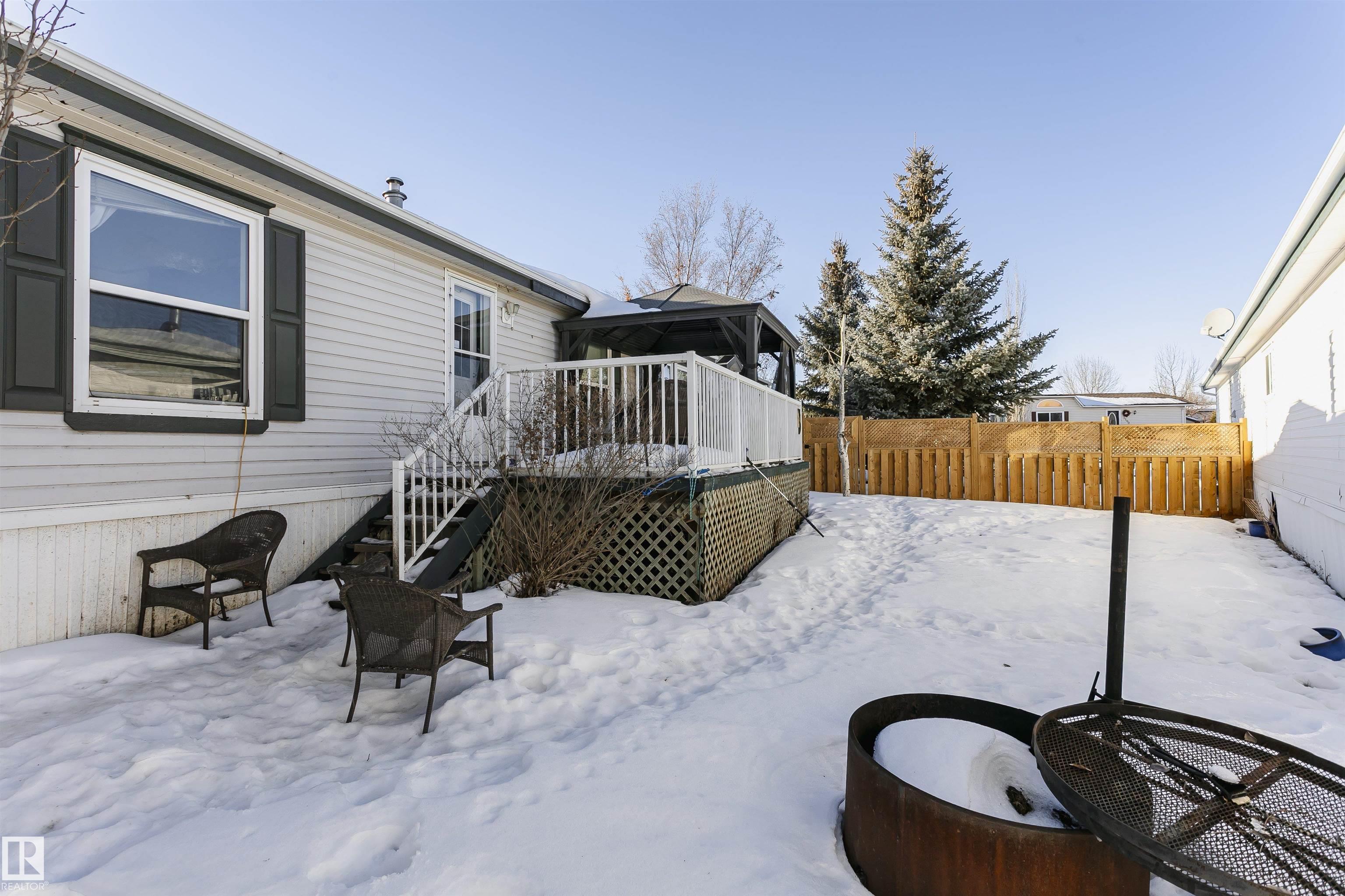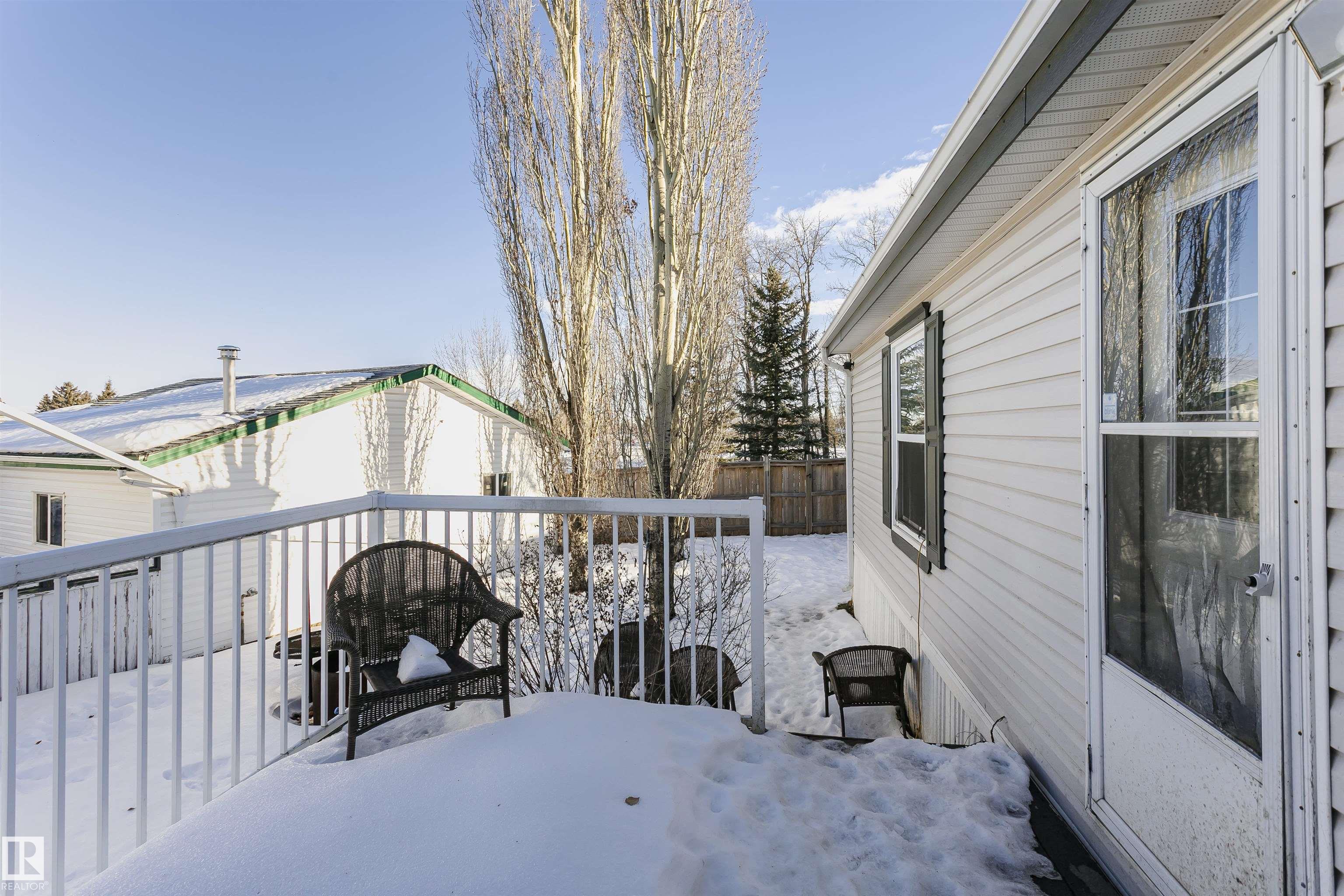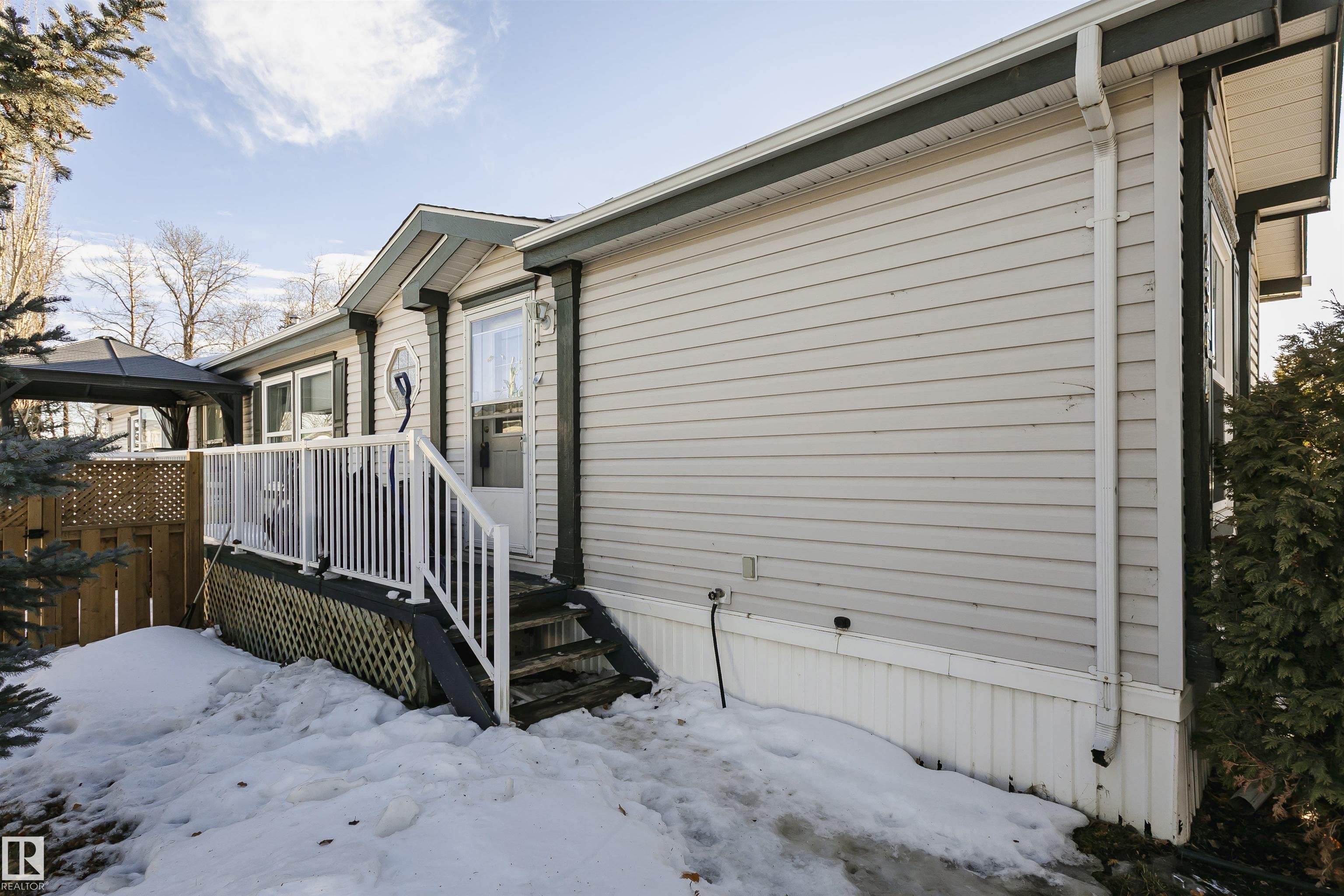 Welcome to Westview! Great value in this 3 bedroom, 2 bathroom mobile, backing Frank Michael park. The floor plan is open and bright, with a vaulted ceiling, skylight and an abundance of windows. The living room is spacious and blends seamlessly into the dining room and kitchen areas. The white cabinet kitchen features some newer appliances, loads of storage and great natural light. The 3 bedrooms are large with the primary boasting a full 4-piece ensuite with tub + shower. The laundry set-up is conveniently located and has great storage also. The yard has a great size deck (22'x10'), mature trees, shed and views of the park. There is a double paved parking pad with additional parking for added convenience. Complete the package with a newer roof (2022) and h2o tank (2019). Close to the lake, shopping center, restaurants & Petro station. Quick access to Winterburn Road. Great potential and value in well laid out in the 2002 mobile. Come have a look and visualize the potential - priced to sell at $68,500!