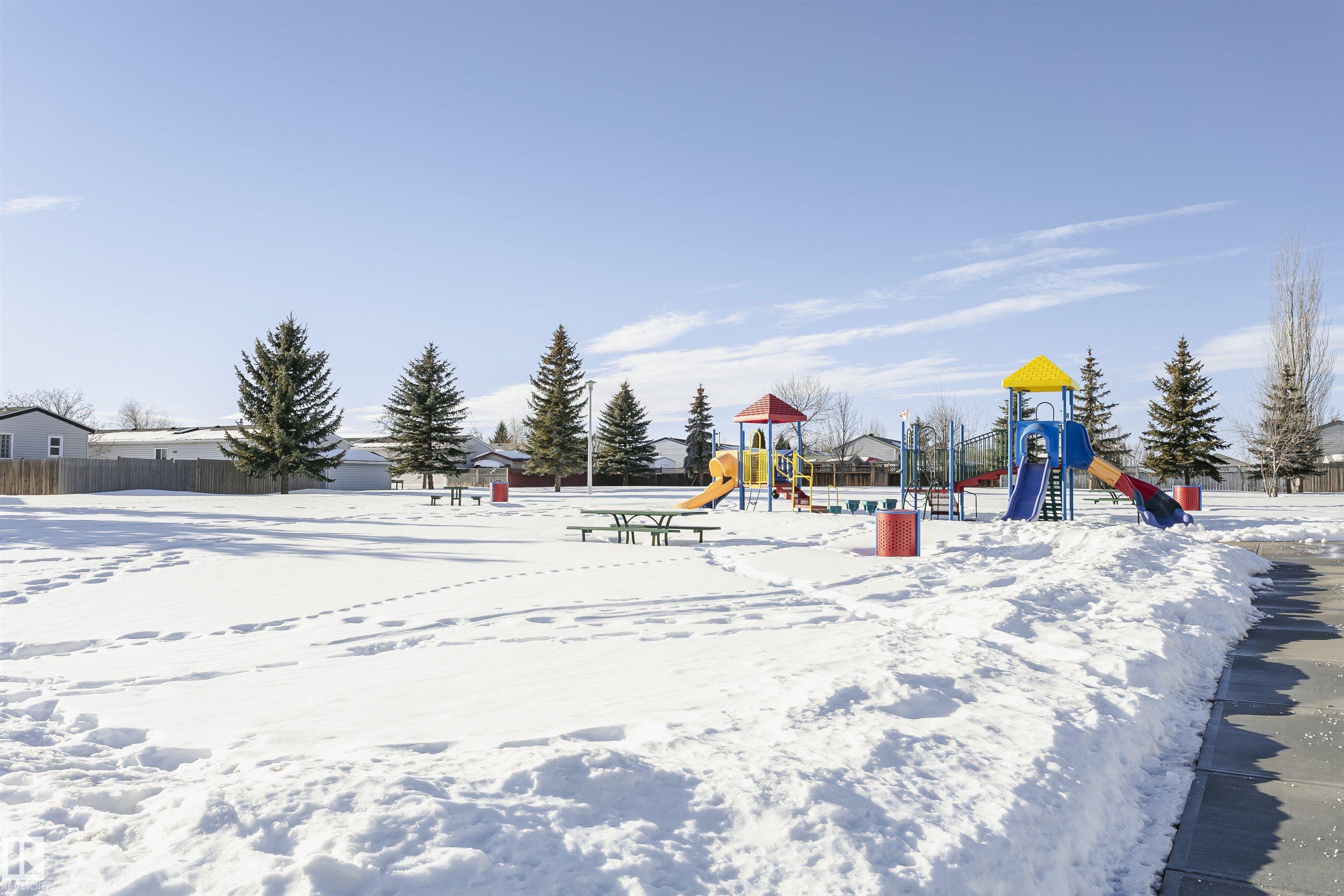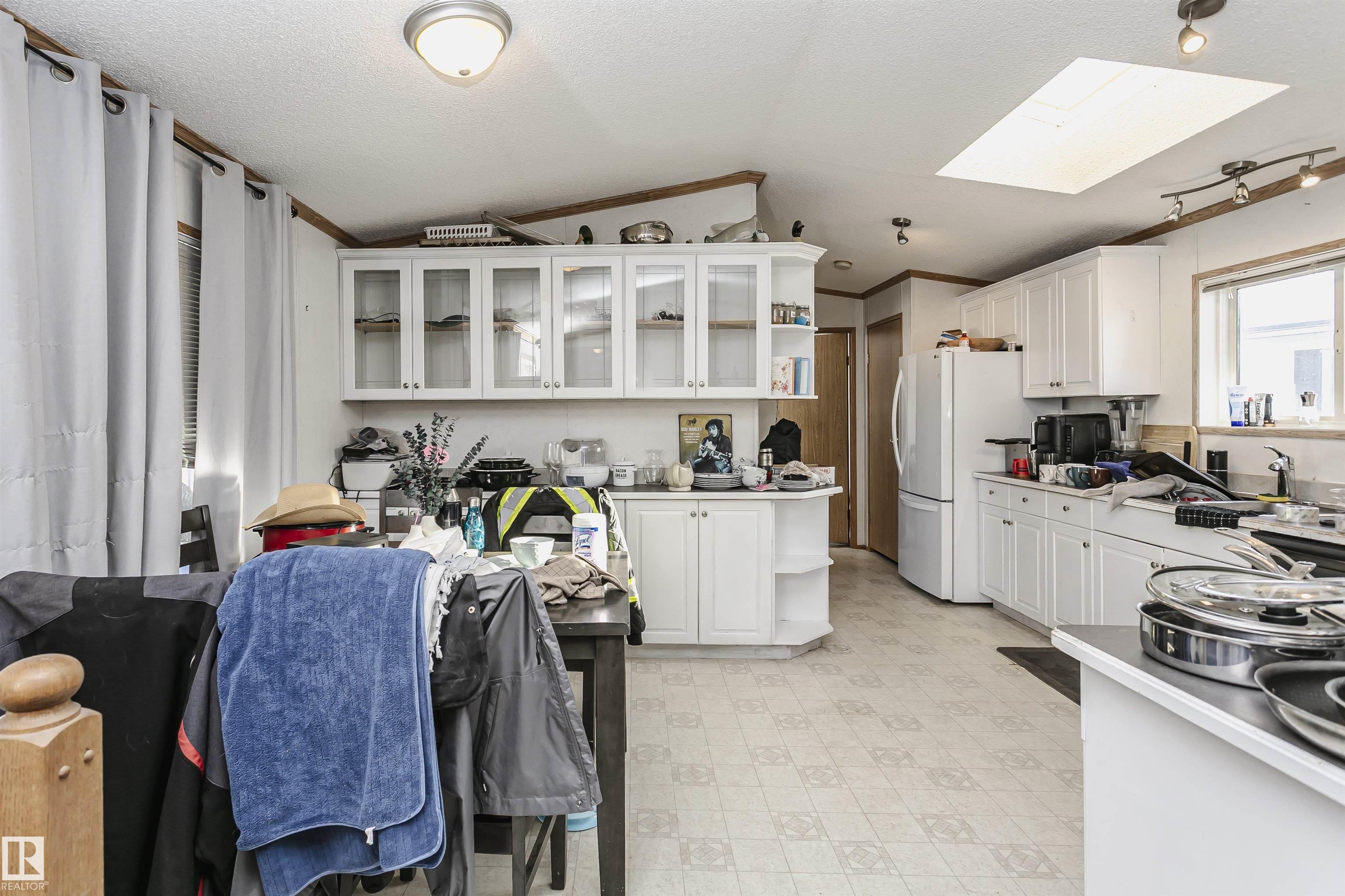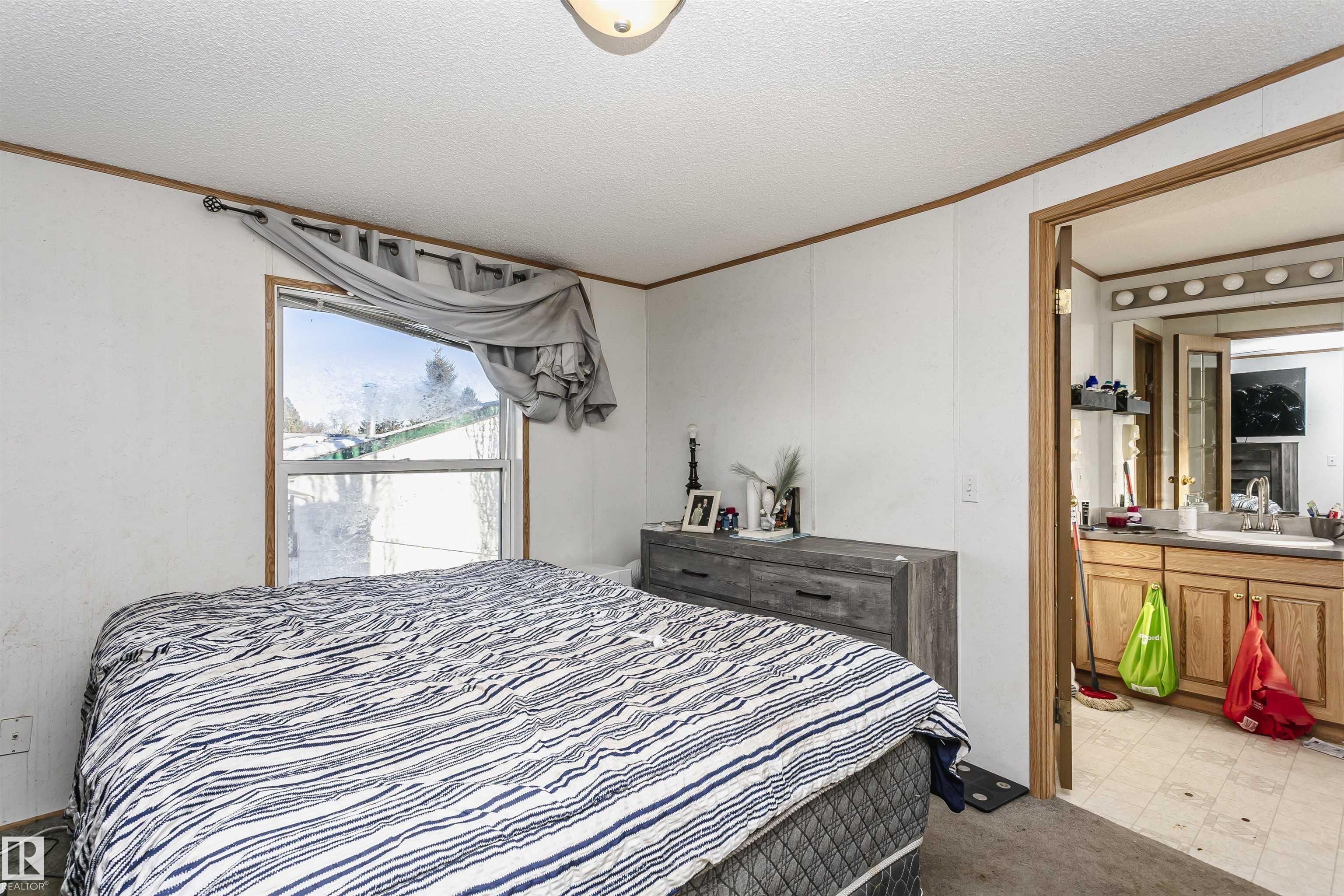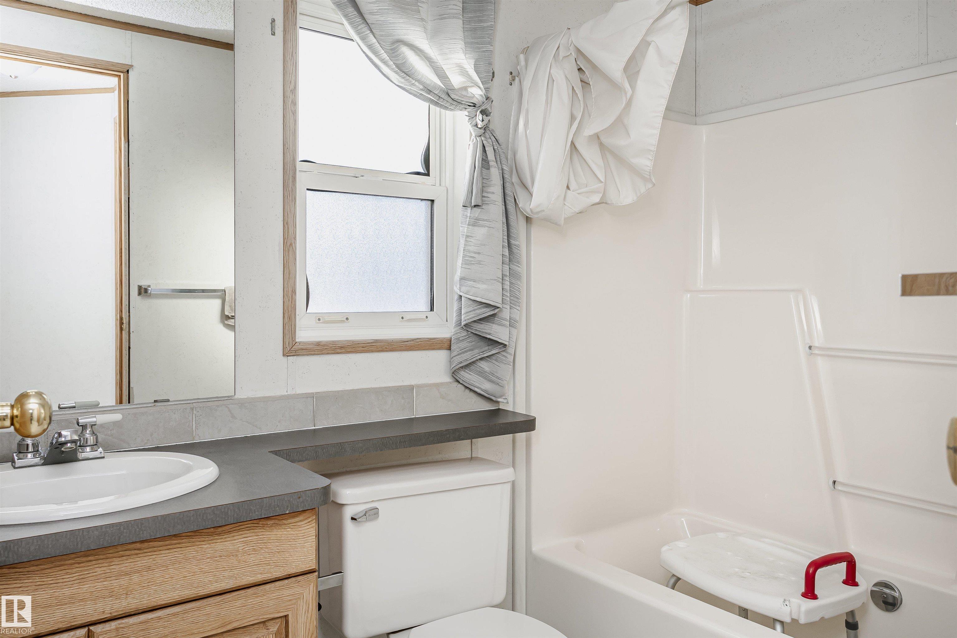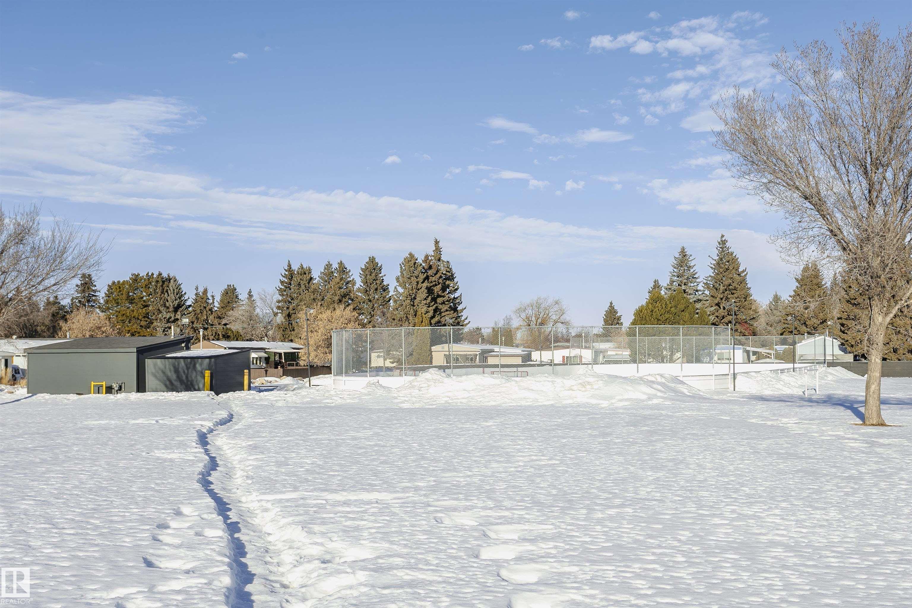Welcome to Westview! Great value in this 3 bedroom, 2 bathroom mobile, backing Frank Michael park. The floor plan is open and bright, with a vaulted ceiling, skylight and an abundance of windows. The living room is spacious and blends seamlessly into the dining room and kitchen areas. The white cabinet kitchen features some newer appliances, loads of storage and great natural light. The 3 bedrooms are large with the primary boasting a full 4-piece ensuite with tub + shower. The laundry set-up is conveniently located and has great storage also. The yard has a great size deck (22'x10'), mature trees, shed and views of the park. There is a double paved parking pad with additional parking for added convenience. Complete the package with a newer roof (2022) and h2o tank (2019). Close to the lake, shopping center, restaurants & Petro station. Quick access to Winterburn Road. Great potential and value in well laid out in the 2002 mobile. Come have a look and visualize the potential - priced to sell at $68,500!