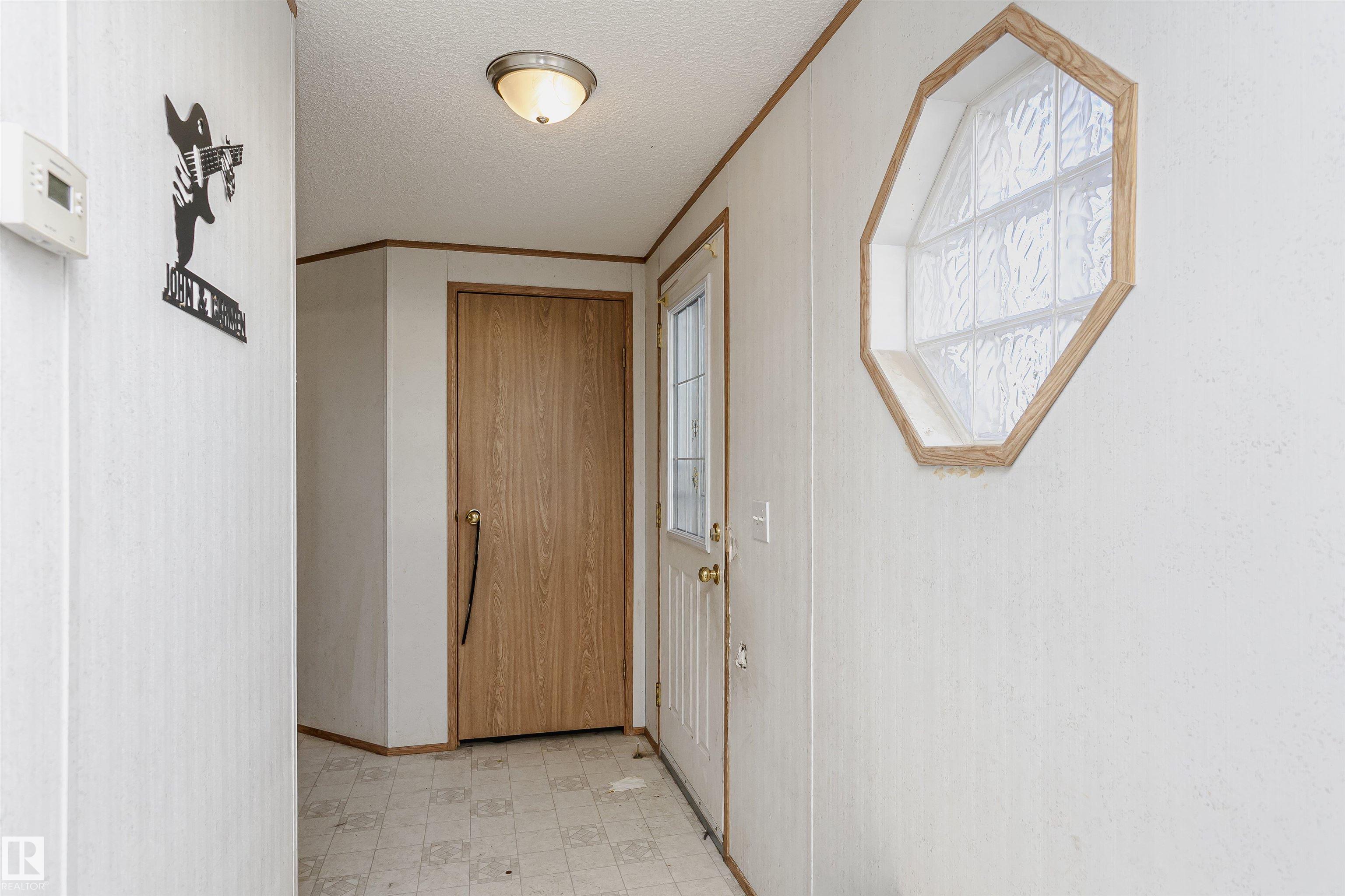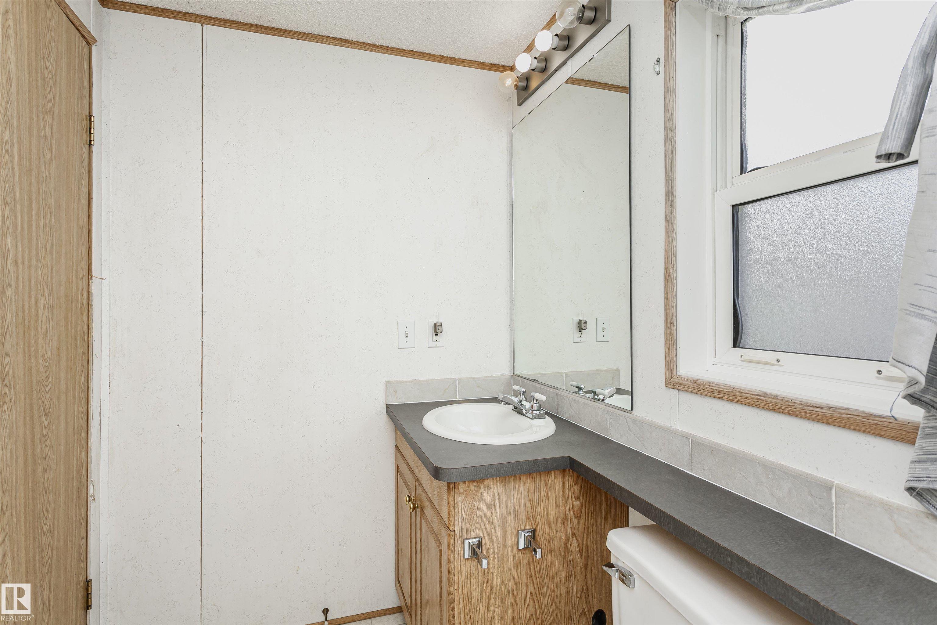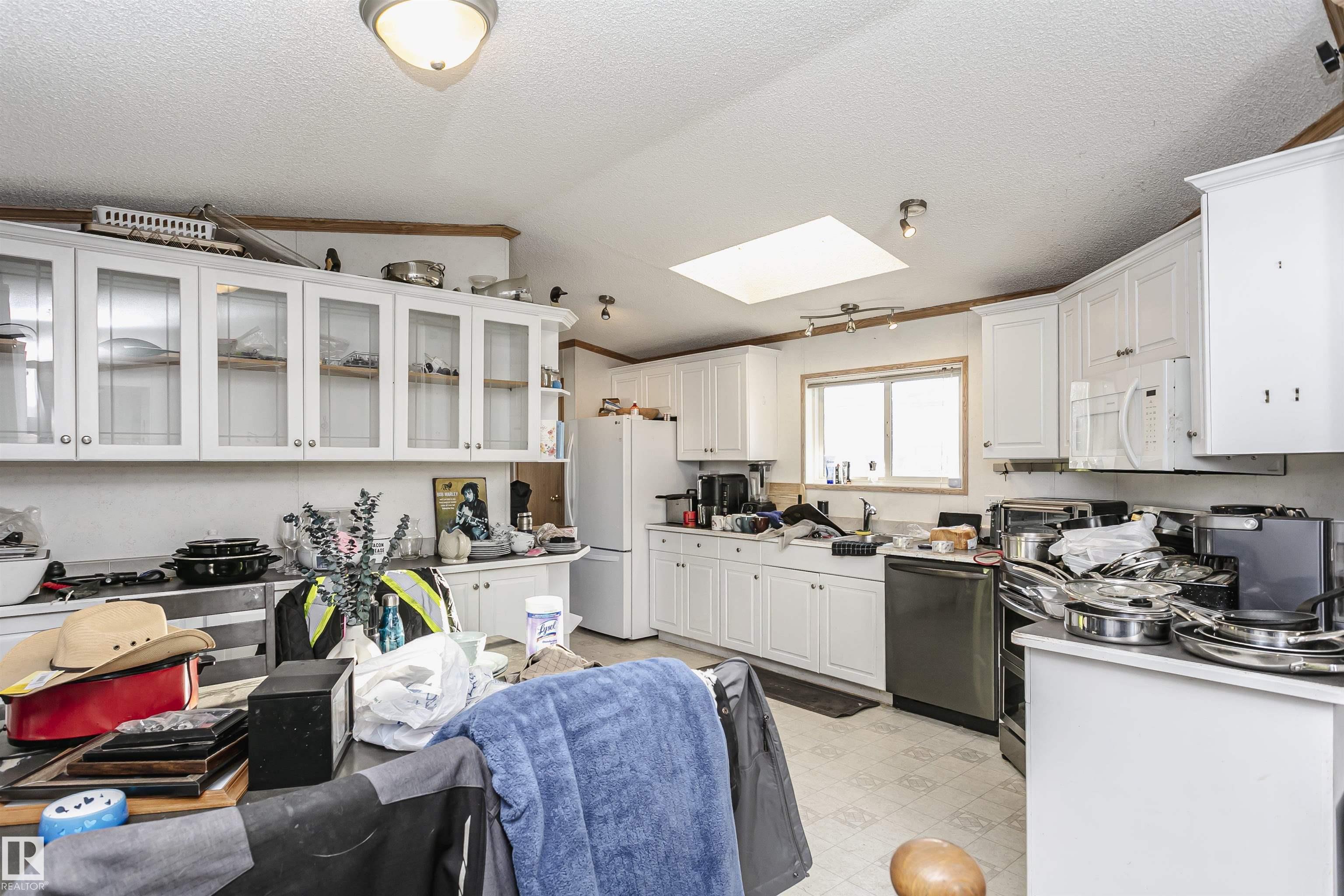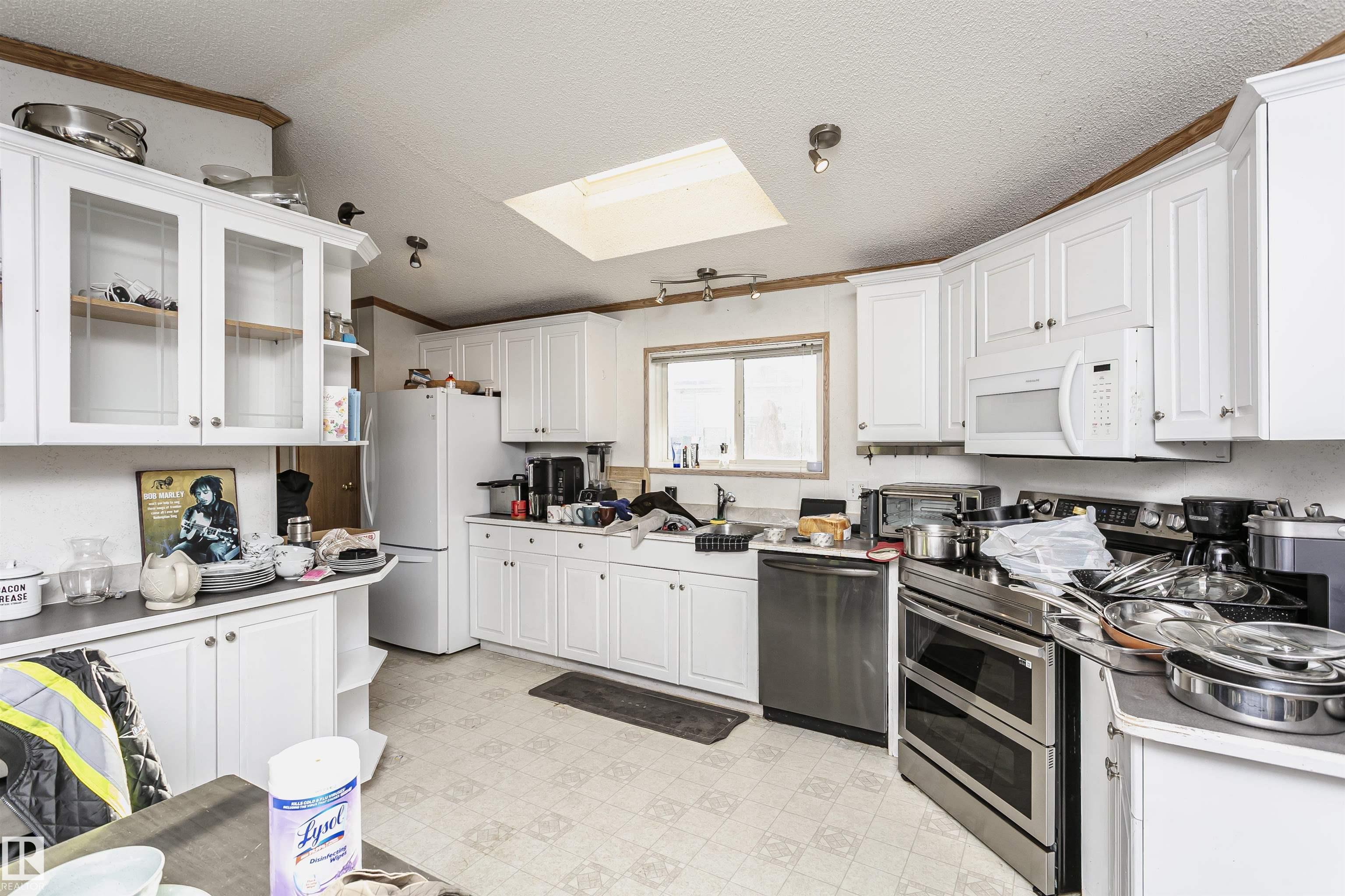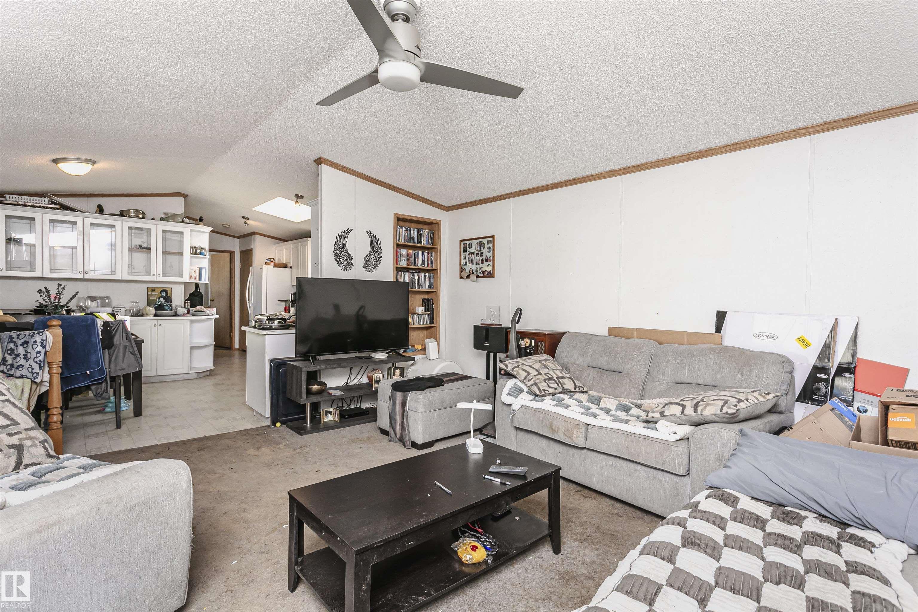 Welcome to Westview! Great value in this 3 bedroom, 2 bathroom mobile, backing Frank Michael park. The floor plan is open and bright, with a vaulted ceiling, skylight and an abundance of windows. The living room is spacious and blends seamlessly into the dining room and kitchen areas. The white cabinet kitchen features some newer appliances, loads of storage and great natural light. The 3 bedrooms are large with the primary boasting a full 4-piece ensuite with tub + shower. The laundry set-up is conveniently located and has great storage also. The yard has a great size deck (22'x10'), mature trees, shed and views of the park. There is a double paved parking pad with additional parking for added convenience. Complete the package with a newer roof (2022) and h2o tank (2019). Close to the lake, shopping center, restaurants & Petro station. Quick access to Winterburn Road. Great potential and value in well laid out in the 2002 mobile. Come have a look and visualize the potential - priced to sell at $68,500!