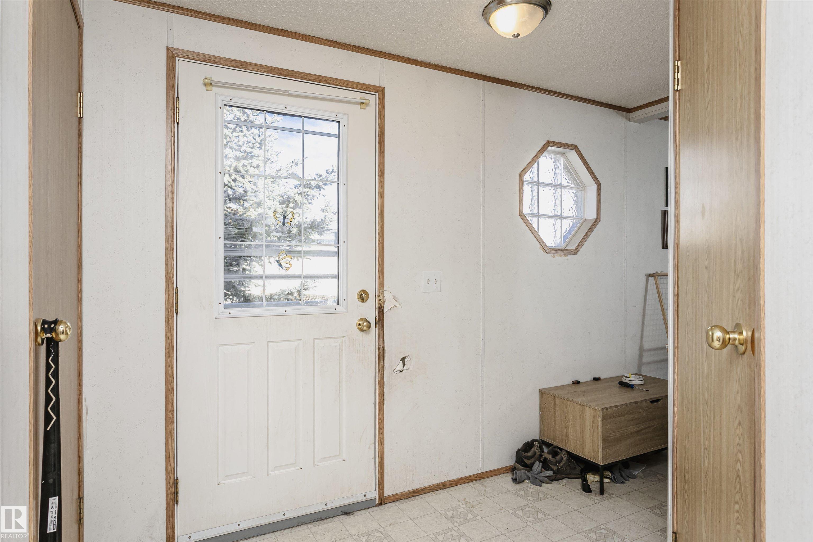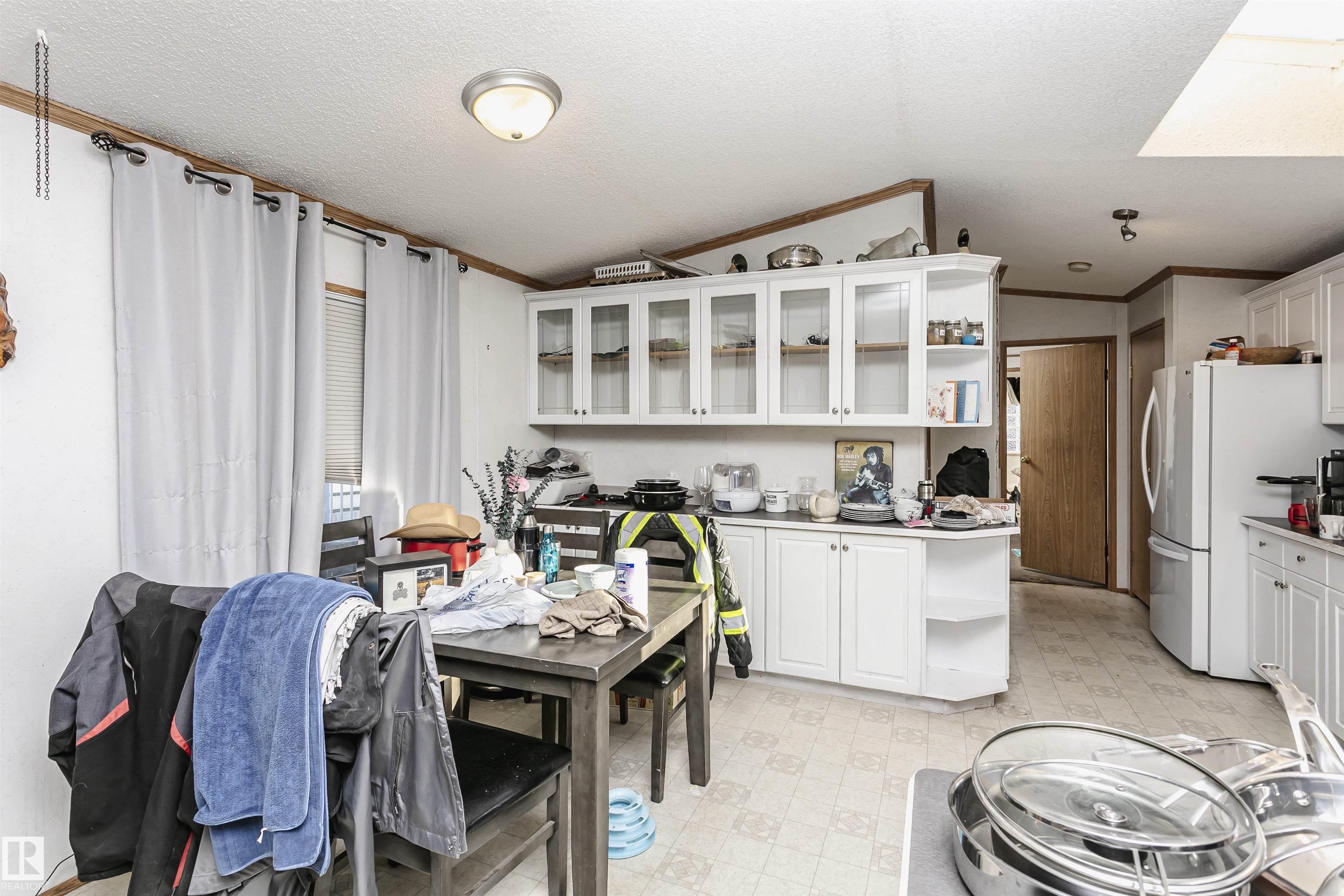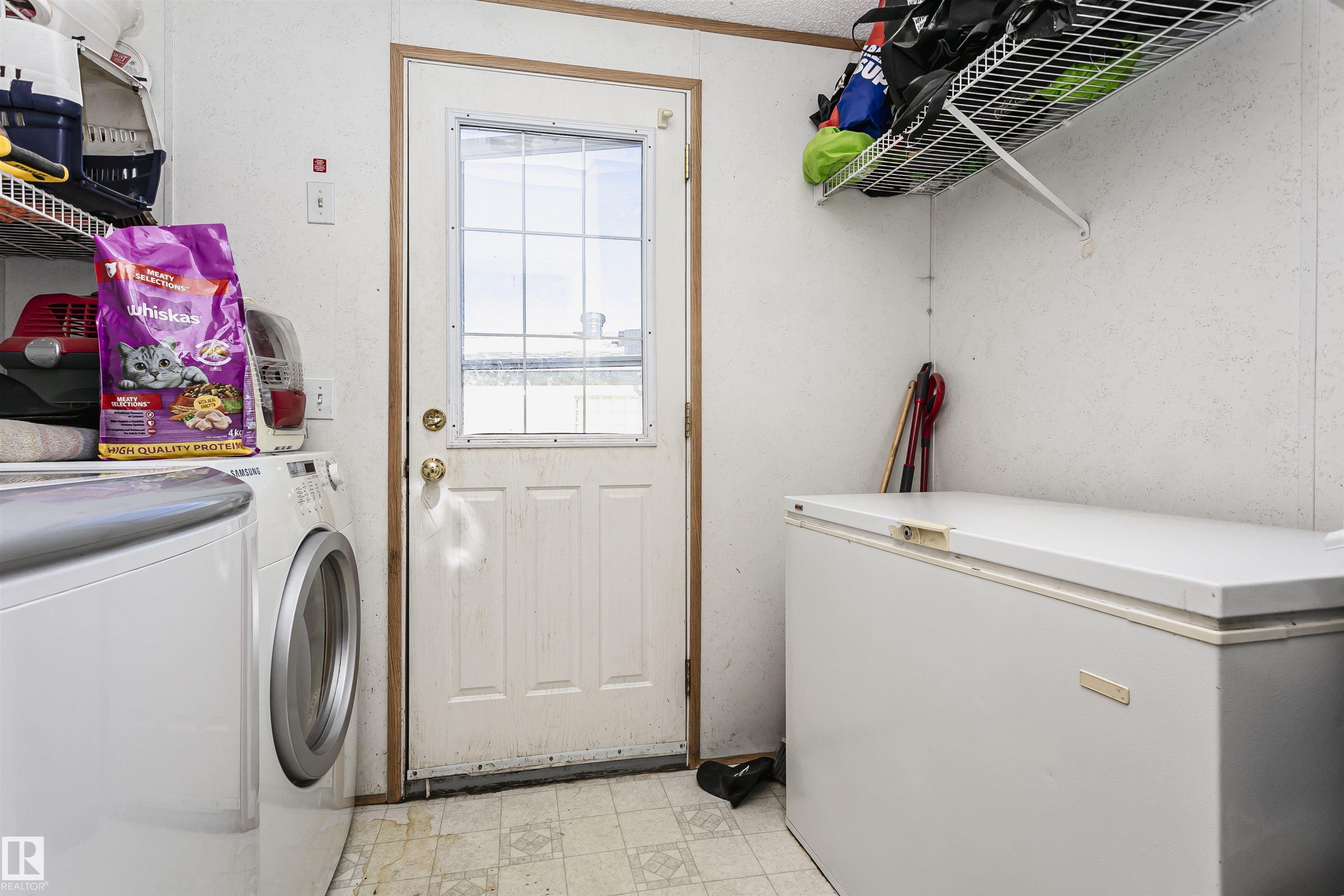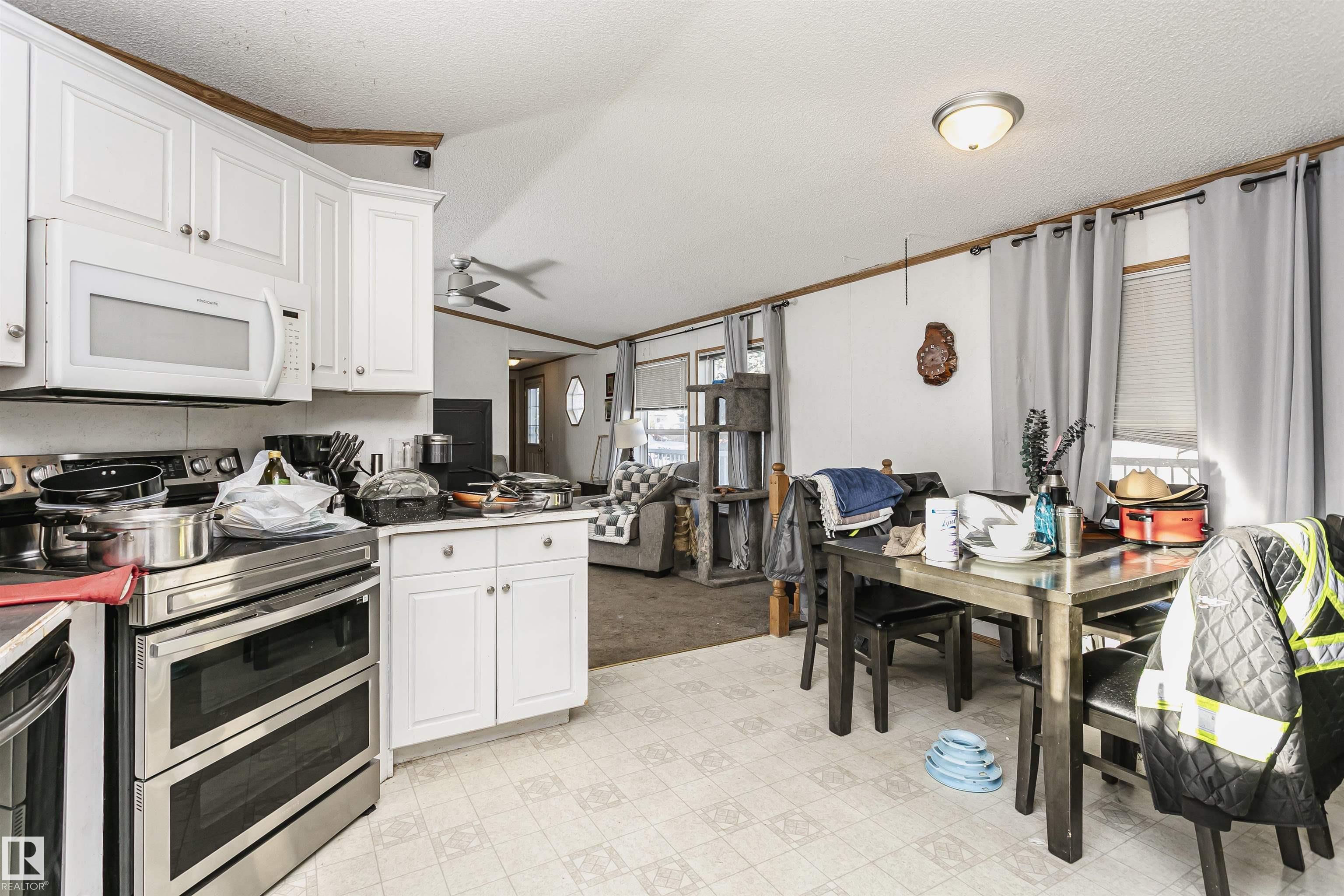 Welcome to Westview! Great value in this 3 bedroom, 2 bathroom mobile, backing Frank Michael park. The floor plan is open and bright, with a vaulted ceiling, skylight and an abundance of windows. The living room is spacious and blends seamlessly into the dining room and kitchen areas. The white cabinet kitchen features some newer appliances, loads of storage and great natural light. The 3 bedrooms are large with the primary boasting a full 4-piece ensuite with tub + shower. The laundry set-up is conveniently located and has great storage also. The yard has a great size deck (22'x10'), mature trees, shed and views of the park. There is a double paved parking pad with additional parking for added convenience. Complete the package with a newer roof (2022) and h2o tank (2019). Close to the lake, shopping center, restaurants & Petro station. Quick access to Winterburn Road. Great potential and value in well laid out in the 2002 mobile. Come have a look and visualize the potential - priced to sell at $68,500!