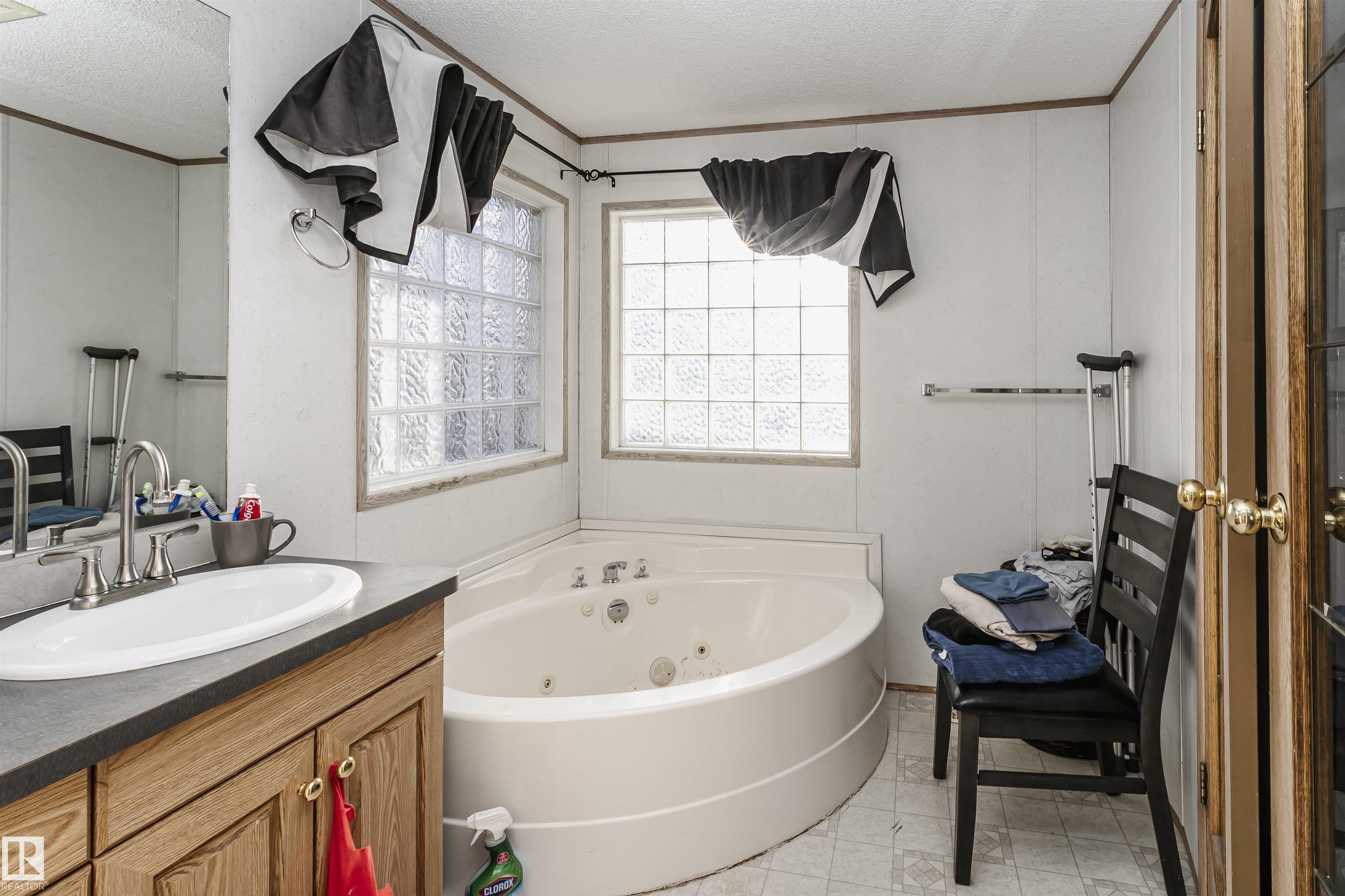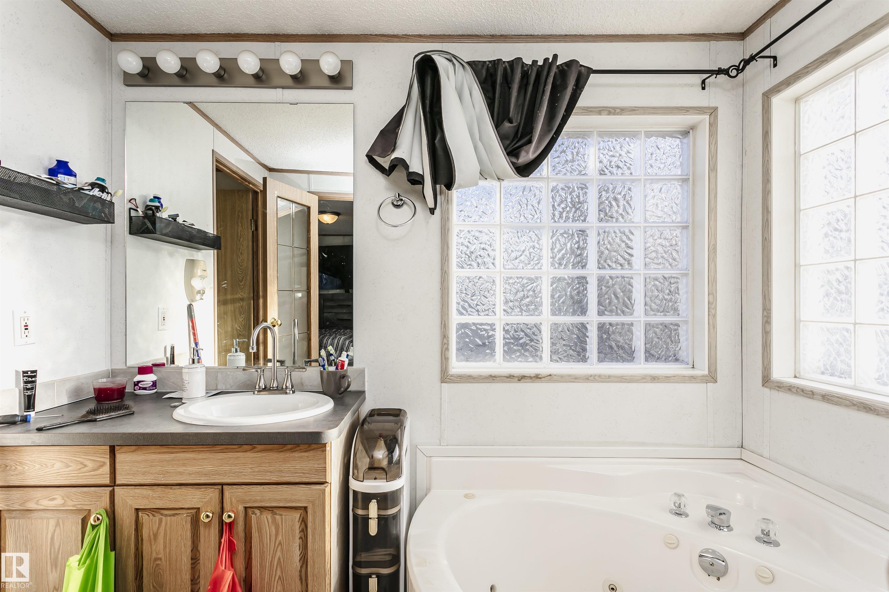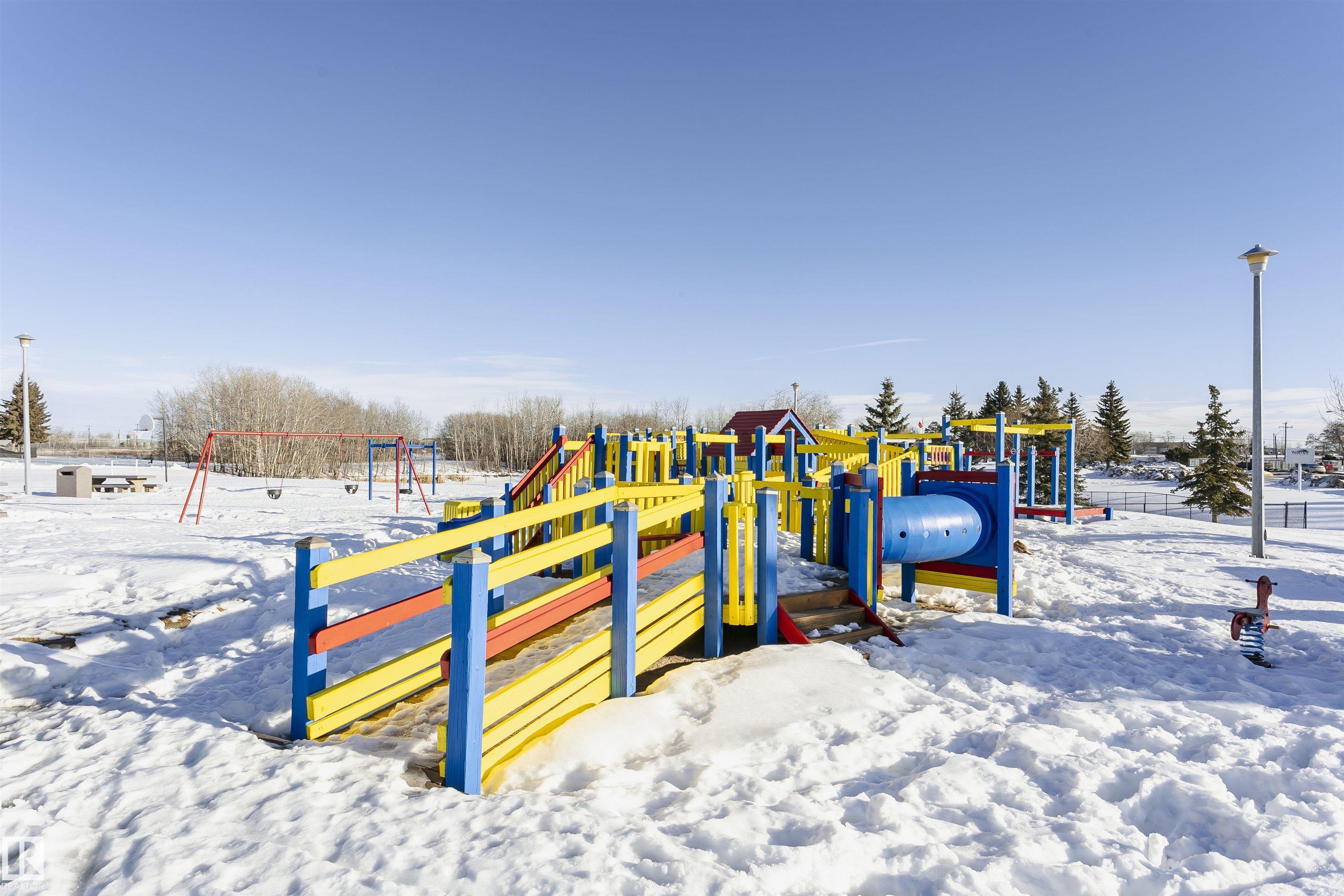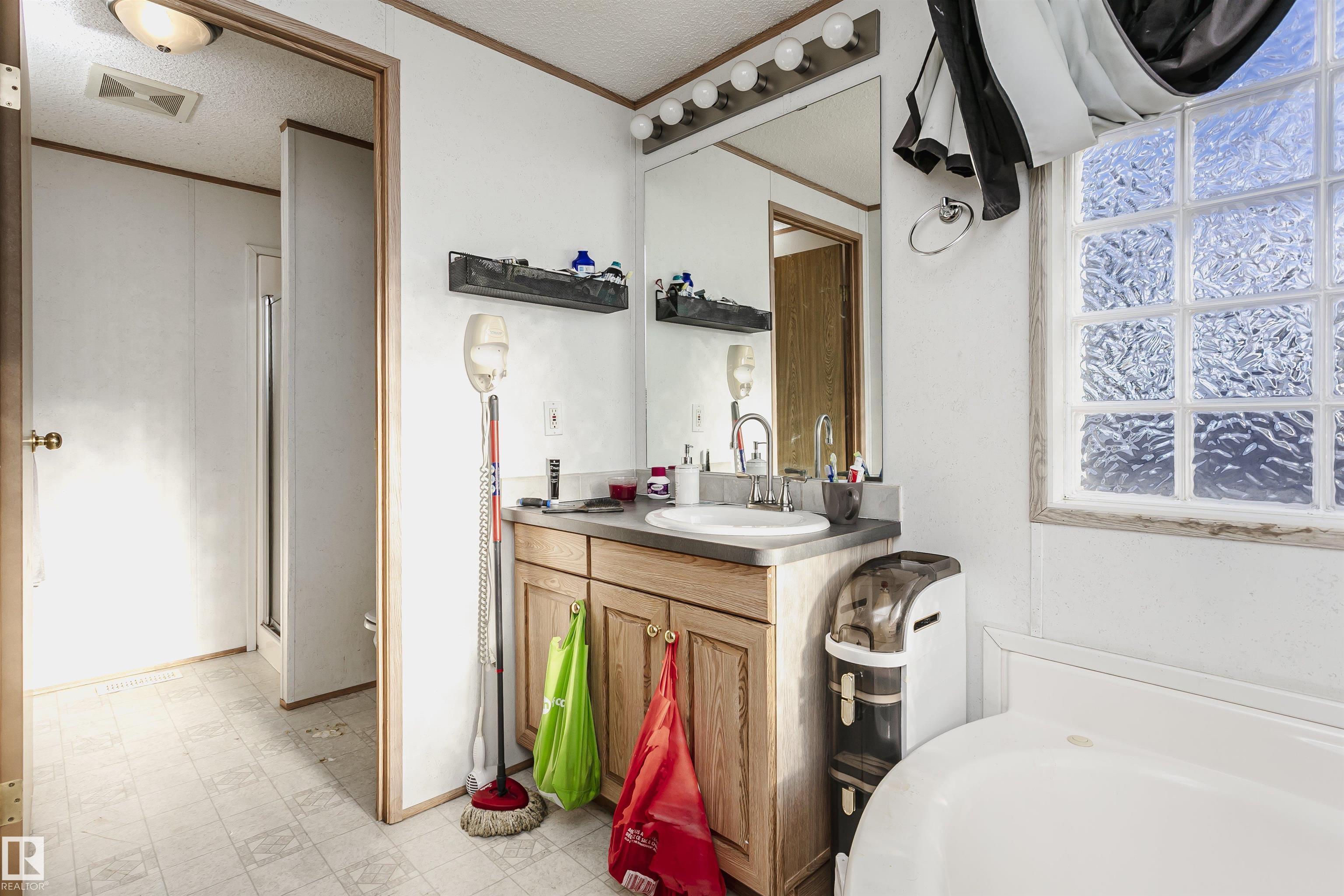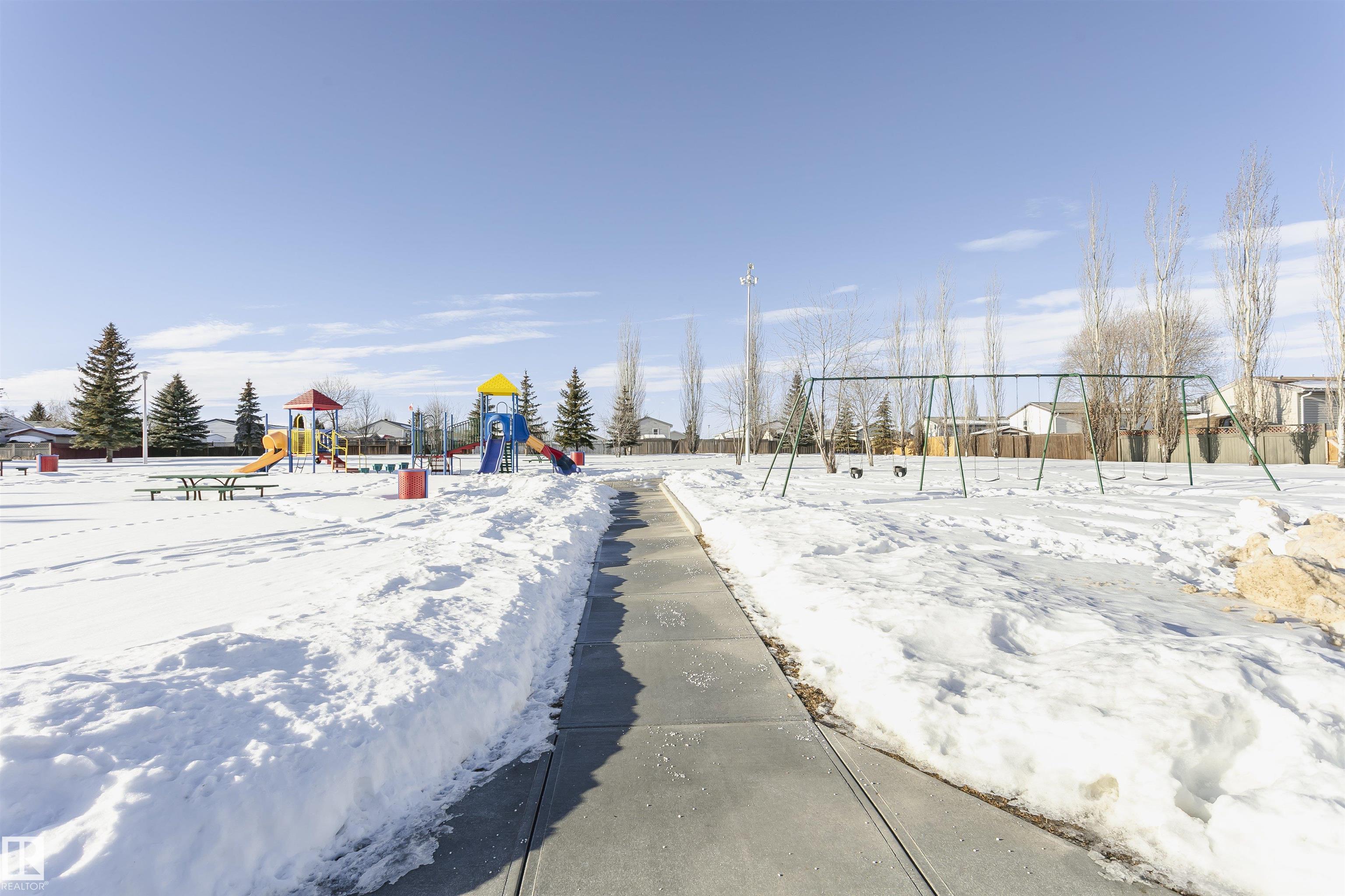 Welcome to Westview! Great value in this 3 bedroom, 2 bathroom mobile, backing Frank Michael park. The floor plan is open and bright, with a vaulted ceiling, skylight and an abundance of windows. The living room is spacious and blends seamlessly into the dining room and kitchen areas. The white cabinet kitchen features some newer appliances, loads of storage and great natural light. The 3 bedrooms are large with the primary boasting a full 4-piece ensuite with tub + shower. The laundry set-up is conveniently located and has great storage also. The yard has a great size deck (22'x10'), mature trees, shed and views of the park. There is a double paved parking pad with additional parking for added convenience. Complete the package with a newer roof (2022) and h2o tank (2019). Close to the lake, shopping center, restaurants & Petro station. Quick access to Winterburn Road. Great potential and value in well laid out in the 2002 mobile. Come have a look and visualize the potential - priced to sell at $68,500!