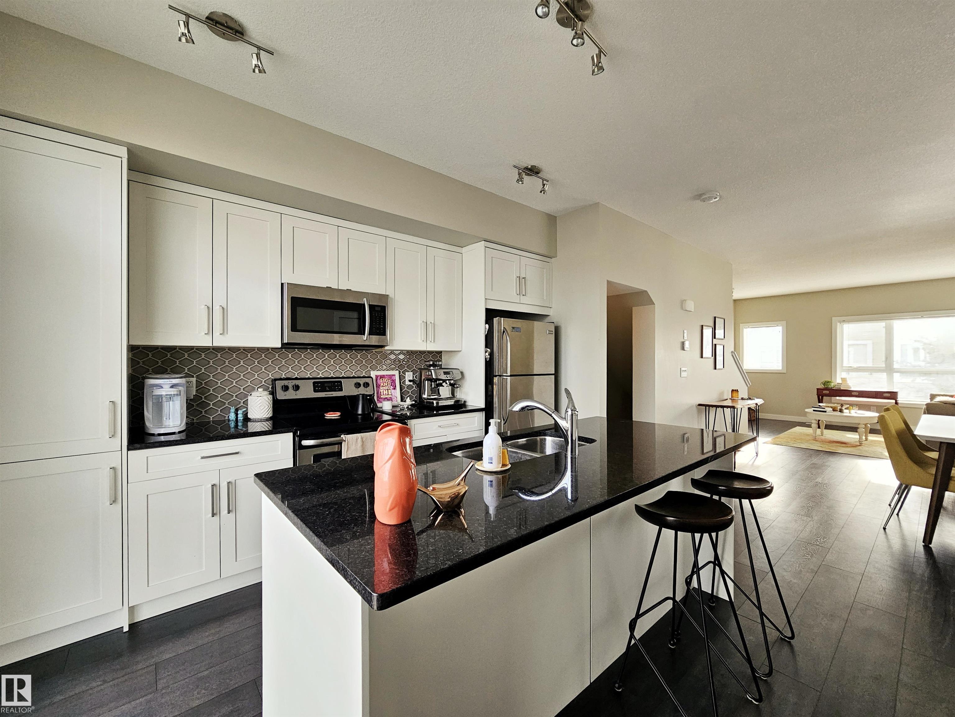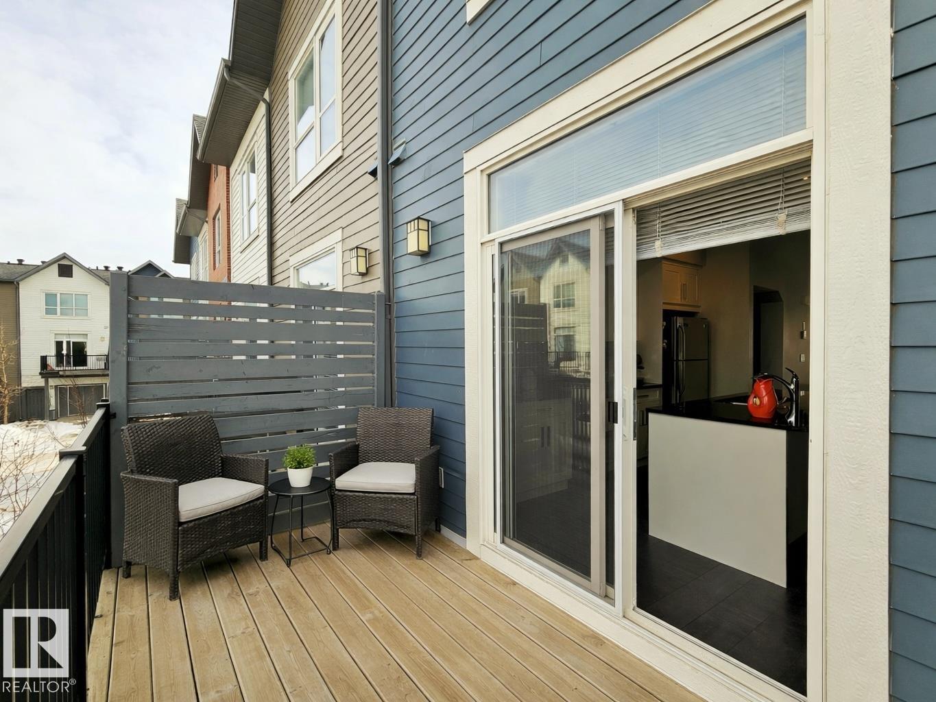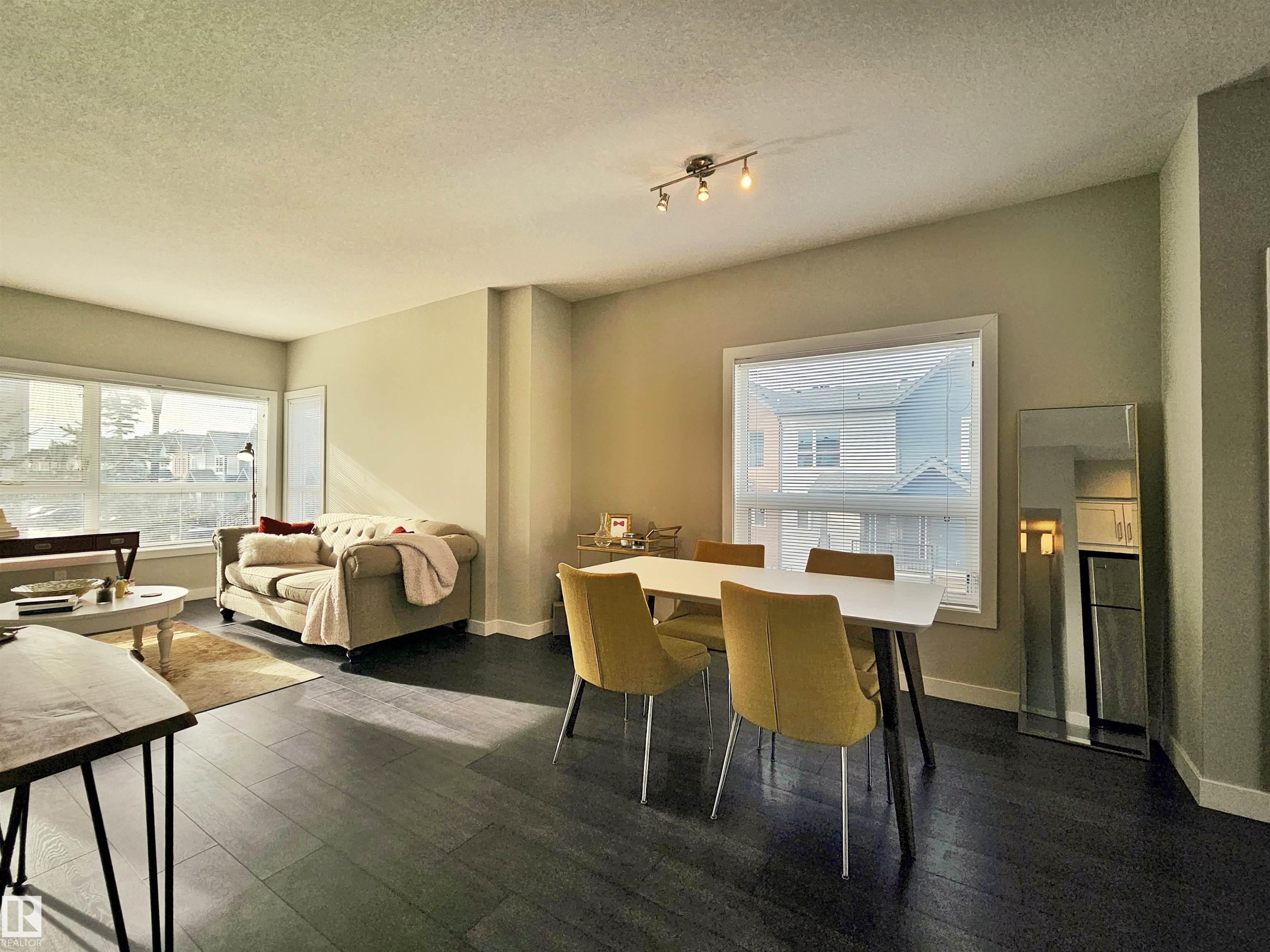 Proudly presented by the ORIGINAL OWNERS, this impeccably maintained END UNIT townhome blends timeless finishes with an exceptional location & oversized single ATTACHED GARAGE. Offering 1,358 sq ft of open-concept living, the home is defined by rich espresso laminate flooring, soaring 9? ceilings, granite surfaces throughout, & expansive windows that fill the space with natural light. The main level features a functional den, elegant 2-pc bath, and direct garage access. At the heart of the home, a beautifully appointed kitchen showcases crisp white cabinetry, S/S appliances, PRIVATE BALCONY access, and a large island overlooking the warm dining and living areas. Upstairs you?ll find a 4-pc bath, laundry, bonus room, spacious second bedroom, and a south-facing primary retreat with double closets and 3-pc ensuite. Perfectly positioned just minutes from downtown, with nearby schools, trails, & everyday amenities along 97 St & Northgate Centre, all in a professionally managed enclave with low condo fees $328.