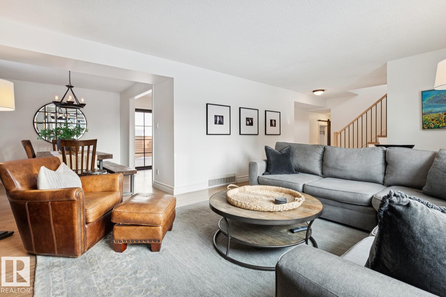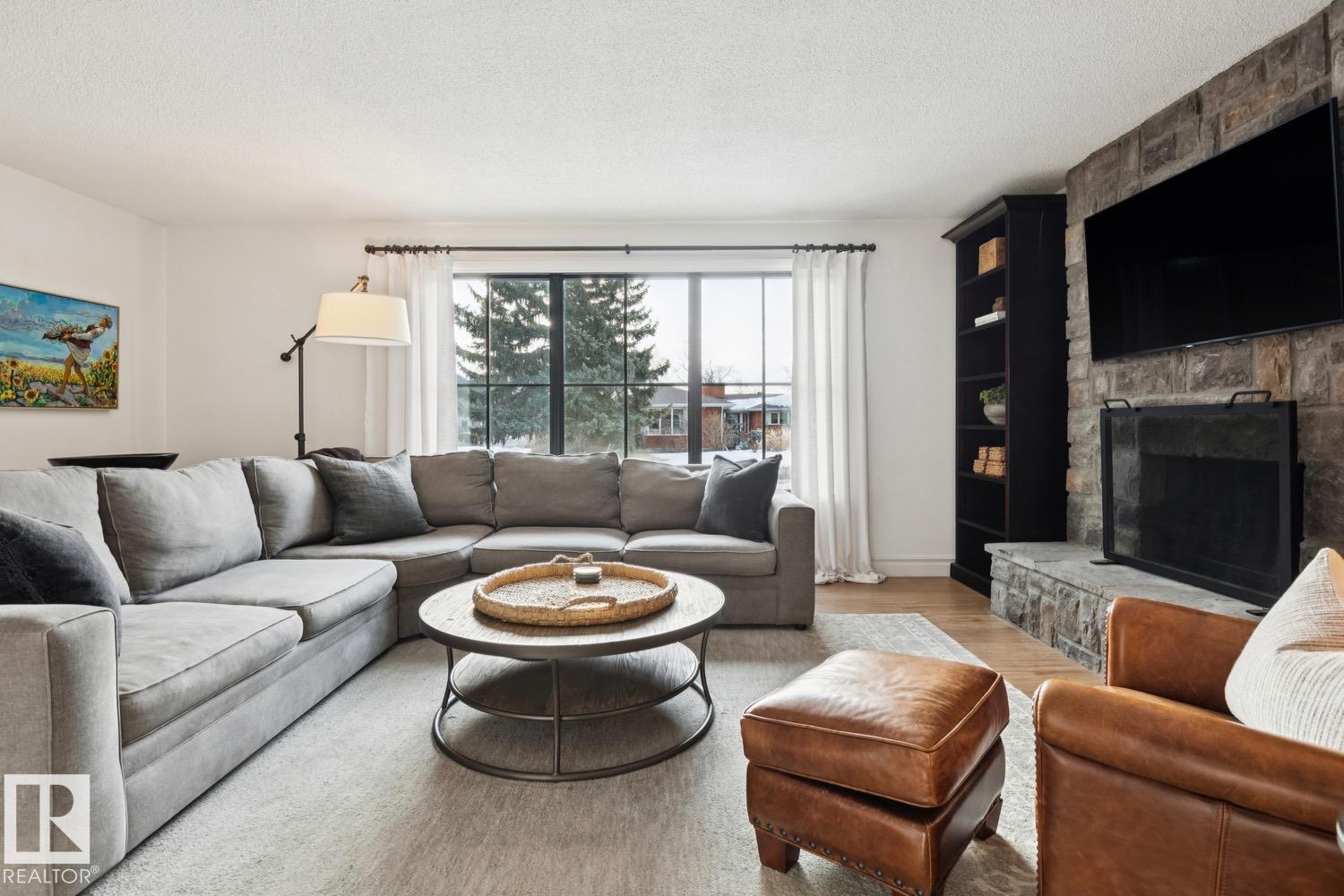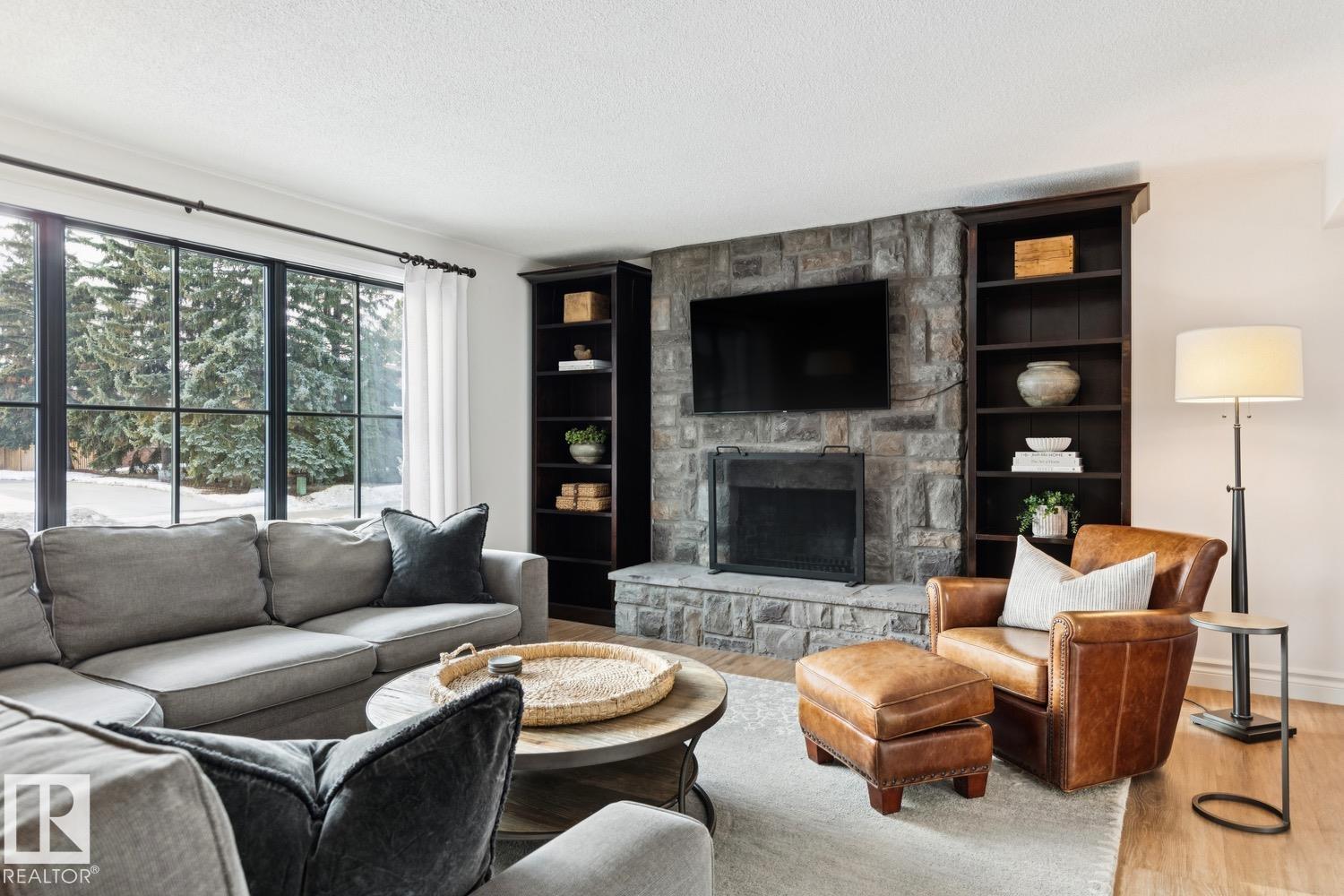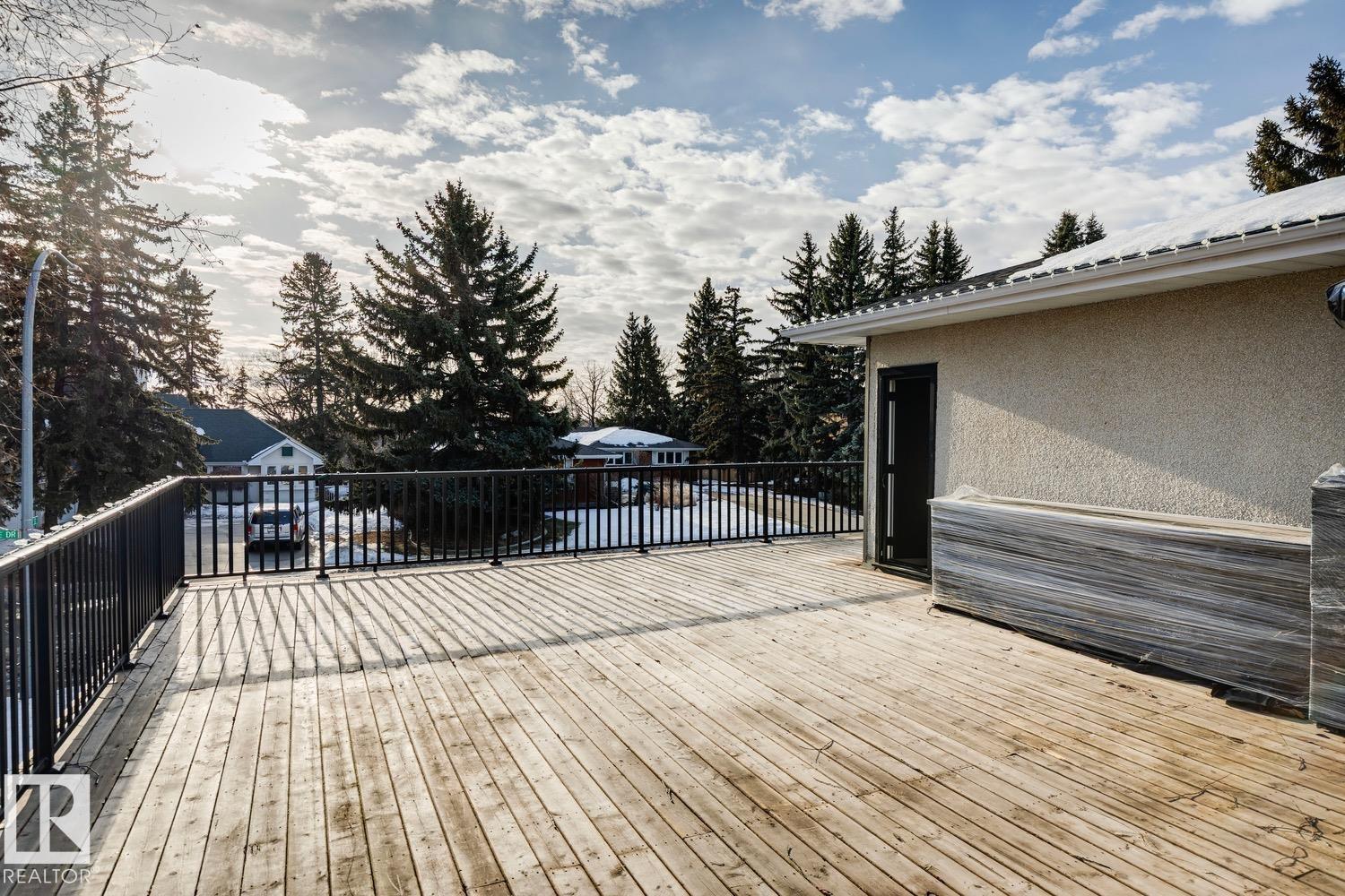 This is the one you?ve been waiting for! Welcome to this elegantly renovated two-storey, with a huge rooftop patio, in the highly desirable neighbourhood of Rio Terrace. Situated on a expertly manicured 11,290 SF lot, and across the street from the North Saskatchewan River Valley, this 4-bedroom home offers exceptional space and function for modern family living. The main floor is spacious and bright, featuring a magazine worthy living room with stone-facing fireplace and massive south facing windows. Kitchen was designed with the chef in mind, and adjacent dining room is the spot to host all your dinner parties. Down the hall you'll find a large office/den with access to the backyard & side gate - perfect for a home based business! Upstairs you?ll find three generous bedrooms including a stunning primary retreat with a massive walk-in closet & 3-piece ensuite, plus a full main bath. The basement is fully finished with large rec/family room, half-bath and 4th bedroom! Double attached garage, A/C & more!