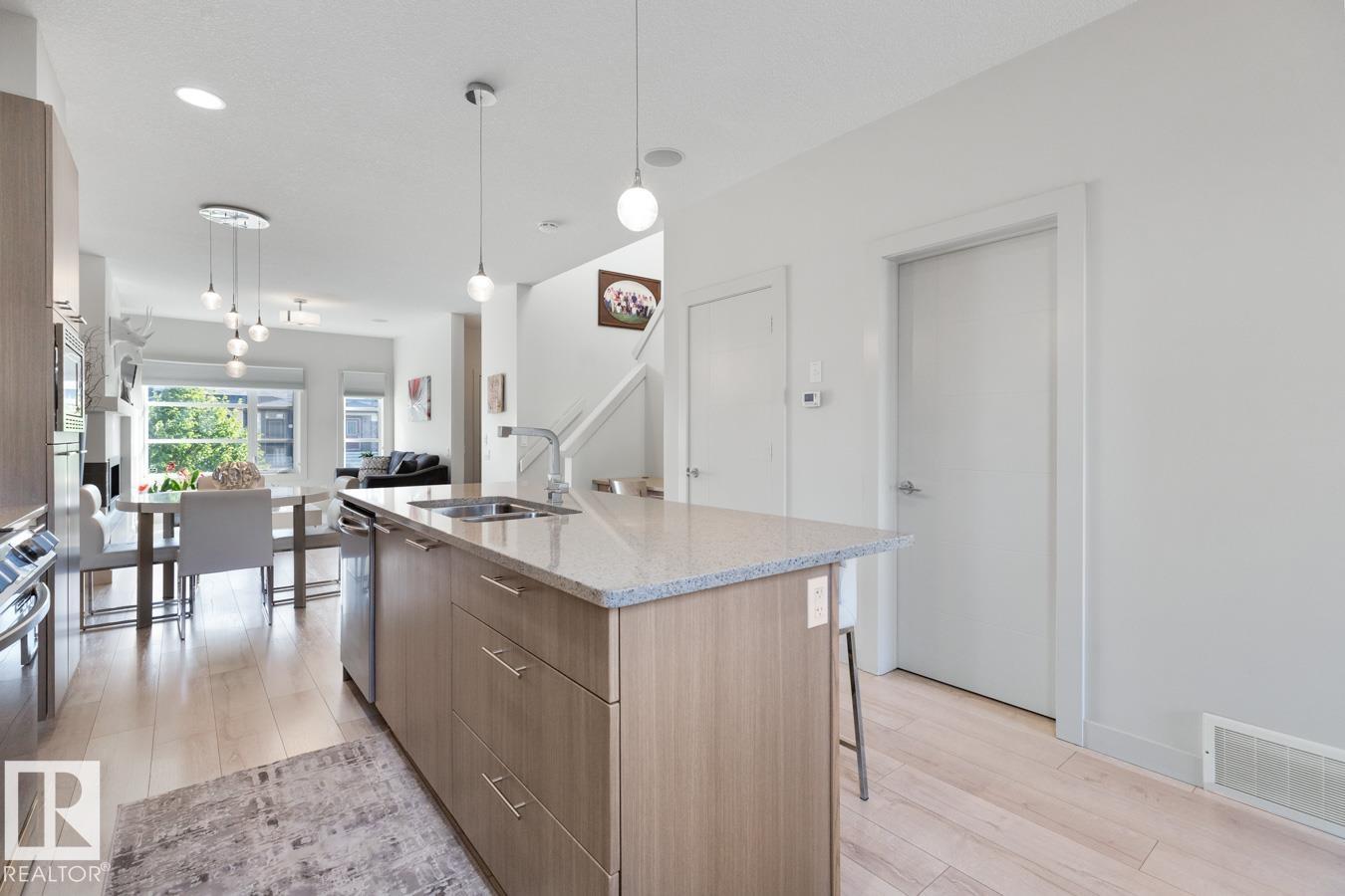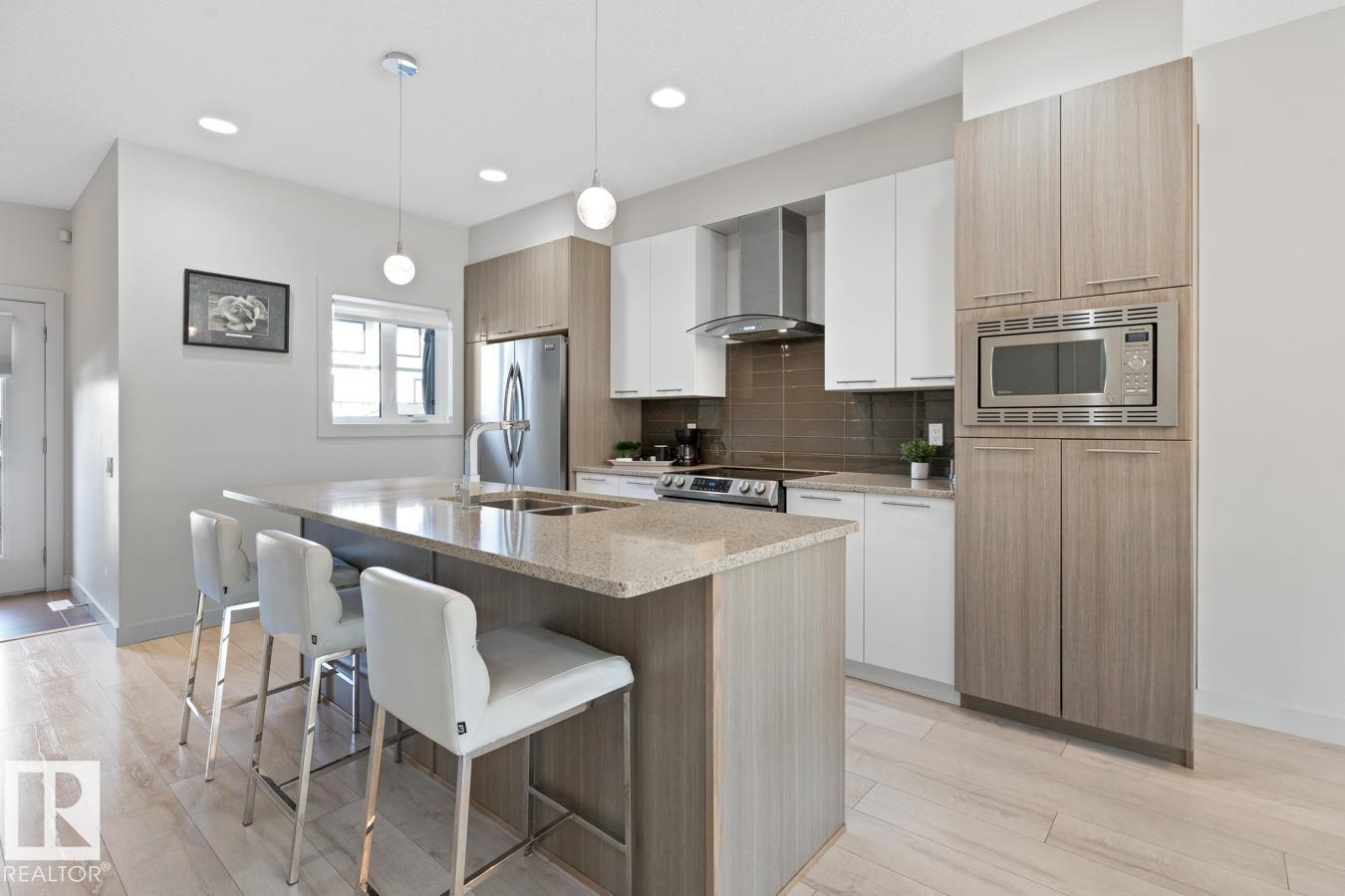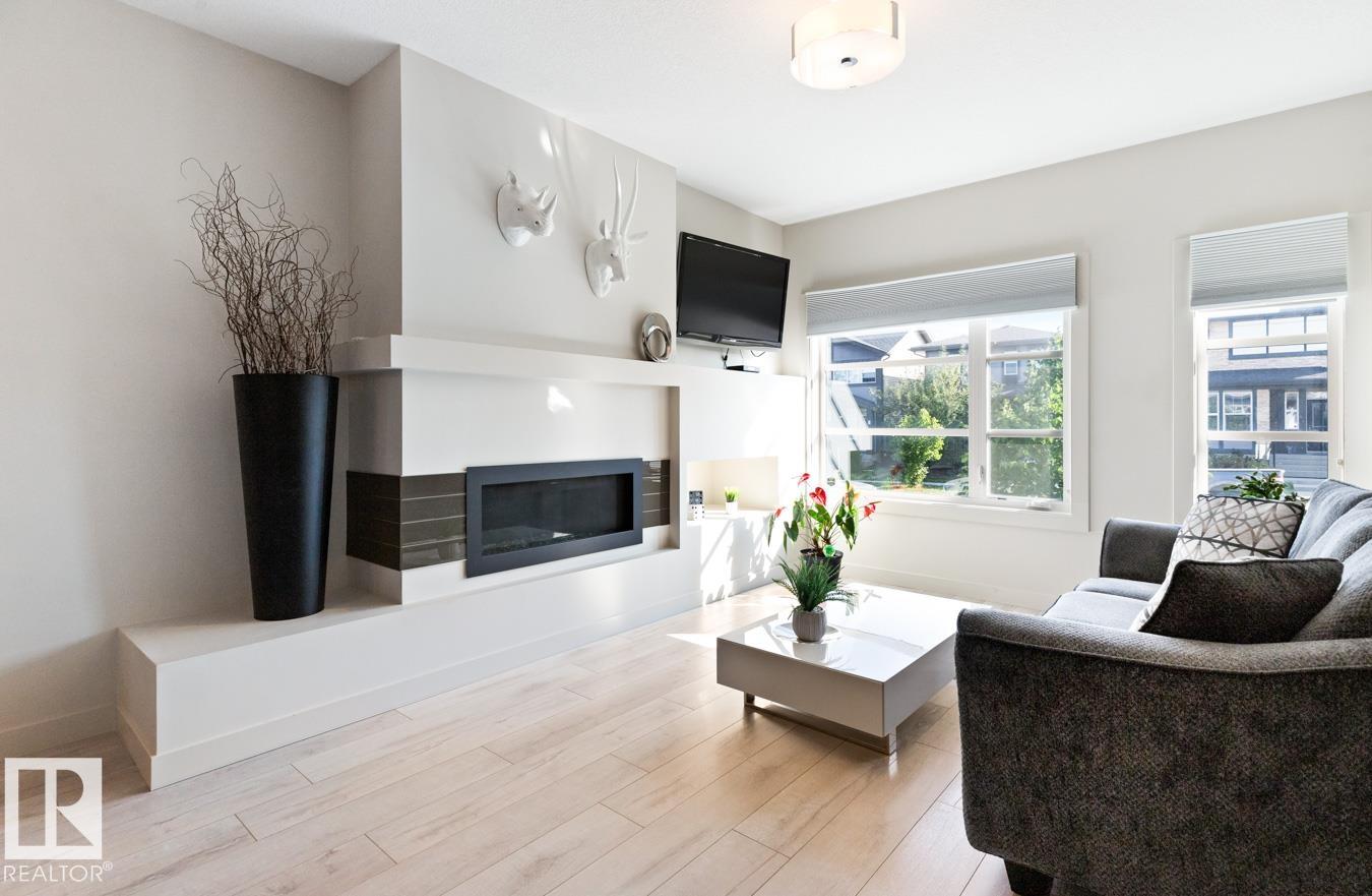 Modern, open-concept main floor crafted for daily life and hosting. The chic kitchen boasts two-tone, tall cabinets, quartz counters, subway tile, stainless appliances, plus an island seating four. Pot lights and pendants add flair. Bright dining and living areas feature a sleek fireplace wall and large windows for sun. Upstairs holds three cozy bedrooms. A finished basement offers versatility with a family room, fourth bedroom, and full bath. Outside, find a landscaped yard and a double detached garage. Move-in ready and low-maintenance. Quick Yellowhead access, near shops, schools, parks and Golf.