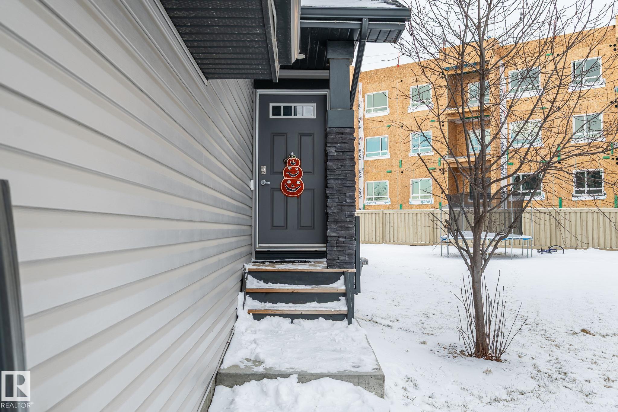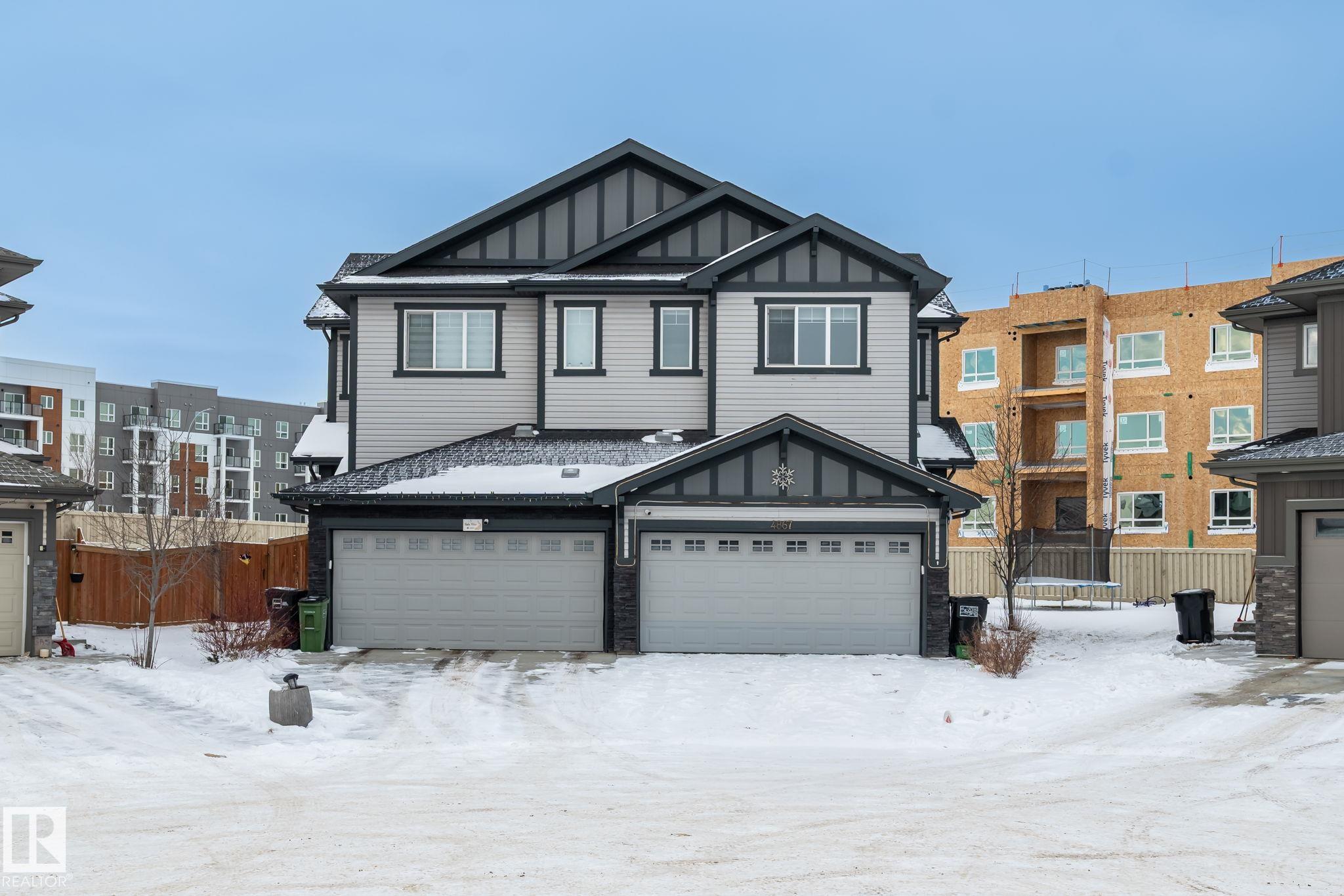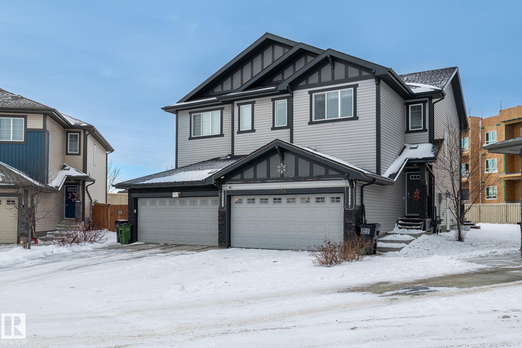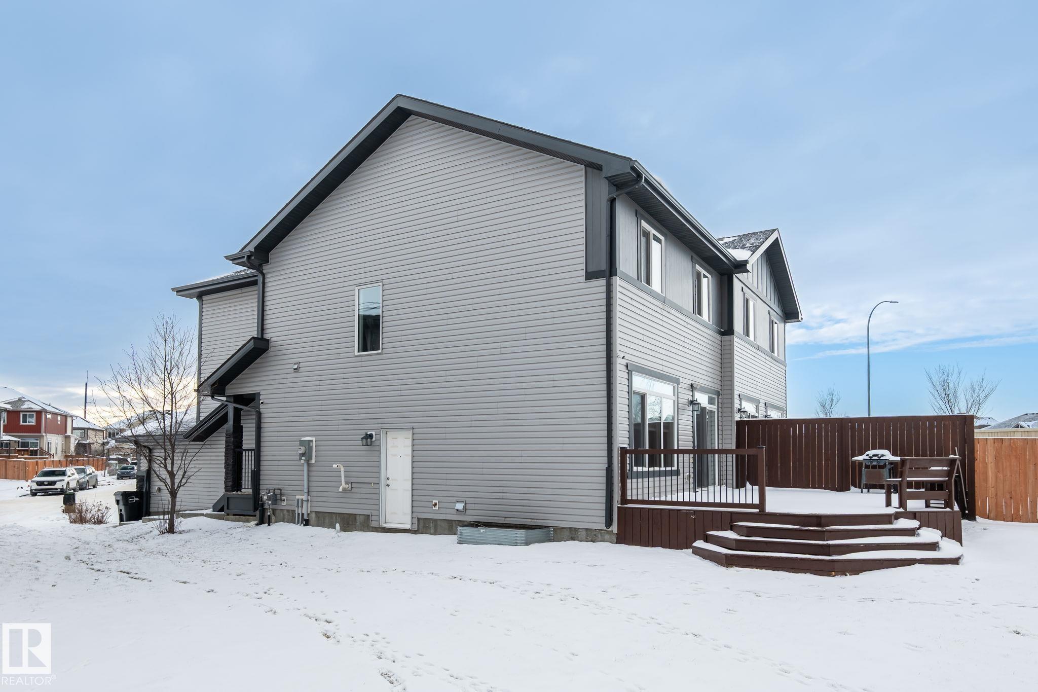 Welcome to Allard ? one of the most prestigious communities in Southwest Edmonton, where convenience meets comfort. This beautifully maintained half-duplex offers a DOUBLE GHARAGE, a separate SIDE ENTRENCE to the basement, and a generous PIE -LOT featuring a premium-finished, oversized deck. Inside, the upgraded kitchen complements the open-concept layout, seamlessly connecting the living and dining areas with views of the expansive backyard. The upper level includes three spacious bedrooms, including a master suite with its own ensuite, along with a versatile bonus room perfect for a home office or loft. The unfinished basement comes with a separate side entrance, providing an excellent opportunity to develop a future legal suite. Located close to schools and just 15 minutes from the airport, this home offers both comfort and convenience. A must-see property!