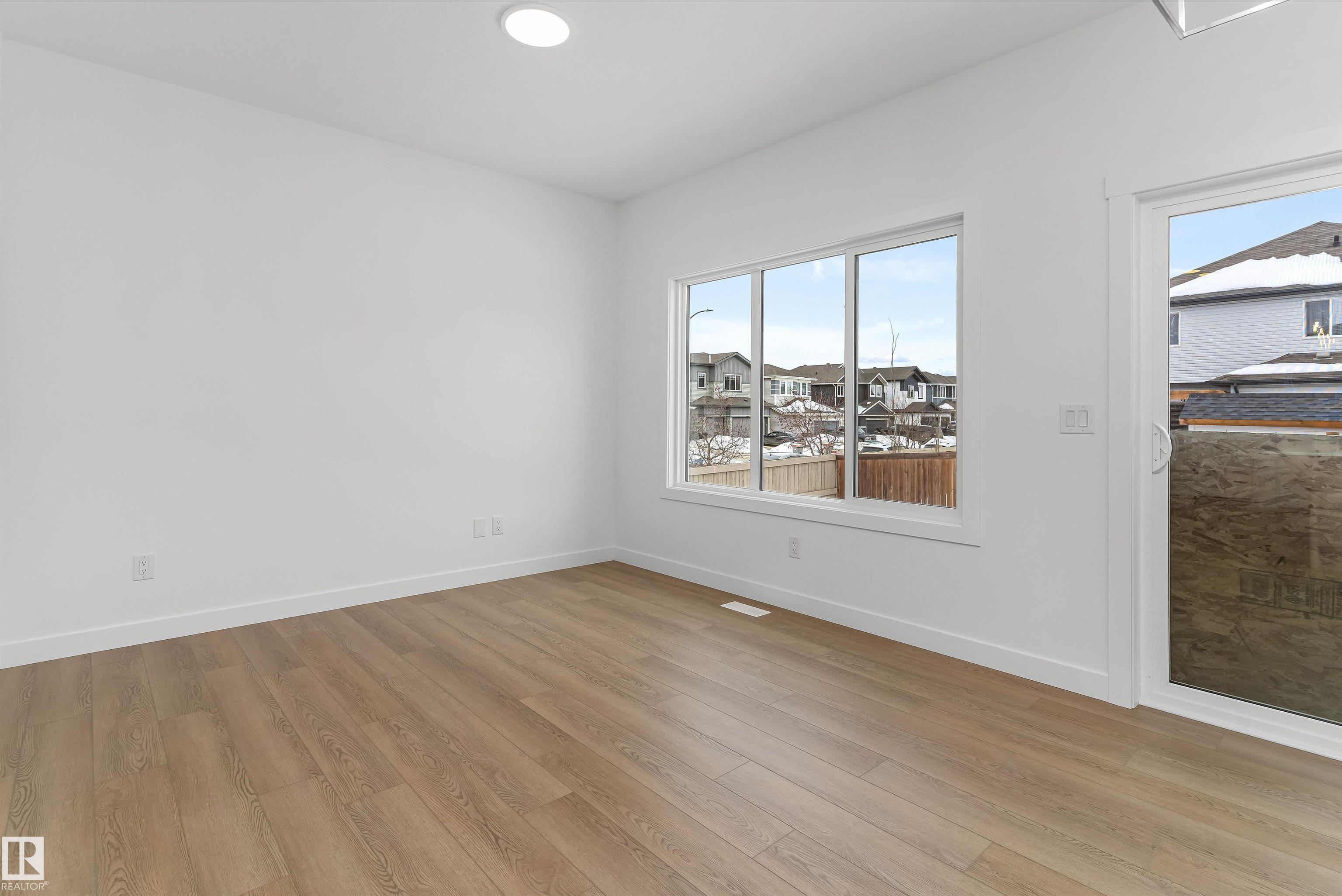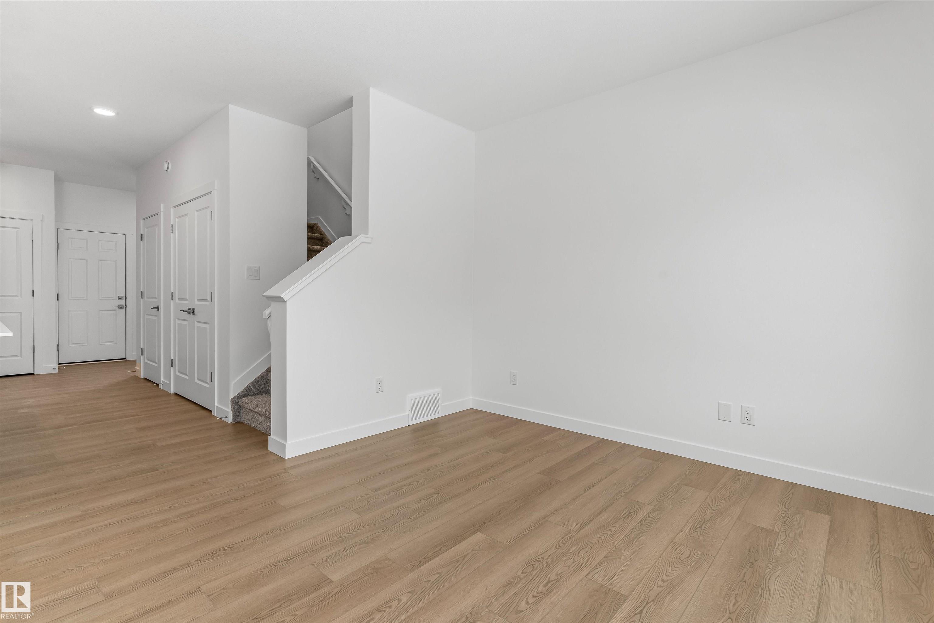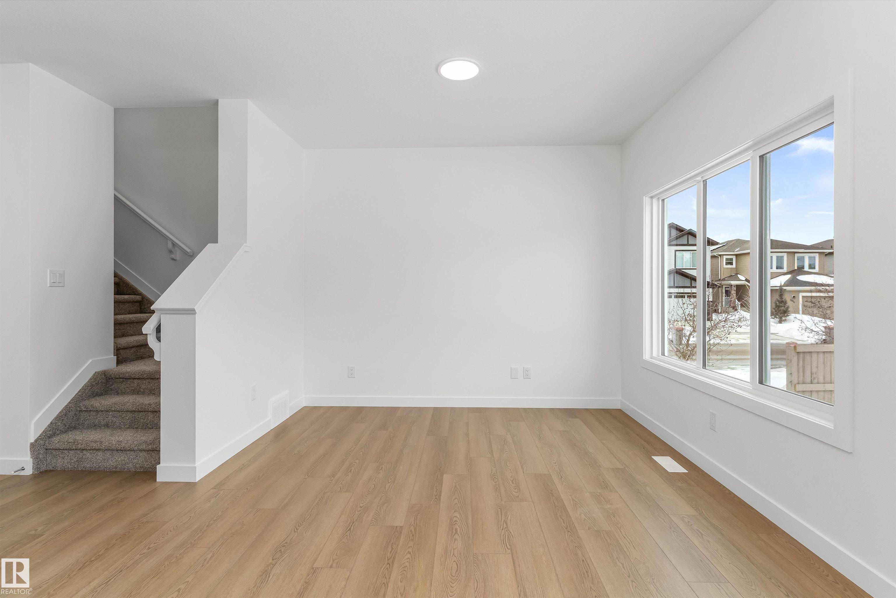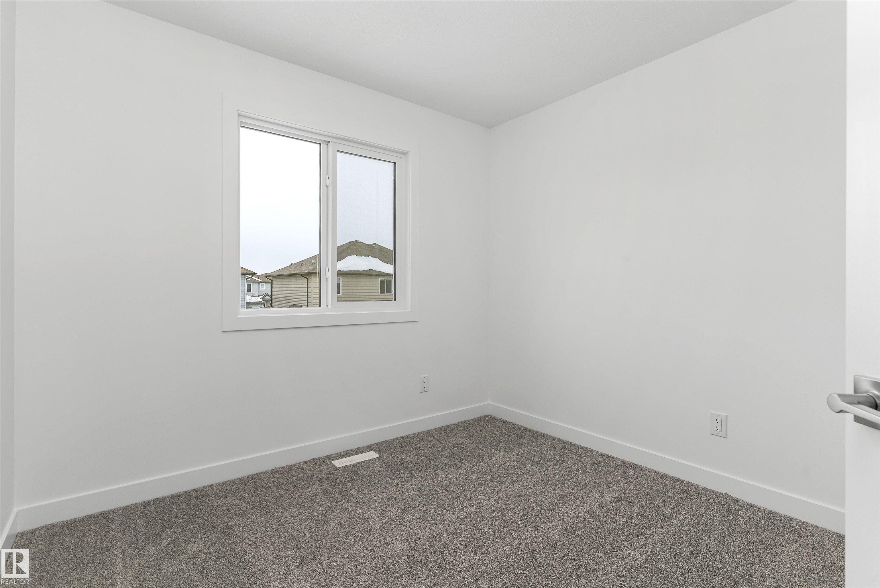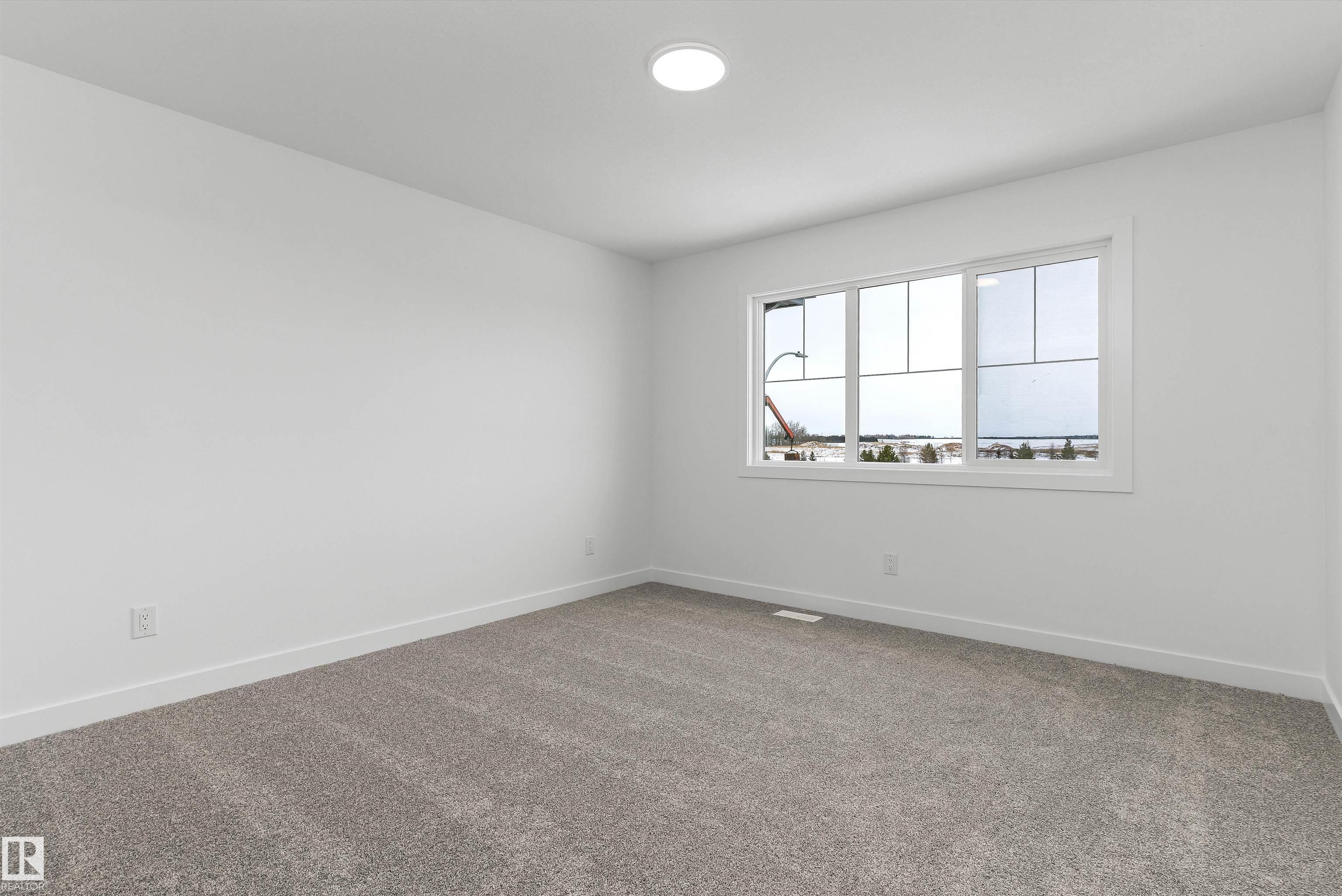 Built by Sterling Homes, this welcoming duplex in SouthCreek blends comfort, style, and everyday practicality in a peaceful Stony Plain setting. Triple pane windows and 9? ceilings enhance the bright, open main floor, where the foyer flows into a spacious living area designed for relaxed family living. The kitchen is thoughtfully finished with quartz countertops, a central island, upgraded cabinetry, chimney hood fan, built-in microwave, and full-height tile backsplash?bringing both function and modern appeal. Large rear windows and a sliding patio door fill the great room and dining area with natural light while offering views of the future backyard deck. Upstairs, the primary suite provides a private escape with a walk-in closet and ensuite featuring double sinks and a tub/shower combo. Two additional bedrooms, a full bath, upper laundry, and a versatile bonus room complete this well-designed home with space to grow.