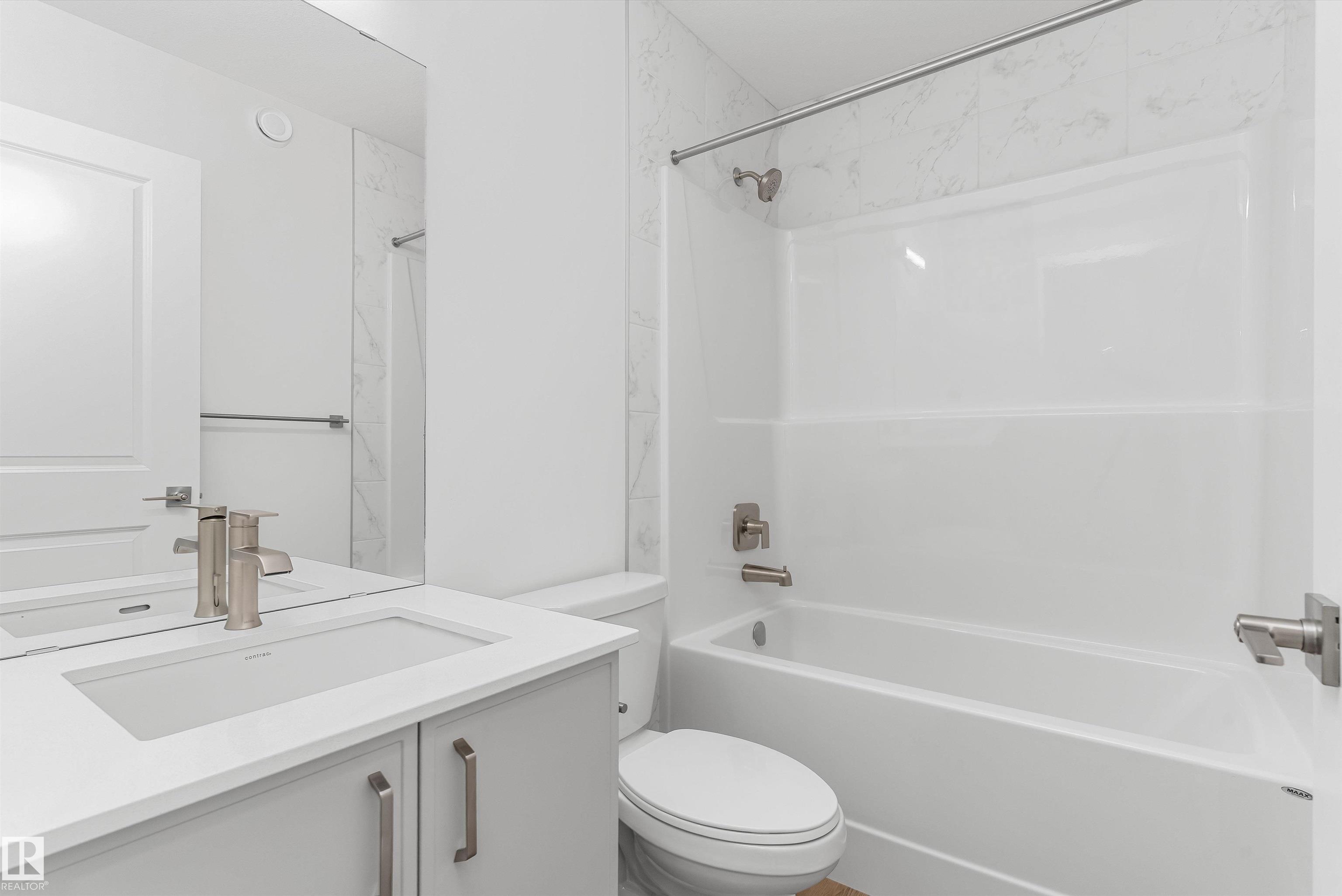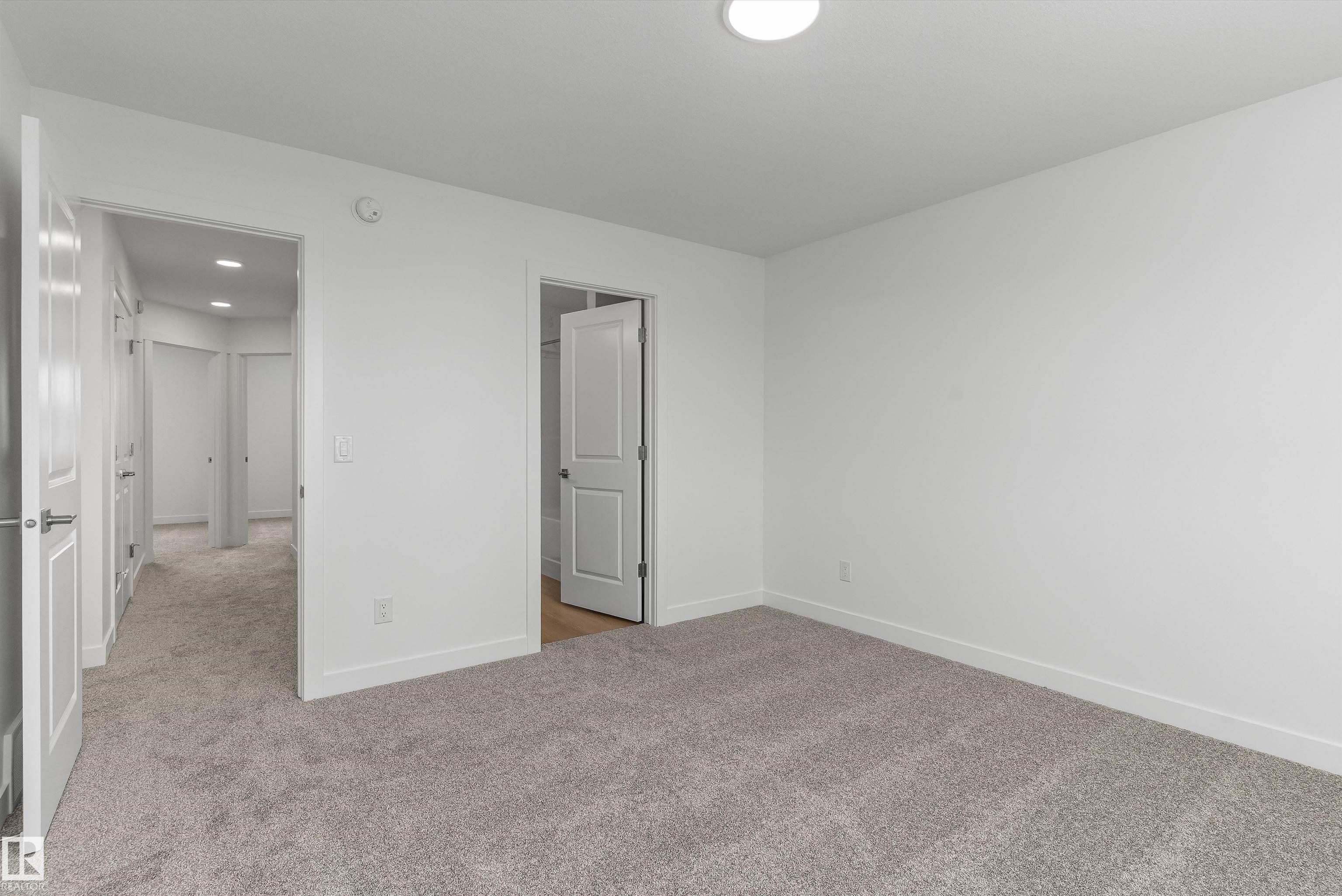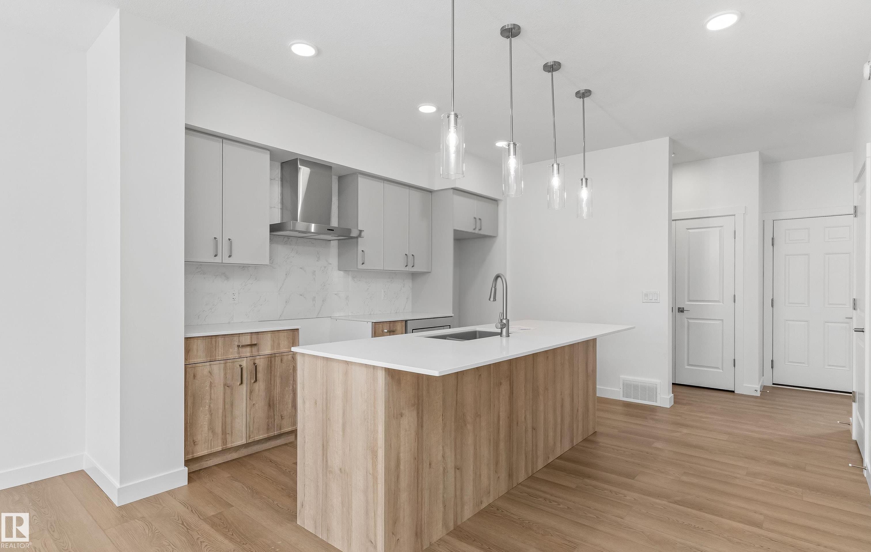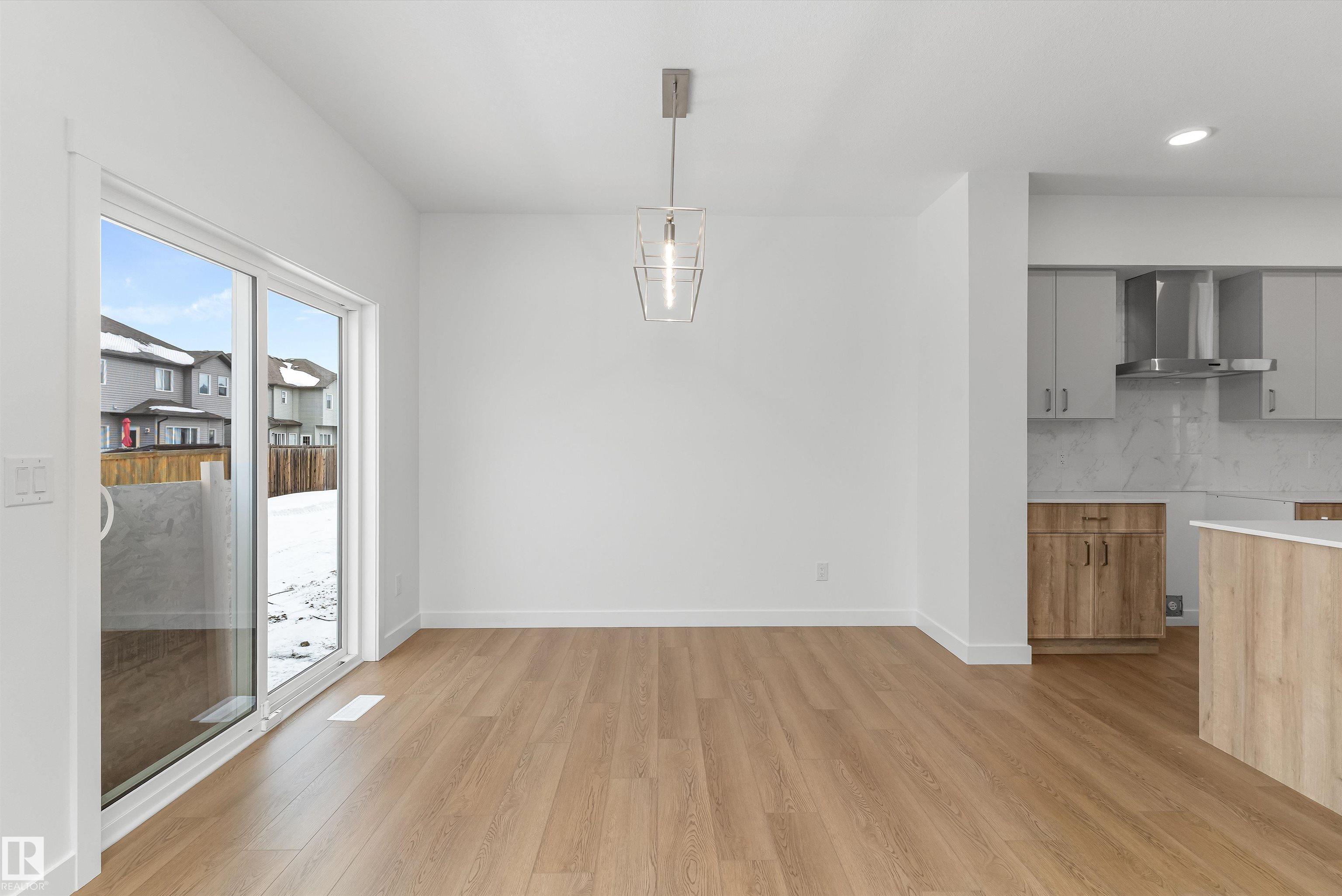 Built by Sterling Homes, this welcoming duplex in SouthCreek blends comfort, style, and everyday practicality in a peaceful Stony Plain setting. Triple pane windows and 9? ceilings enhance the bright, open main floor, where the foyer flows into a spacious living area designed for relaxed family living. The kitchen is thoughtfully finished with quartz countertops, a central island, upgraded cabinetry, chimney hood fan, built-in microwave, and full-height tile backsplash?bringing both function and modern appeal. Large rear windows and a sliding patio door fill the great room and dining area with natural light while offering views of the future backyard deck. Upstairs, the primary suite provides a private escape with a walk-in closet and ensuite featuring double sinks and a tub/shower combo. Two additional bedrooms, a full bath, upper laundry, and a versatile bonus room complete this well-designed home with space to grow.