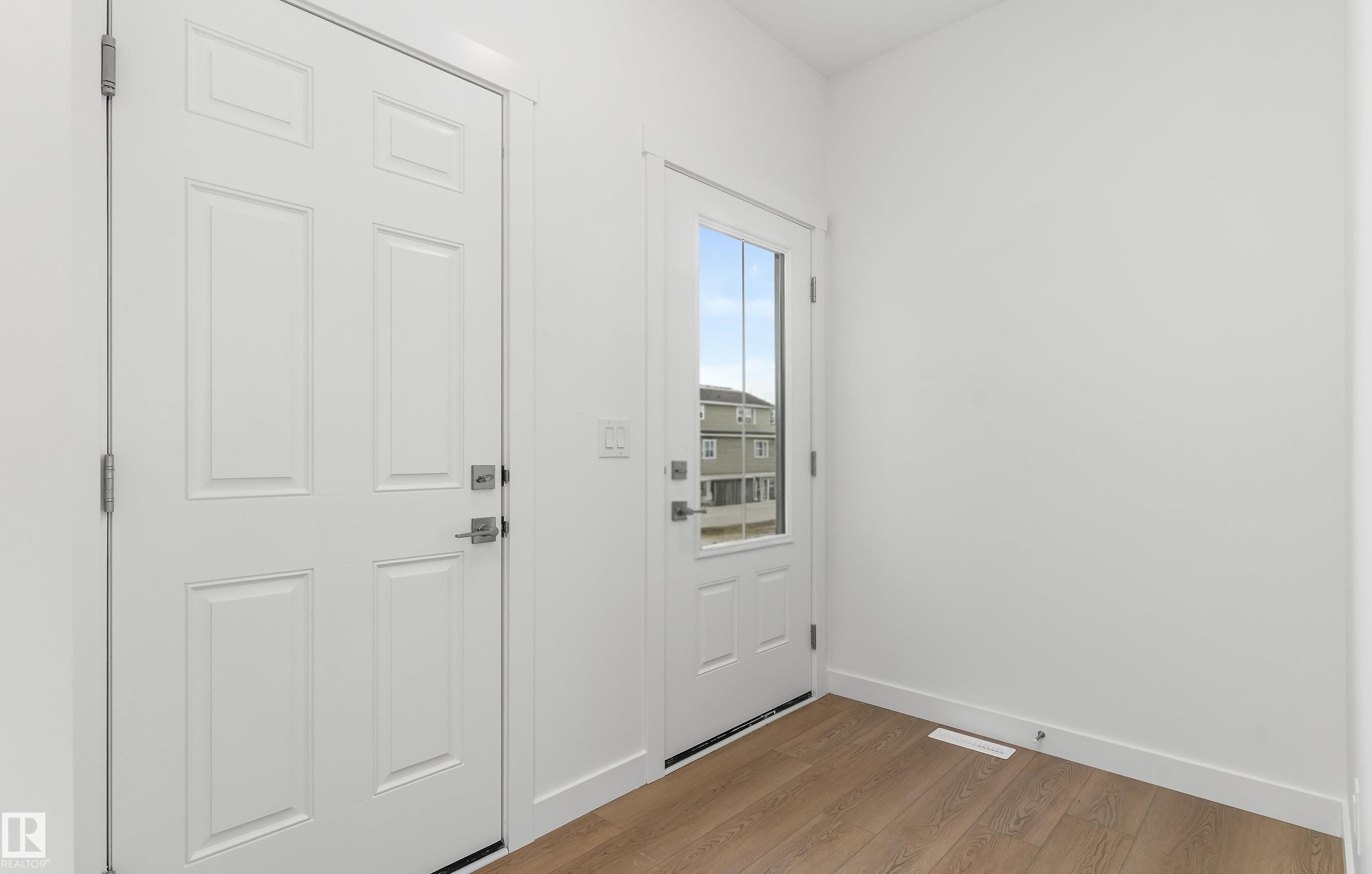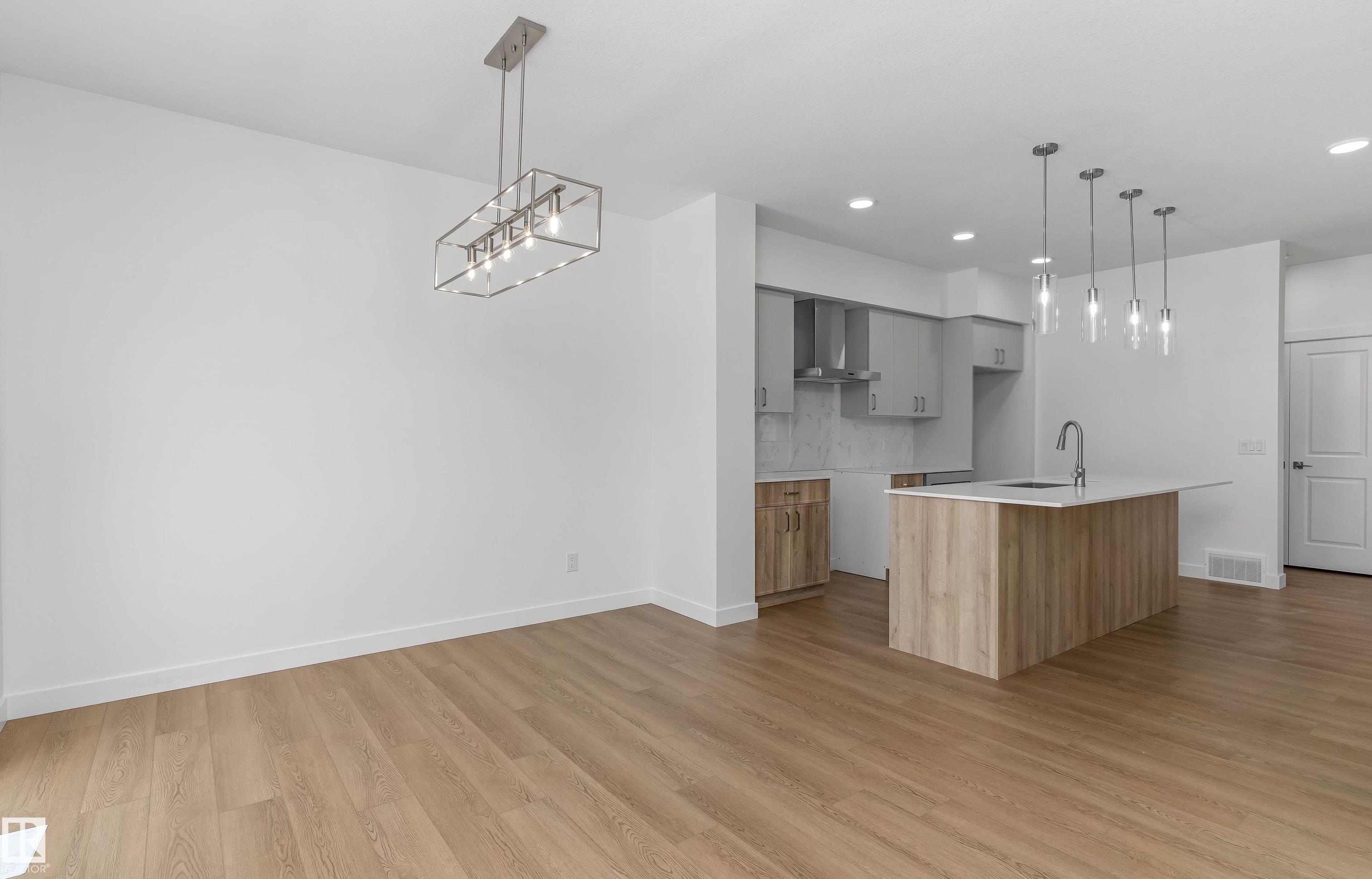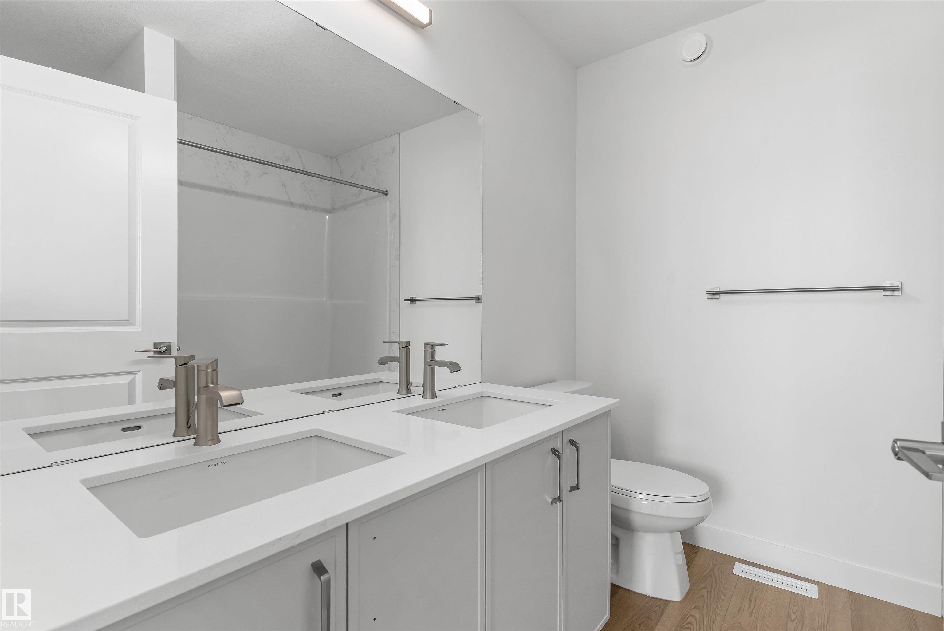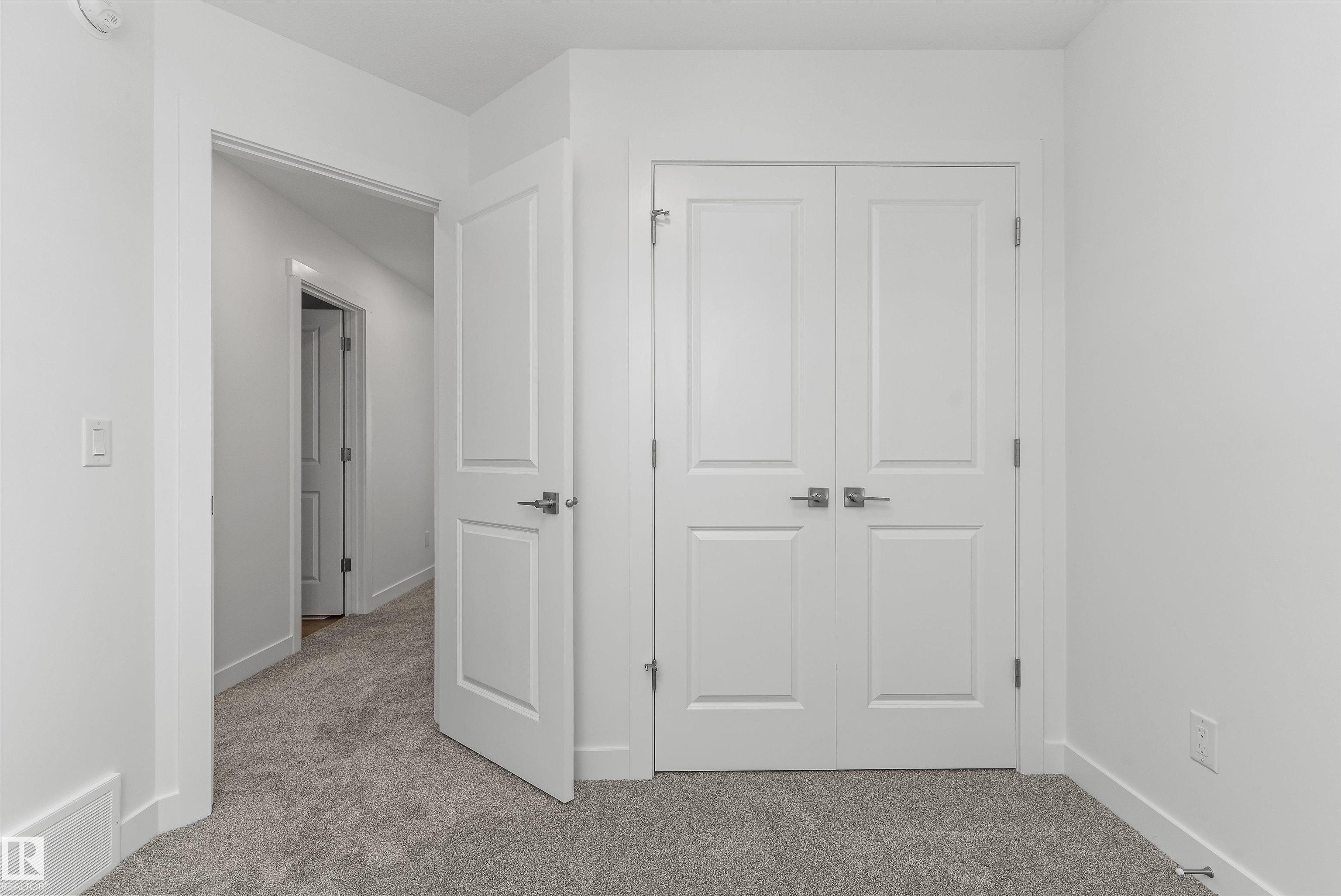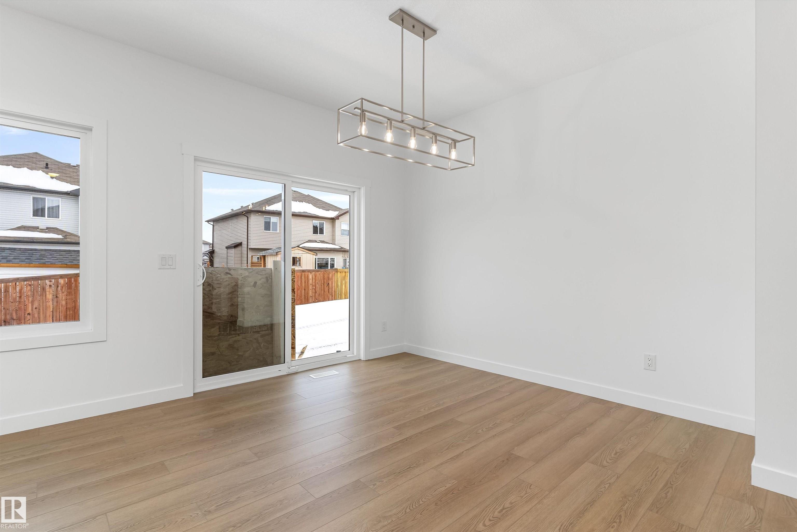 Built by Sterling Homes, this welcoming duplex in SouthCreek blends comfort, style, and everyday practicality in a peaceful Stony Plain setting. Triple pane windows and 9? ceilings enhance the bright, open main floor, where the foyer flows into a spacious living area designed for relaxed family living. The kitchen is thoughtfully finished with quartz countertops, a central island, upgraded cabinetry, chimney hood fan, built-in microwave, and full-height tile backsplash?bringing both function and modern appeal. Large rear windows and a sliding patio door fill the great room and dining area with natural light while offering views of the future backyard deck. Upstairs, the primary suite provides a private escape with a walk-in closet and ensuite featuring double sinks and a tub/shower combo. Two additional bedrooms, a full bath, upper laundry, and a versatile bonus room complete this well-designed home with space to grow.