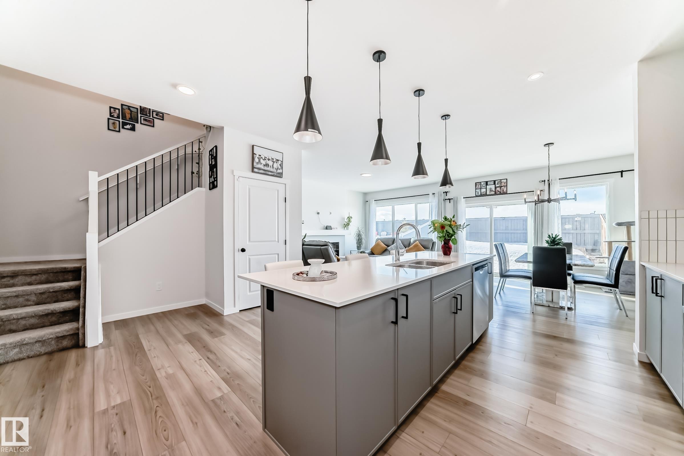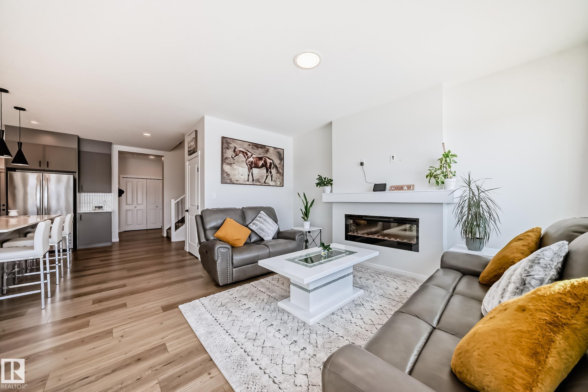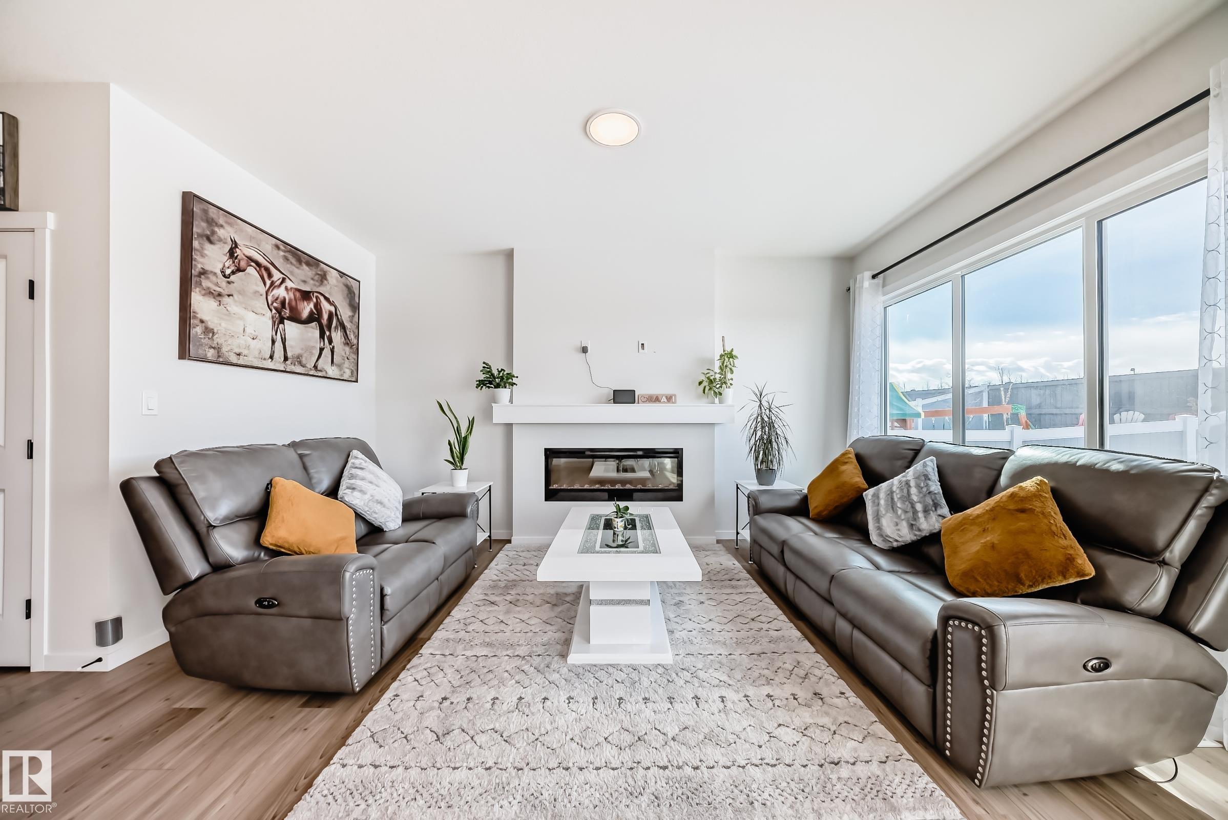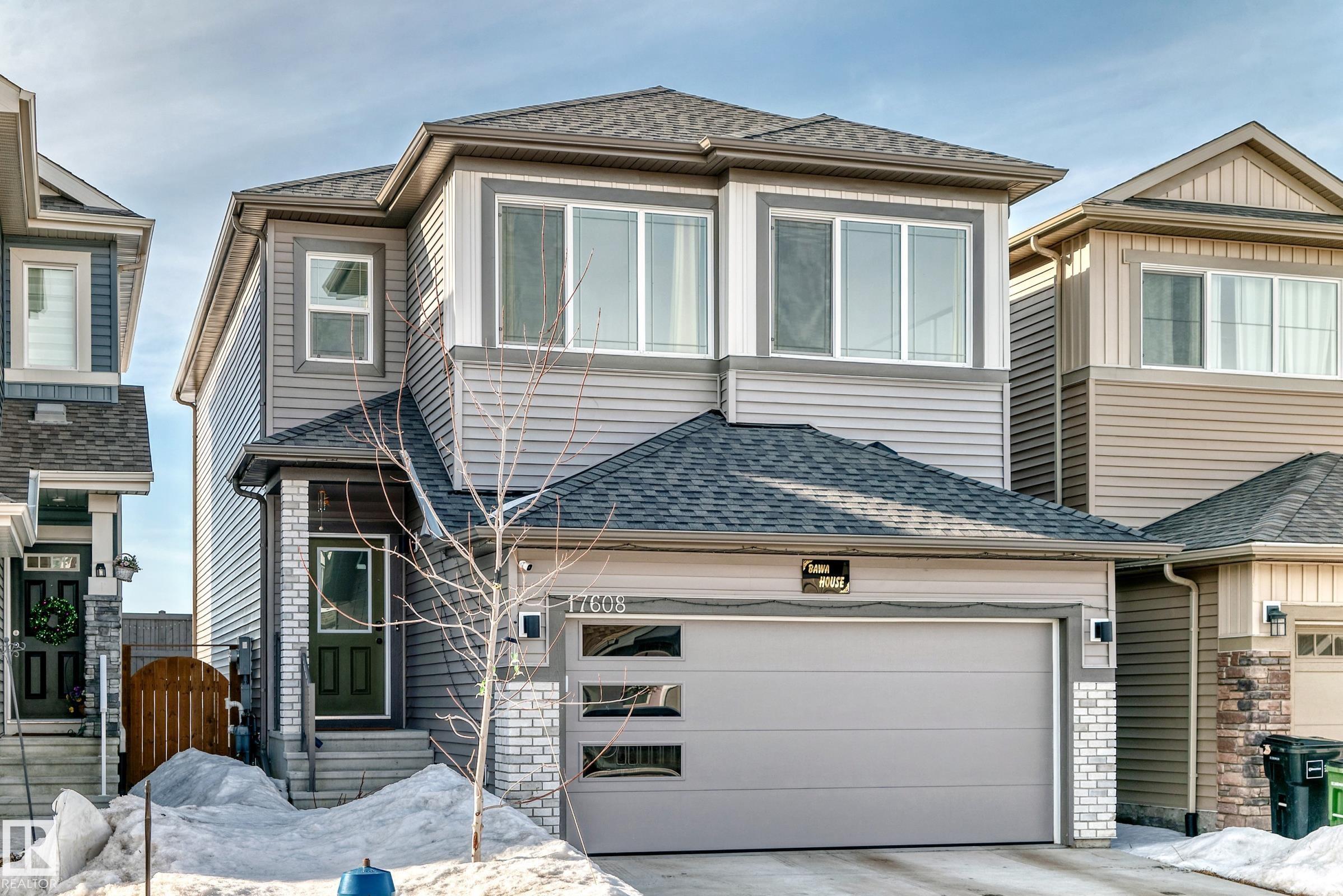 Welcome to this beautiful single-family home built by Coventry Homes. Offering just under 2200 SQ/FT, this stunning 3 bedroom, 2.5 bath home has it all and is located in the family-friendly community of Cy Becker. The main floor showcases durable laminate flooring throughout and an open-concept kitchen, living, and dining area. The living room features an electric fireplace with mantle and large picturesque windows. The spacious kitchen includes stylish cabinets, an under-mount sink, stainless steel appliances with built-in microwave and chimney-style hood fan, quartz countertops, and a huge island perfect for entertaining. A 2-piece bath and iron-railed staircase complete the main level. Upstairs offers a large central bonus room, convenient upper laundry, a 4-piece main bath with quartz vanity, two additional spacious bedrooms, and a primary bedroom with walk-in closet and 5-piece ensuite featuring quartz vanity, dual sinks, soaker tub, and separate shower. Enjoy fully landscaped & fenced yard.