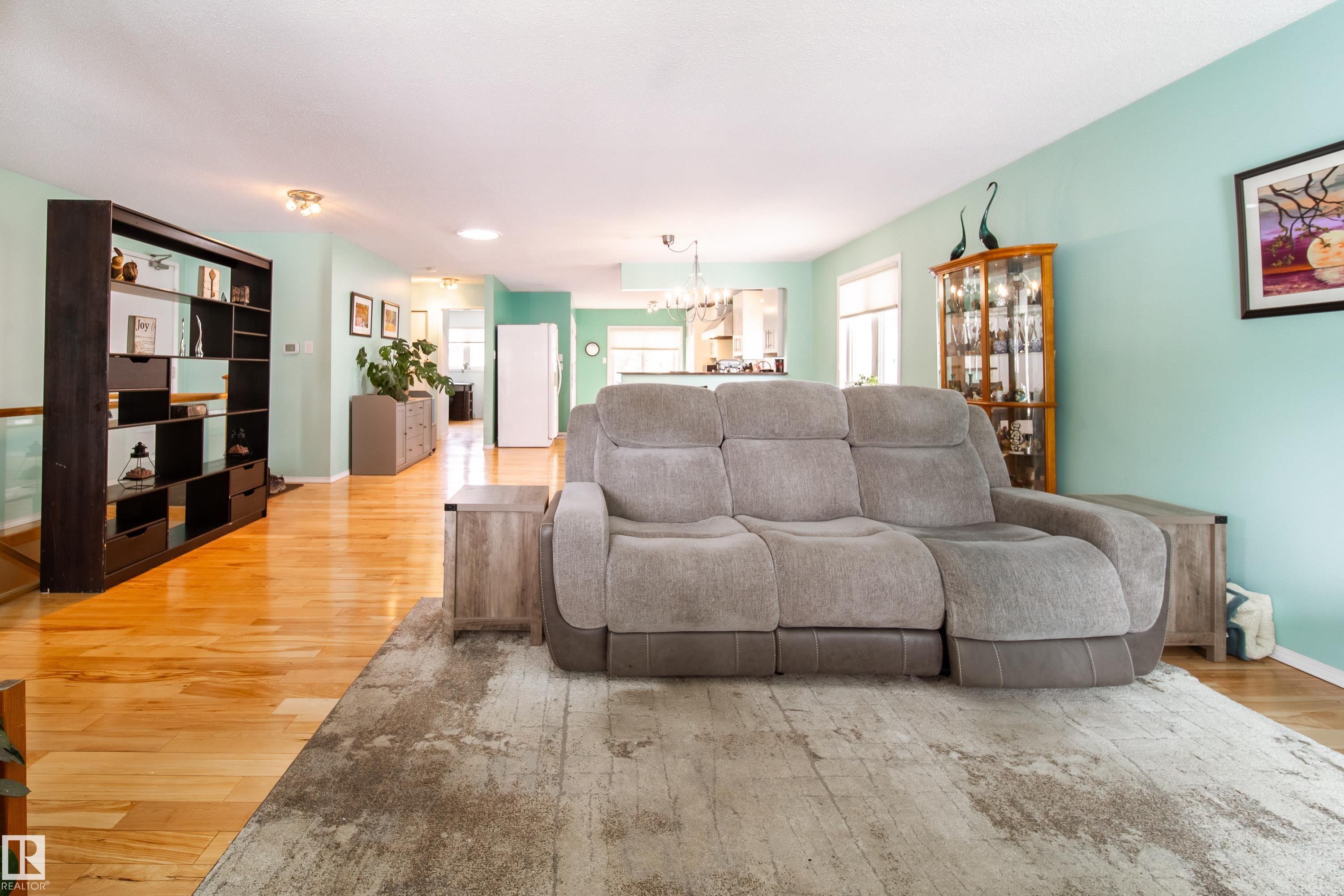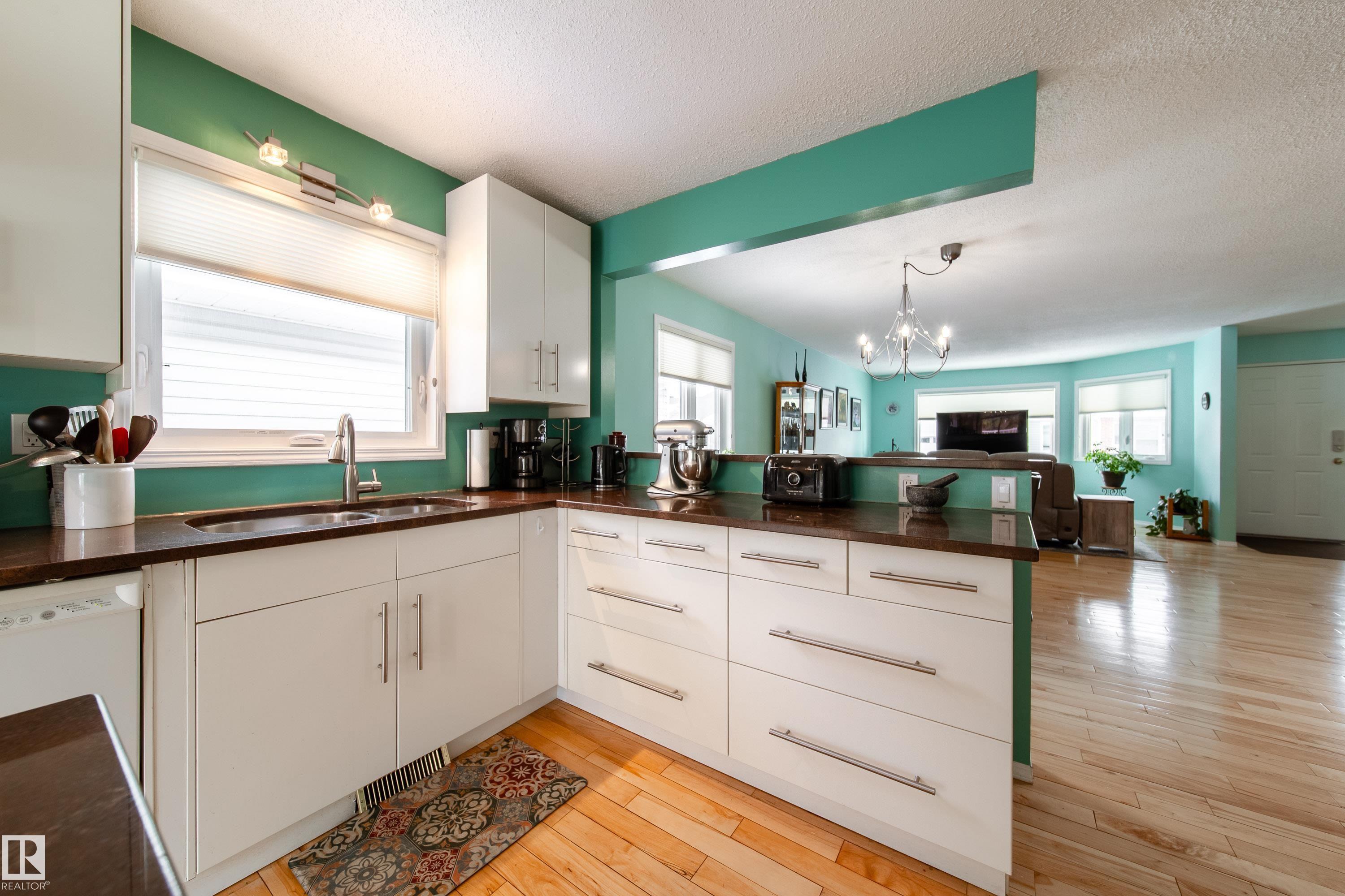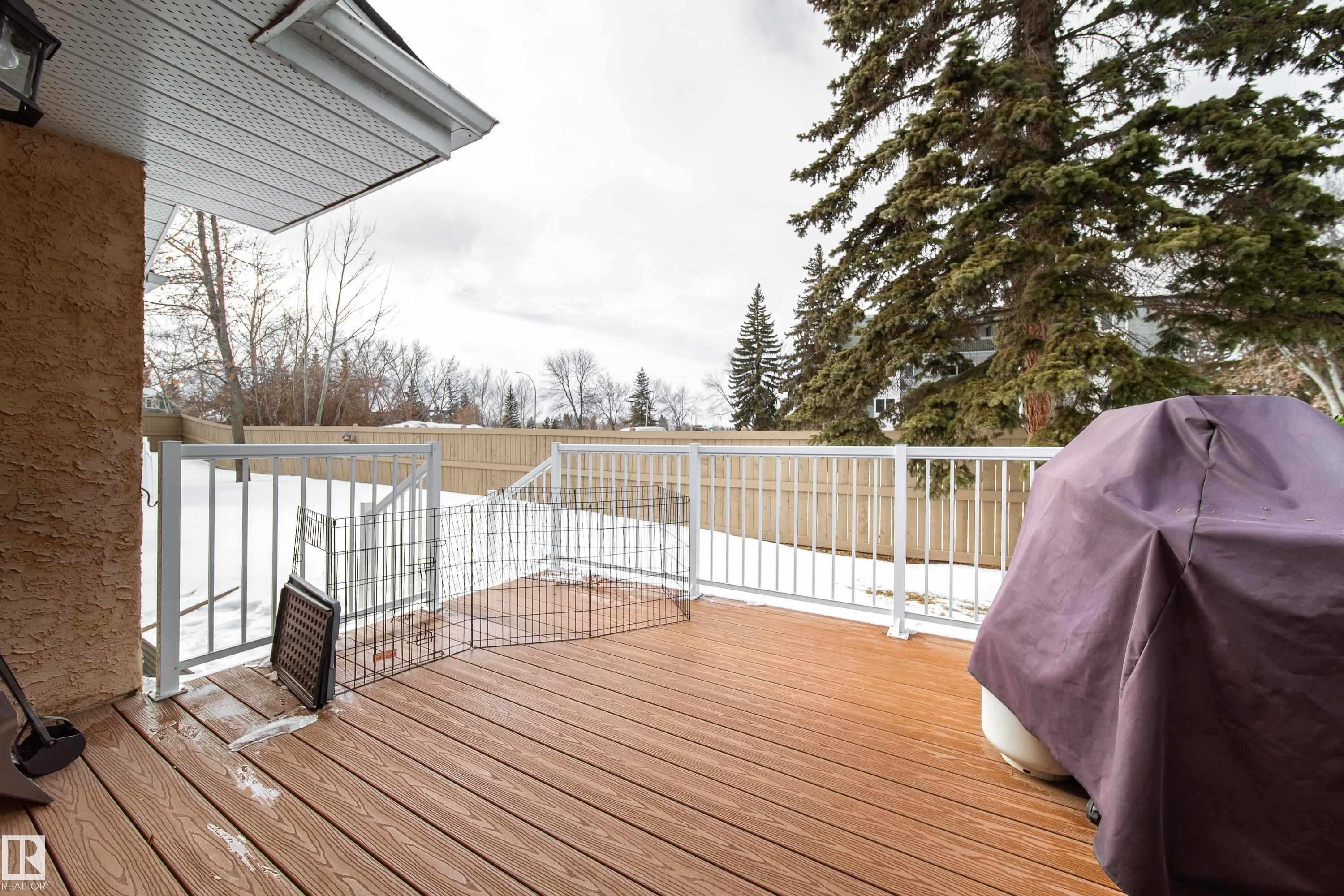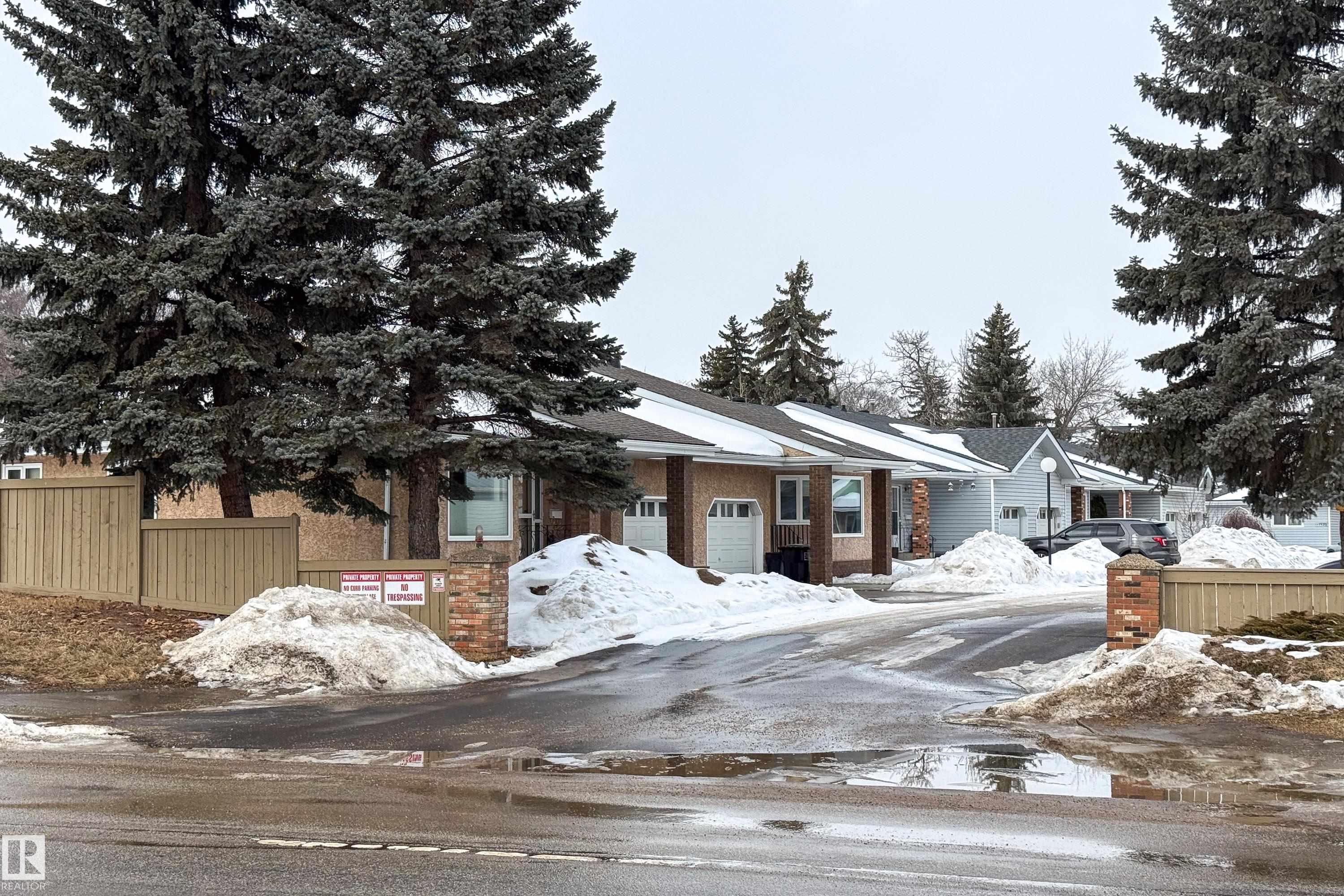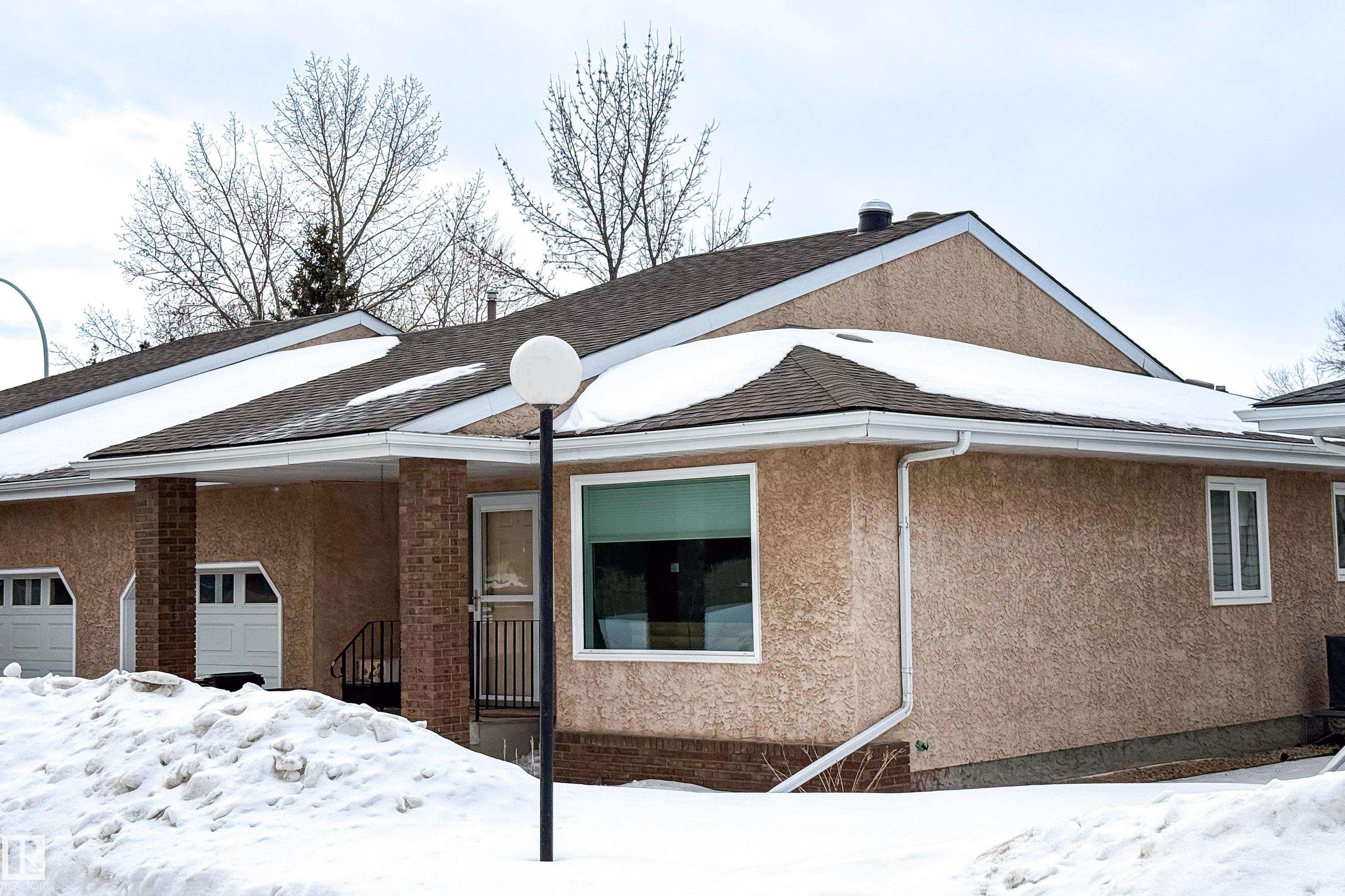 Renovated 55+ bungalow living in desirable Callingwood! This beautifully updated duplex condo offers bright, open-concept living with hardwood flooring, two spacious main-floor bedrooms, and a main bathroom featuring a walk-in shower for comfort and accessibility. The standout gourmet kitchen is perfect for those who love to cook, complete with granite countertops, large island, multiple pantry spaces, and an impressive six-burner gas stove. Main floor laundry adds everyday convenience and can easily be relocated back to the basement if desired. The fully finished lower level provides a large workshop and excellent storage space, ideal for hobbies or projects. Enjoy evenings on your west-facing deck (with gas BBQ hookup), perfect for relaxing or entertaining. Residents also enjoy access to a separate social building for gatherings, all within a well-located west Edmonton community close to shopping, amenities, and transit.
