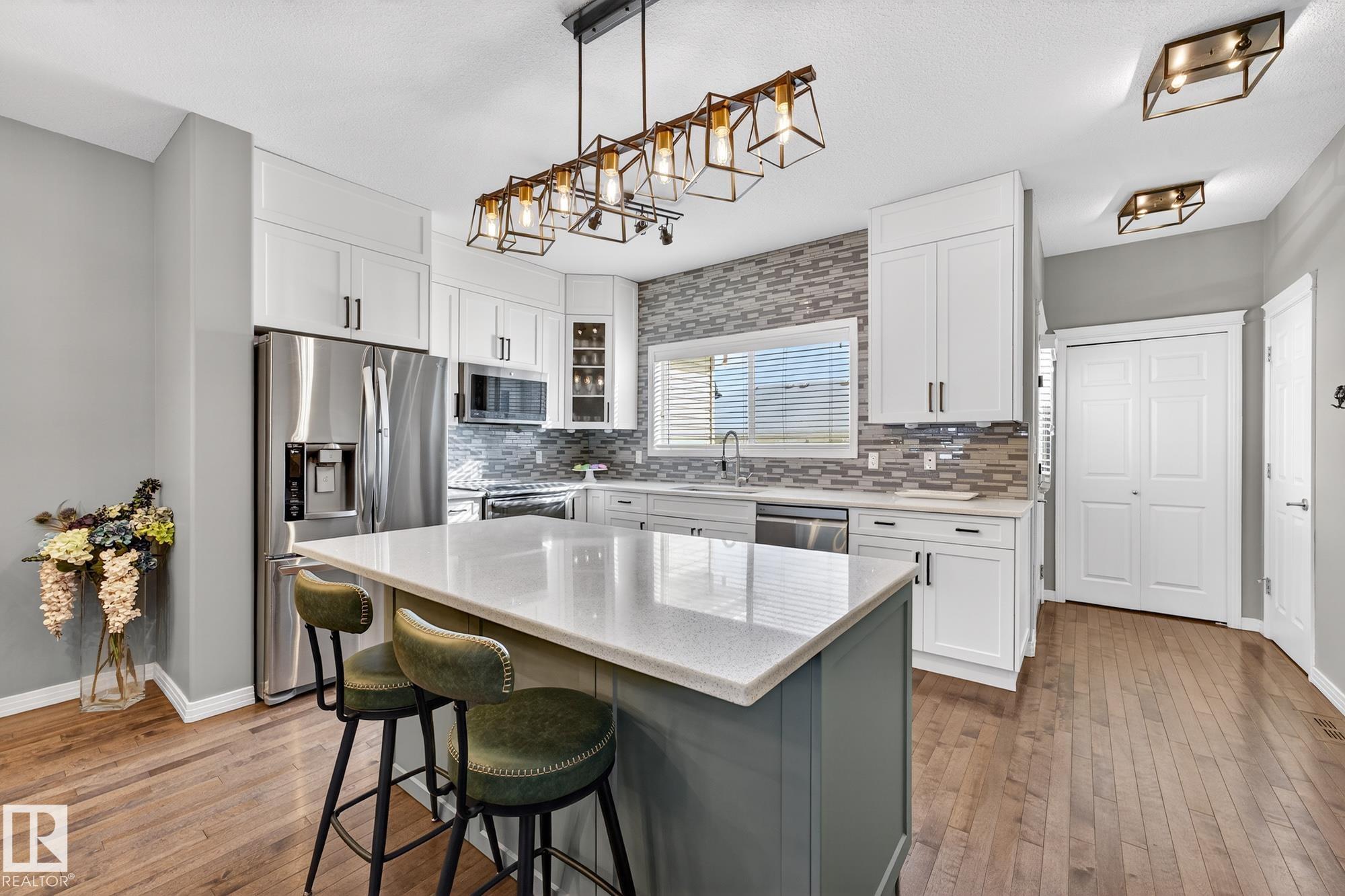 Welcome to The Terraces of Griesbach. Tucked away on a quiet street in central Edmonton, just minutes from shopping, transit, walking paths & more! From the moment you arrive, you?ll love the charming curb appeal & inviting front veranda. Inside, the living room is filled w/ natural light from large front windows & features hardwood floors & a refinished fireplace. The renovated kitchen showcases modern white soft-close cabinetry, quartz countertops, newer appliances, & views of the low-maintenance yard (artificial turf) & double garage. An updated 2-piece bath completes the main floor. Upstairs, you?ll find 2 spacious bedrooms. One w/ cork flooring & a private balcony, along w/ upper-level laundry (washer/dryer 2020) & a Jack-and-Jill 4-piece bathroom. The entire third floor is dedicated to the primary bedroom, offering vaulted ceilings, a walk-in closet, & a 4-piece ensuite. The finished basement includes a large rec room w/ a bar. Additional features: A/C, central vacuum, Hunter Douglas blinds & MORE!