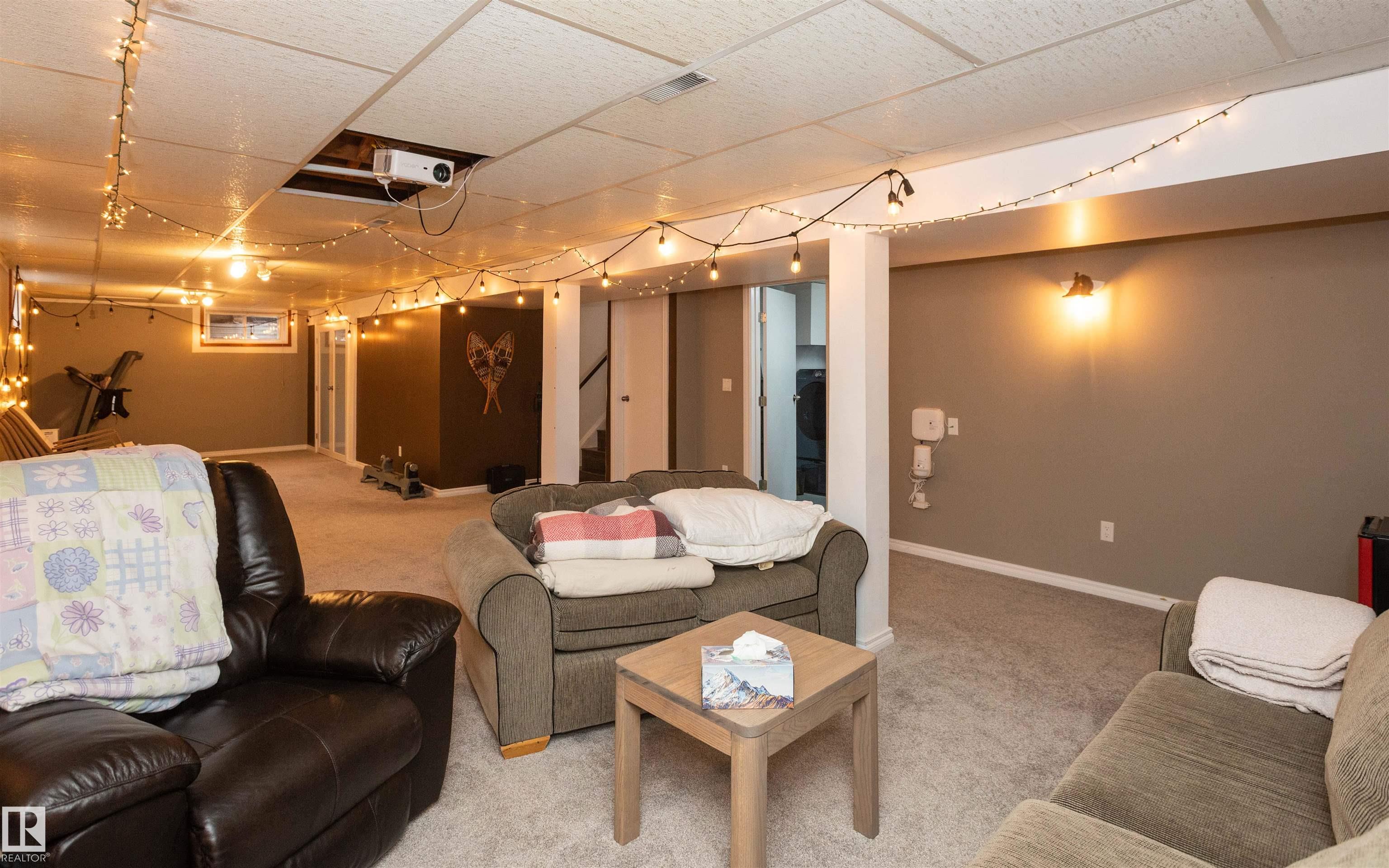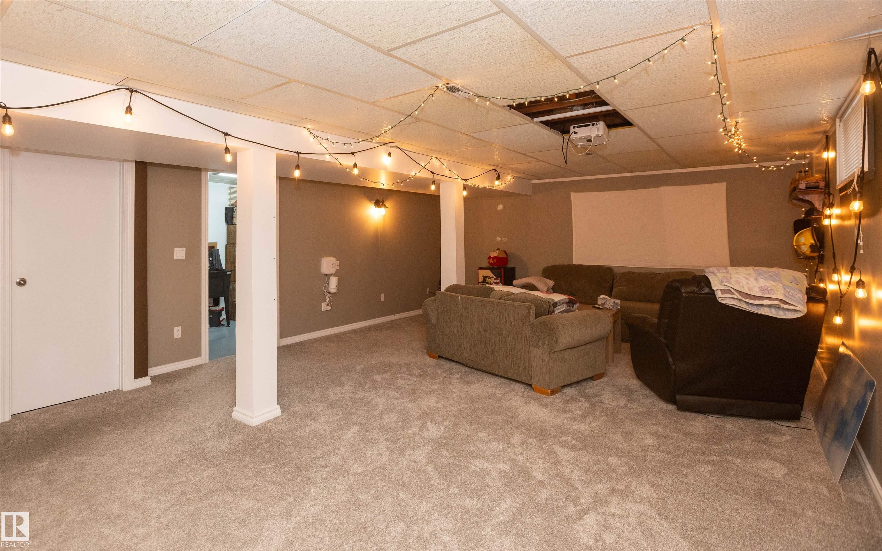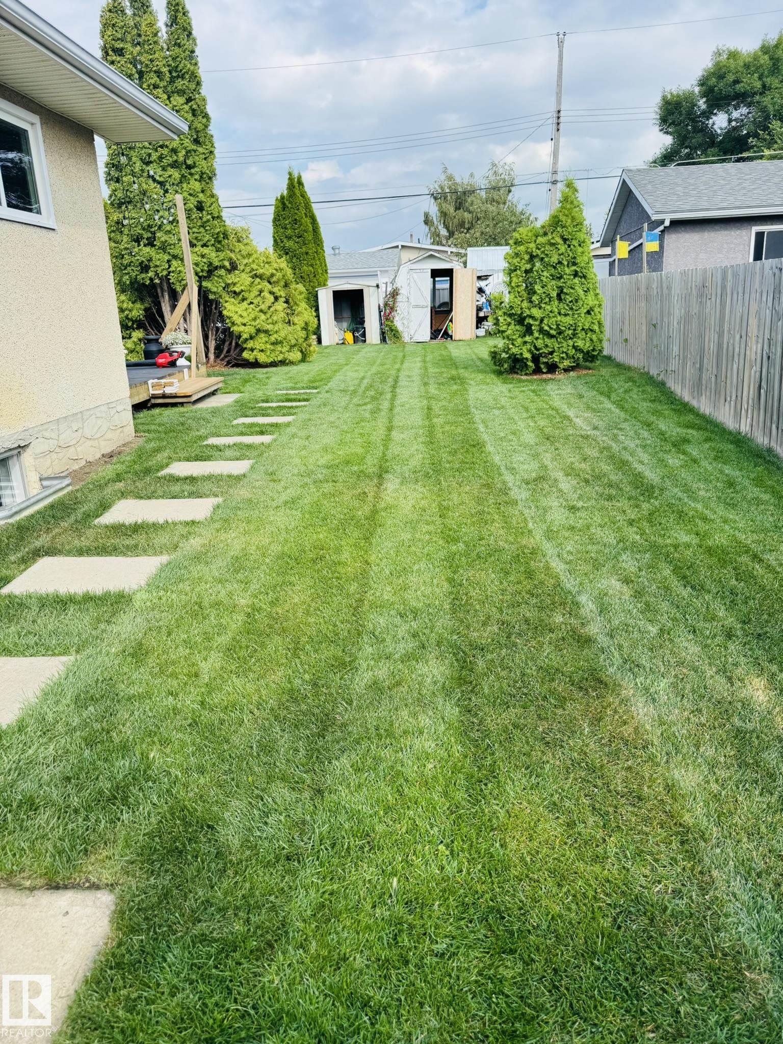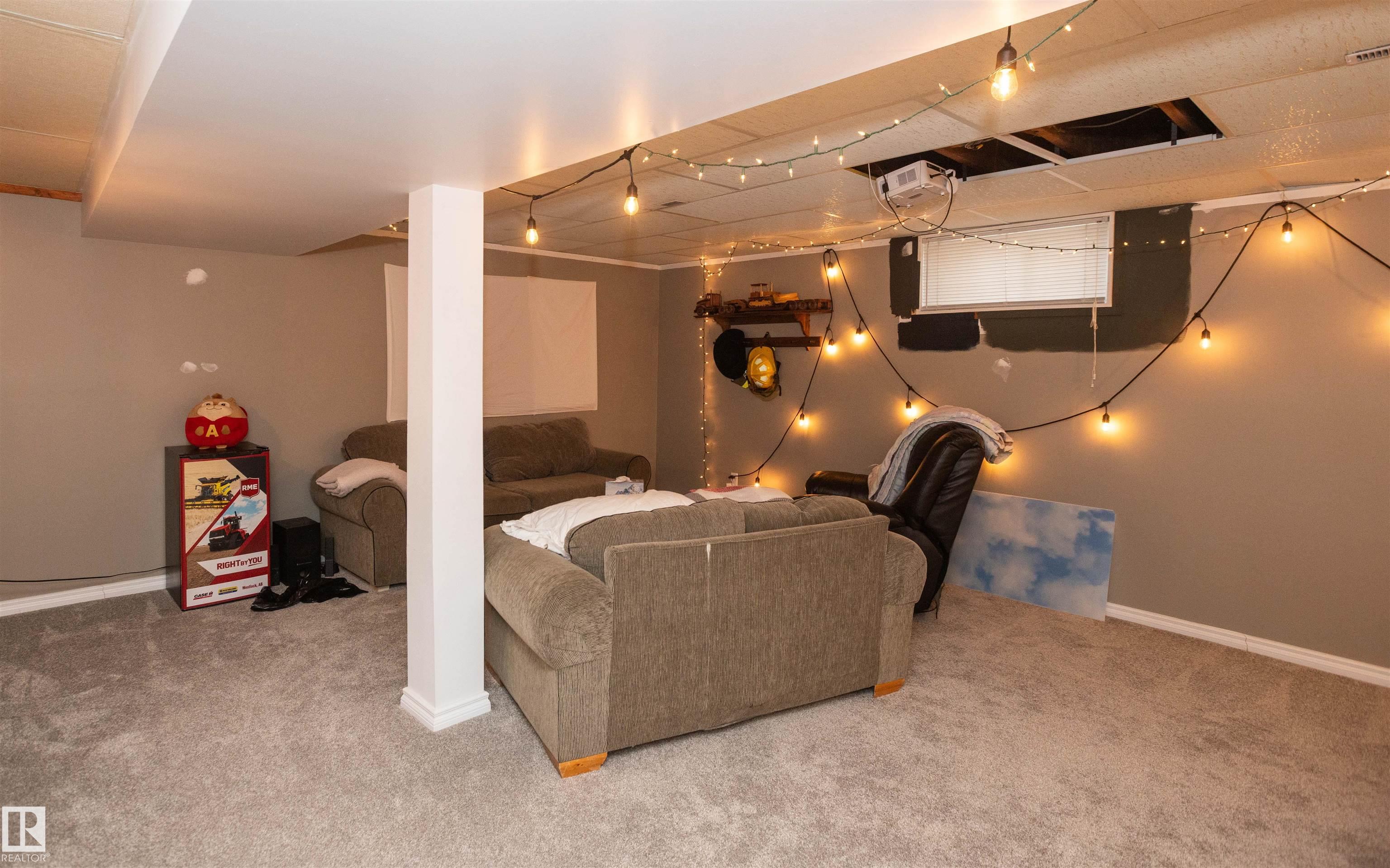 Across from Westlock Elementary school is a lovely home. Bright south-facing kitchen w/white cabinets, nice countertops, beautiful appliances (gas stove 1 yr) & nice eating area. Patio doors to deck on west. Spacious living room is lovely & bright. Three bedrooms main floor- the primary bdrm has full wall of closets. Bdrm 2 - nice size & bdrm 3 makes a nice den or office w/patio doors to large deck. Main floor bath w/double sinks, deep soaker tub & ceramic floor. Downstairs you'll find a massive family room w/beautiful carpet, large bdrm w/French doors & ensuite bath, laundry room w/plenty of space & front load W/D, storage room & furnace room. On your front deck sit and watch the fireworks on July 01. In the rear yard enjoy the beautiful new deck, trees & privacy. There is an area perfect for a garden, also two storage sheds, trees, new lawn & new landscaping! New shingles 2023. Furnace & water tank upgraded - not sure of date. Room for garage at rear or park on front driveway (room for 2) or street.