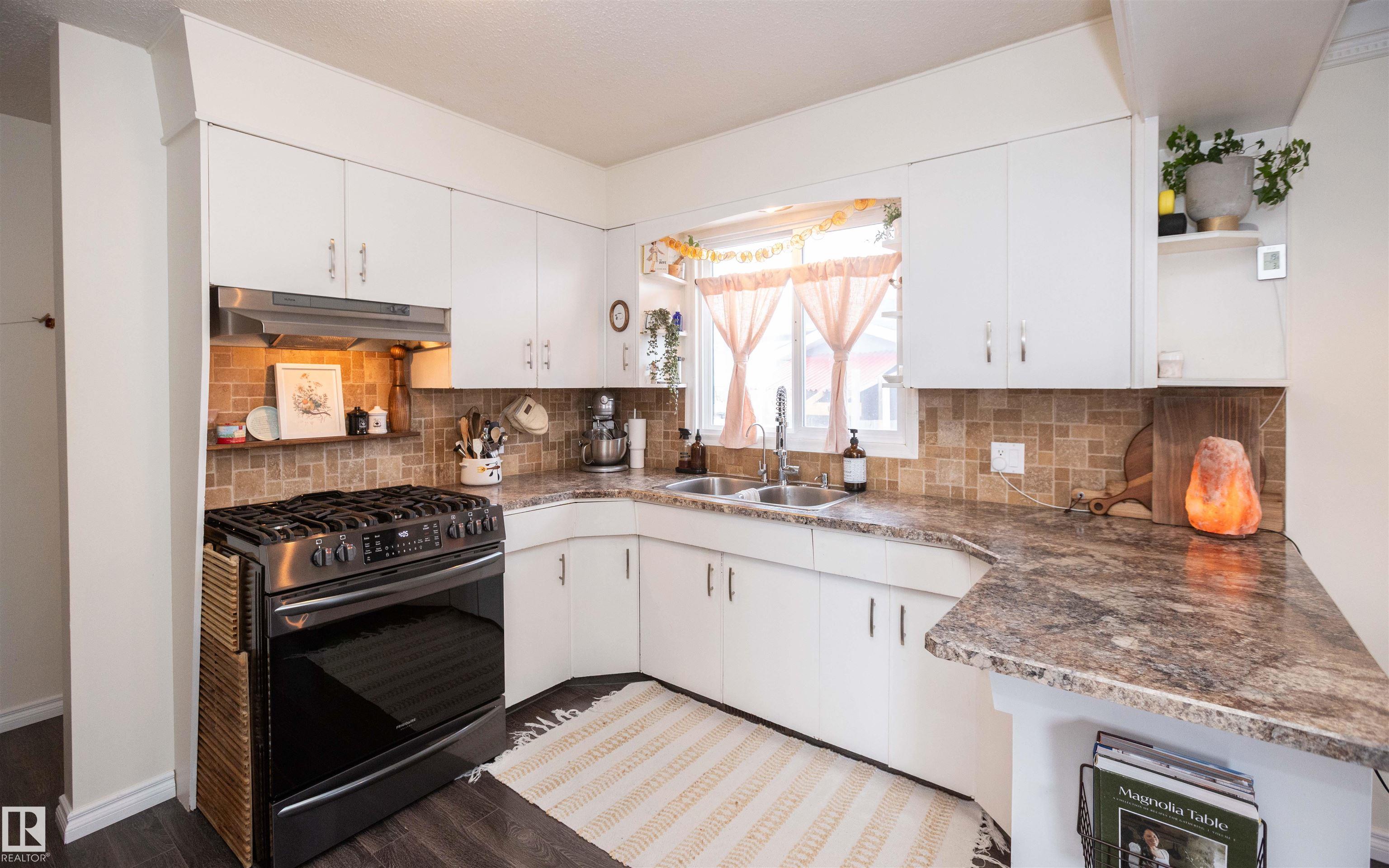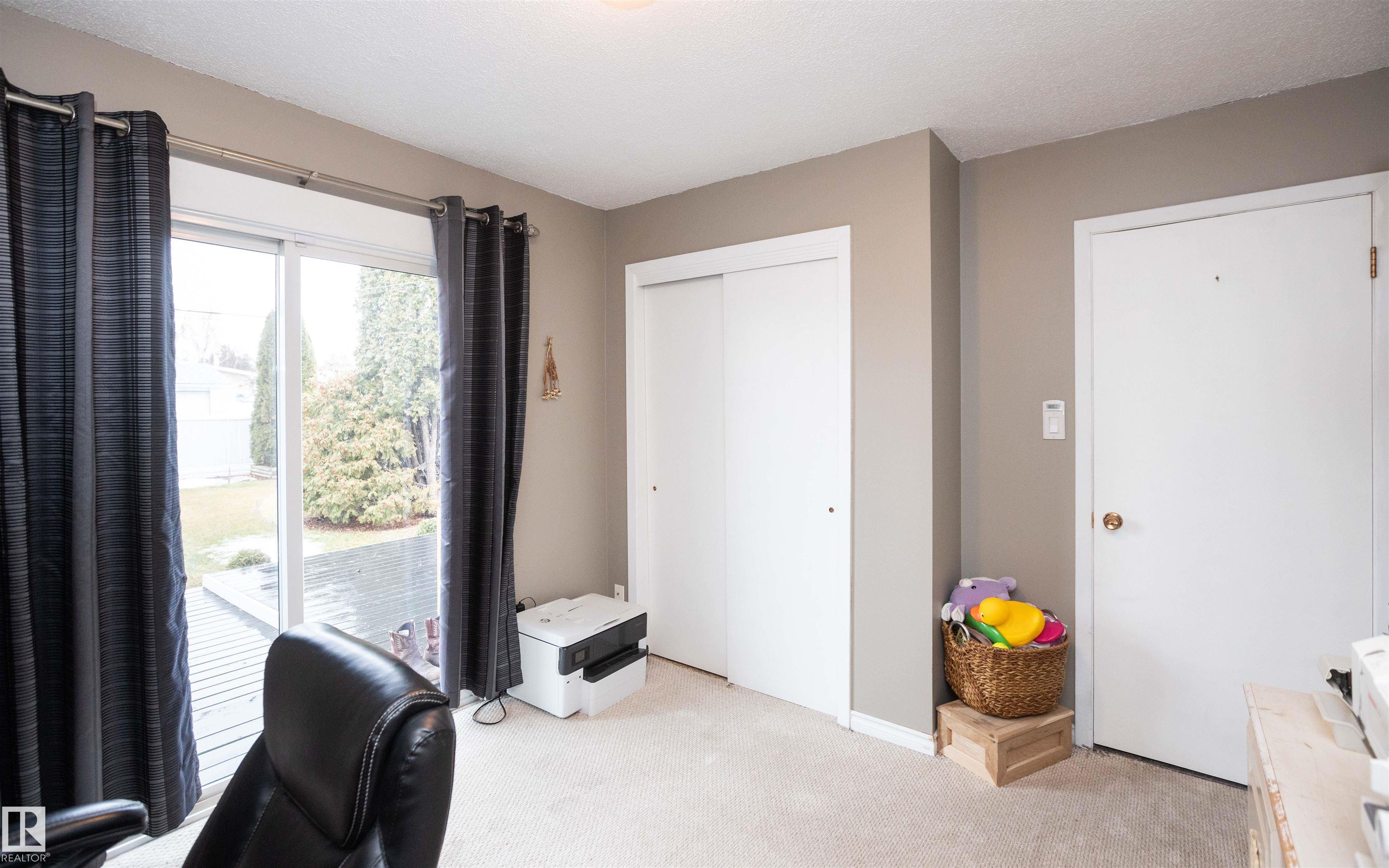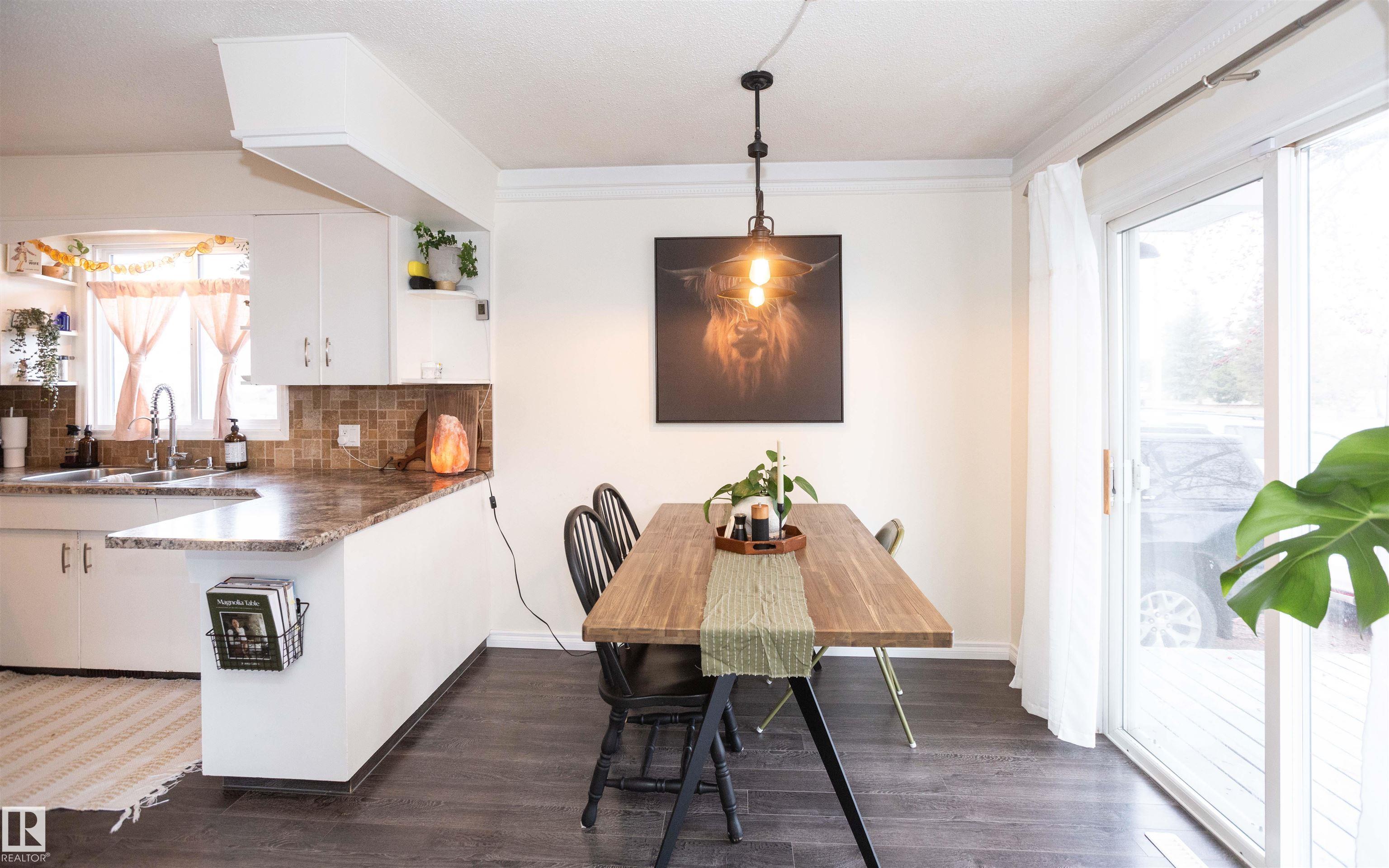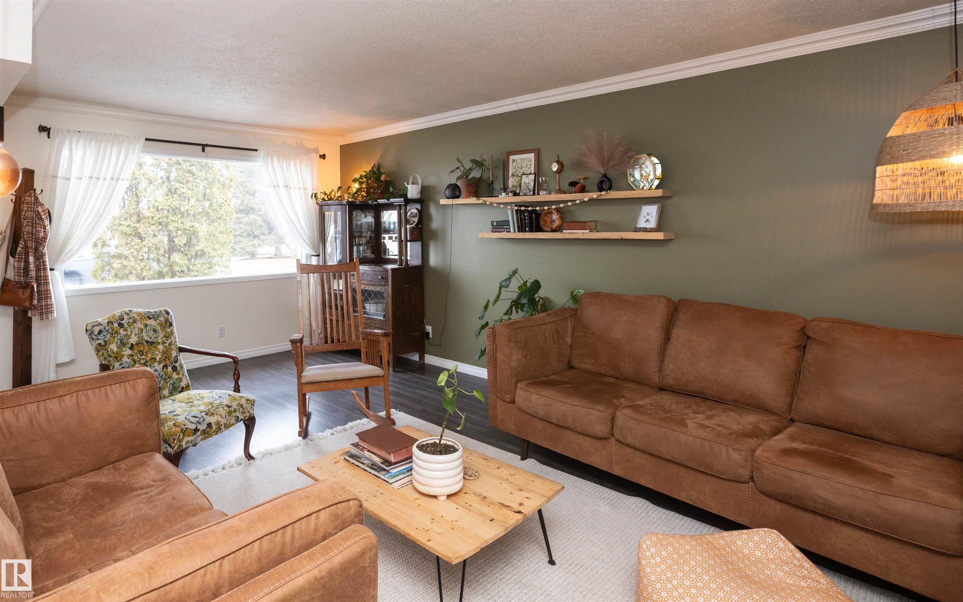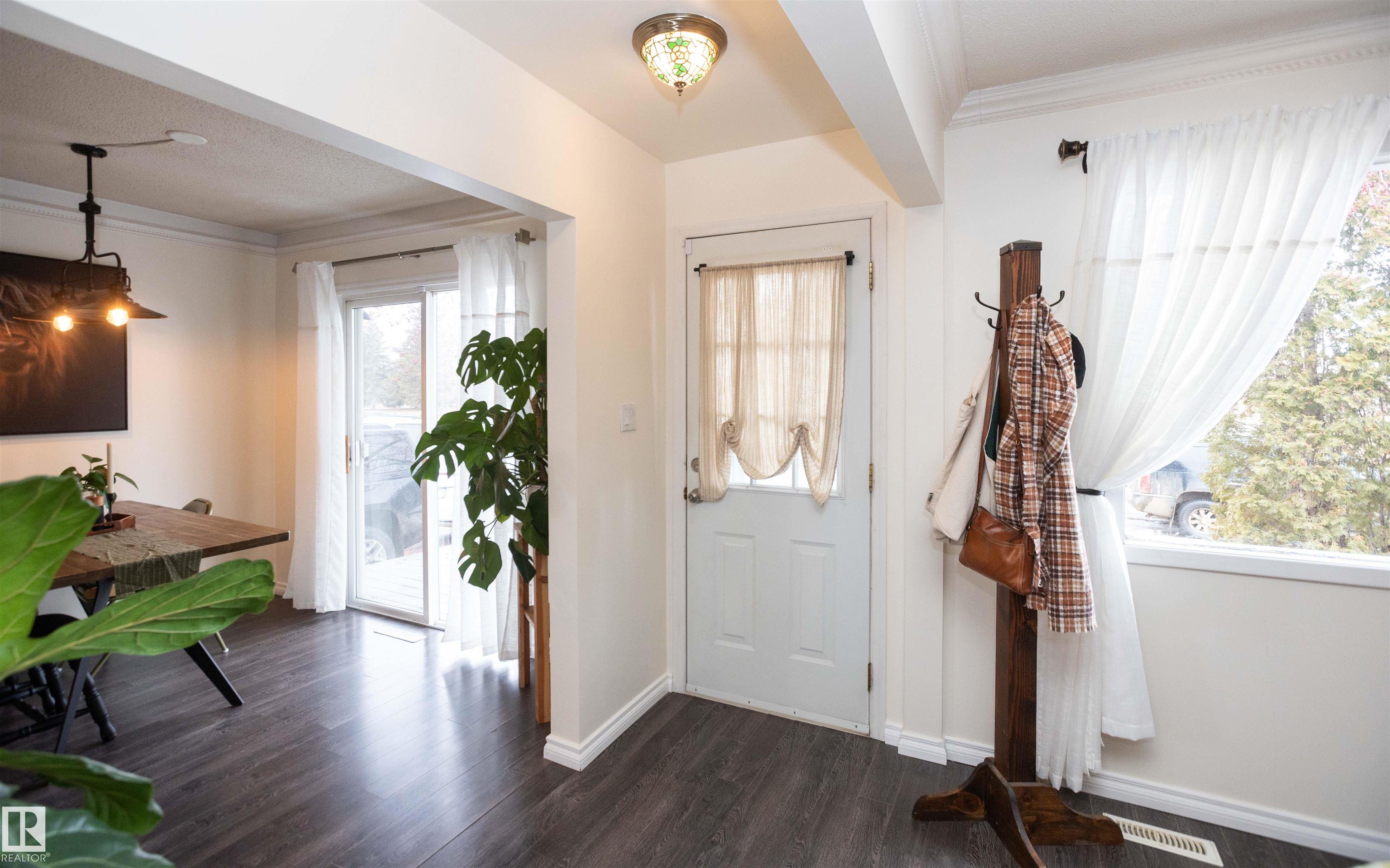 Across from Westlock Elementary school is a lovely home. Bright south-facing kitchen w/white cabinets, nice countertops, beautiful appliances (gas stove 1 yr) & nice eating area. Patio doors to deck on west. Spacious living room is lovely & bright. Three bedrooms main floor- the primary bdrm has full wall of closets. Bdrm 2 - nice size & bdrm 3 makes a nice den or office w/patio doors to large deck. Main floor bath w/double sinks, deep soaker tub & ceramic floor. Downstairs you'll find a massive family room w/beautiful carpet, large bdrm w/French doors & ensuite bath, laundry room w/plenty of space & front load W/D, storage room & furnace room. On your front deck sit and watch the fireworks on July 01. In the rear yard enjoy the beautiful new deck, trees & privacy. There is an area perfect for a garden, also two storage sheds, trees, new lawn & new landscaping! New shingles 2023. Furnace & water tank upgraded - not sure of date. Room for garage at rear or park on front driveway (room for 2) or street.