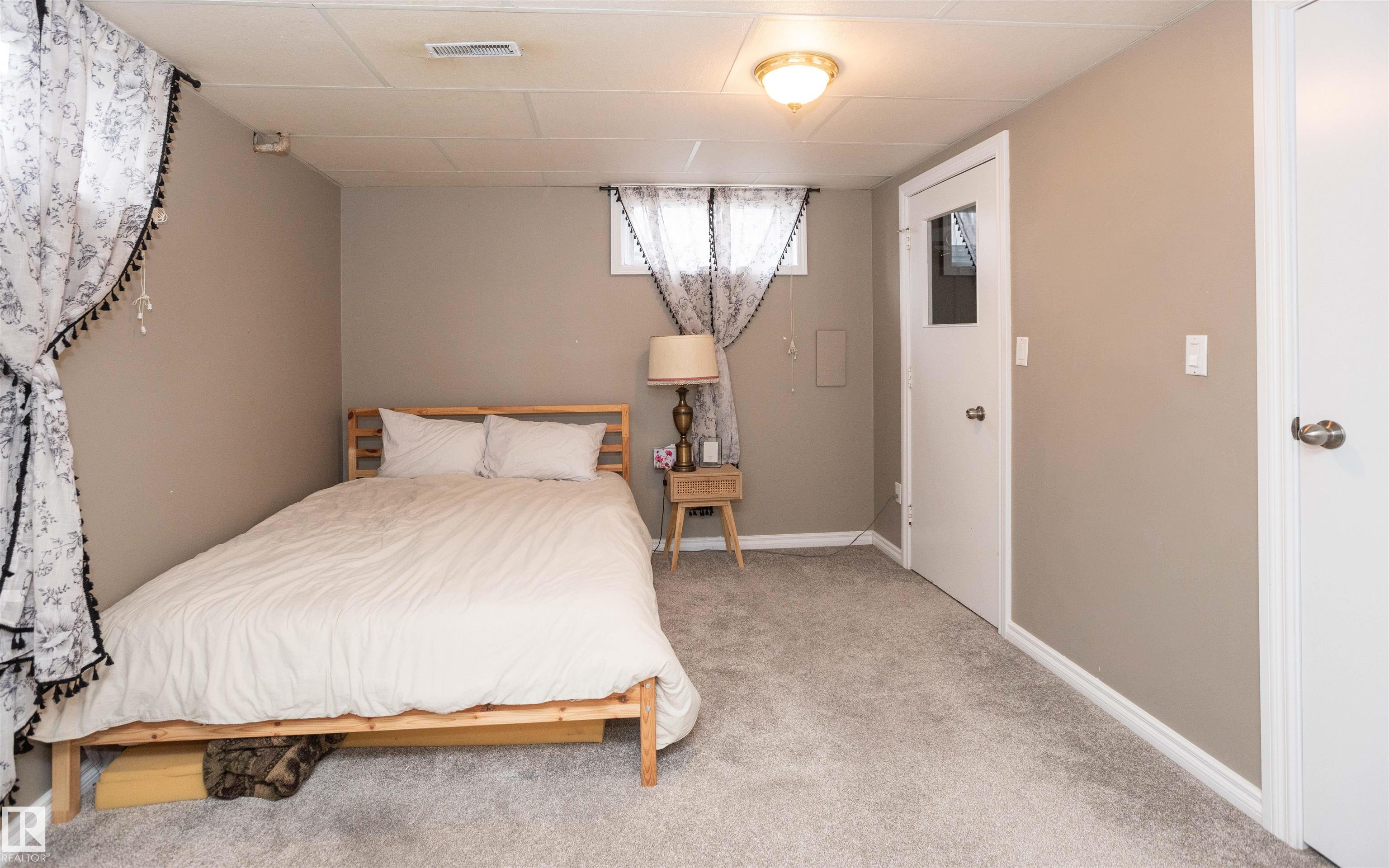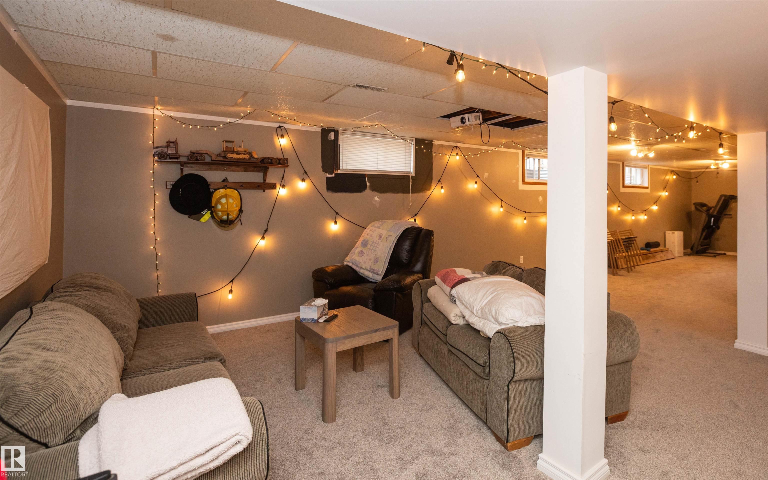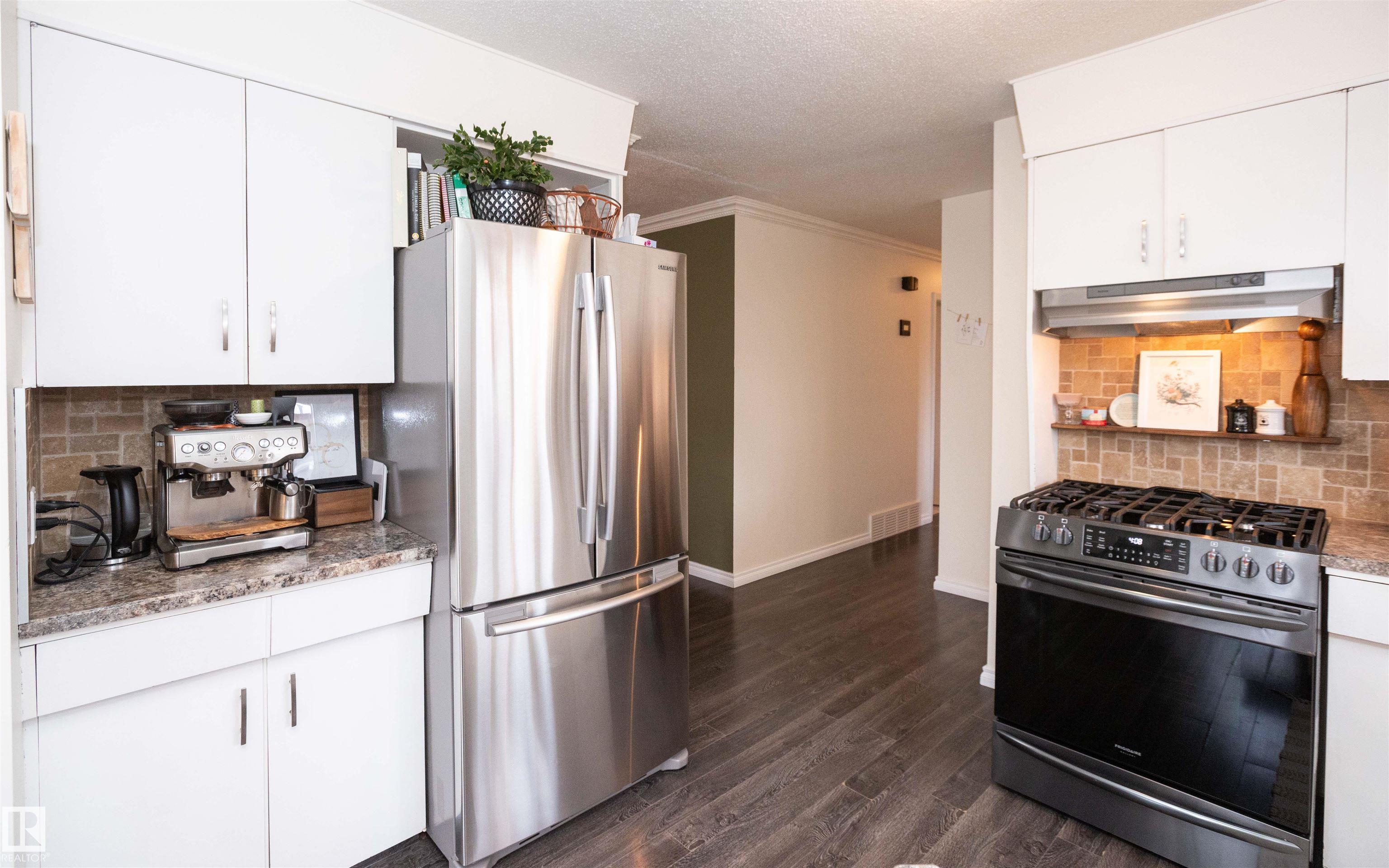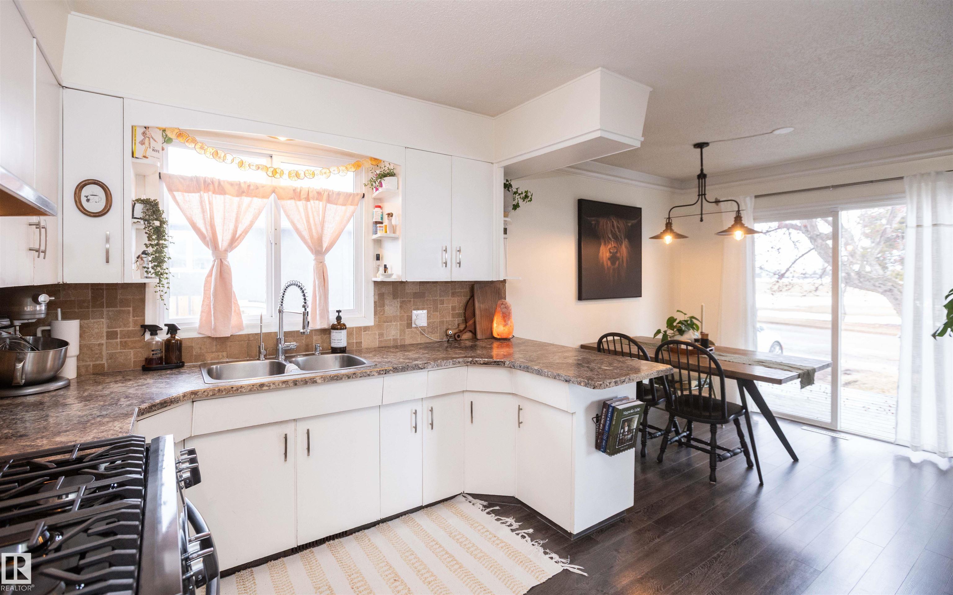 Across from Westlock Elementary school is a lovely home. Bright south-facing kitchen w/white cabinets, nice countertops, beautiful appliances (gas stove 1 yr) & nice eating area. Patio doors to deck on west. Spacious living room is lovely & bright. Three bedrooms main floor- the primary bdrm has full wall of closets. Bdrm 2 - nice size & bdrm 3 makes a nice den or office w/patio doors to large deck. Main floor bath w/double sinks, deep soaker tub & ceramic floor. Downstairs you'll find a massive family room w/beautiful carpet, large bdrm w/French doors & ensuite bath, laundry room w/plenty of space & front load W/D, storage room & furnace room. On your front deck sit and watch the fireworks on July 01. In the rear yard enjoy the beautiful new deck, trees & privacy. There is an area perfect for a garden, also two storage sheds, trees, new lawn & new landscaping! New shingles 2023. Furnace & water tank upgraded - not sure of date. Room for garage at rear or park on front driveway (room for 2) or street.