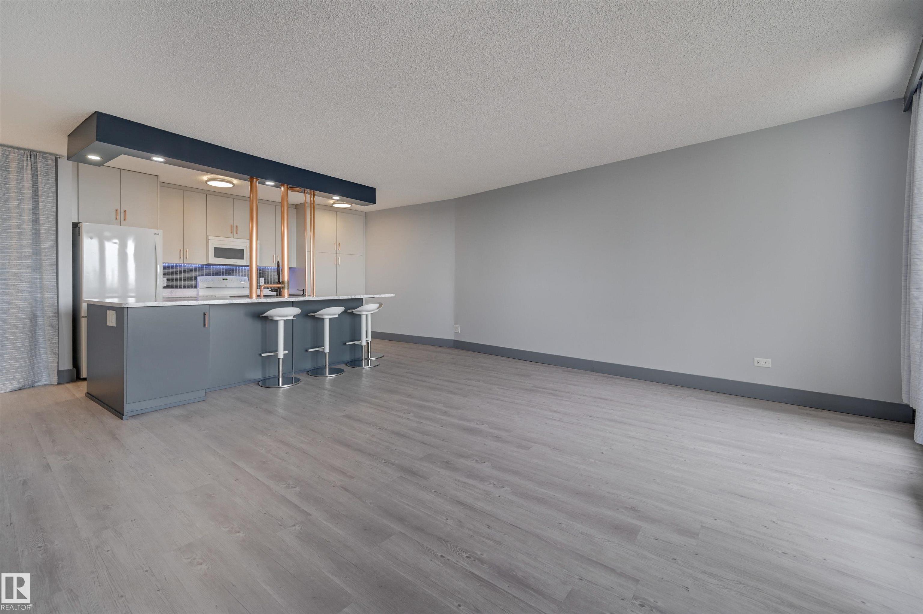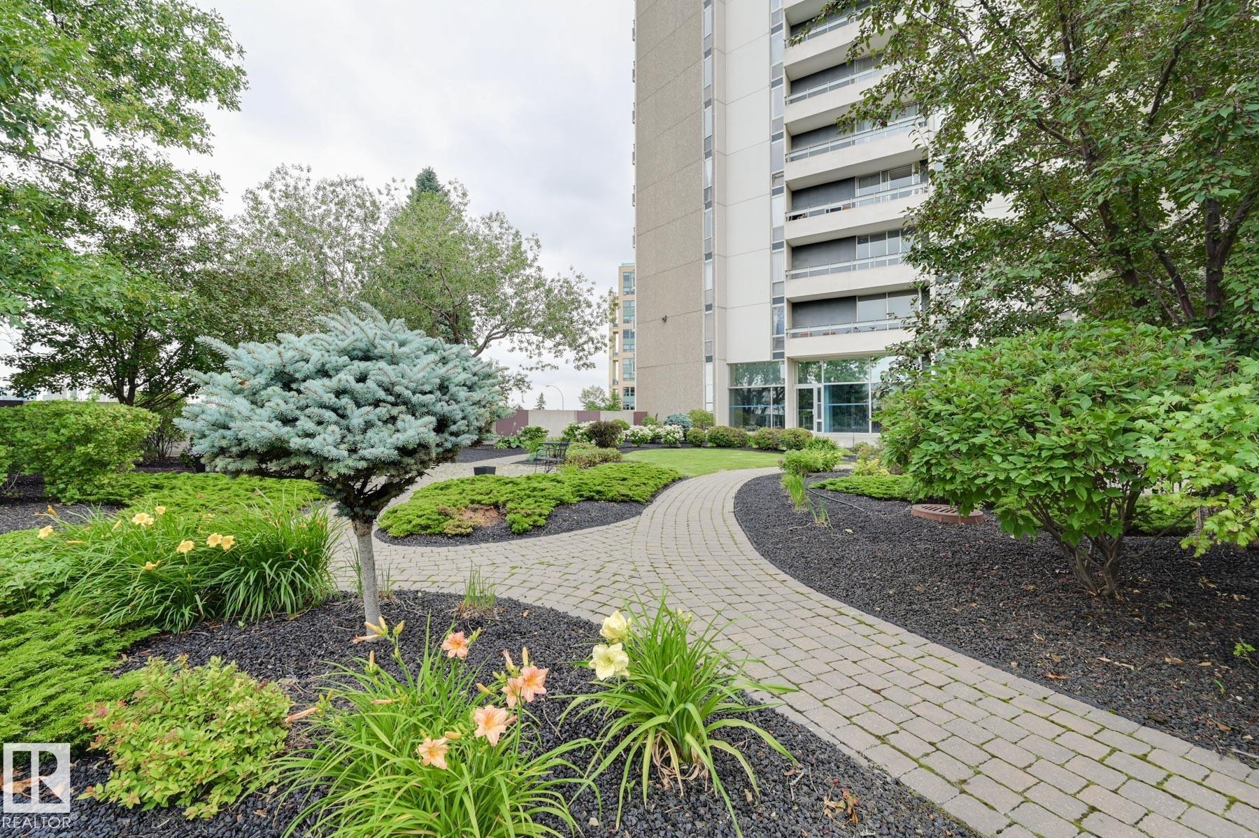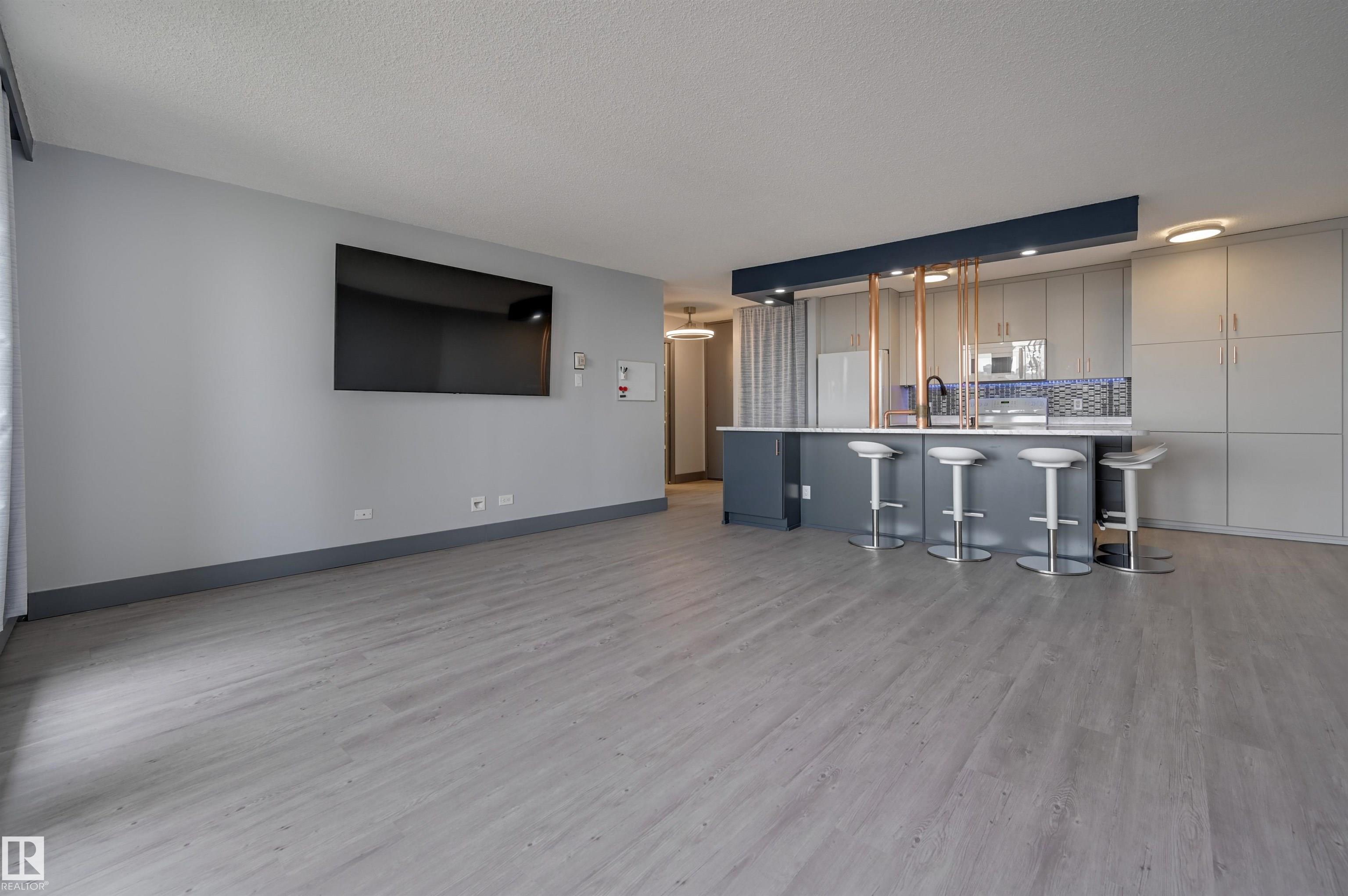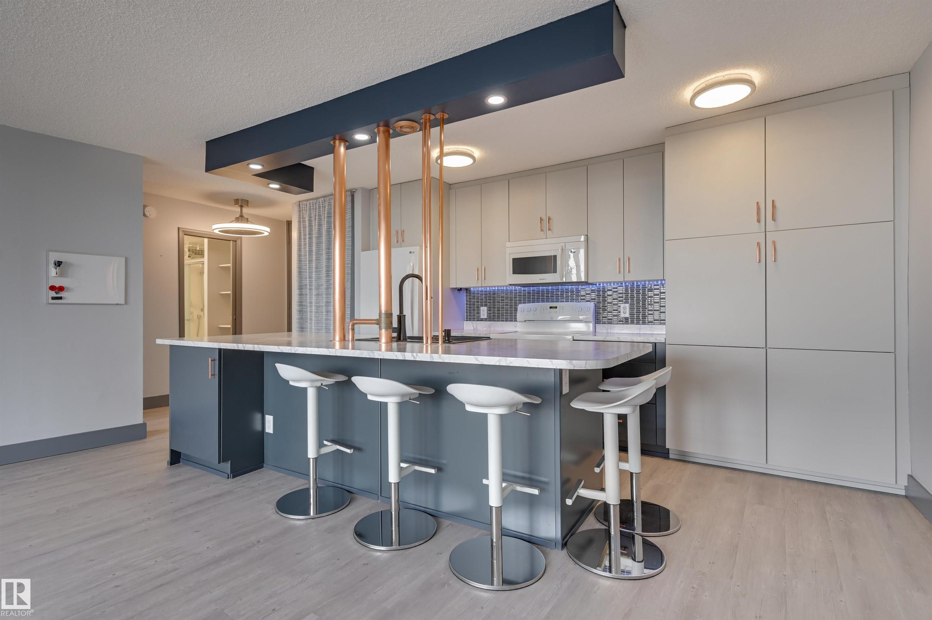 DOWNTOWN and RIVER VALLEY VIEWS from this RENOVATED 652 sq.ft. condo conveniently located on SASKATCHEWAN DRIVE just steps to the river valley trails, trendy shops, restaurants, coffee shops and a short walk to the U of A and Whyte Avenue. Features of this beautiful home include an OPEN KITCHEN with 2 tone cabinetry with lots of storage, a pantry and a large island, vinyl plank flooring throughout & a 3 piece bathroom with a large walk-in shower. Included is the fridge, ceramic top stove, microwave hood fan, dishwasher, wall mounted TV's in the living room & bedroom & the bar stools. Enjoy the gorgeous views from the spacious north facing balcony. The condo fees include all the utilities and building amenities which include an outside courtyard, fitness centre, social room, saunas and visitor parking. Shows very well!
