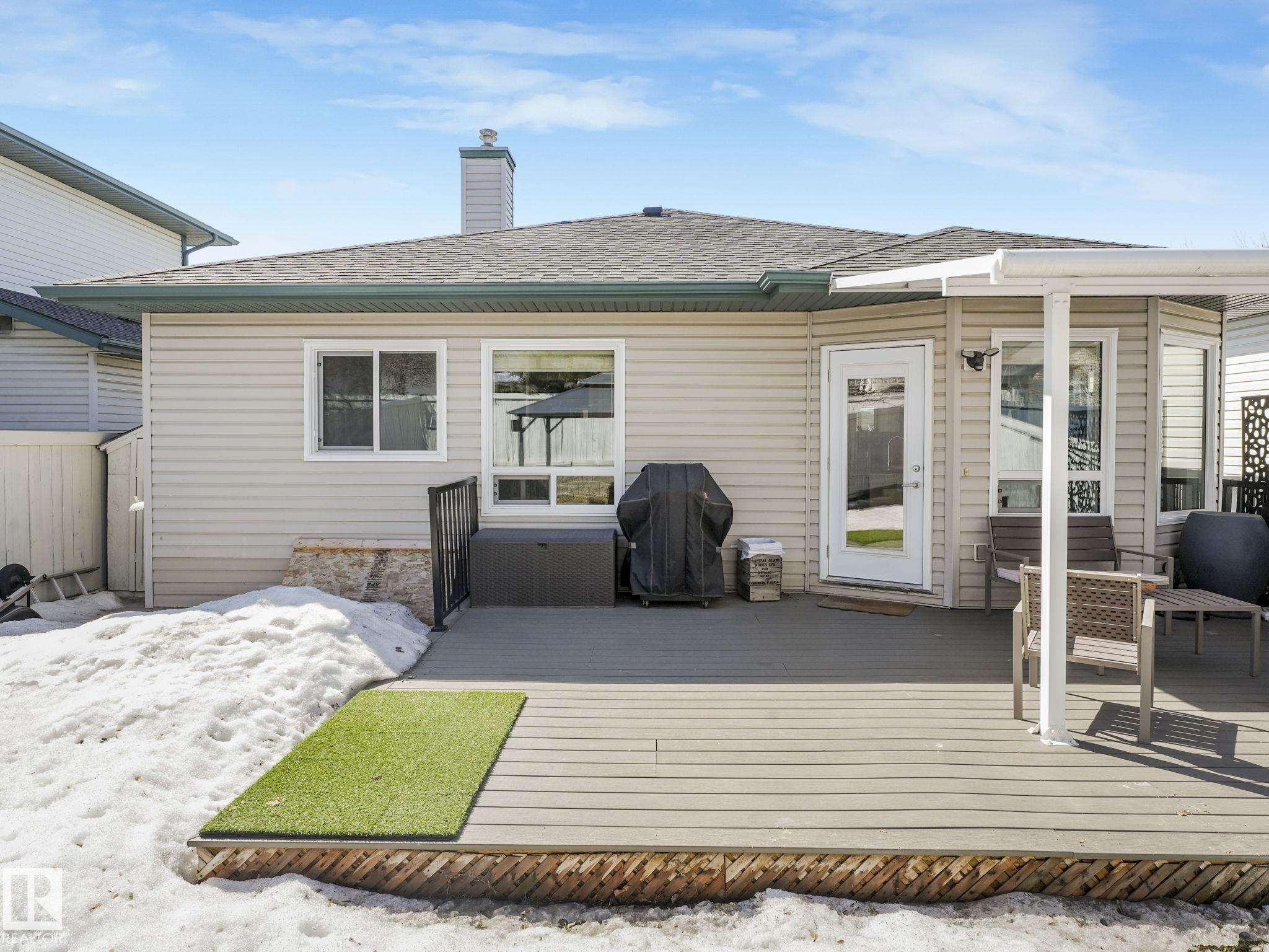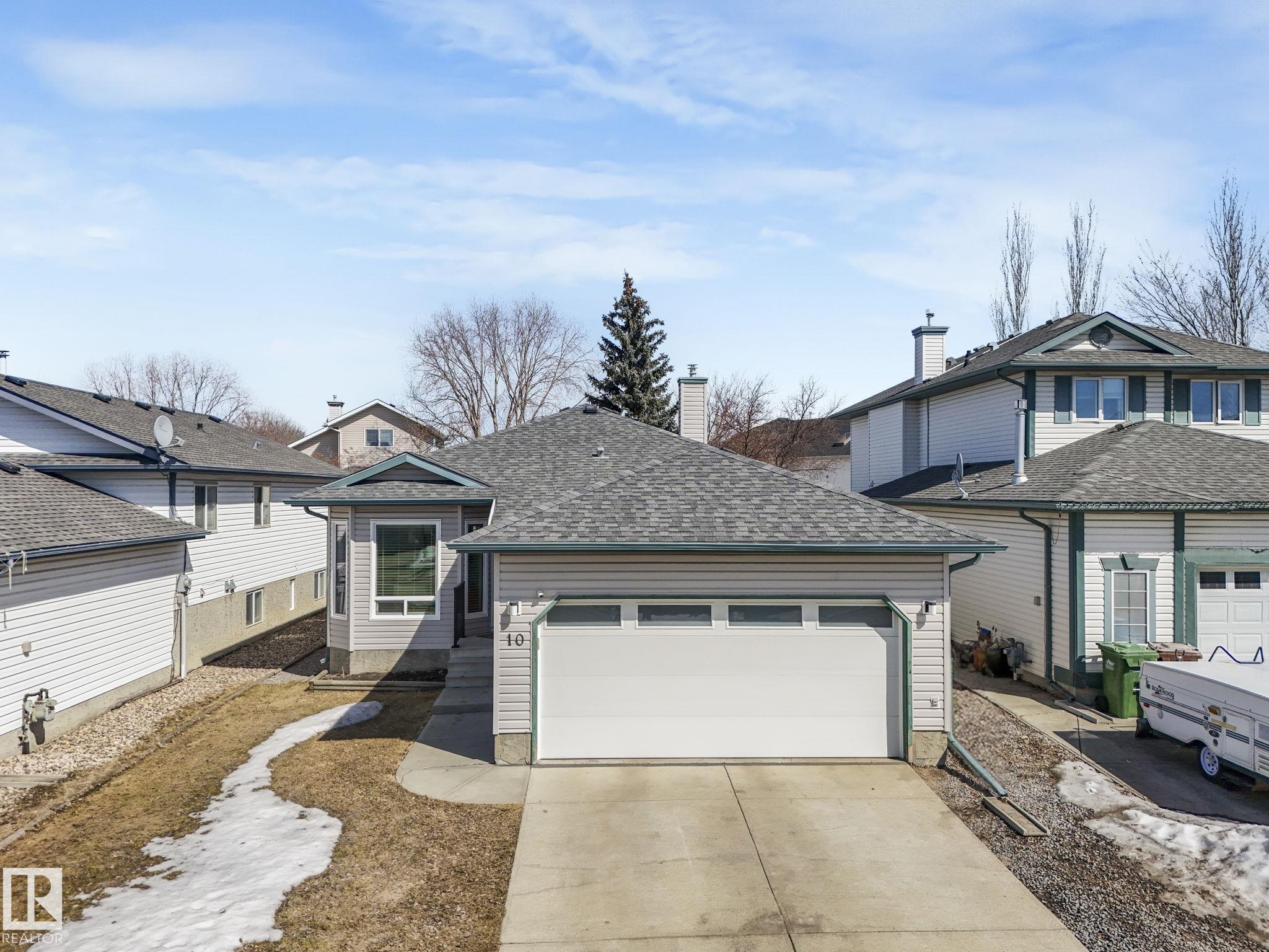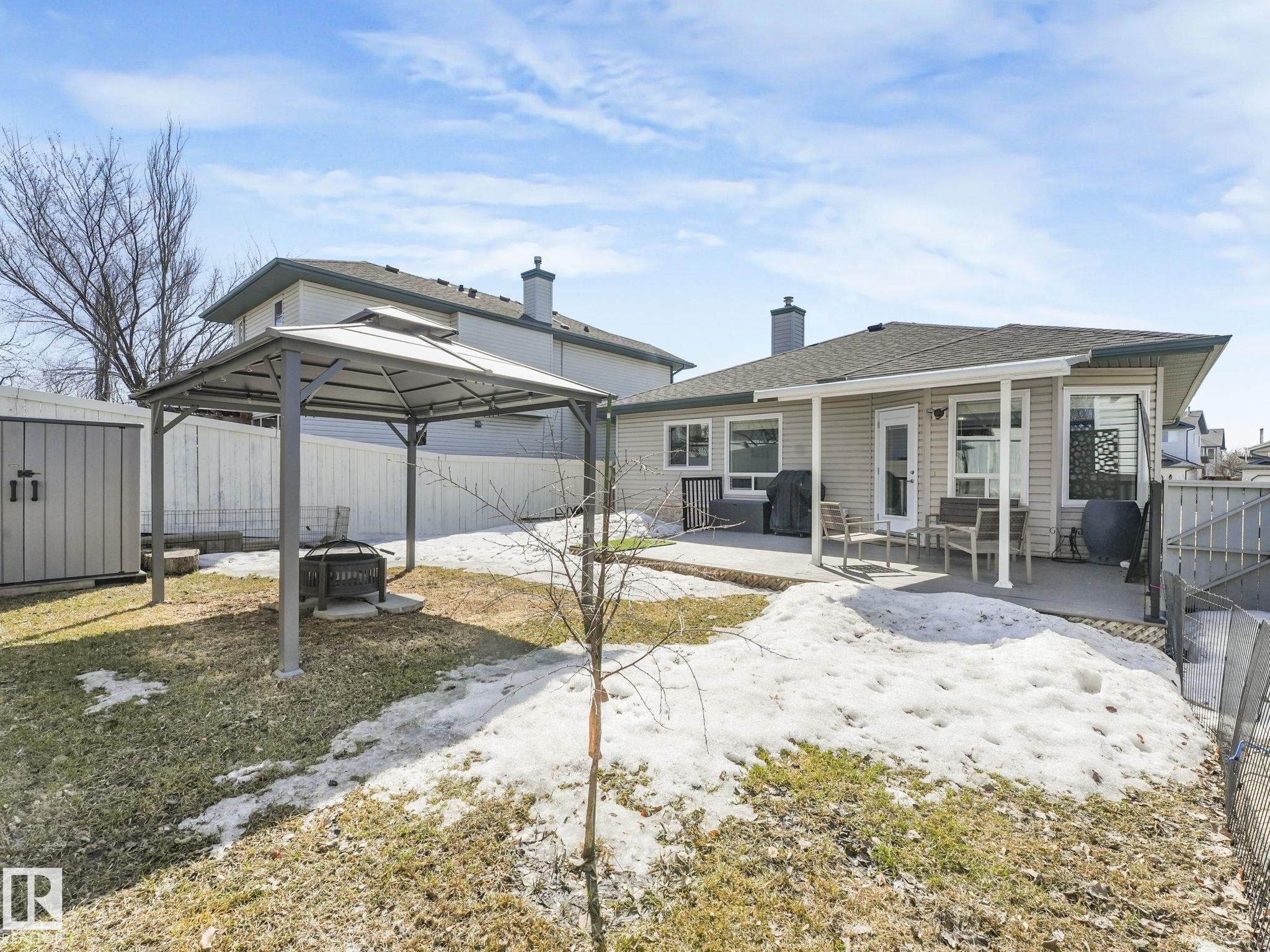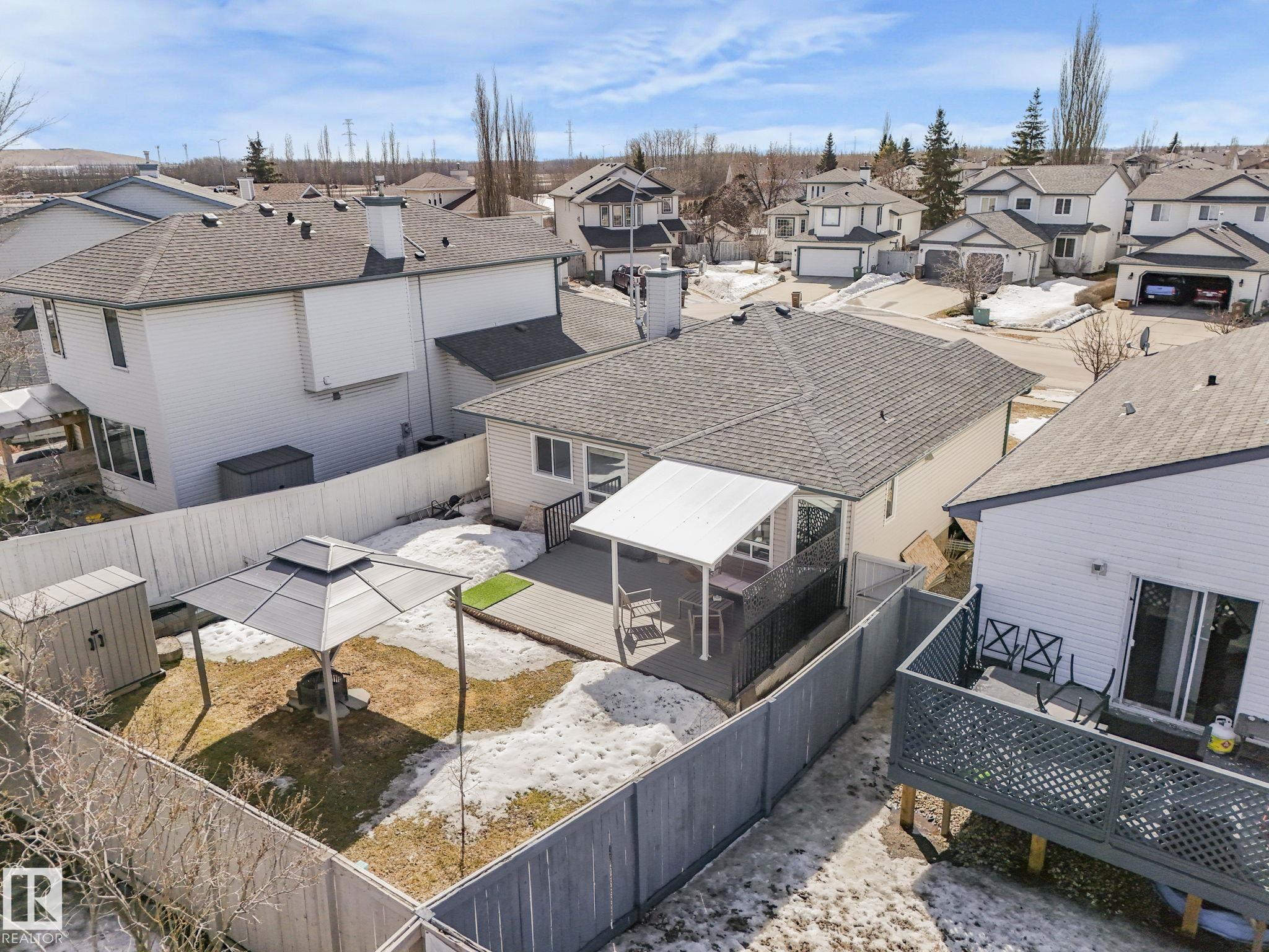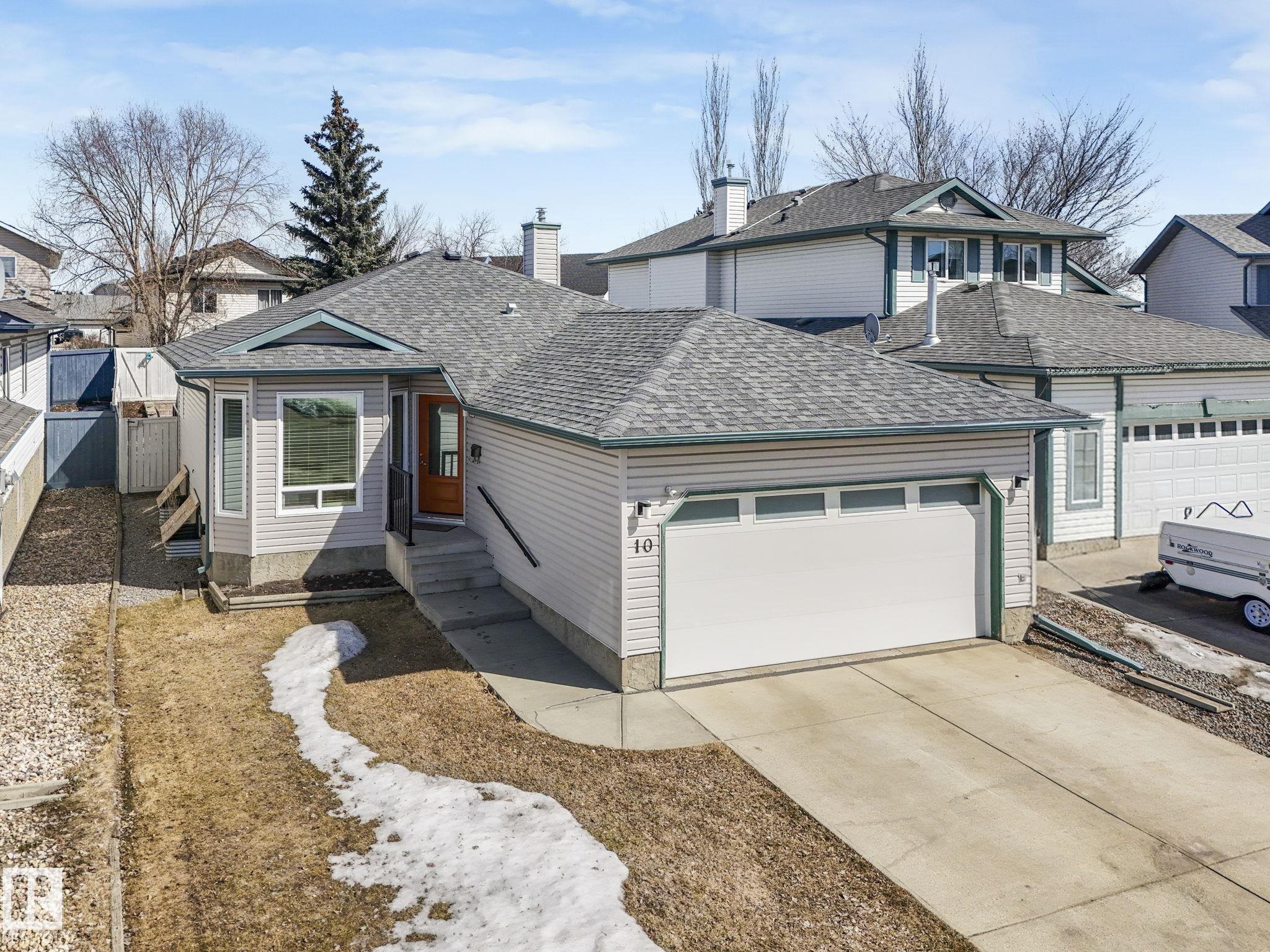 REMODELLED in HERITAGE LAKES. 3 bedrooms total and 3 full baths. This 1068 sq ft bungalow has extensive improvements. This open home has vaulted ceilings accentuated with an open main floor. The kitchen was remodeled(2024) with new soft-close cabinets, island, countertops, and stainless steel appliances. New doors and triple pane windows with custom window coverings throughout with SunStop on west facing windows(2024), floorcoverings(2023 up, 2025 down), painted(2023), baseboards(2025), new insulated overhead garage door(2025), all light fixtures(2023), central air conditioning(2023), backyard retaining wall brickwork(2023). Primary bedroom has a walkin closet and 3 -pc ensuite. Maintenace free deck and enclosed fenced yard for kids and pets. Furnace last serviced Feb 2026. Close to schools, parks, playground. Easy access to Edmonton via 170St, Ray Gibbon Dr, and Anthony Henday.
