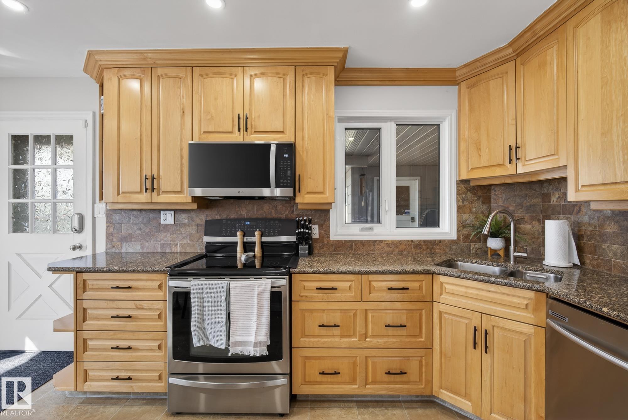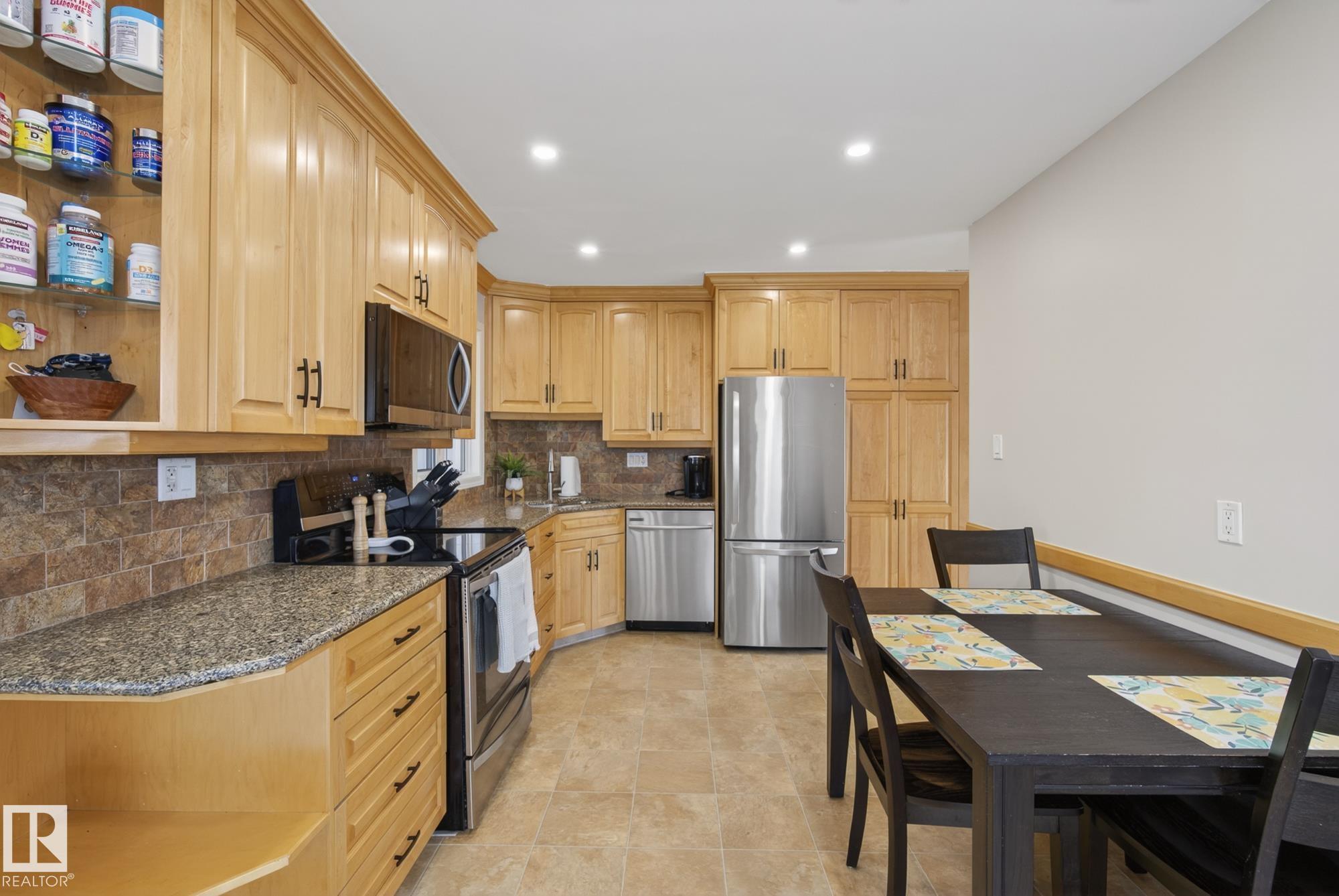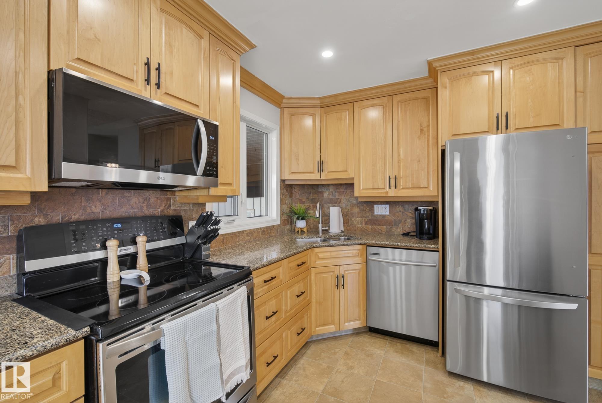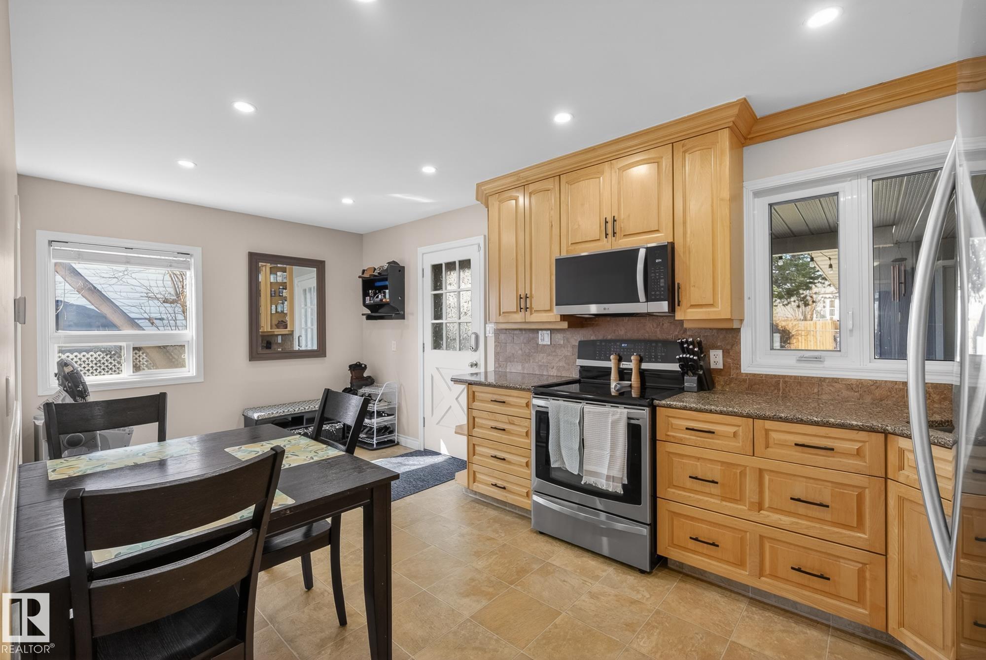 Absolutely stunning 4 bedroom Athlone bungalow loaded with high-end upgrades inside and out! This beautifully maintained home offers incredible curb appeal and a long list of improvements including new electrical panel, energy-efficient main floor windows, upgraded attic insulation, gutters/downspouts, roof turbine, fresh paint, and hardwood flooring through the living room, hallway, and third bedroom. The showpiece kitchen is fully renovated with custom solid maple crown-moulded cabinetry, gleaming quartz countertops, tile backsplash, corner stainless steel sink, garburator, pantry, and top-of-the-line stainless steel appliances including a built-in microwave and convection range. The main bath has also been stylishly updated with a marble counter, new fixtures, new toilet, new sink, and refinished tub. Outside is a private, fully landscaped yard with paving stone patio, brick flower boxes, RV parking, secure fencing, and a heated double garage with workbench. A true gem!
