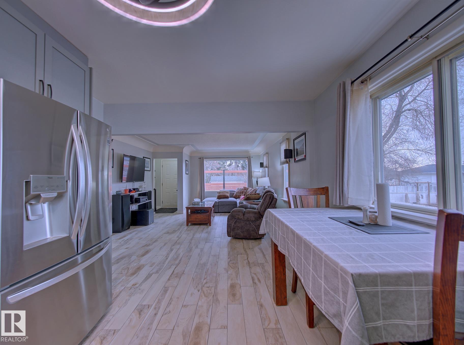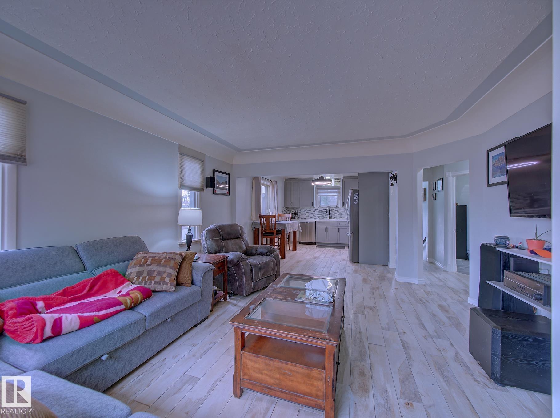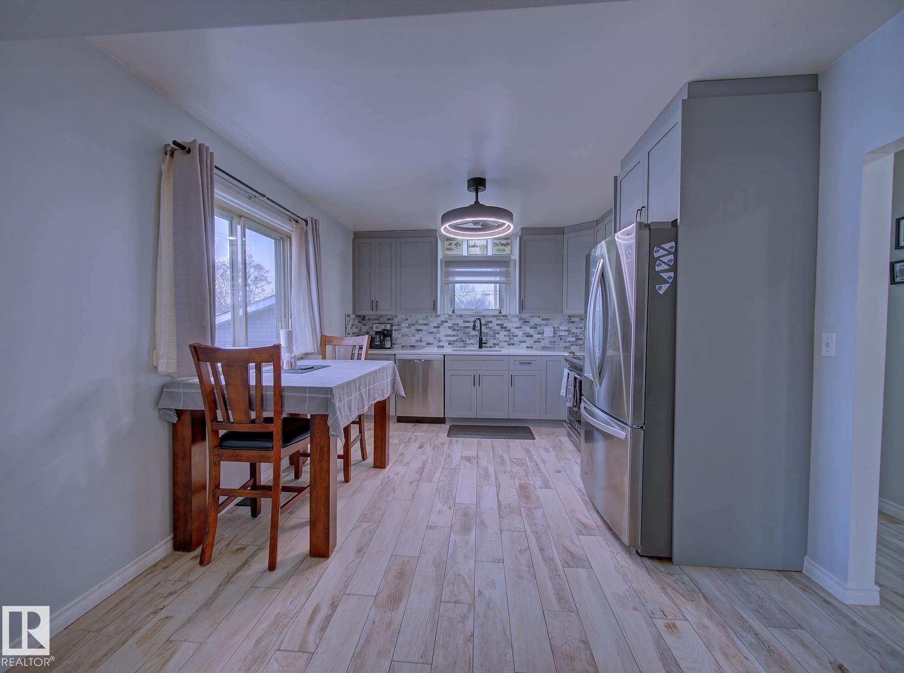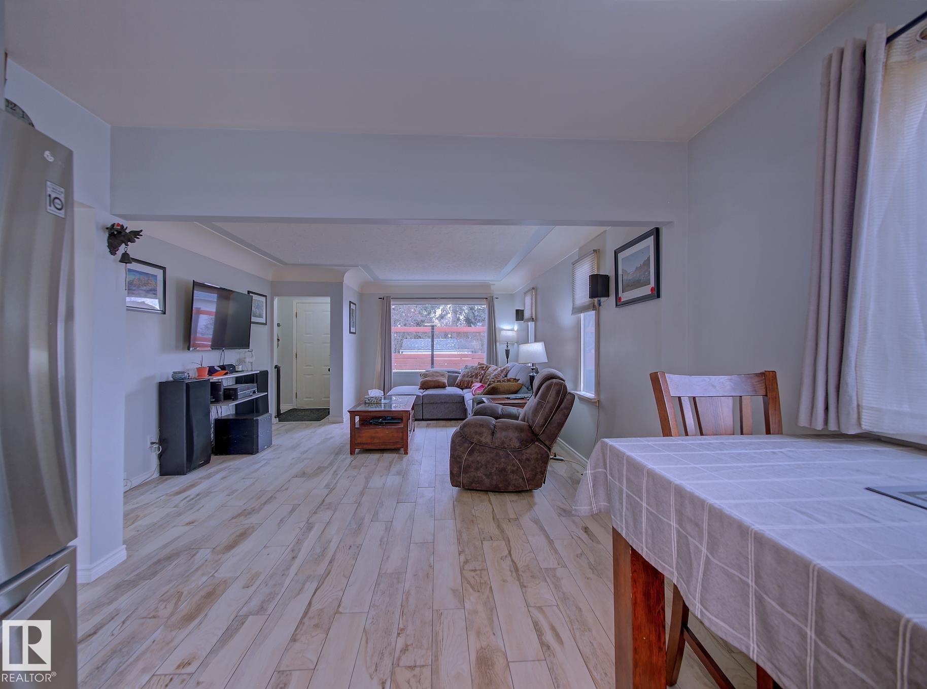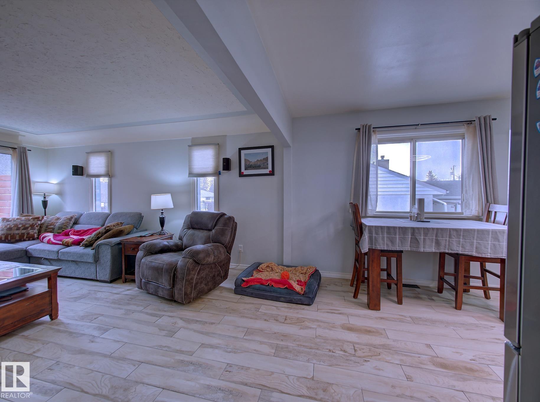 Welcome to Old Fort Saskatchewan! Ideally located within walking distance to schools, shopping, parks, and recreational amenities, this renovated 2+1 bedroom bungalow offers a great blend of comfort and functionality. The main floor features an upgraded kitchen overlooking a bright, spacious living room, creating an inviting space for everyday living and entertaining. Garden door access leads to your deck?perfect for relaxing or enjoying your morning coffee. Two well-sized bedrooms, including the primary, and a 4PC bath complete this level. Large windows fill the home with natural light, while durable ceramic flooring adds style and easy maintenance. The fully developed basement offers a generous recreation room, a large third bedroom with walk-in closet area, a 3PC bathroom, and a convenient laundry space with enclosed furnace and hot water tank. Outside, enjoy a fully fenced yard with mature trees, garden area, RV parking, and a heated 24' x 26' double detached garage. A fantastic opportunity