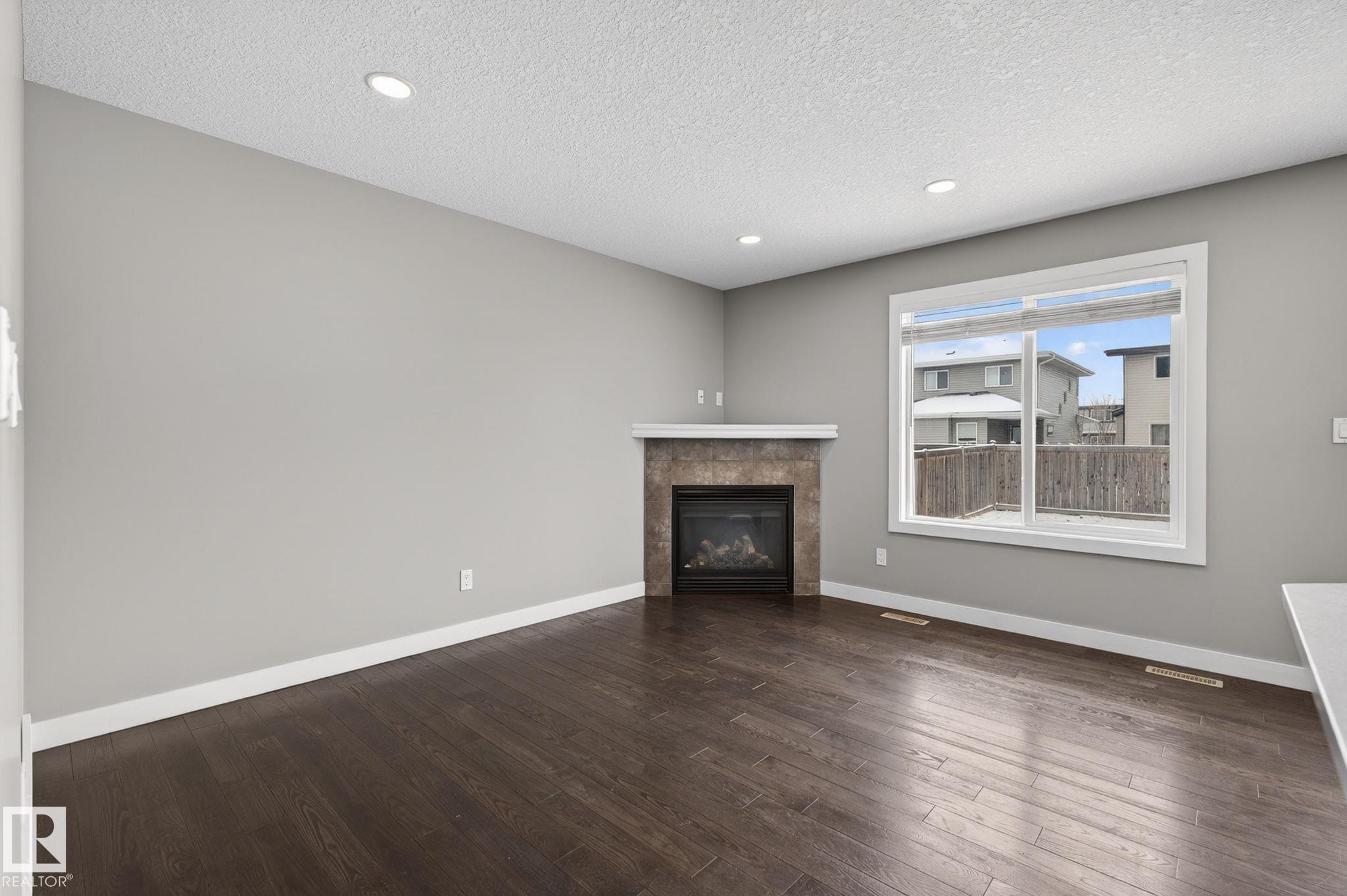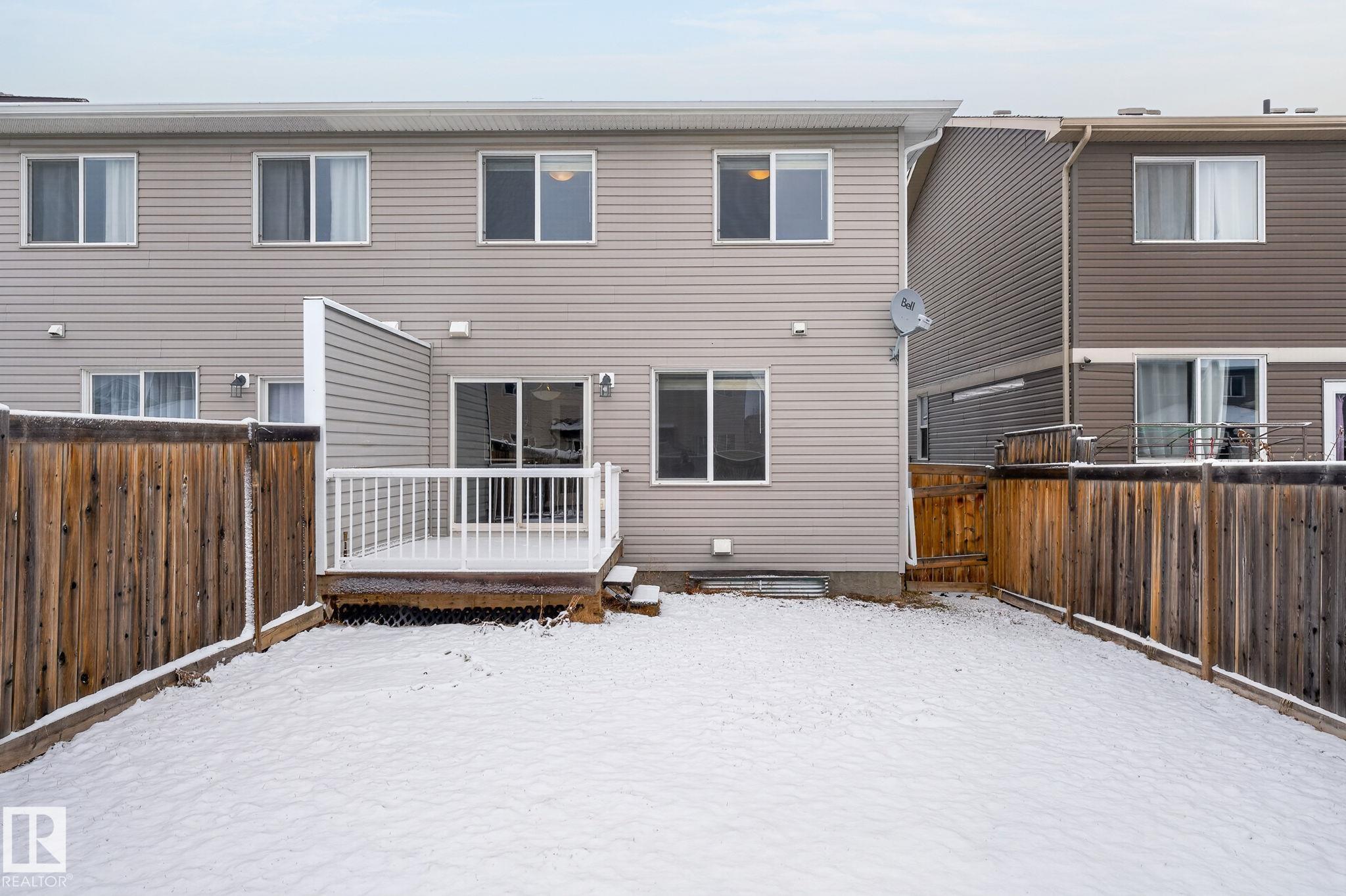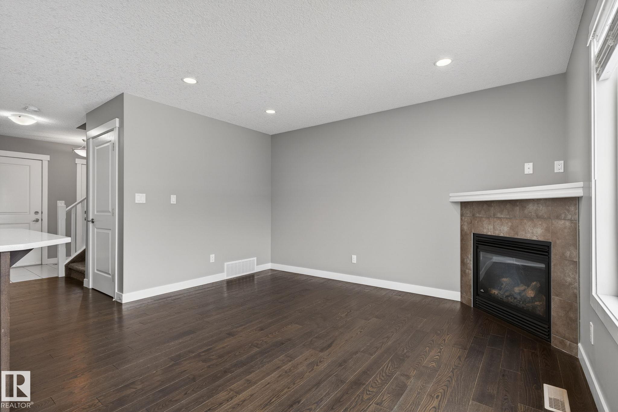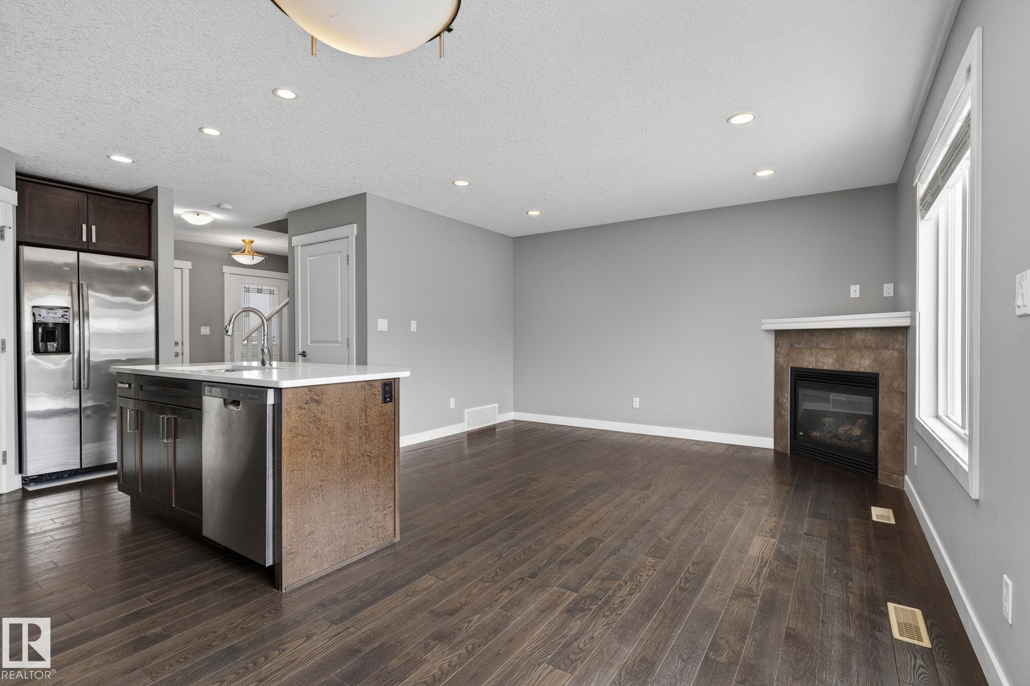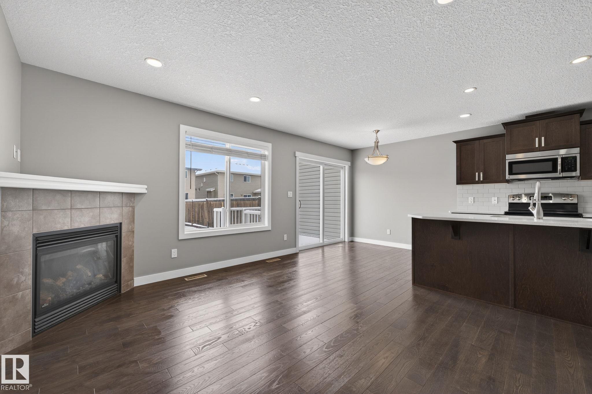 Discover the amazing value in this affordable, quality-built half duplex in Fort Saskatchewan! Freshly painted, this home features 3 bedrooms and 2.5 baths, highlighted by a huge primary suite with a walk-in closet and a 4-piece ensuite. The upper level also includes two additional bedrooms, a spacious full bathroom, and convenient laundry facilities. The main floor boasts an open-concept design with upgraded hardwood and ceramic floors, a cozy corner gas fireplace, and a stylish kitchen equipped with quartz countertops, a working island, and stainless steel appliances. Step out through patio doors to enjoy the great-sized, landscaped, and fenced yard. Additional features include an oversized single garage and a basement ready for future development. Perfect for families or investors, this home is walking distance to Tim Hortons, Southfort Ridge Playground and the Fort's renowned walking trails, and with easy access to HWY 21, any commute will be nearly seamless! Some photos virtually staged.