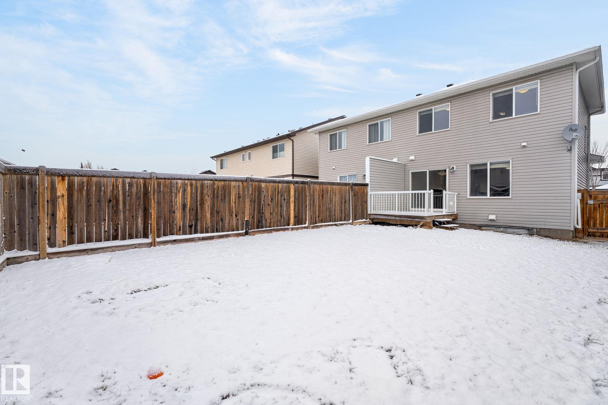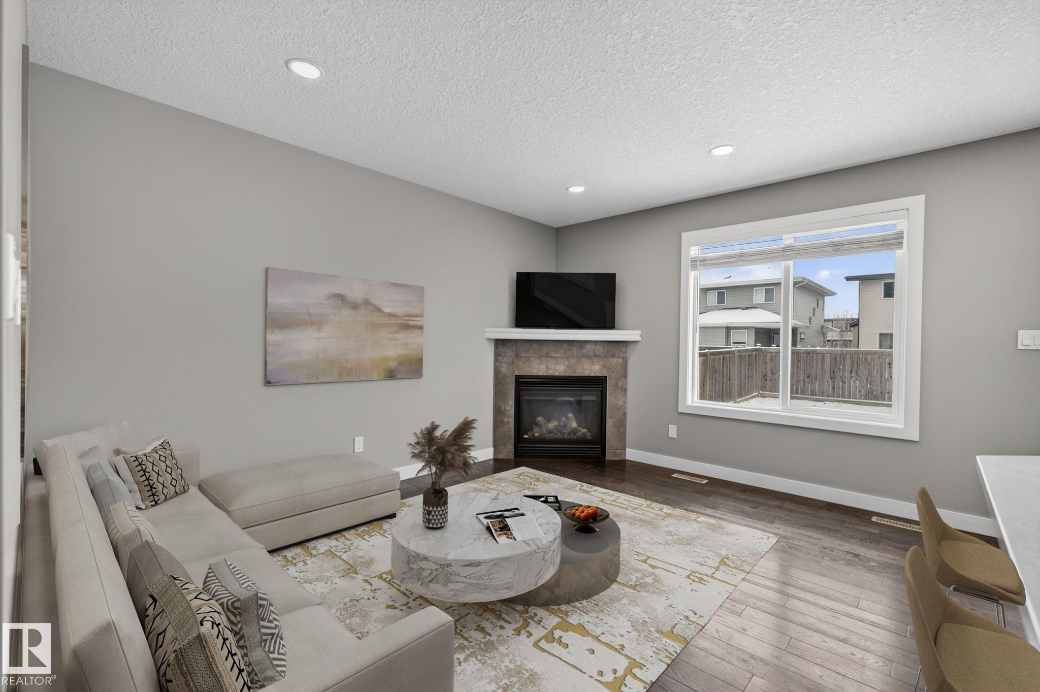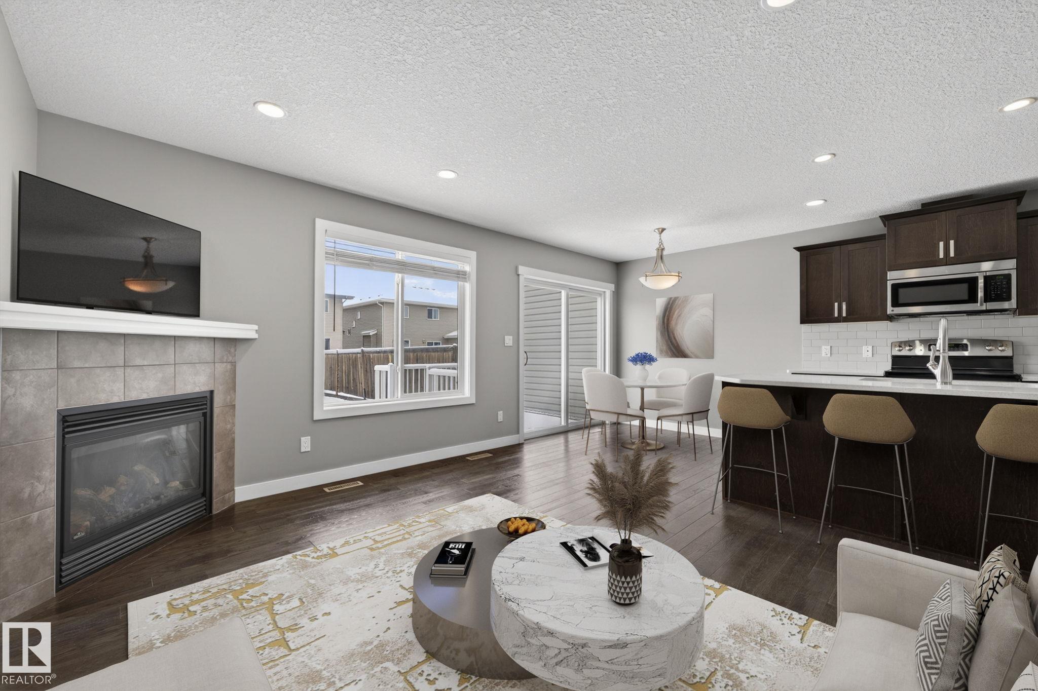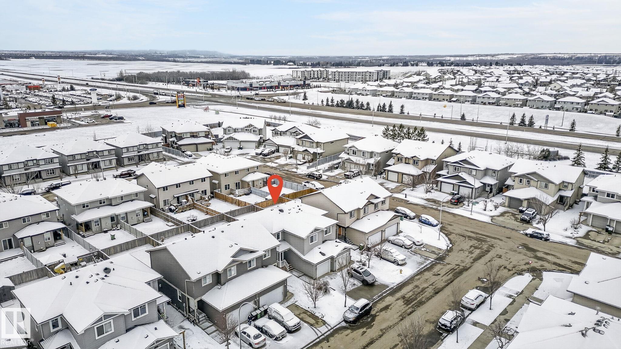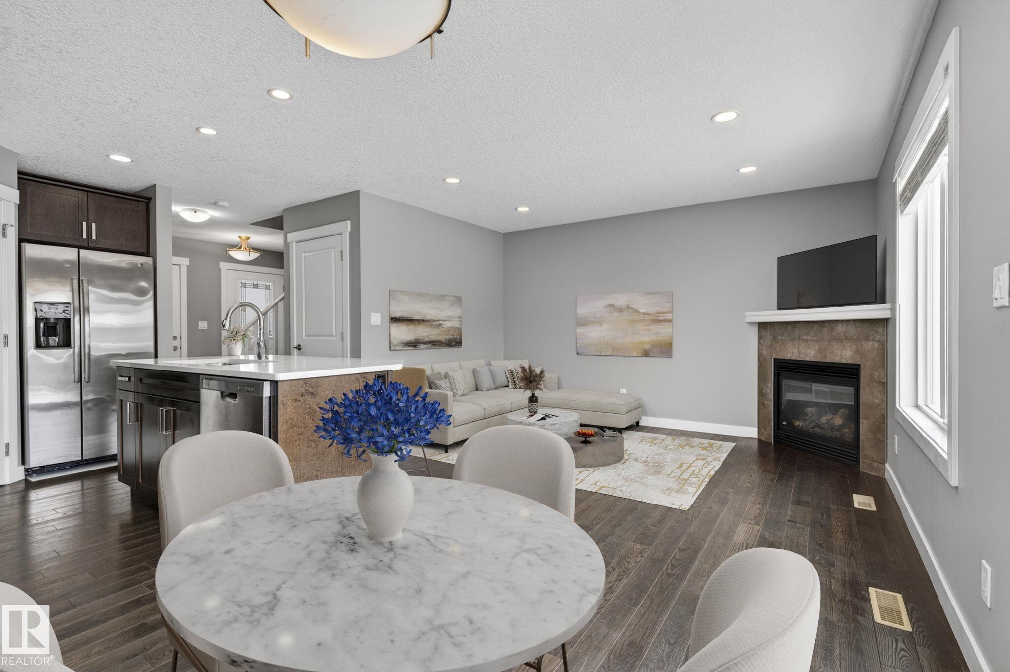 Discover the amazing value in this affordable, quality-built half duplex in Fort Saskatchewan! Freshly painted, this home features 3 bedrooms and 2.5 baths, highlighted by a huge primary suite with a walk-in closet and a 4-piece ensuite. The upper level also includes two additional bedrooms, a spacious full bathroom, and convenient laundry facilities. The main floor boasts an open-concept design with upgraded hardwood and ceramic floors, a cozy corner gas fireplace, and a stylish kitchen equipped with quartz countertops, a working island, and stainless steel appliances. Step out through patio doors to enjoy the great-sized, landscaped, and fenced yard. Additional features include an oversized single garage and a basement ready for future development. Perfect for families or investors, this home is walking distance to Tim Hortons, Southfort Ridge Playground and the Fort's renowned walking trails, and with easy access to HWY 21, any commute will be nearly seamless! Some photos virtually staged.