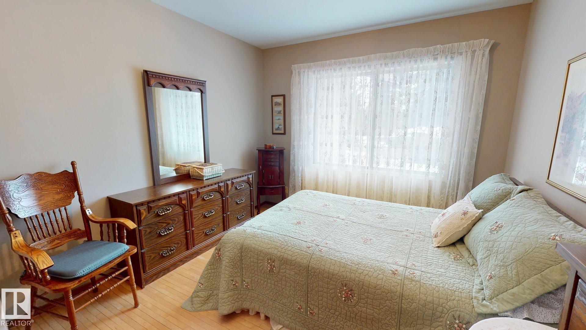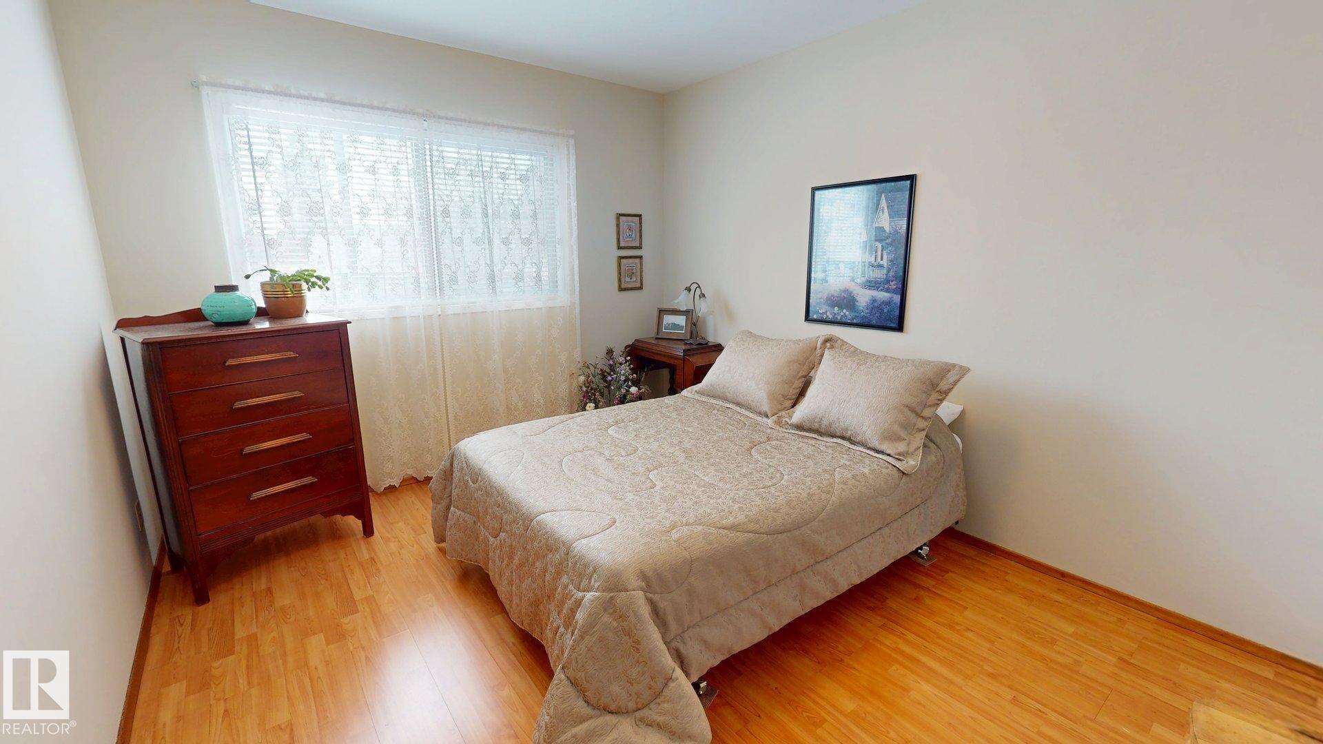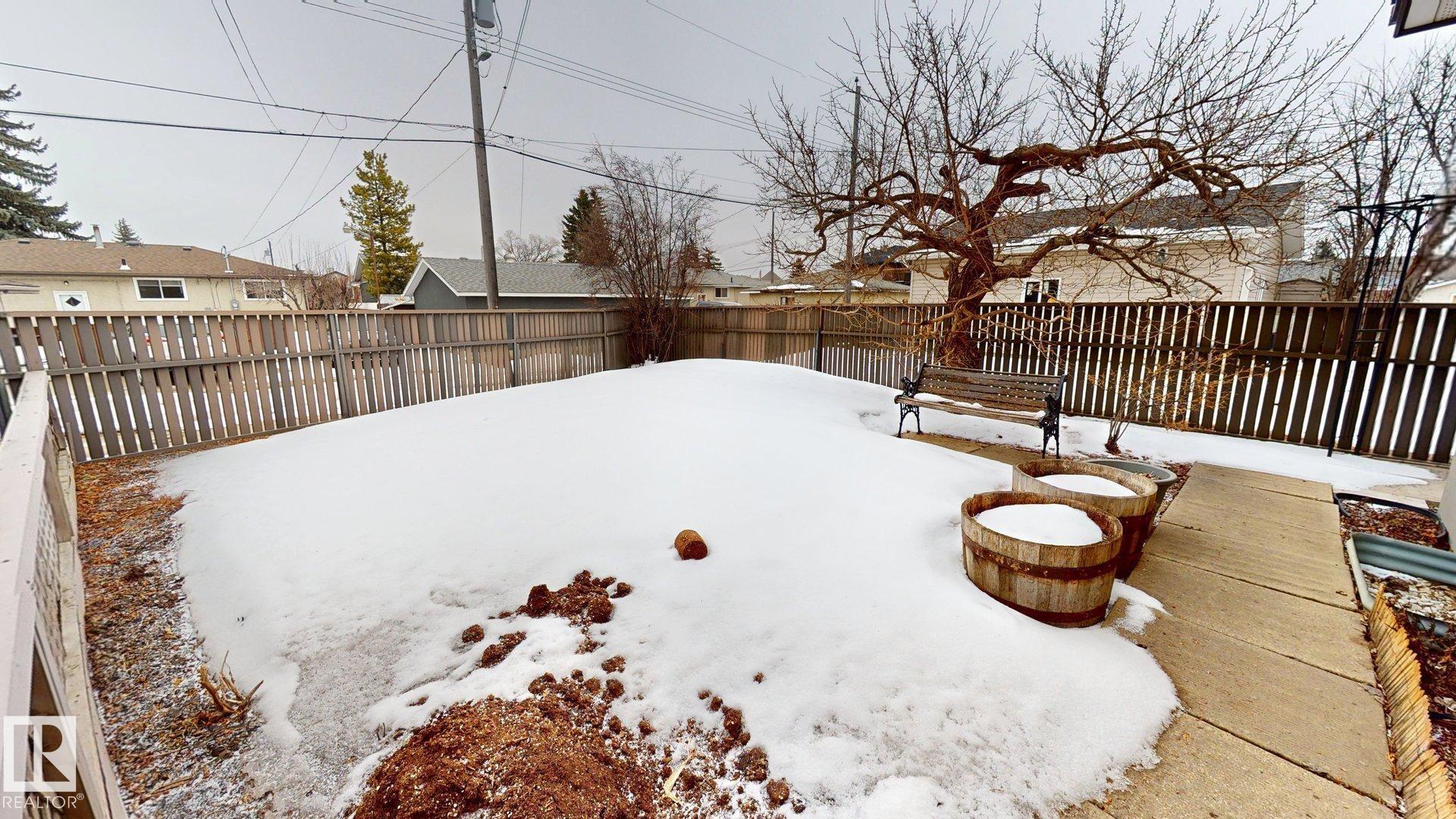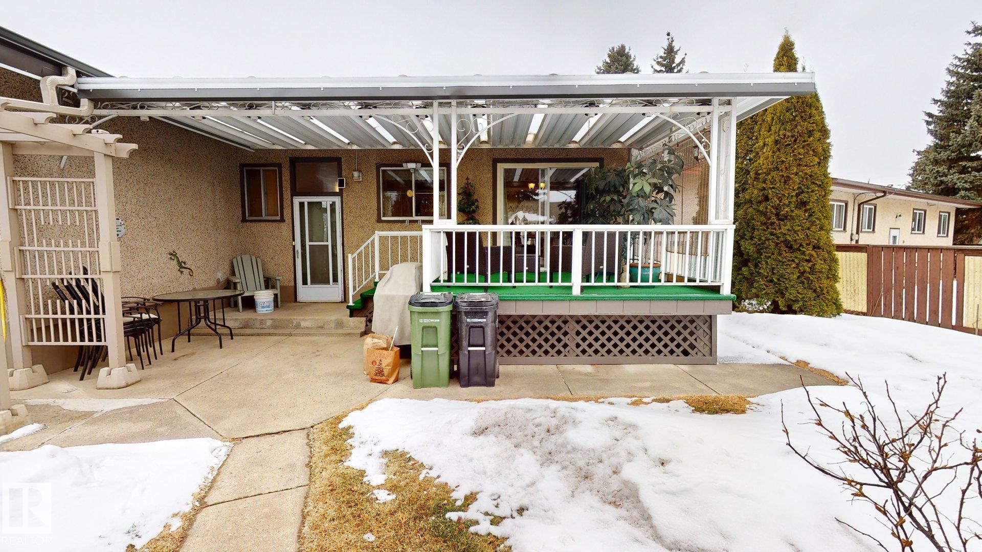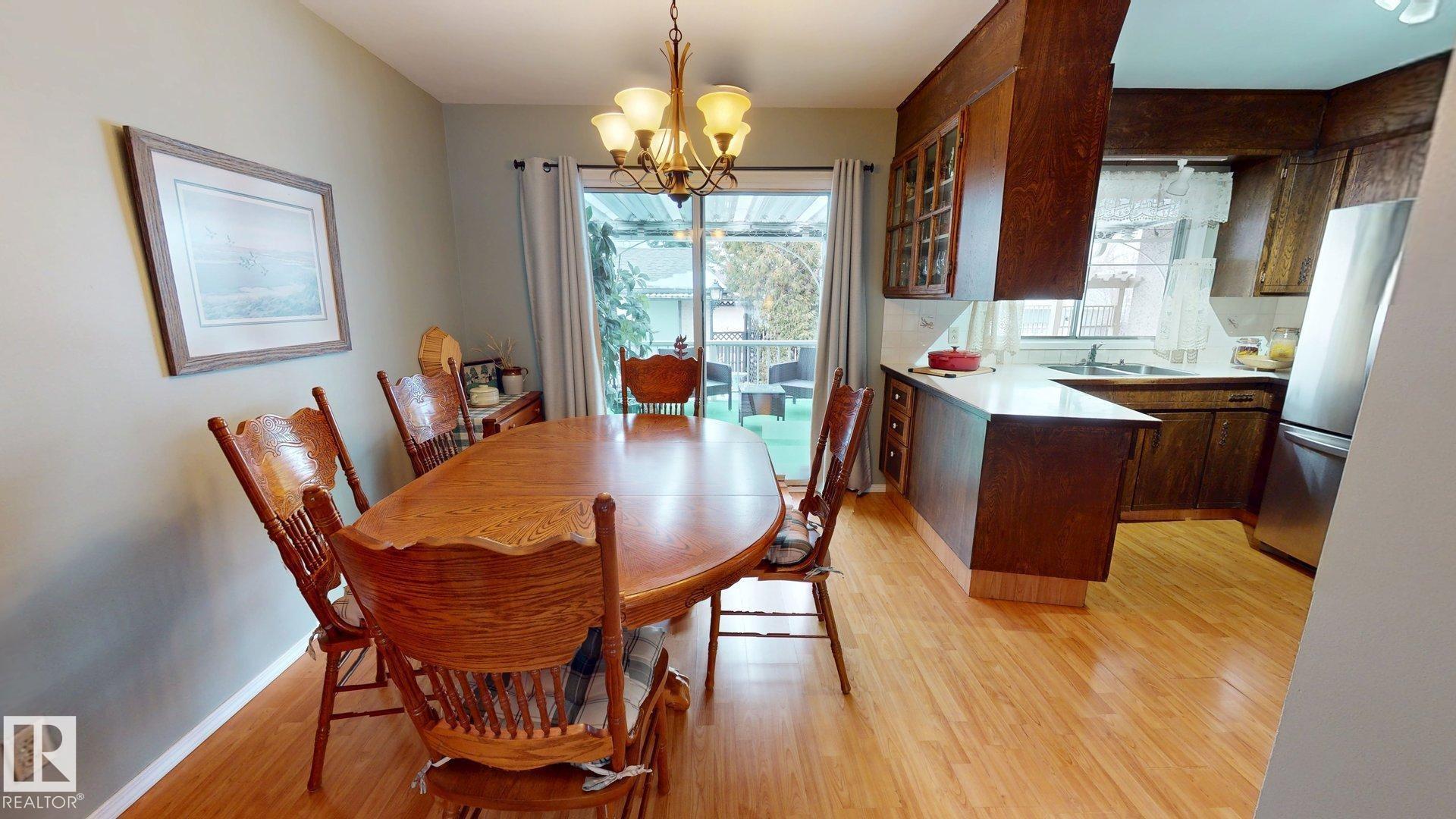 Spacious home, on a pie-shaped lot in a quiet, mature neighbourhood. Features a single attached garage and double detached garage with two driveways, accommodating up to 8 vehicles. The main floor includes an eat-in kitchen with stainless steel appliances, family room with French doors, 3 bedrooms, 3pc bath, and den with garage access. The fully finished lower level offers a recreation room with wet bar, kitchenette, bedroom, 3pc bath, laundry area, storage, and bonus room. Exterior includes new roof (Aug 2024), aluminum siding, stucco, metal fencing, covered deck & patio, and gas BBQ hookup. Landscaped yard with garden, fruit trees, and award-winning curb appeal. Close to schools, shopping, and transit.