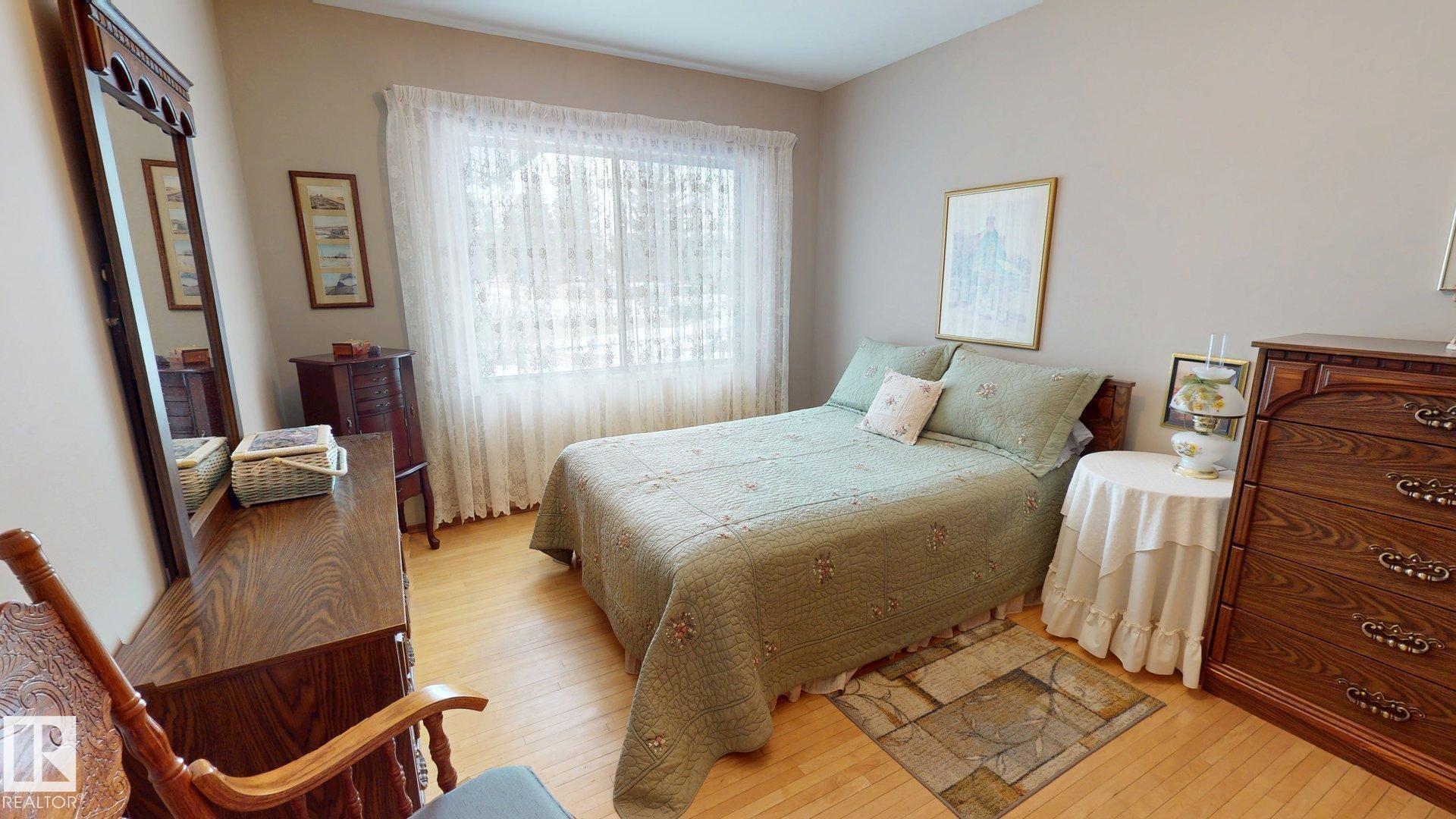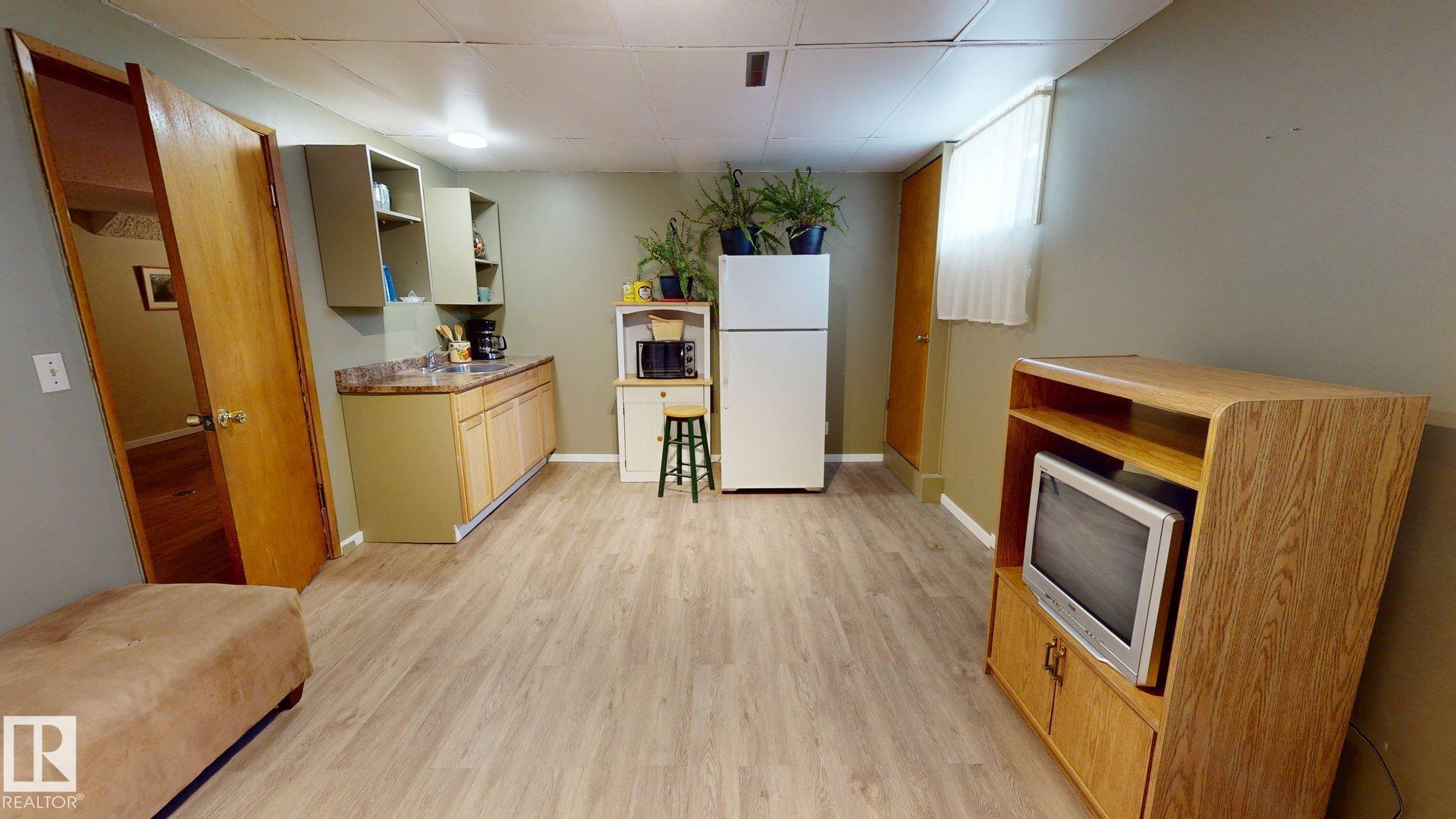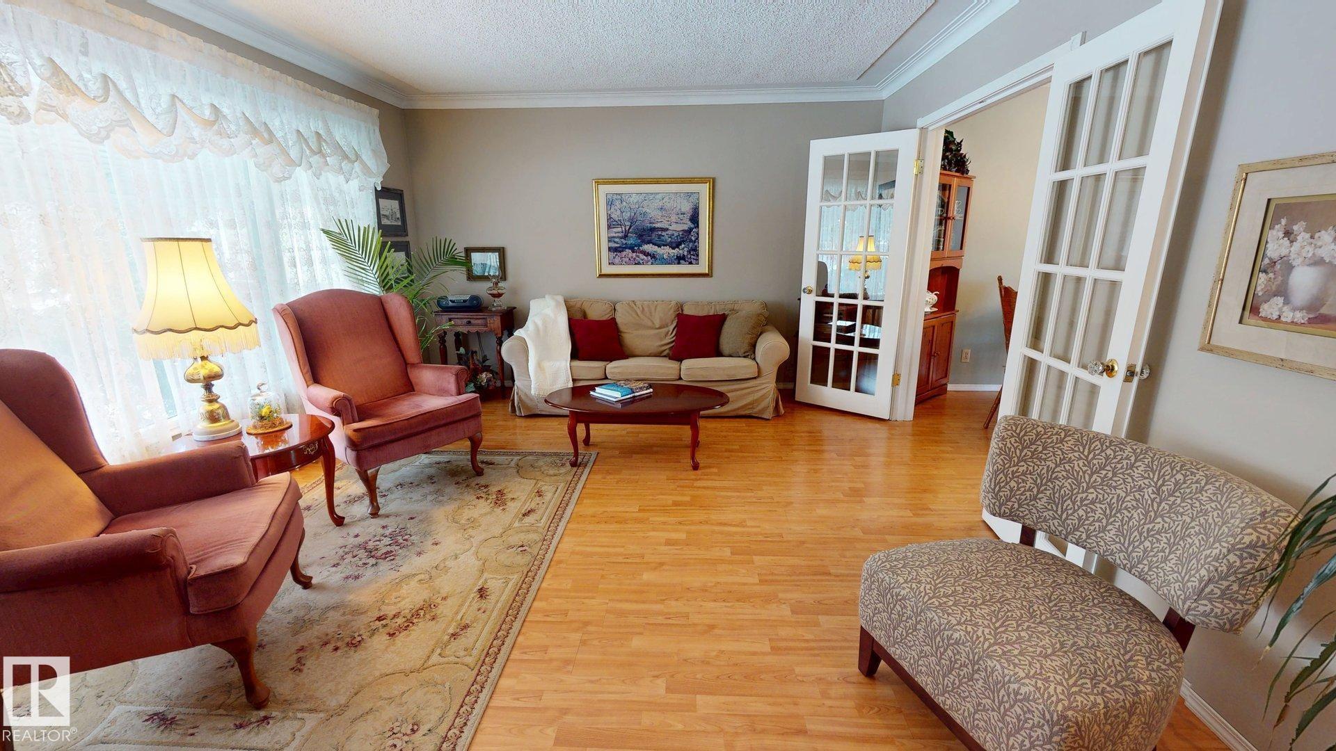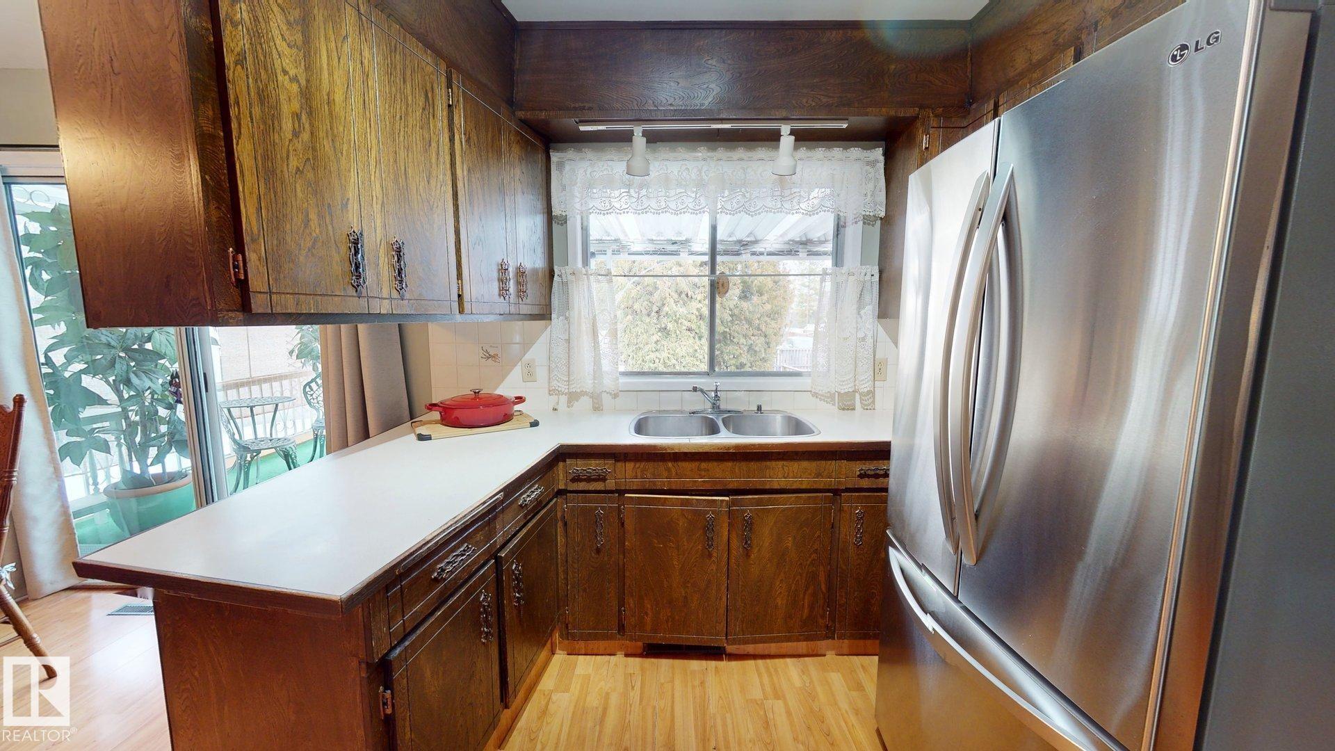 Spacious home, on a pie-shaped lot in a quiet, mature neighbourhood. Features a single attached garage and double detached garage with two driveways, accommodating up to 8 vehicles. The main floor includes an eat-in kitchen with stainless steel appliances, family room with French doors, 3 bedrooms, 3pc bath, and den with garage access. The fully finished lower level offers a recreation room with wet bar, kitchenette, bedroom, 3pc bath, laundry area, storage, and bonus room. Exterior includes new roof (Aug 2024), aluminum siding, stucco, metal fencing, covered deck & patio, and gas BBQ hookup. Landscaped yard with garden, fruit trees, and award-winning curb appeal. Close to schools, shopping, and transit.