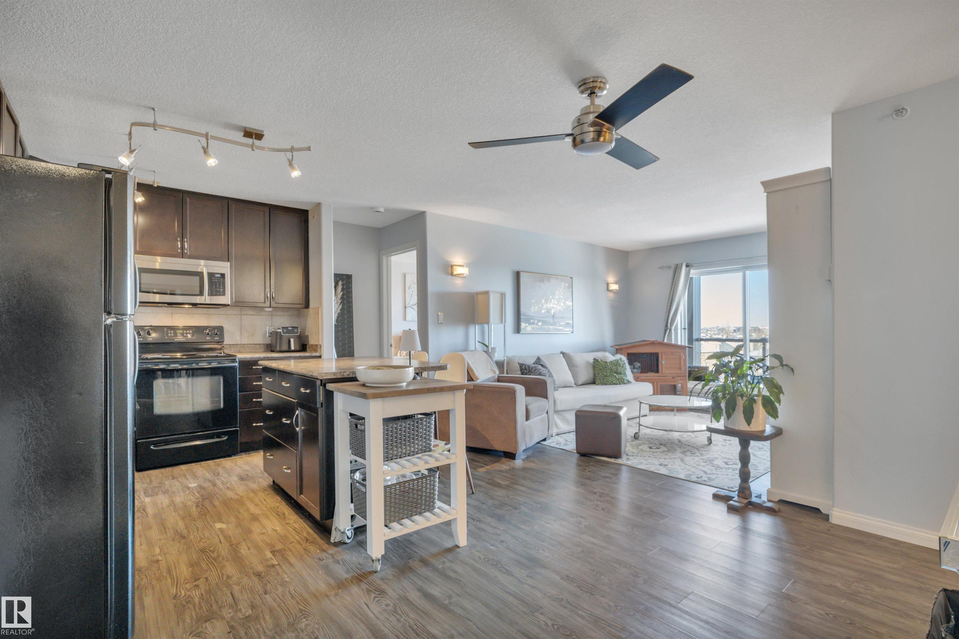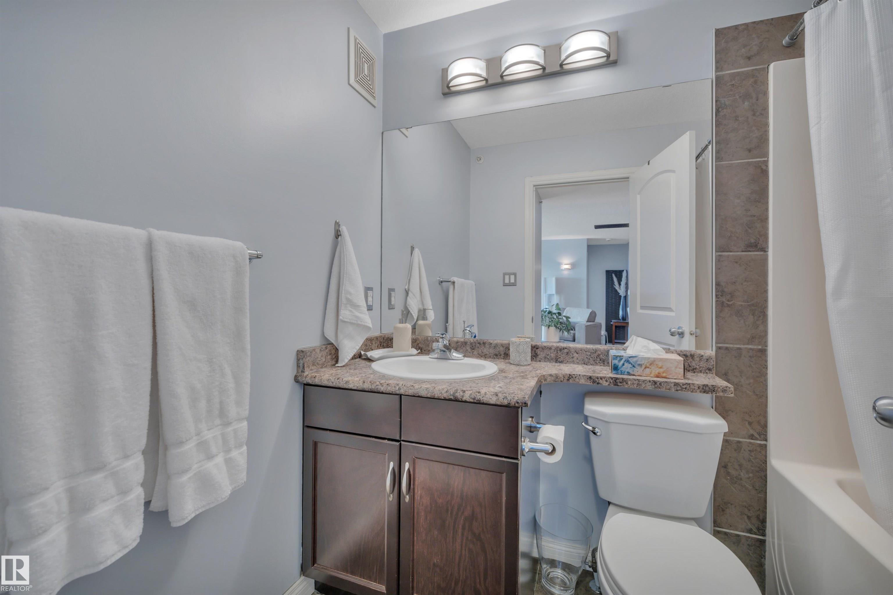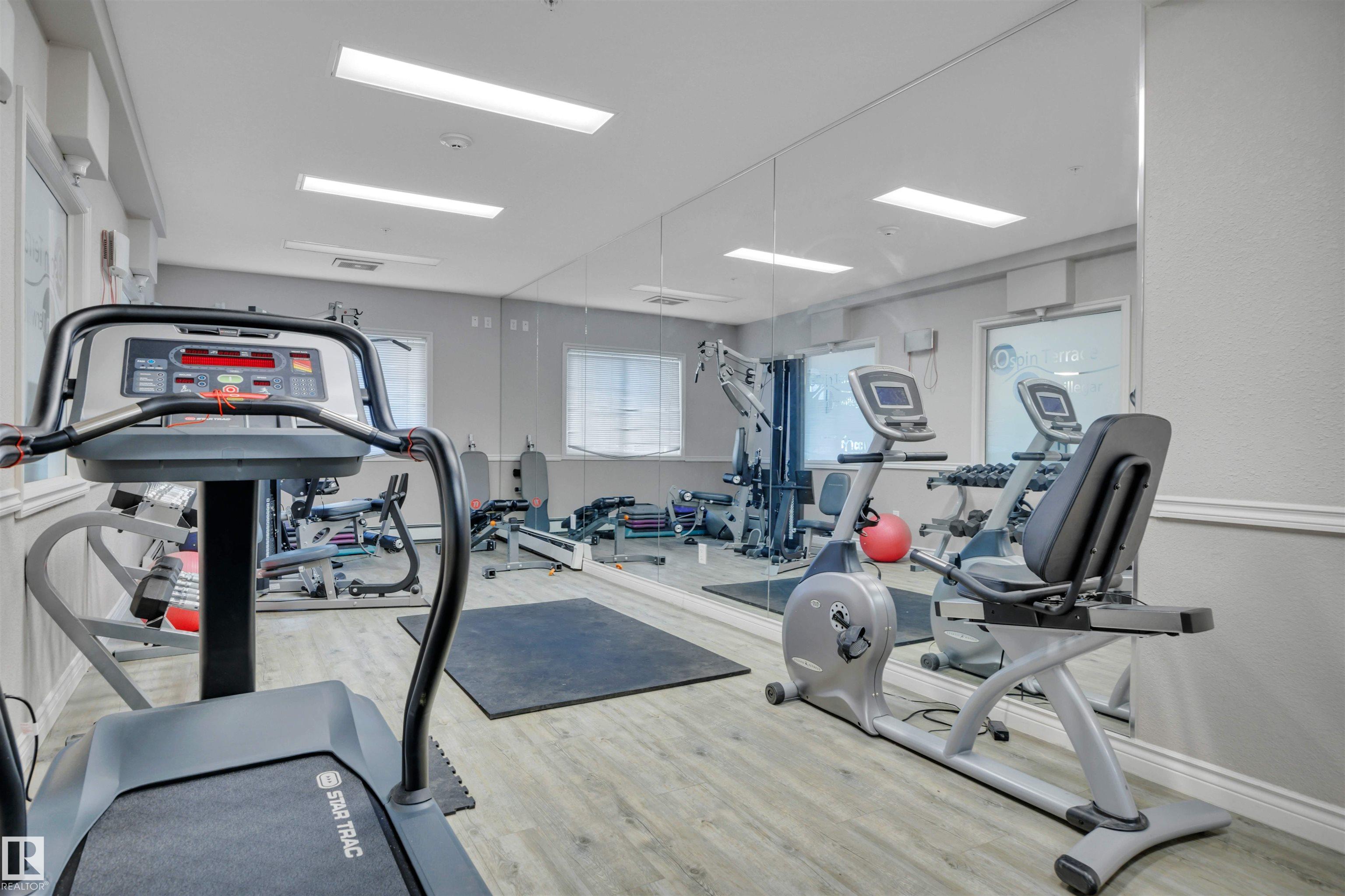 TOP FLOOR FACING THE TREES! MOVE IN READY! 2 PARKING STALLS! (1 UNDERGROUND, 1 SURFACE). Searching for a private top floor suite with numerous cosmetic updates? This 866 sq ft 2 bed, 2 bath, tastefully designed unit may be it! Feat: newer paint, vinyl plank flooring, lighting, covered deck, & more! Classic open concept layout unites the living / kitchen space; ample natural lighting ideal for entertaining during summer BBQs & hangouts. L shaped kitchen w/ island for meal prep & storage. 2 good sized bedrooms including the primary bed w/ double closet & 3 pce ensuite. Additional 4 pce bath & in suite laundry for added convenience. TITLED SURFACE PARKING & ASSIGNED UNDERGROUND PARKING for your 2 vehicles is a rare find. Condo fees of $529.57 include heat, water / sewer, gym access, & professional management. Quick access to the Henday & Whitemud makes Ospin Terrace a winner! Terrific value, a must see!
