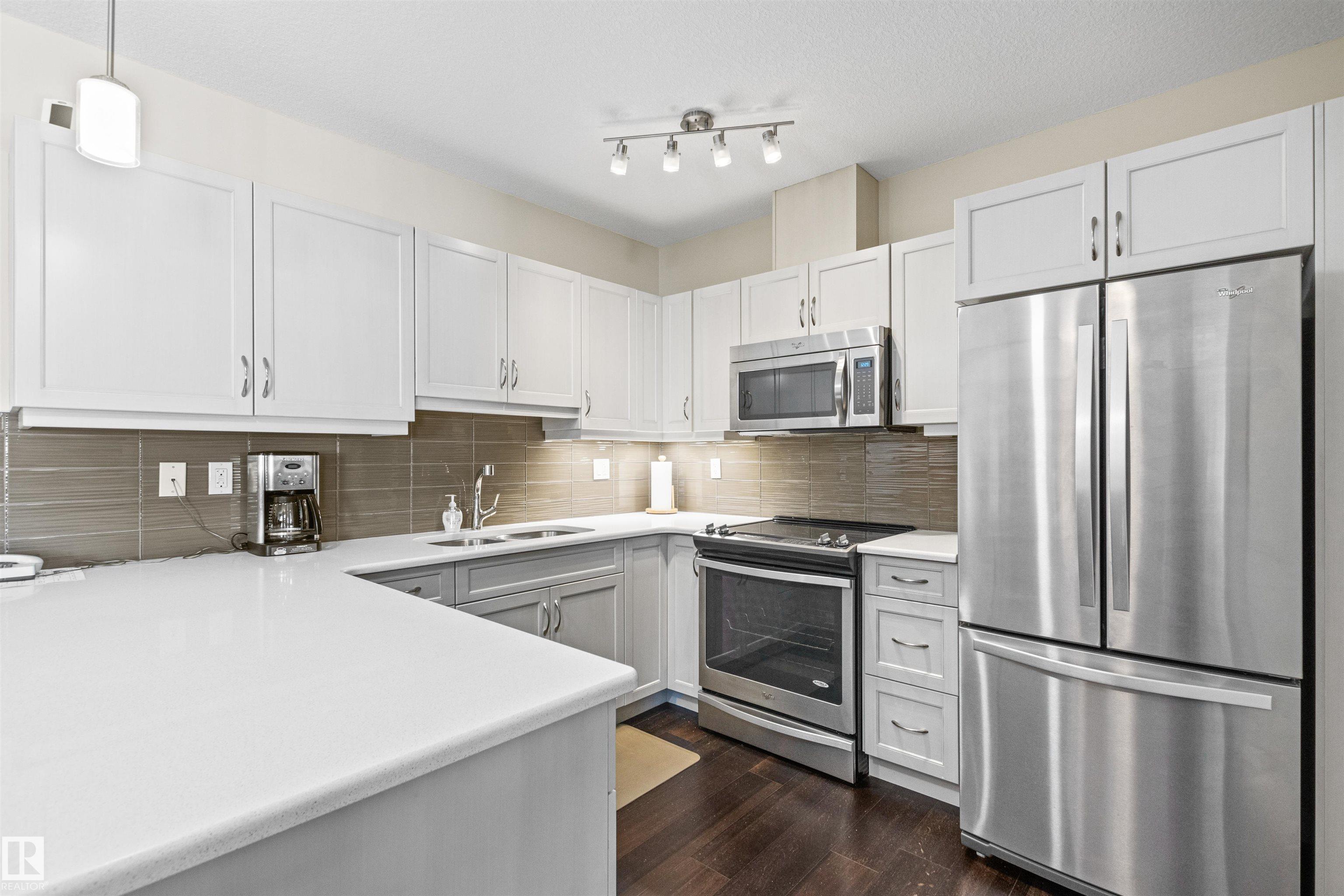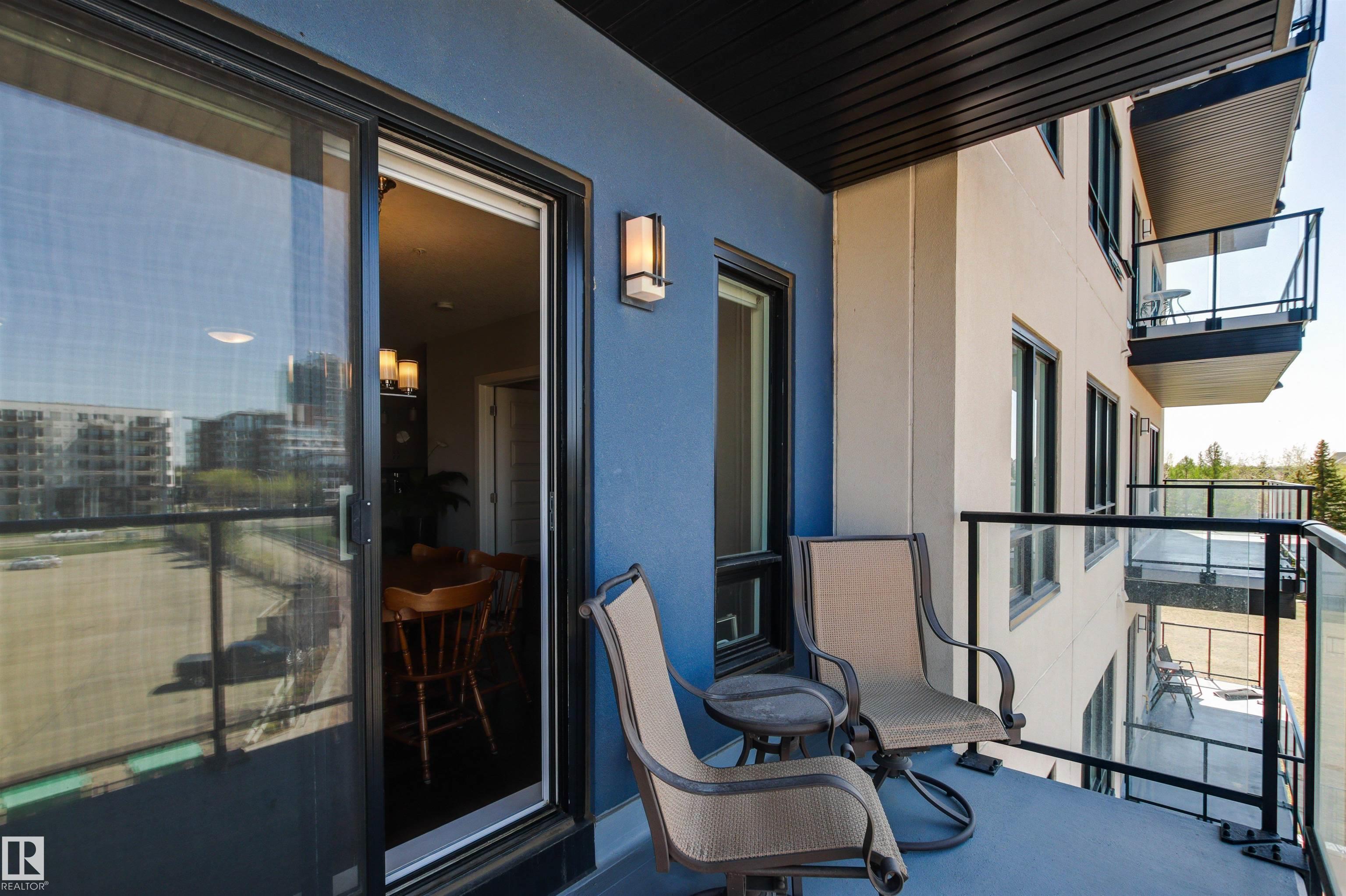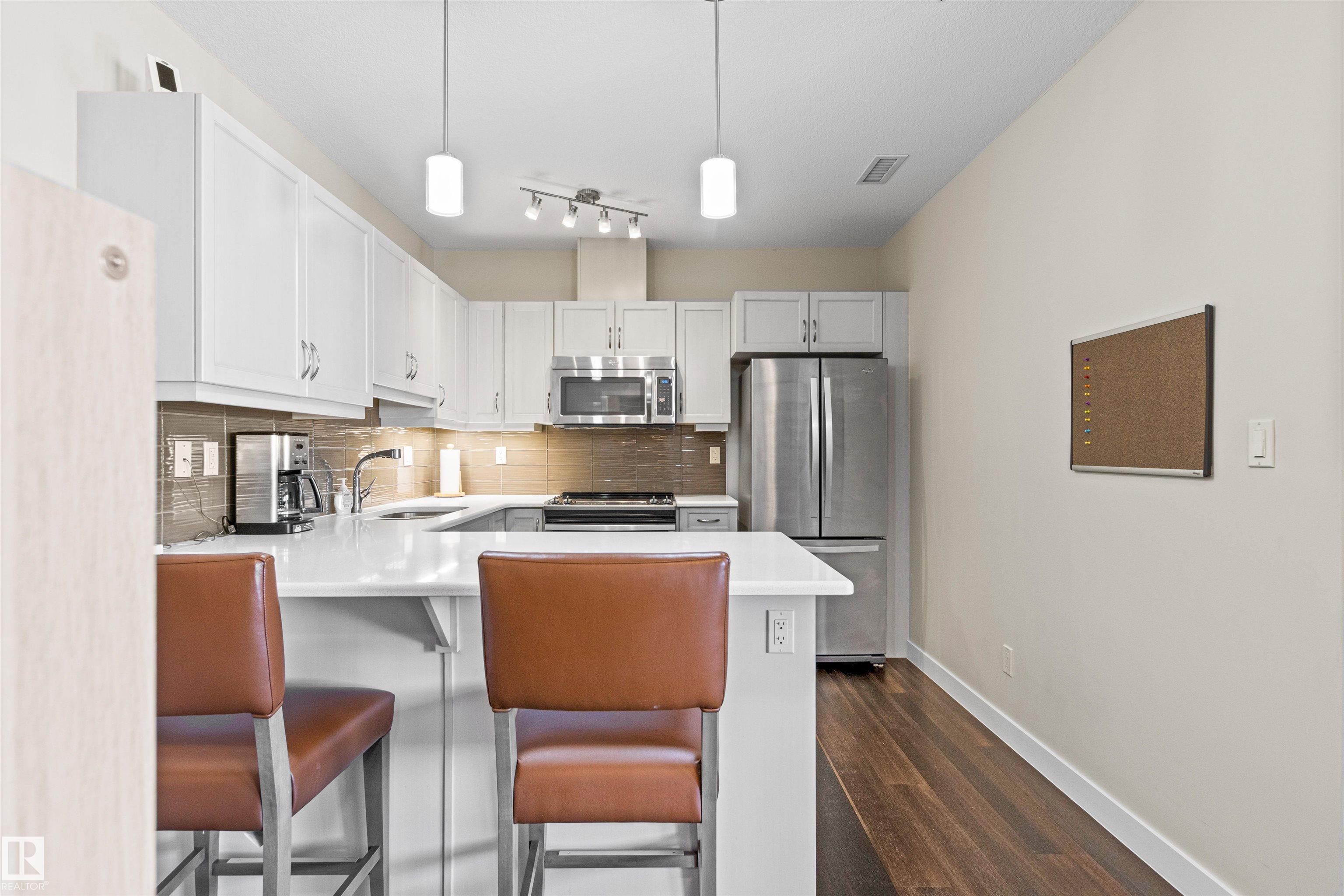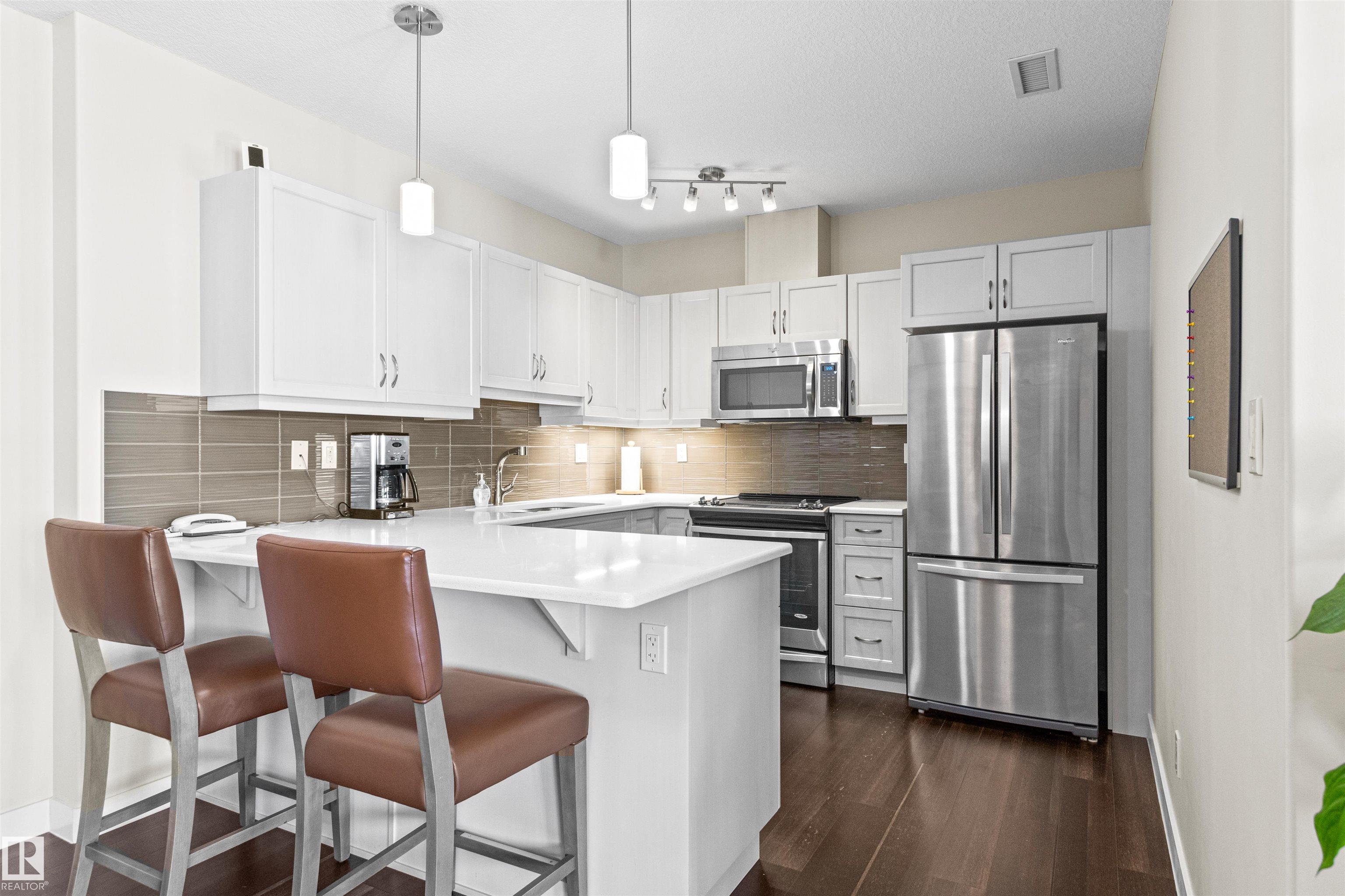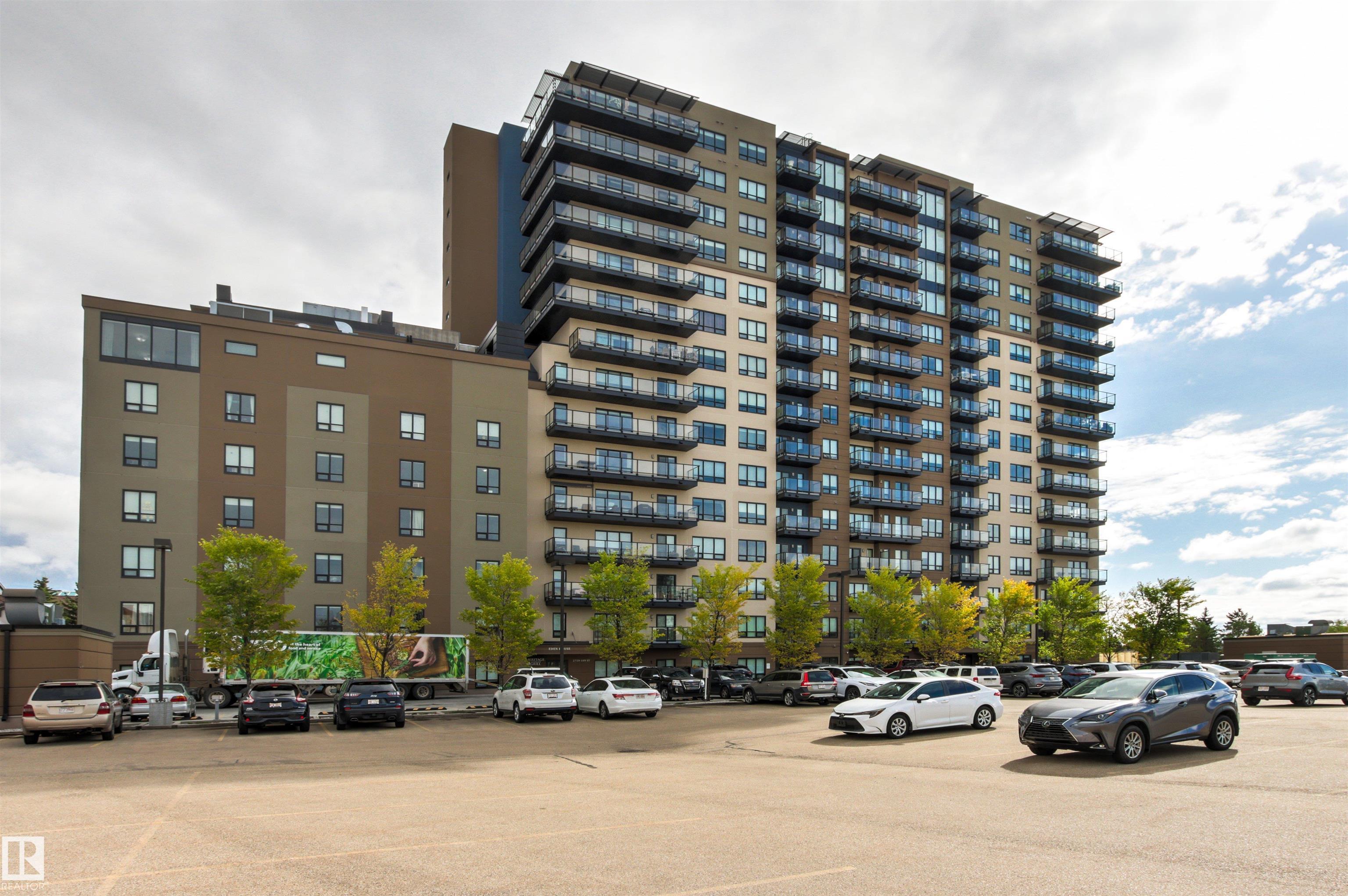 Here's the one you've been waiting for! This 2 Bedroom, 2 full Bath unit comes with bonus after bonus - 2 balconies; 2 Titled Parking stalls (1 oversized undergound - long enough for a full size truck & one outdoor) plus a titled storage room. This unit is one of only 2 in the building with this floorplan - large open concept living room/dining room, 2 Bedrooms , 2 full bathrooms offering a spacious ensuite with tub and a guest bathroom off the main living space that has a separate walk-in shower. Modern colour palette & finishes throughout including dark engineered wood flooring, quartz countertops, glass tile backsplash, under-cabinet lighting, stainless steel appliances, A/C & even MOTORIZED WINDOW COVERINGS! There are many added features to living in this community - social activities in the Mosiac Cove lounge (games, movies, exercise class, exercise room, car wash & workshop. Residents also have access to optional onsite HomeCare & Heritage Market Grill Restaurant.