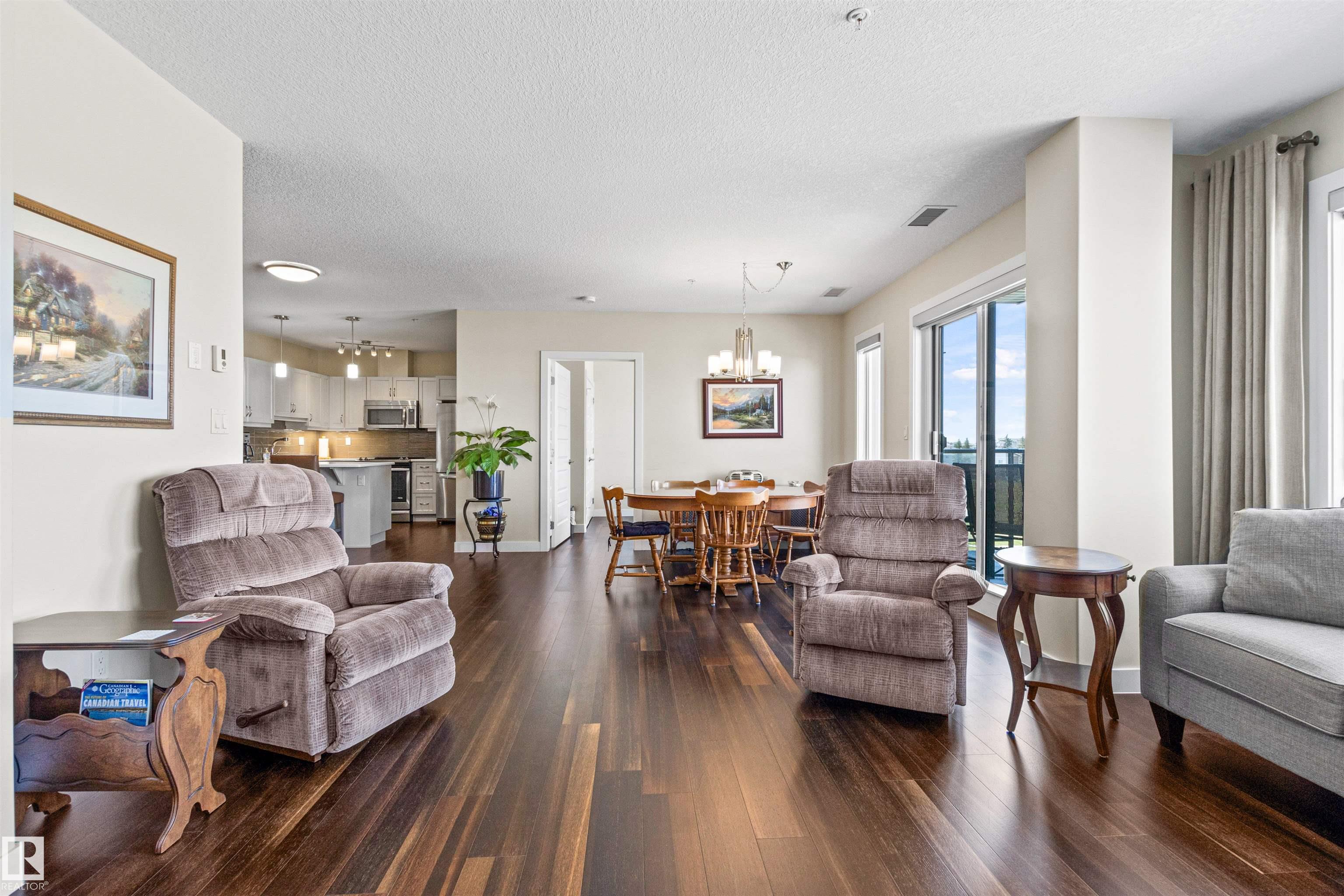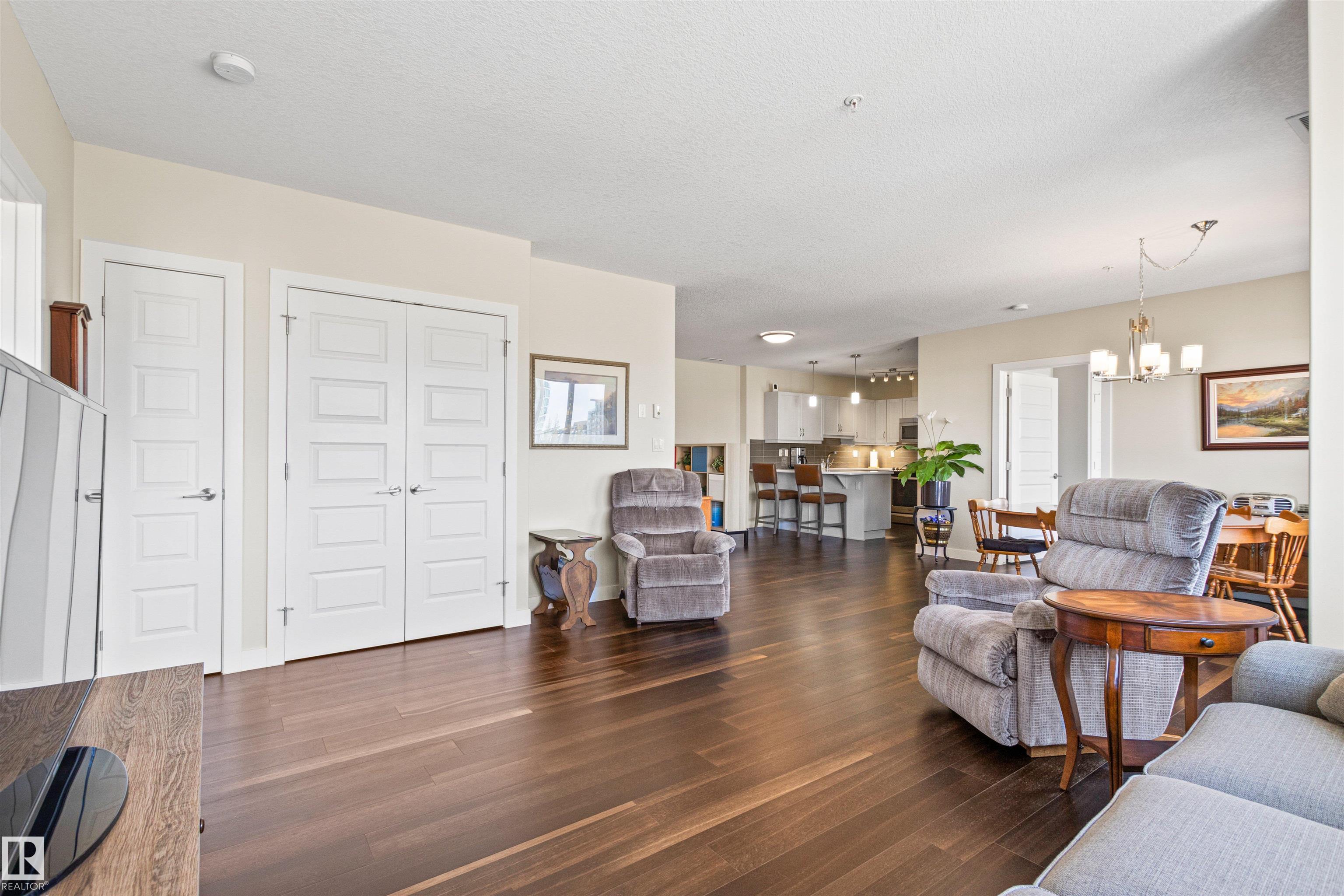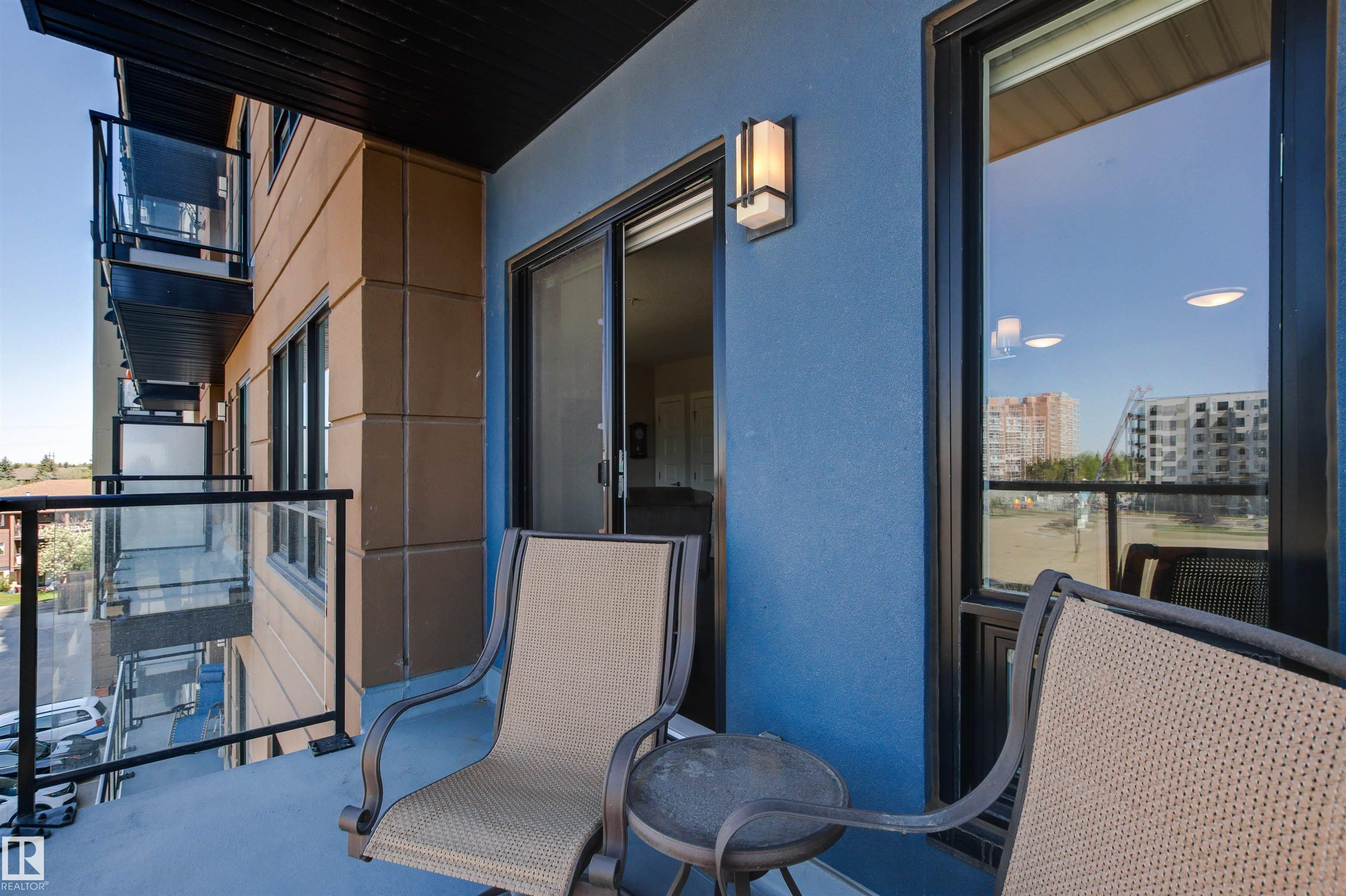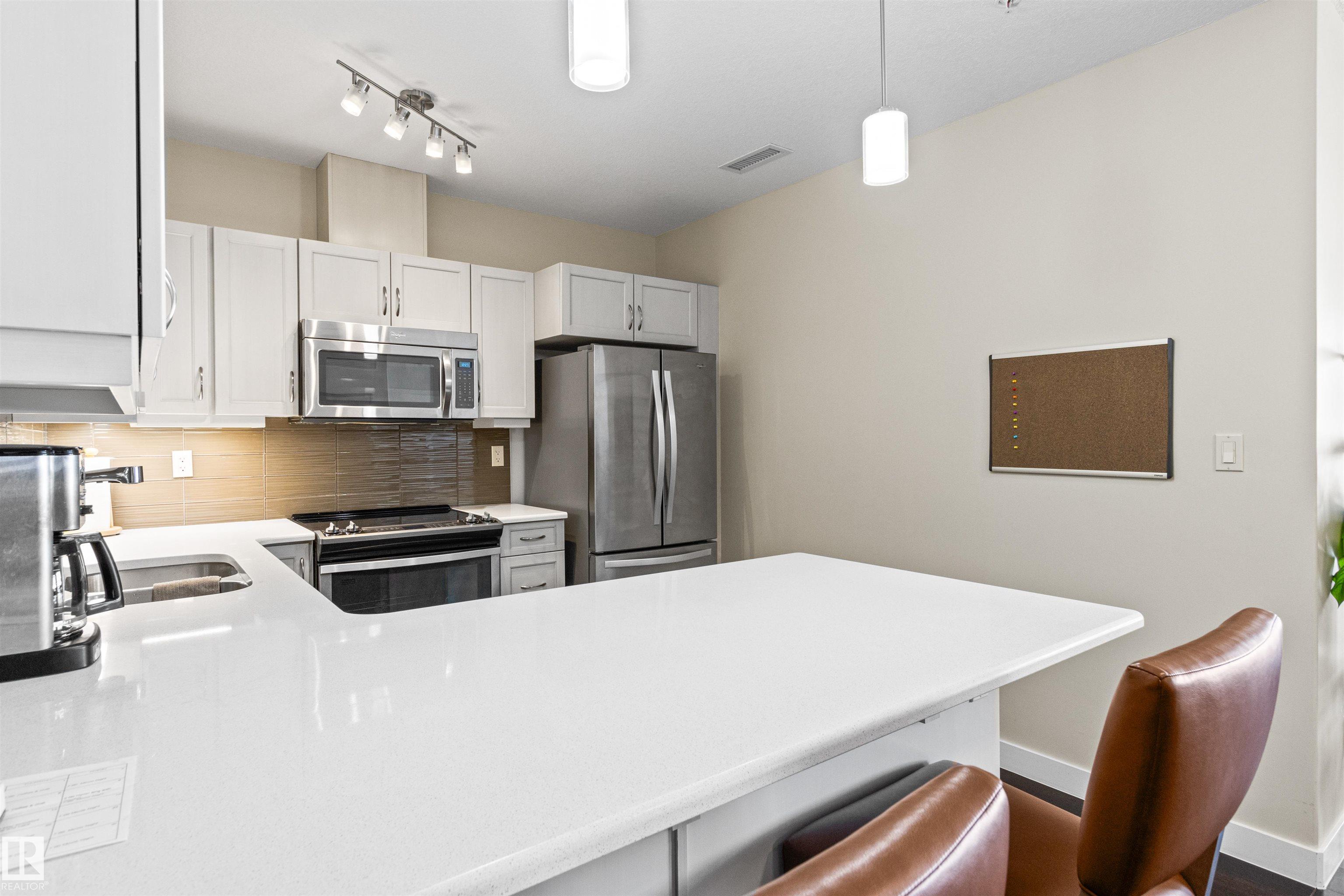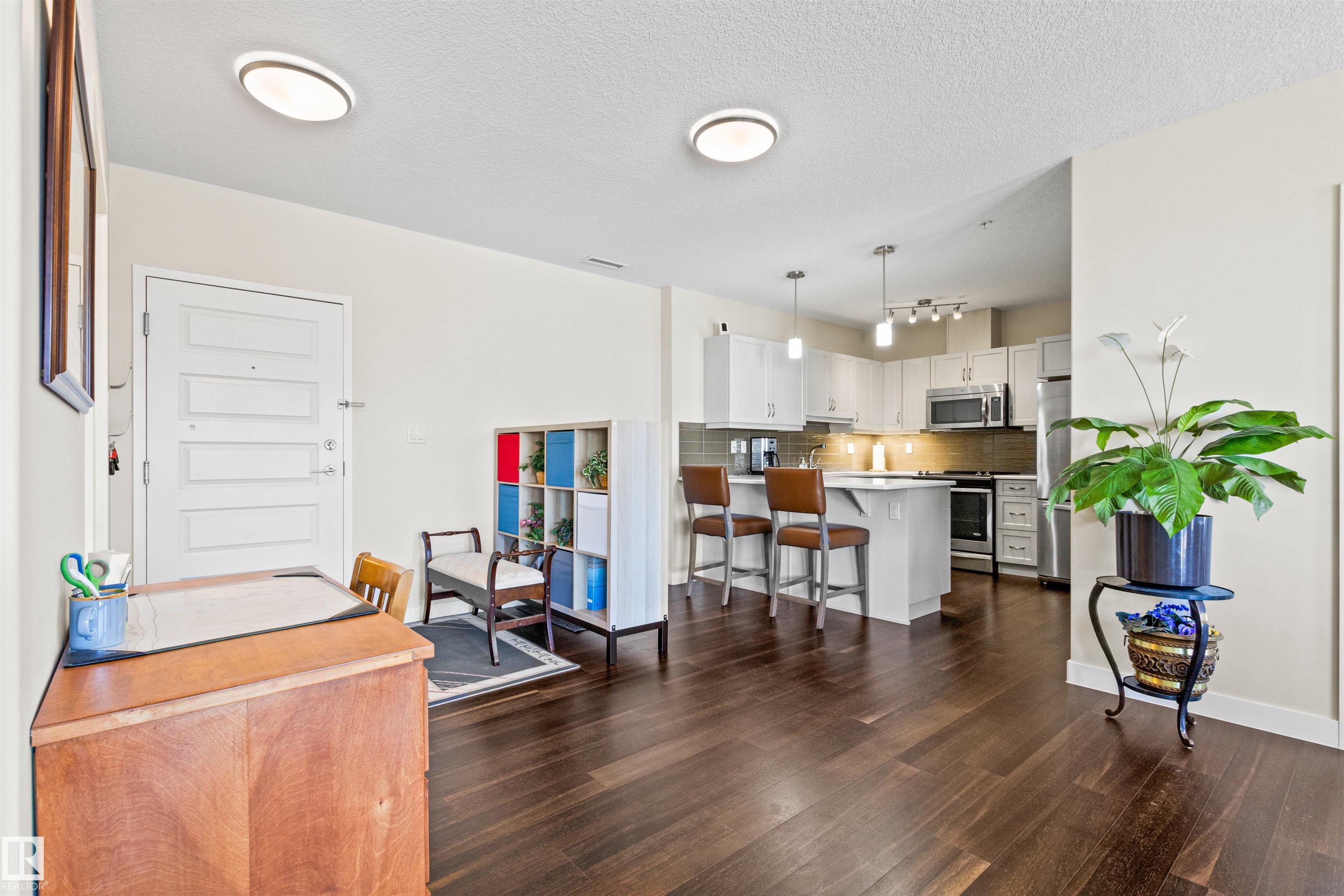 Here's the one you've been waiting for! This 2 Bedroom, 2 full Bath unit comes with bonus after bonus - 2 balconies; 2 Titled Parking stalls (1 oversized undergound - long enough for a full size truck & one outdoor) plus a titled storage room. This unit is one of only 2 in the building with this floorplan - large open concept living room/dining room, 2 Bedrooms , 2 full bathrooms offering a spacious ensuite with tub and a guest bathroom off the main living space that has a separate walk-in shower. Modern colour palette & finishes throughout including dark engineered wood flooring, quartz countertops, glass tile backsplash, under-cabinet lighting, stainless steel appliances, A/C & even MOTORIZED WINDOW COVERINGS! There are many added features to living in this community - social activities in the Mosiac Cove lounge (games, movies, exercise class, exercise room, car wash & workshop. Residents also have access to optional onsite HomeCare & Heritage Market Grill Restaurant.