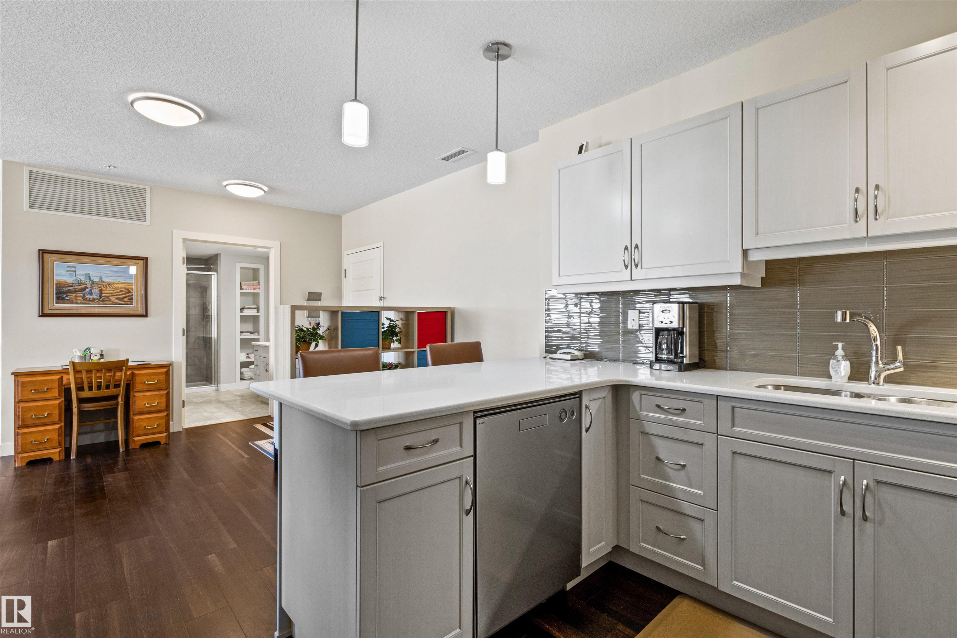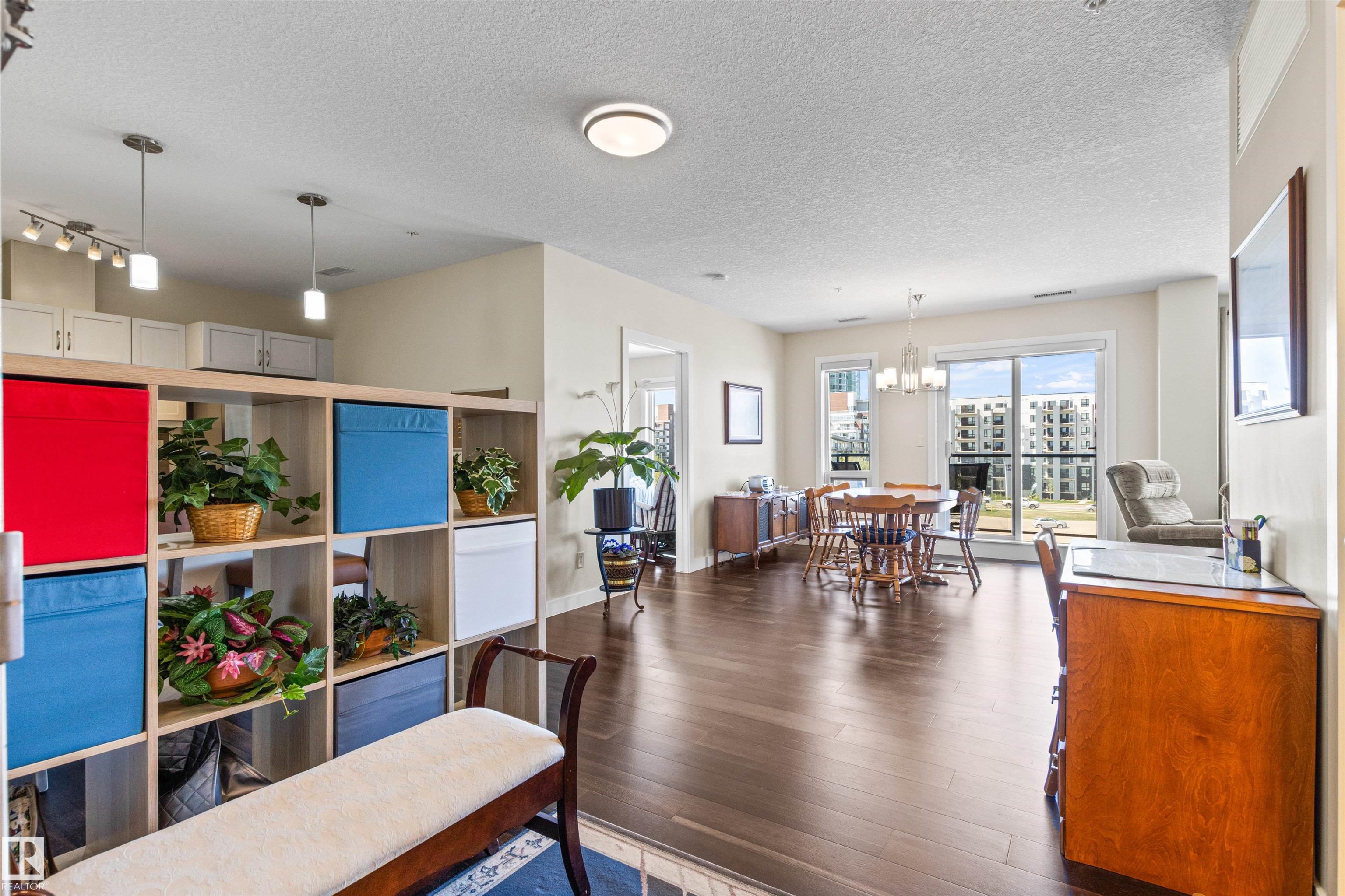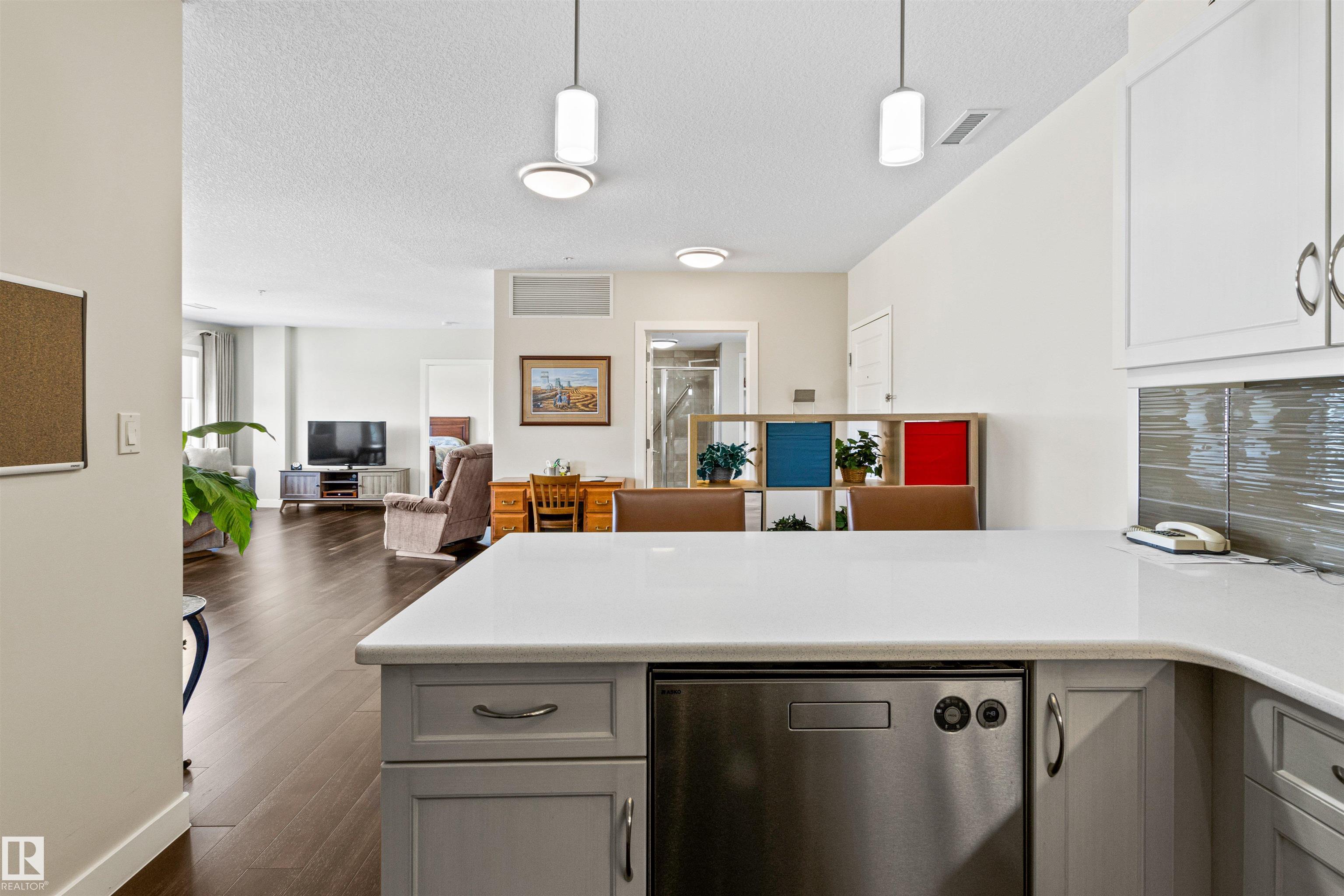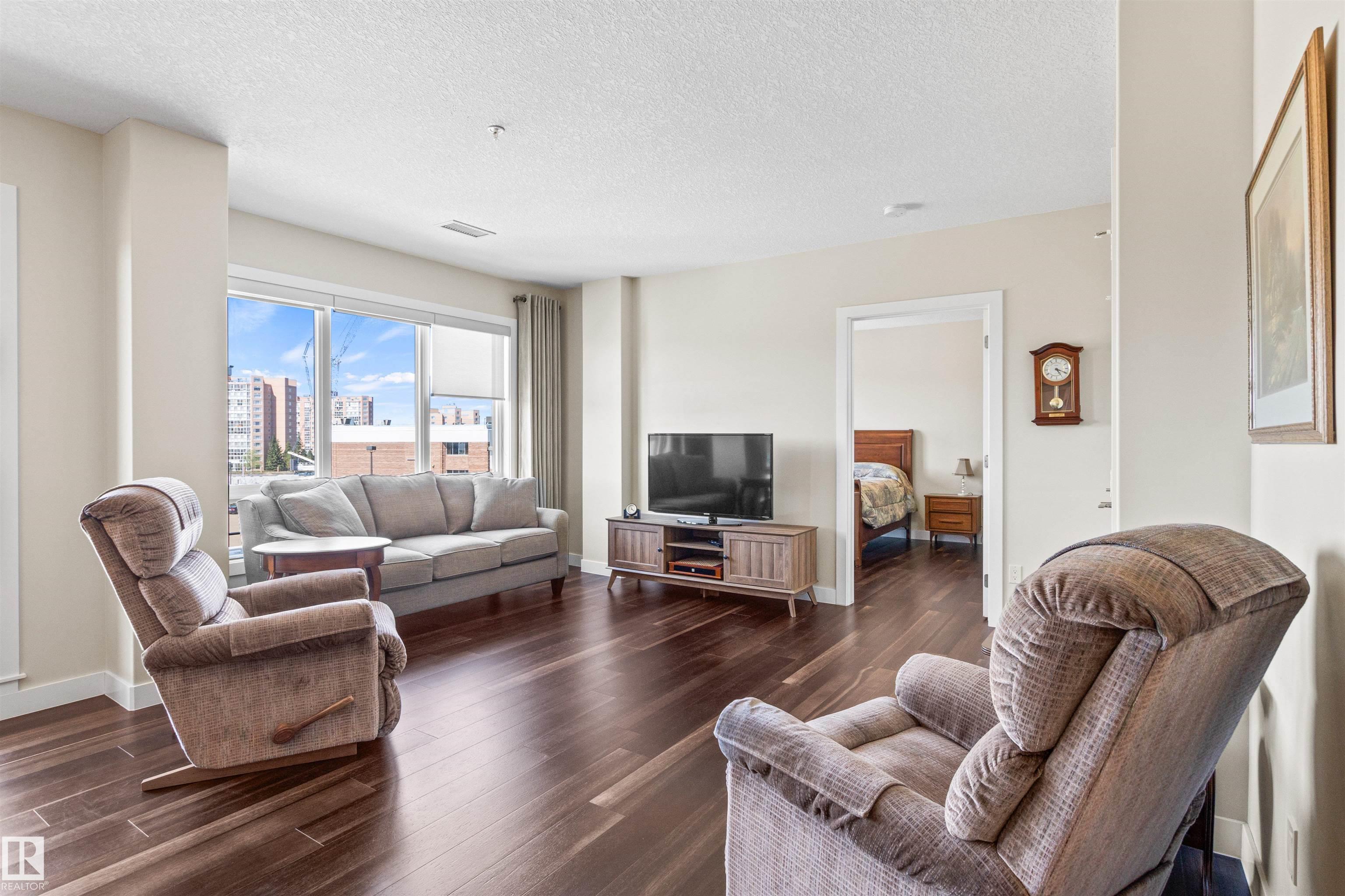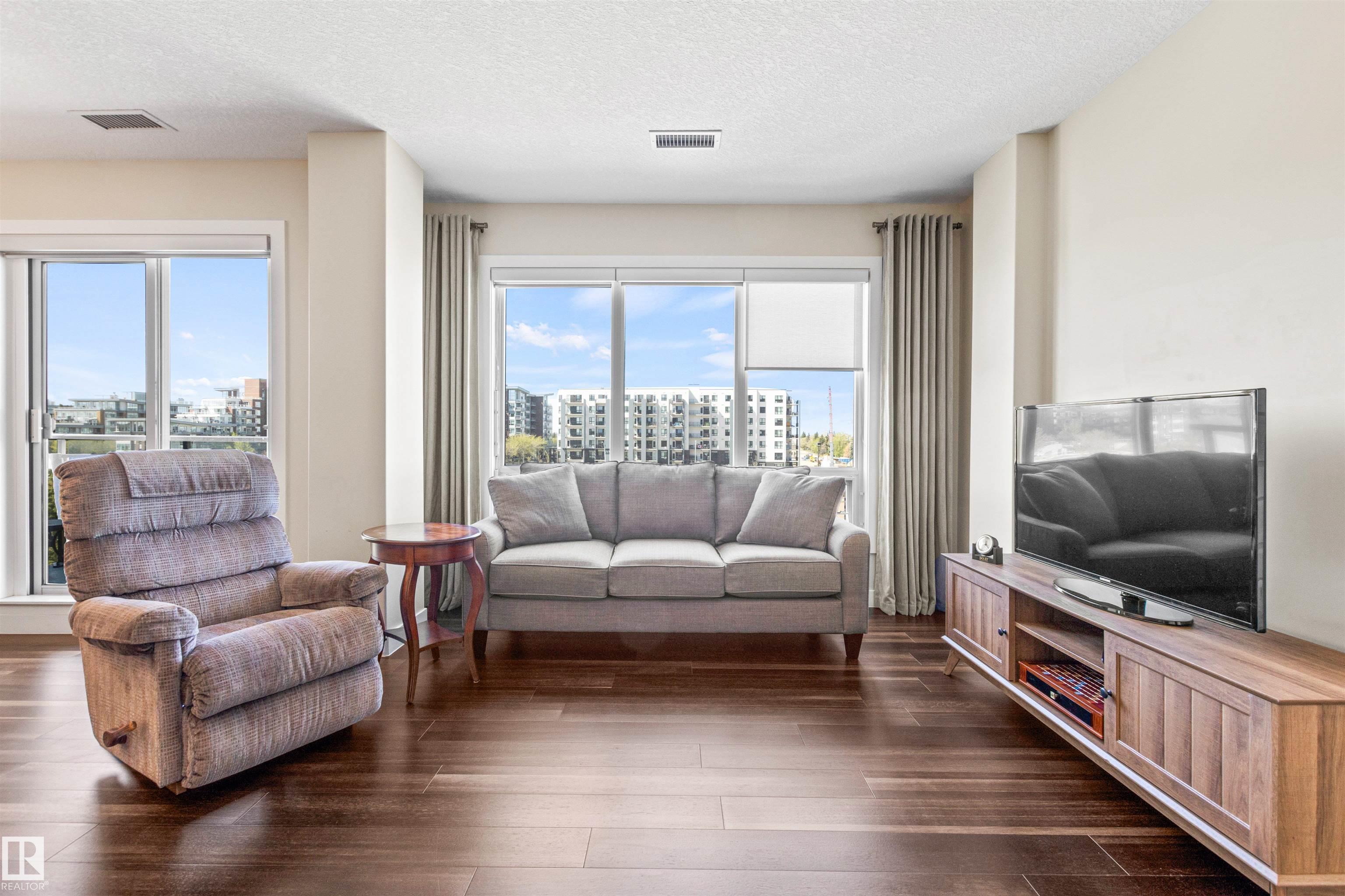 Here's the one you've been waiting for! This 2 Bedroom, 2 full Bath unit comes with bonus after bonus - 2 balconies; 2 Titled Parking stalls (1 oversized undergound - long enough for a full size truck & one outdoor) plus a titled storage room. This unit is one of only 2 in the building with this floorplan - large open concept living room/dining room, 2 Bedrooms , 2 full bathrooms offering a spacious ensuite with tub and a guest bathroom off the main living space that has a separate walk-in shower. Modern colour palette & finishes throughout including dark engineered wood flooring, quartz countertops, glass tile backsplash, under-cabinet lighting, stainless steel appliances, A/C & even MOTORIZED WINDOW COVERINGS! There are many added features to living in this community - social activities in the Mosiac Cove lounge (games, movies, exercise class, exercise room, car wash & workshop. Residents also have access to optional onsite HomeCare & Heritage Market Grill Restaurant.