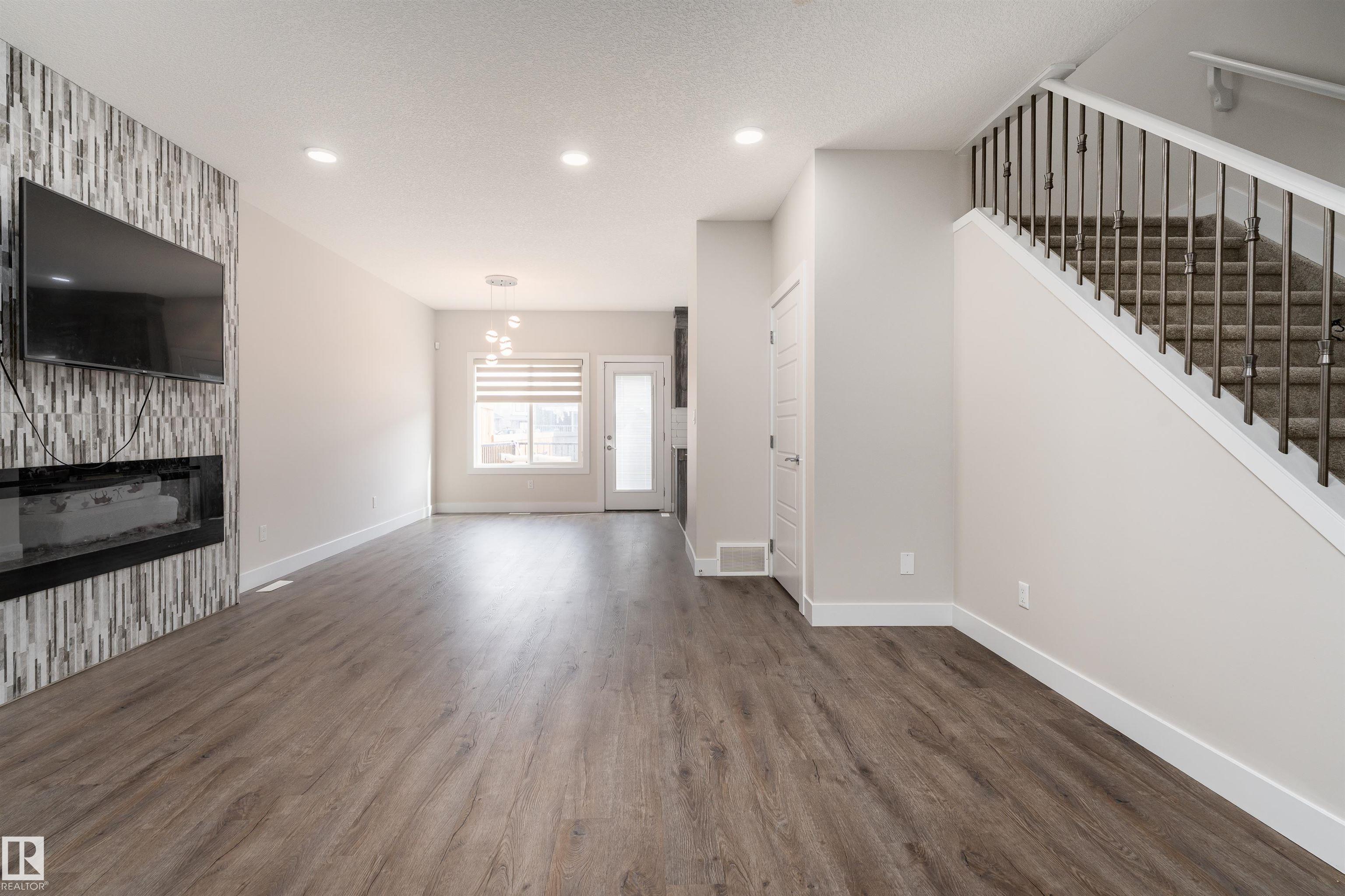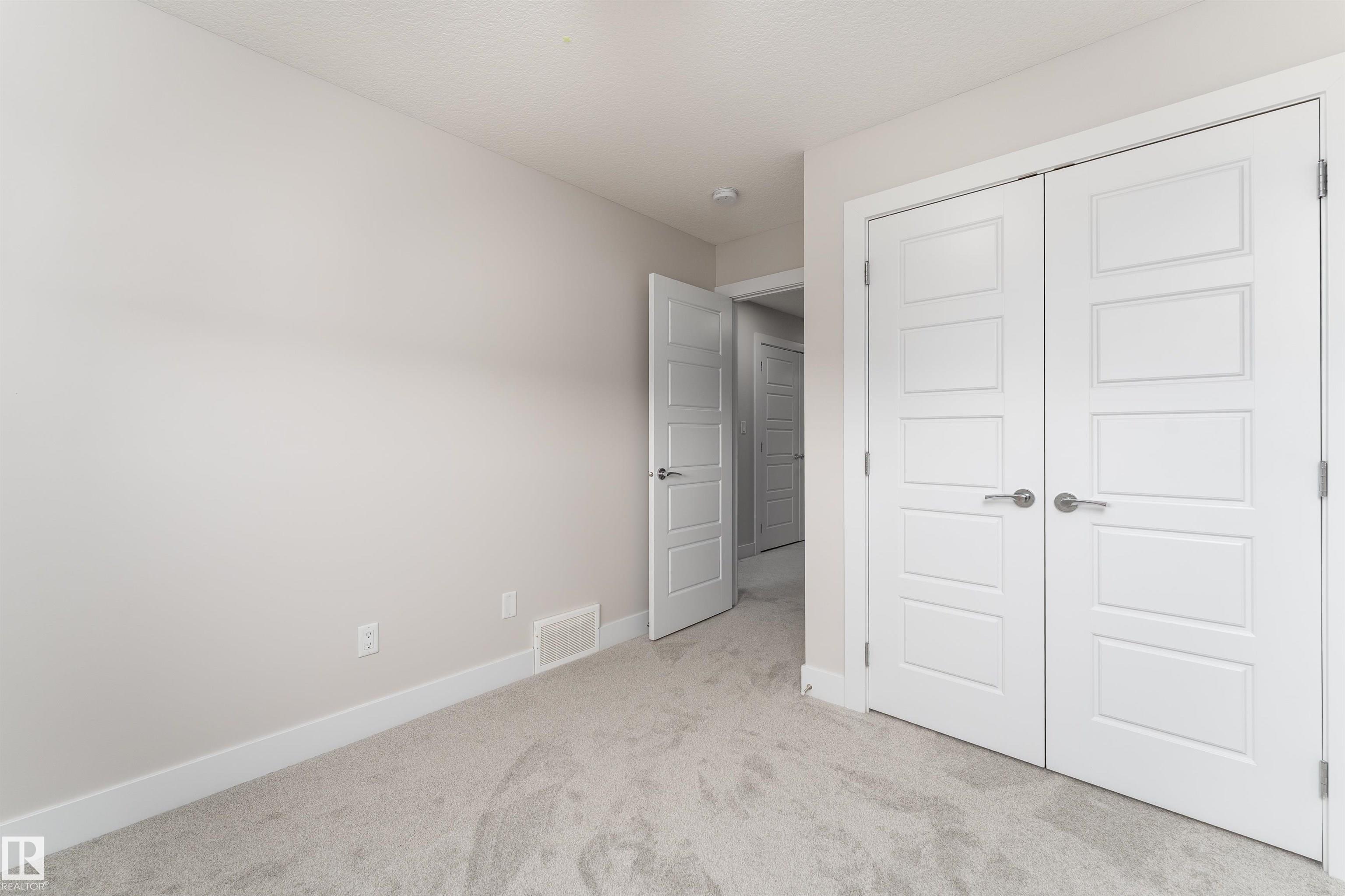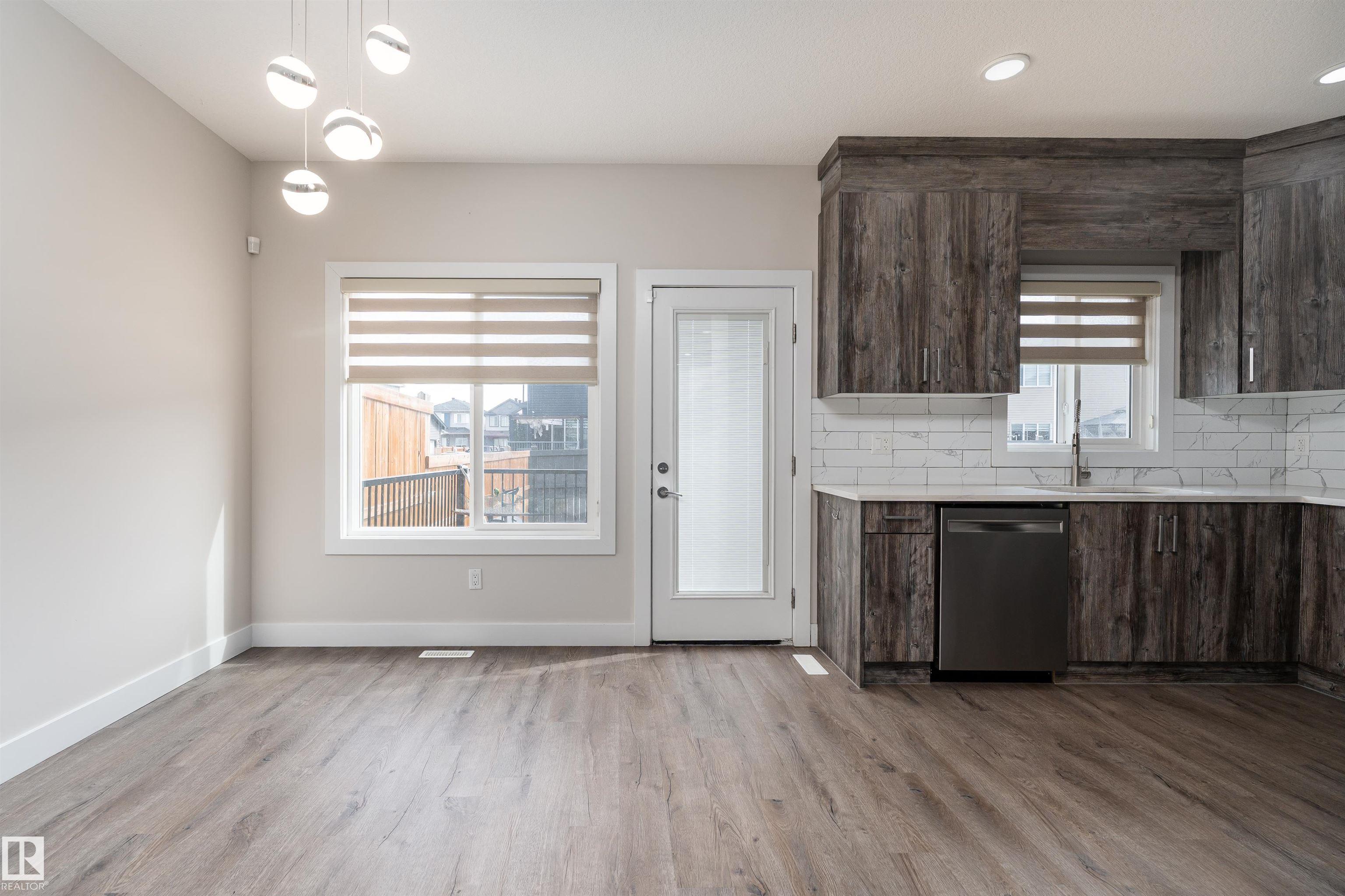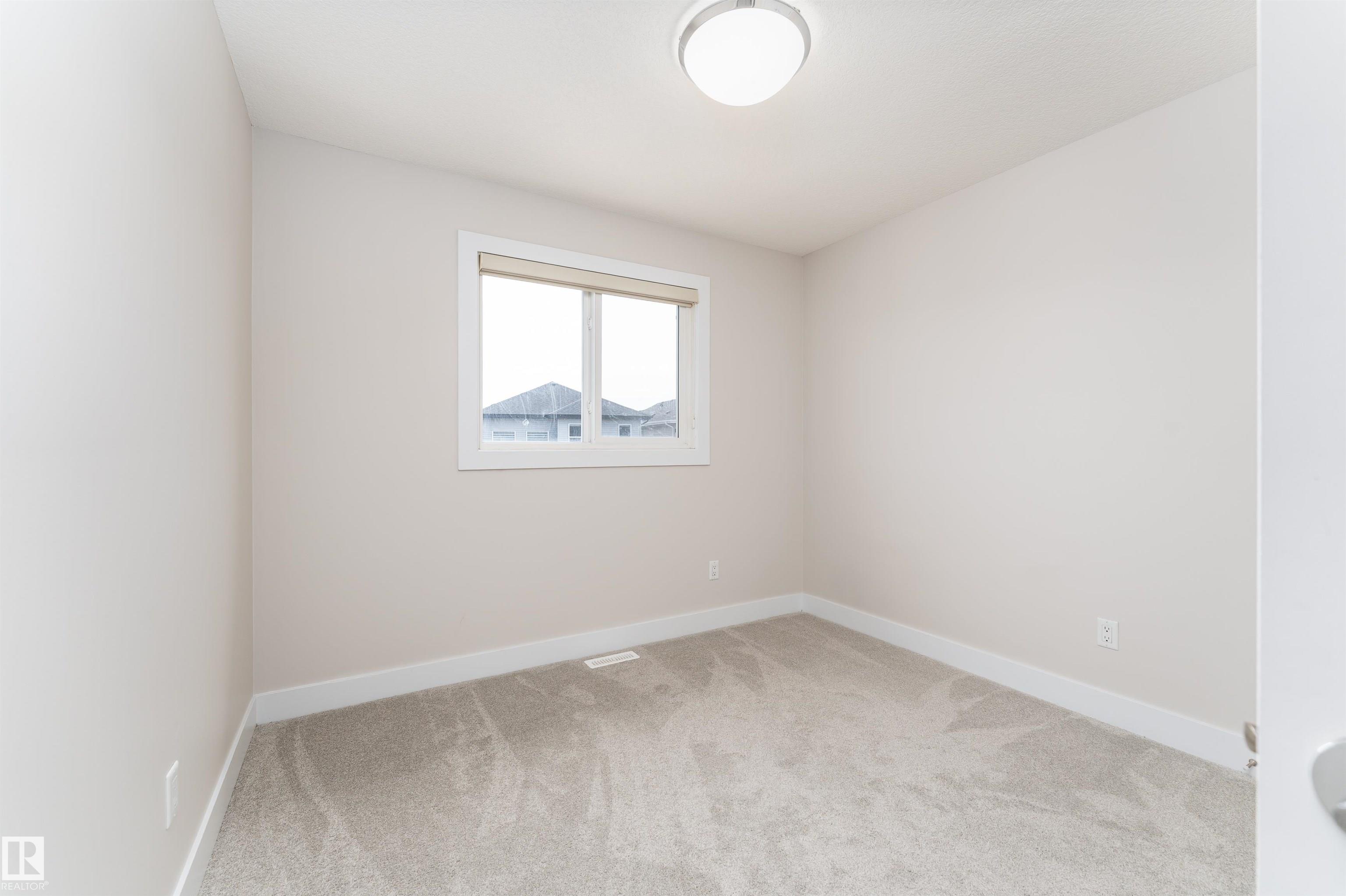 Be inspired by this modern and vibrant half duplex in McConachie with a double attached garage and over 2200 sq ft of living space designed for a growing family. The open concept main floor features a spacious living room centered around an electric fireplace with floor to ceiling tile. The kitchen showcases beautiful cabinetry, white quartz countertops, and brand new stainless steel appliances, all next to a dining nook that comfortably seats six. A two piece bath completes the main level. Upstairs offers a versatile bonus room, a large primary suite with a four piece ensuite and walk in closet with custom shelving, plus two more bedrooms, another full bath, and convenient upper laundry. The fully finished basement has a separate SIDE entrance, a bedroom, full bath, and rec space perfect for guests or future suite potential. Enjoy a landscaped yard with a deck. Freshly painted and move in ready.