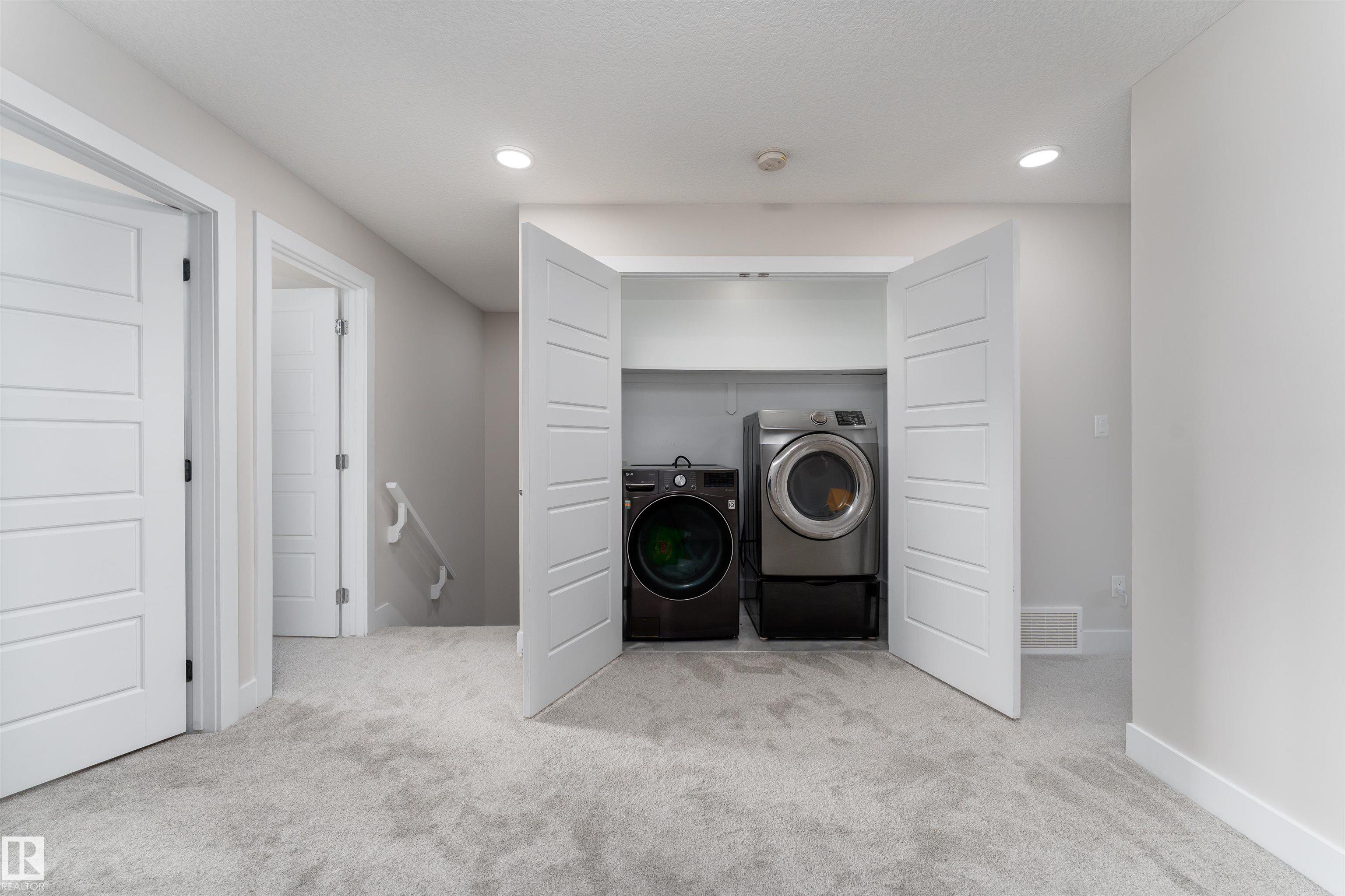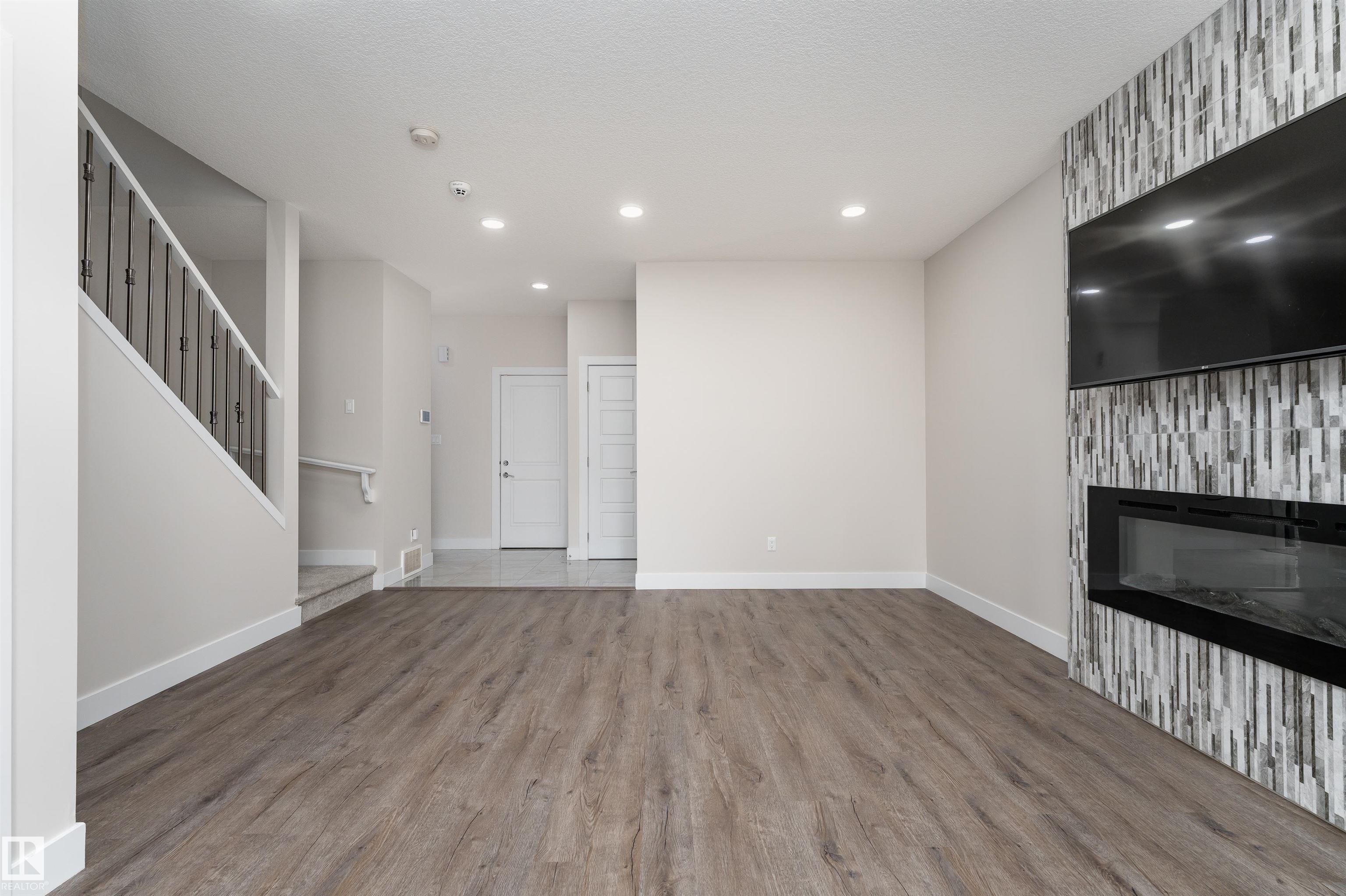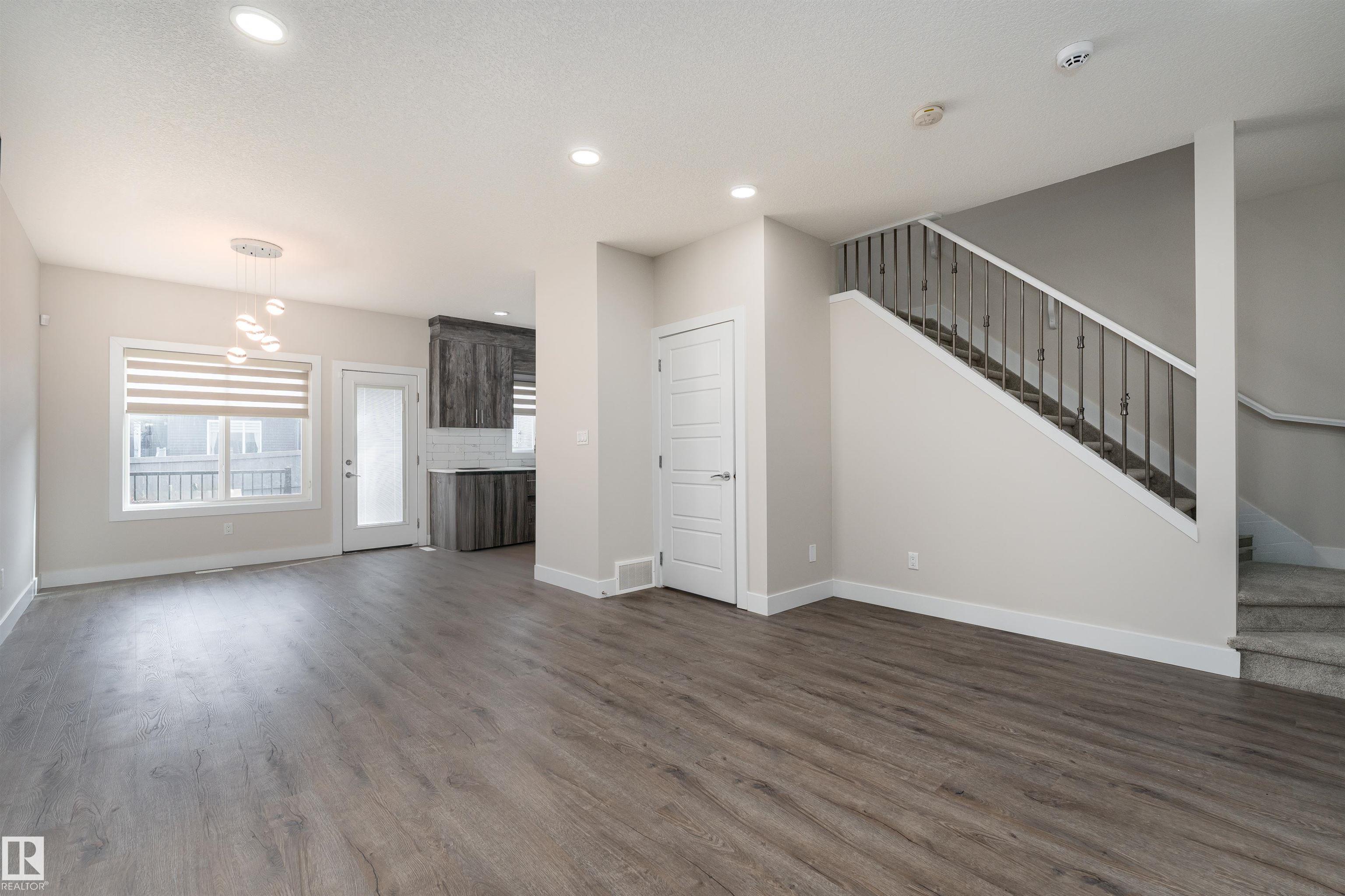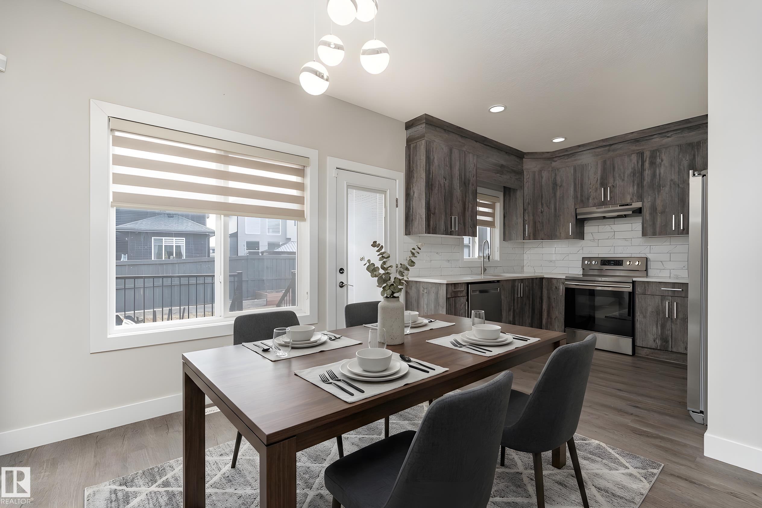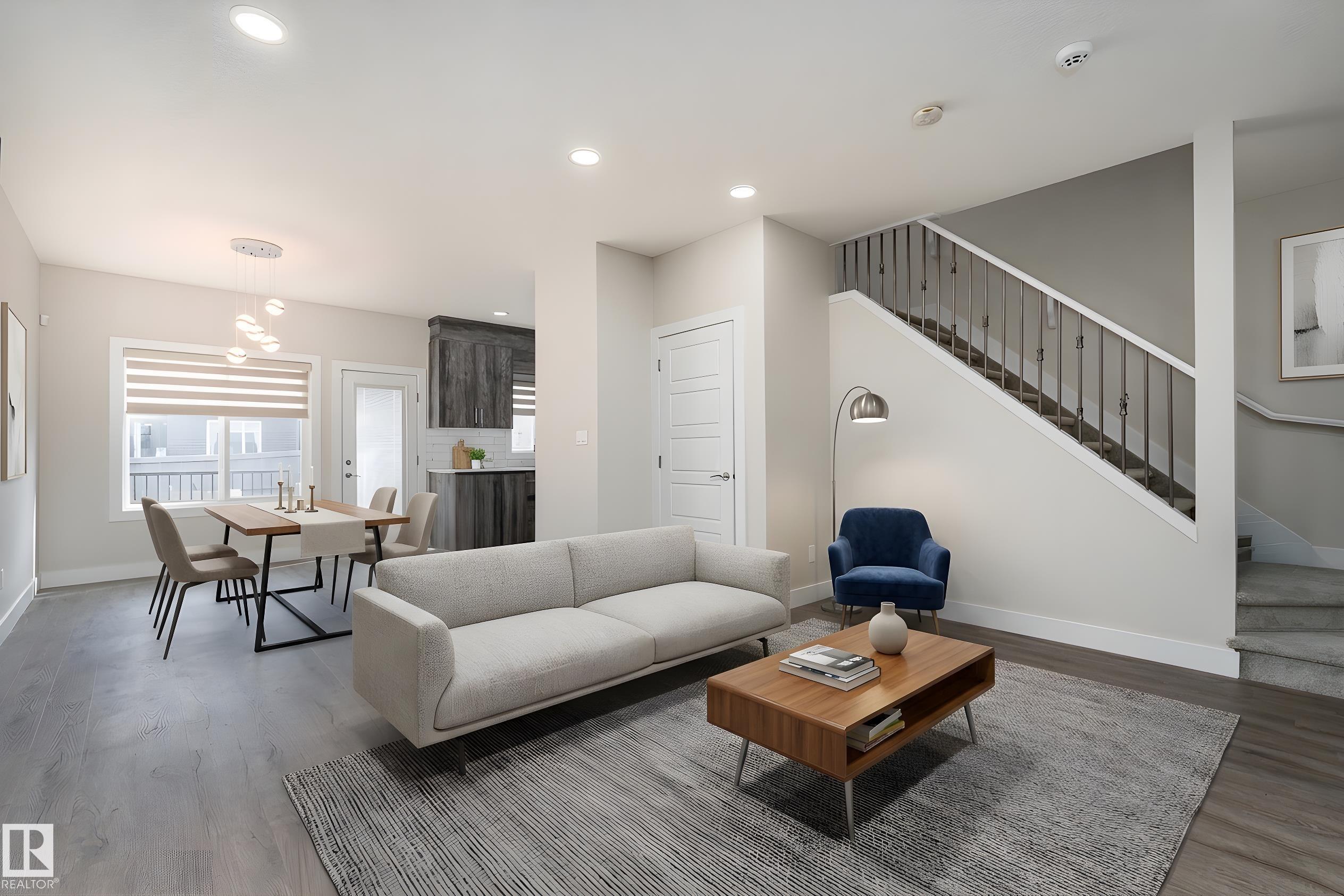 Be inspired by this modern and vibrant half duplex in McConachie with a double attached garage and over 2200 sq ft of living space designed for a growing family. The open concept main floor features a spacious living room centered around an electric fireplace with floor to ceiling tile. The kitchen showcases beautiful cabinetry, white quartz countertops, and brand new stainless steel appliances, all next to a dining nook that comfortably seats six. A two piece bath completes the main level. Upstairs offers a versatile bonus room, a large primary suite with a four piece ensuite and walk in closet with custom shelving, plus two more bedrooms, another full bath, and convenient upper laundry. The fully finished basement has a separate SIDE entrance, a bedroom, full bath, and rec space perfect for guests or future suite potential. Enjoy a landscaped yard with a deck. Freshly painted and move in ready.