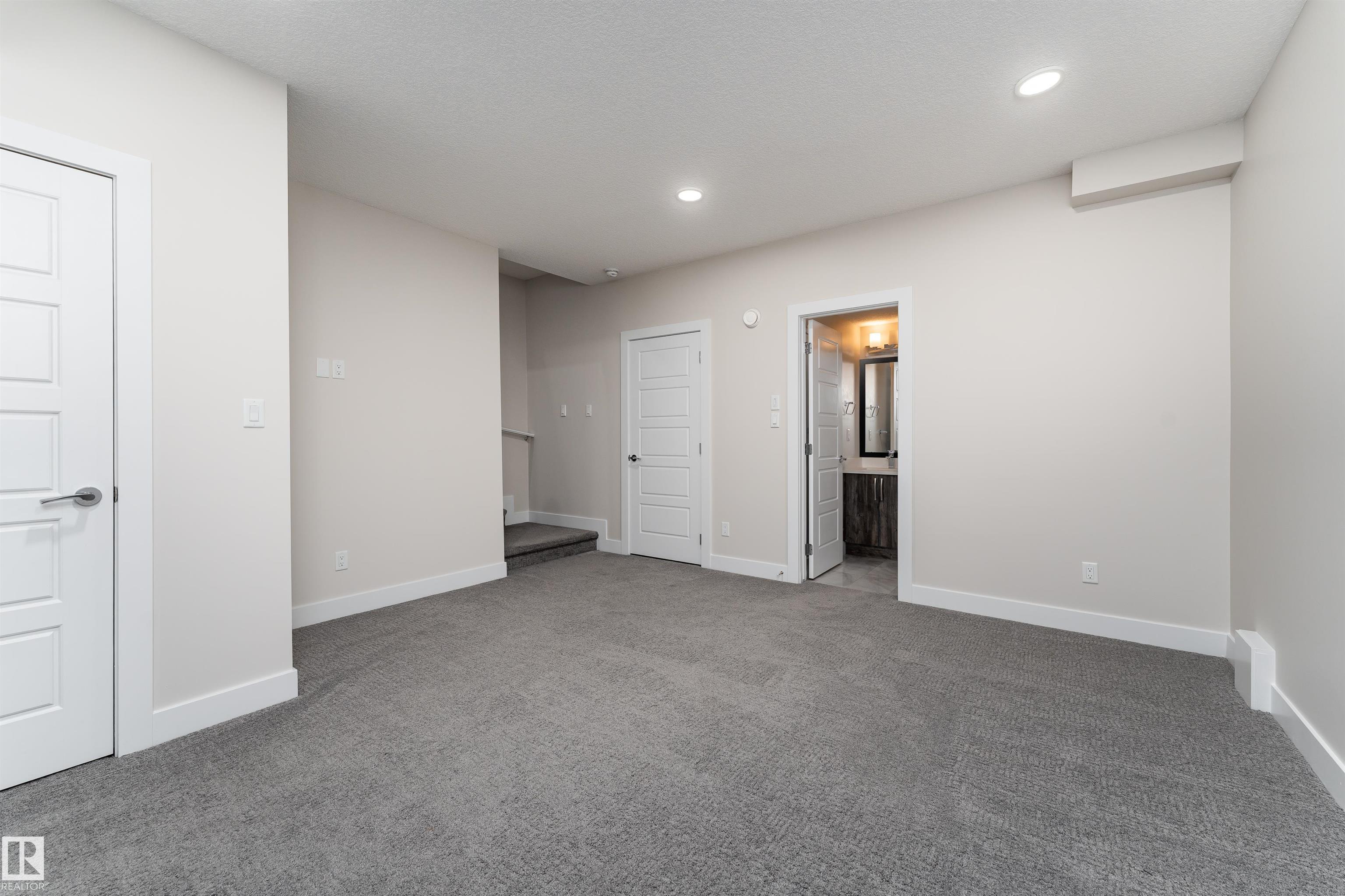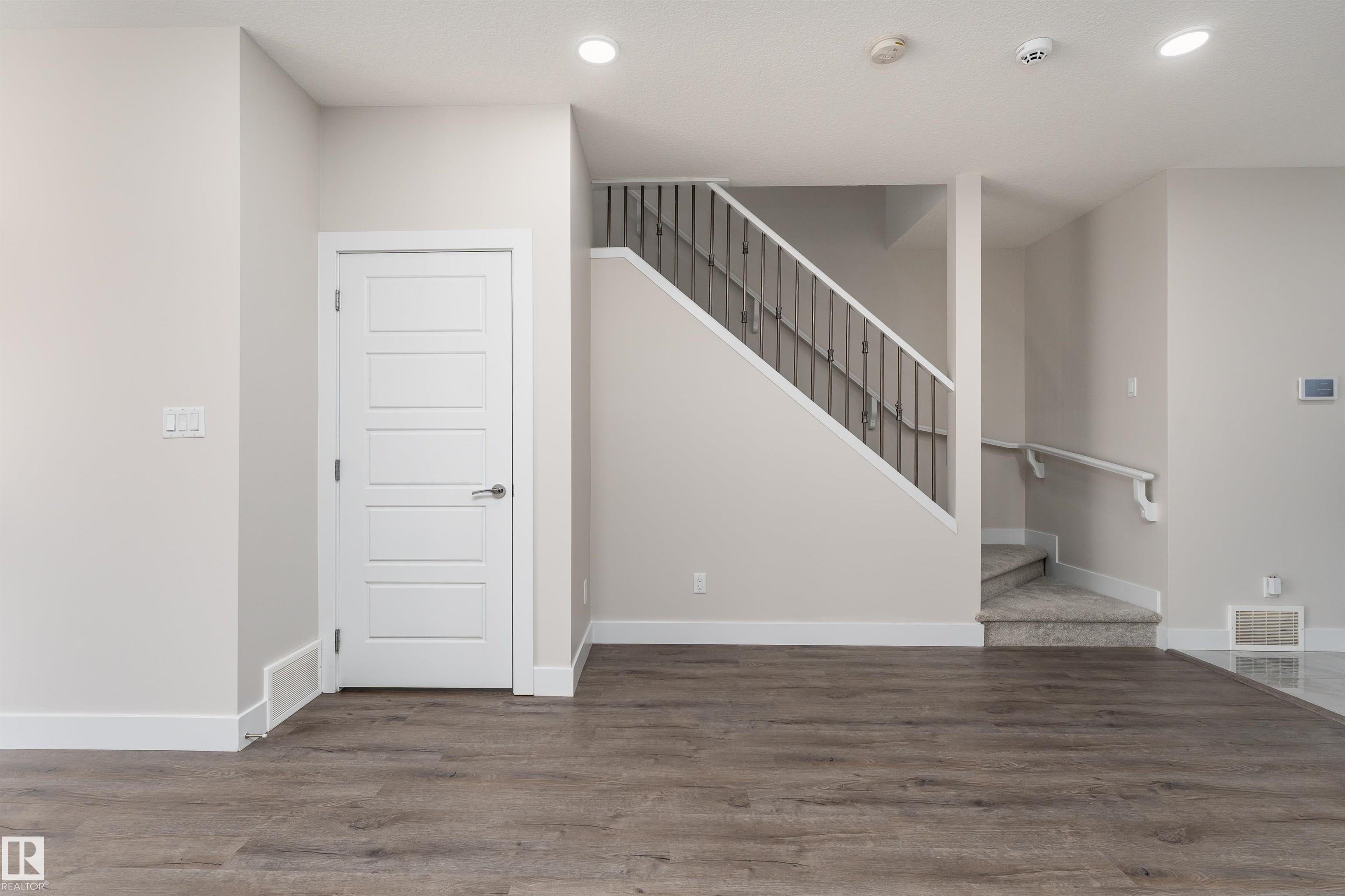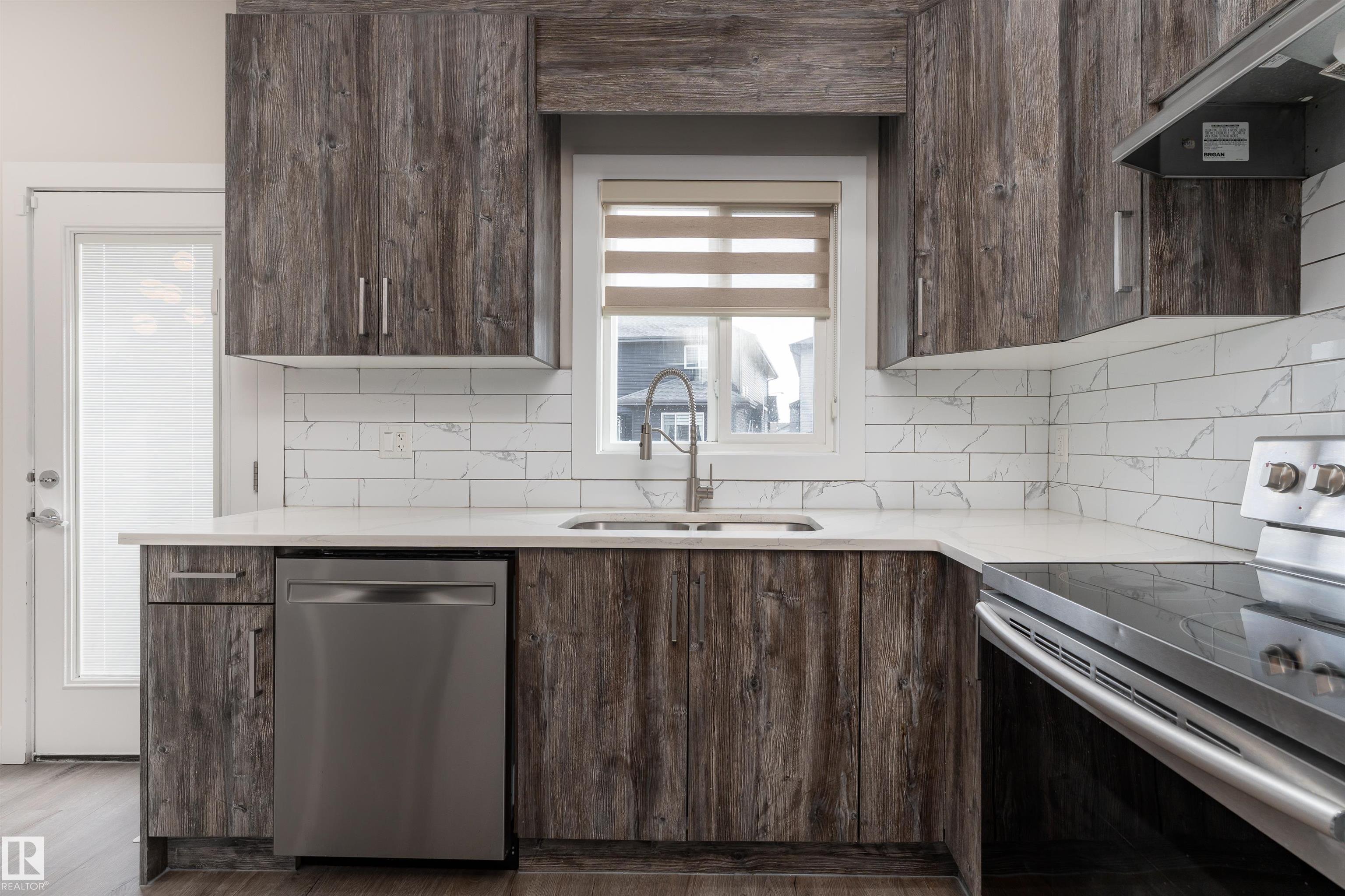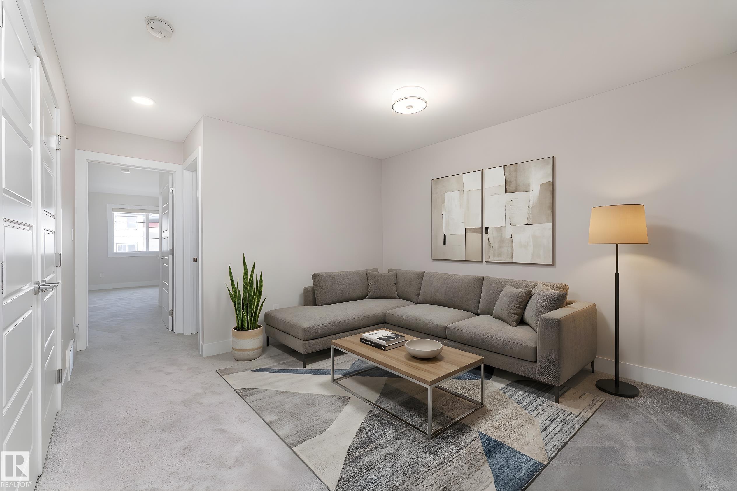 Be inspired by this modern and vibrant half duplex in McConachie with a double attached garage and over 2200 sq ft of living space designed for a growing family. The open concept main floor features a spacious living room centered around an electric fireplace with floor to ceiling tile. The kitchen showcases beautiful cabinetry, white quartz countertops, and brand new stainless steel appliances, all next to a dining nook that comfortably seats six. A two piece bath completes the main level. Upstairs offers a versatile bonus room, a large primary suite with a four piece ensuite and walk in closet with custom shelving, plus two more bedrooms, another full bath, and convenient upper laundry. The fully finished basement has a separate SIDE entrance, a bedroom, full bath, and rec space perfect for guests or future suite potential. Enjoy a landscaped yard with a deck. Freshly painted and move in ready.