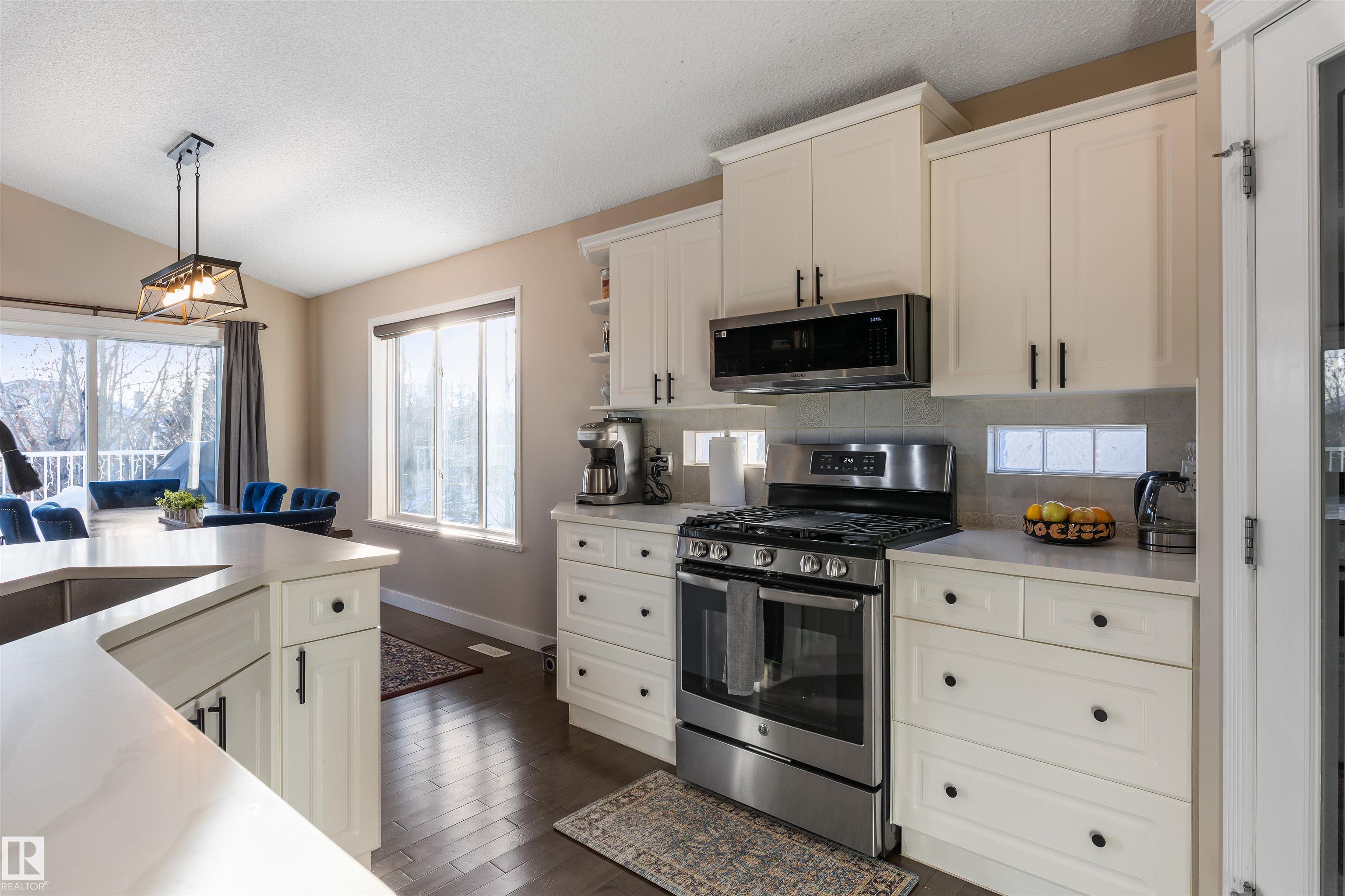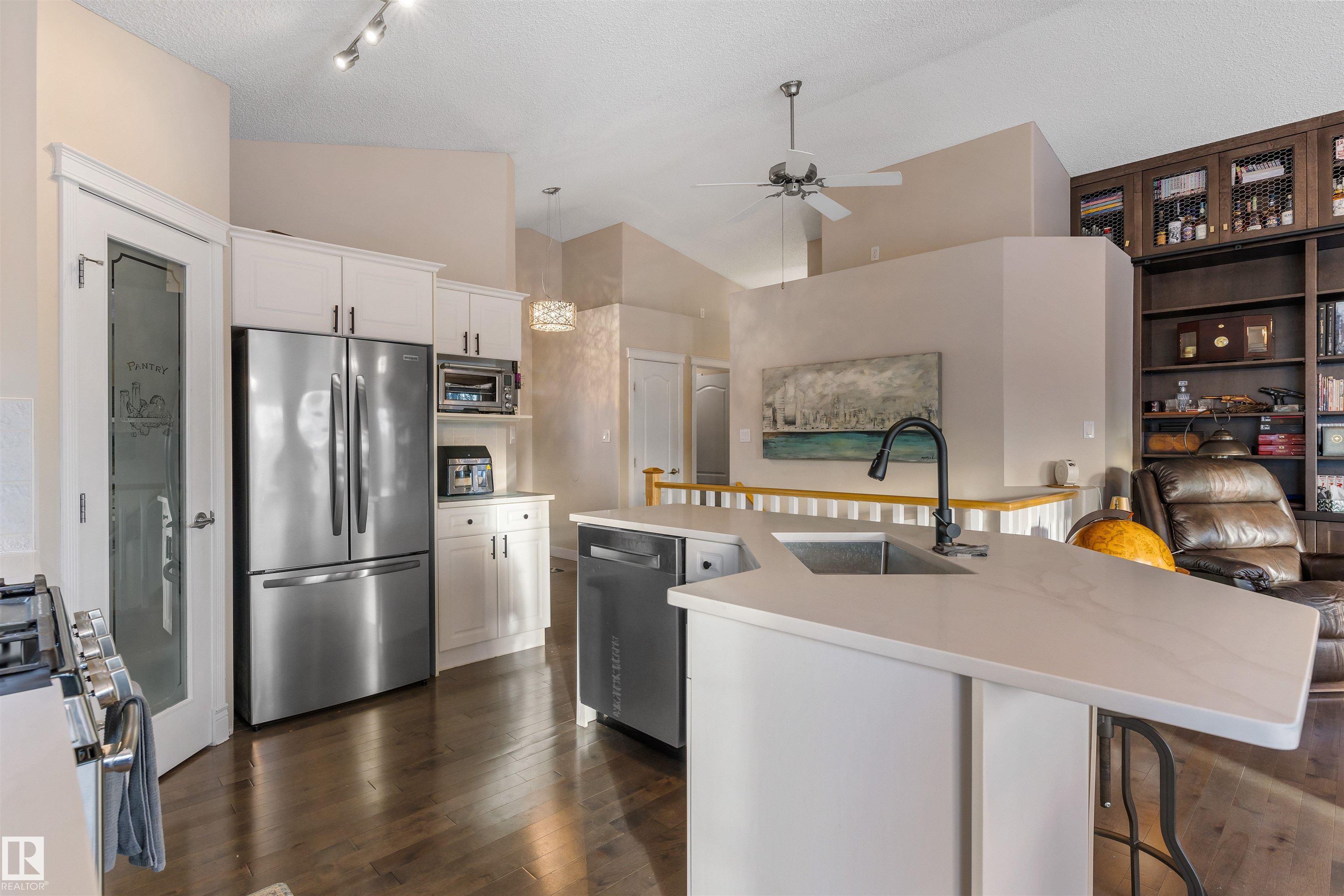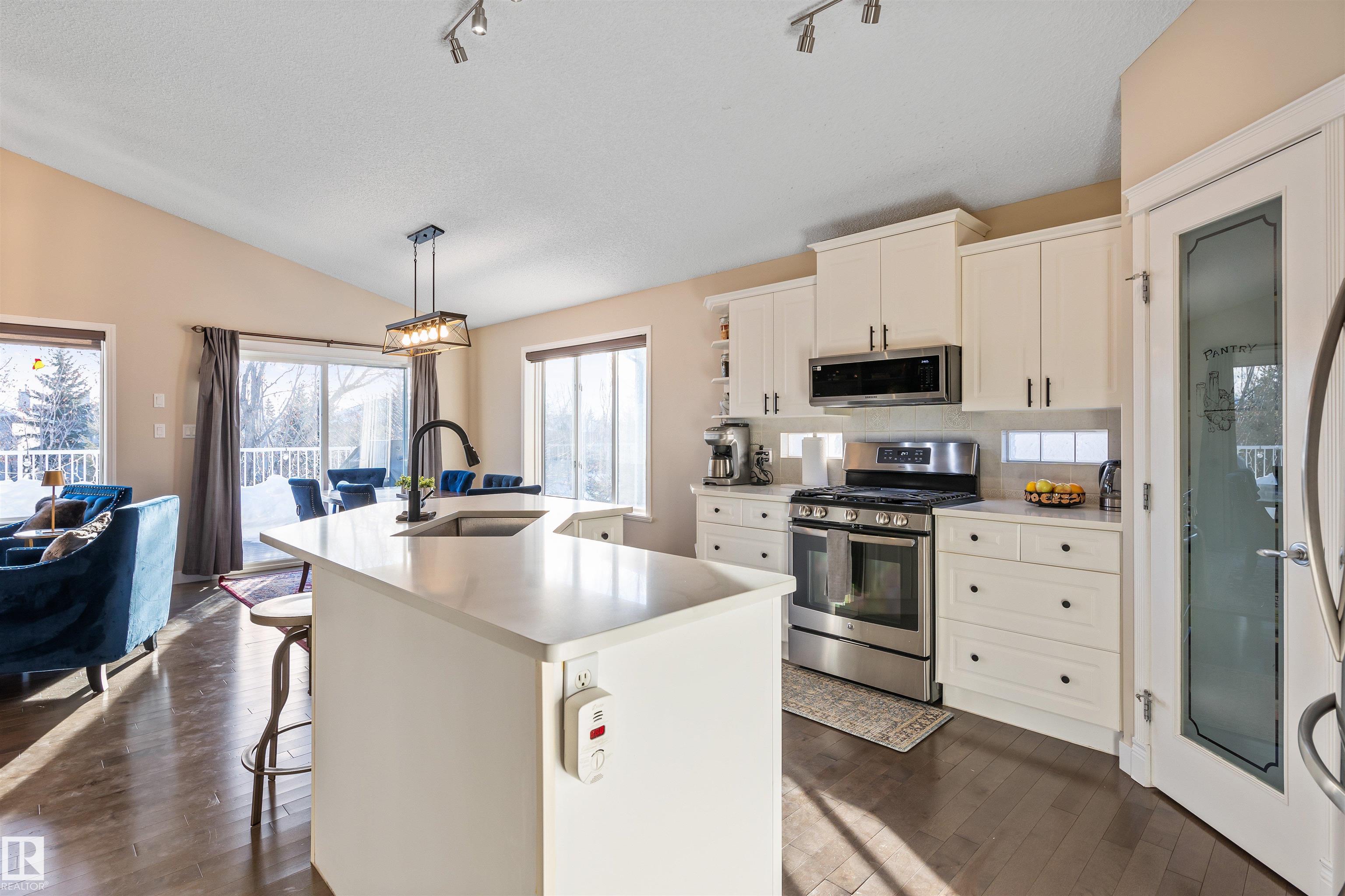 On a quiet crescent in Northridge, discover this charming WALKOUT BUNGALOW backing onto Newbury PARK. This home has great curb appeal w/ a covered front deck. The entrance welcomes guests into an OPEN DESIGN featuring a white kitchen w/ QUARTZ counters, eating bar island, corner pantry, tile backsplash, pot/pan drawers, crown moulding trim on the upper cabinets & s/s appliances. The living room has soaring VAULTED CEILINGS, a gas f/p w/ stone front, a wood mantle & a stunning library wall. The dining nook has access out to the maintenance free back deck w/ gorgeous park views. A French door leads into a front office w/ hardwood flooring which flows throughout most of the main floor. The garage entrance has the laundry facilities. There are 2 main floor bedrooms, a 4pce bath & a 3pce ensuite. The fully finished WALKOUT basement has a 2nd kitchen, family room w/ f/p, 3rd bedroom, hobby room, 4pce bath & a 2nd laundry room. A double attached OVERSIZED HEATED garage completes this excellent property!