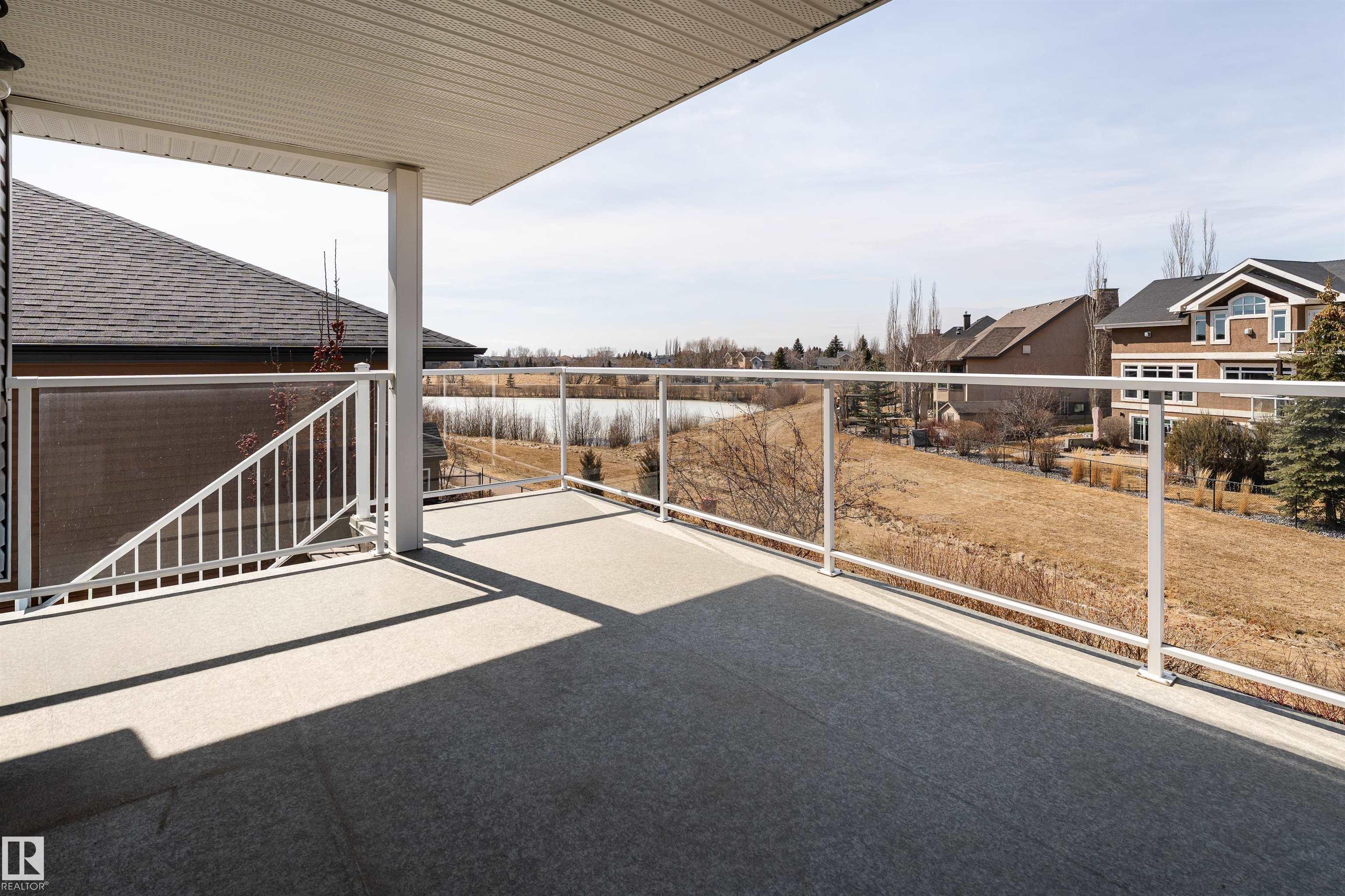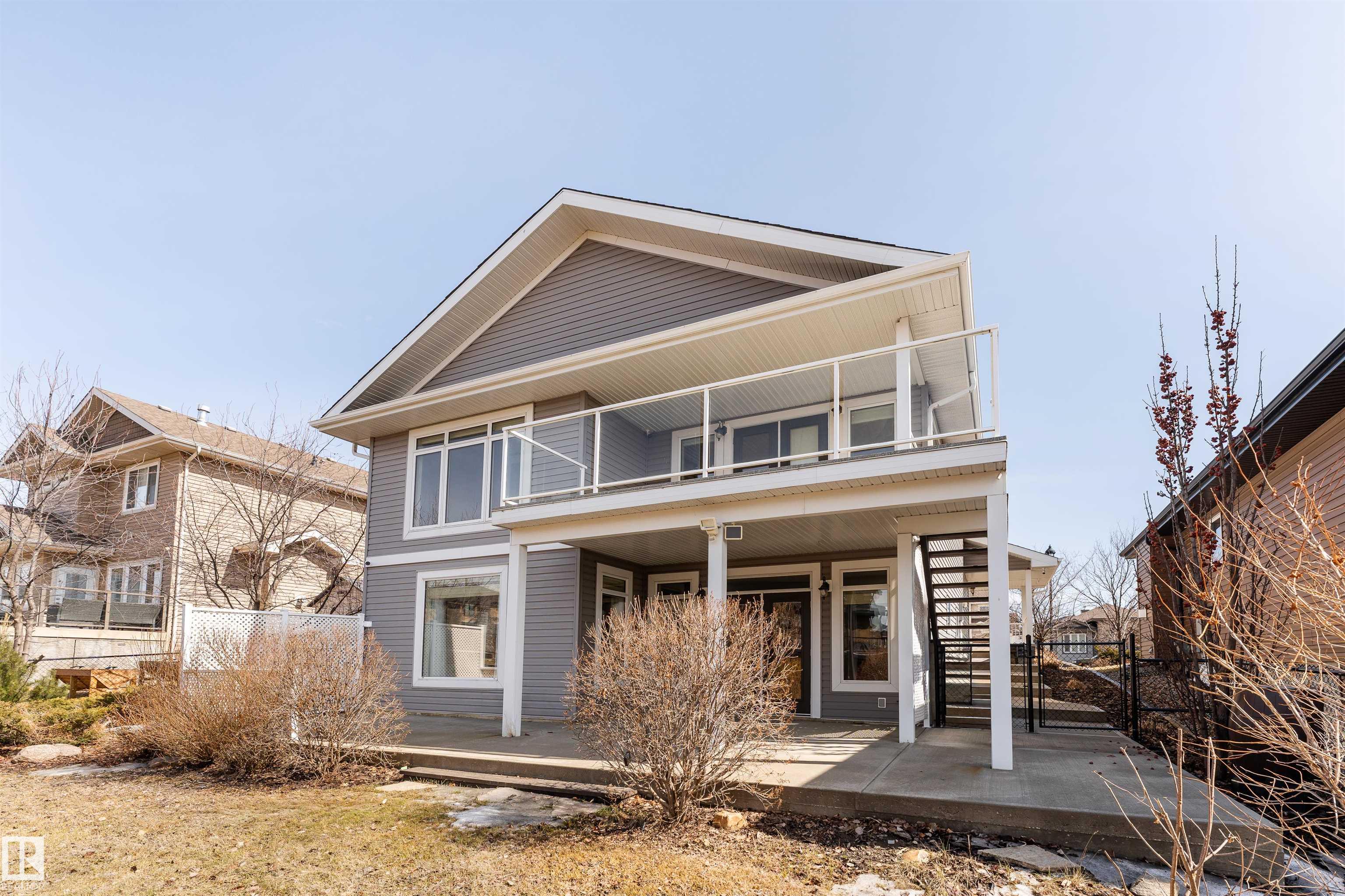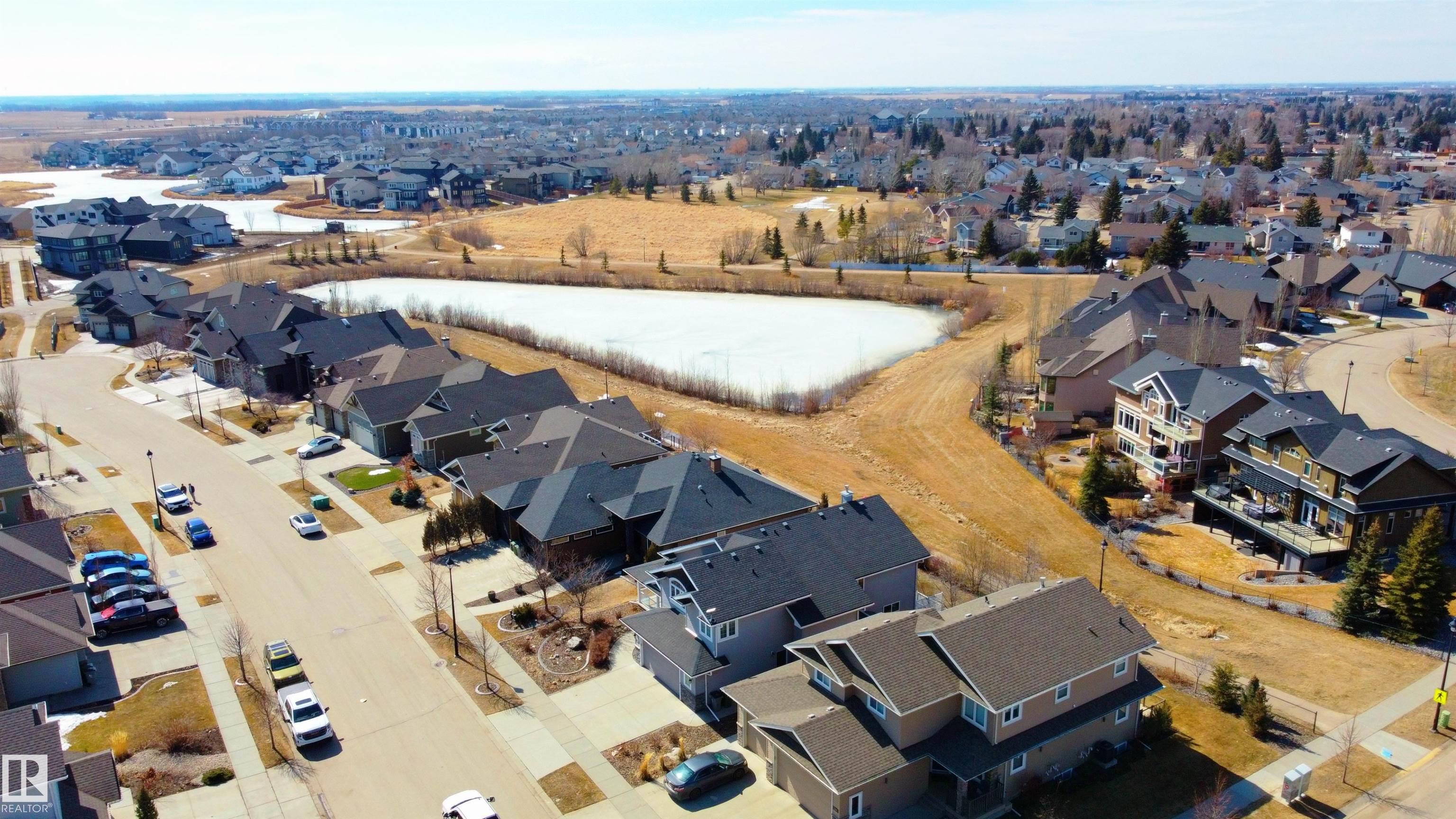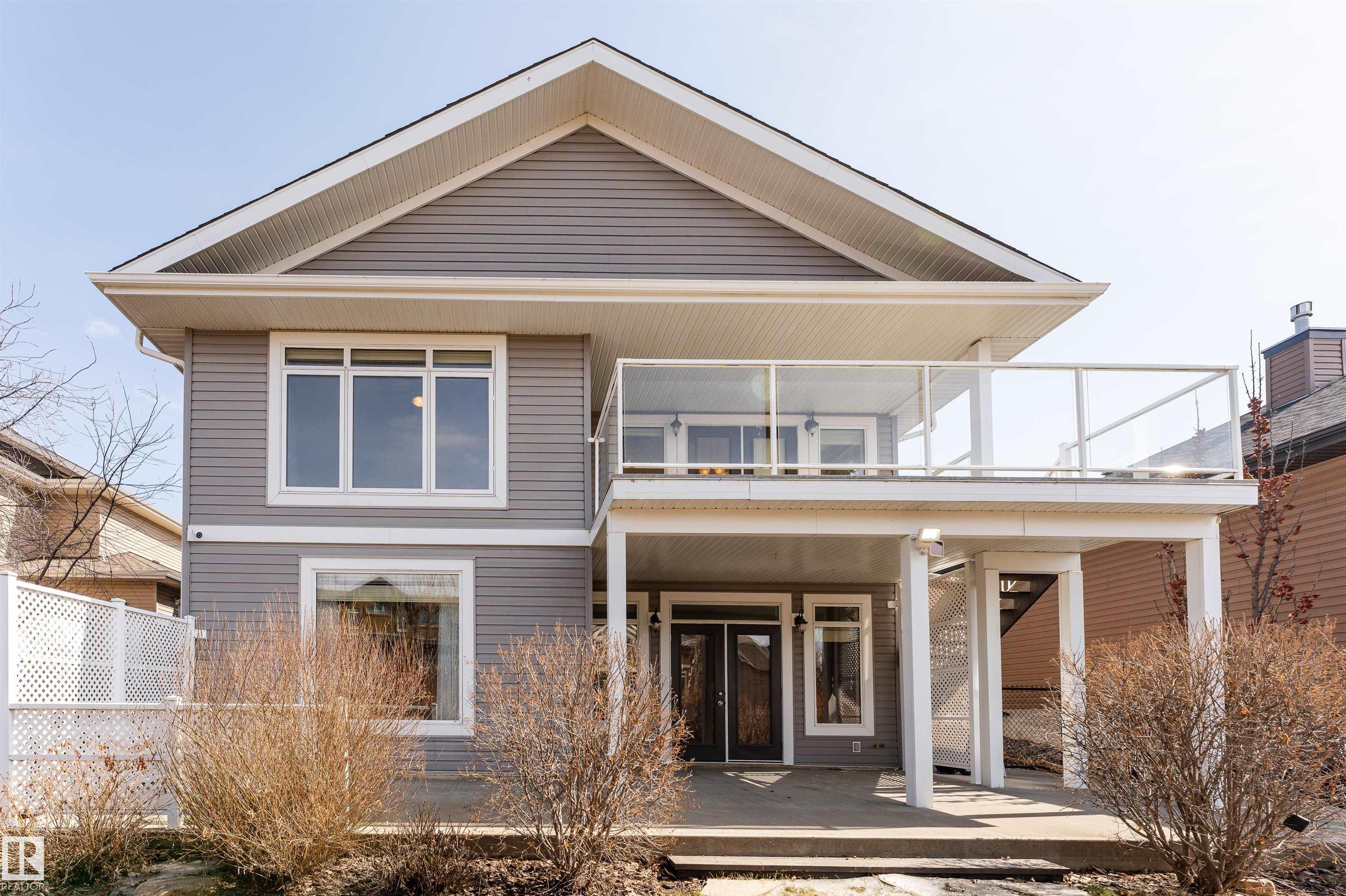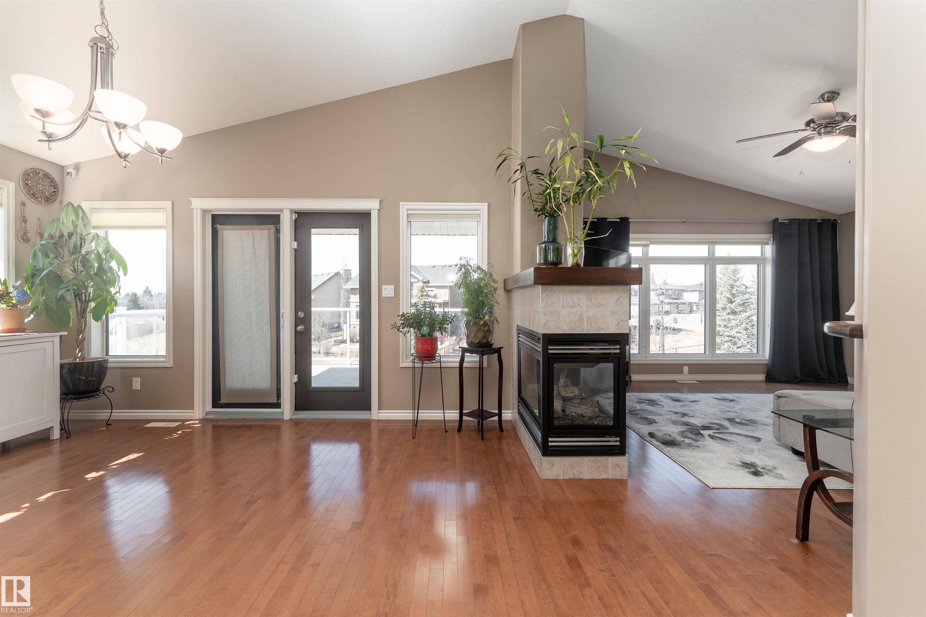 A true outdoor oasis, this luxury walk-out offers a spacious balcony, expansive patio, and prime pond-backing cul-de-sac location. This 1990 sq.ft custom Royer Homes build is meticulously maintained with an open-concept main floor with vaulted ceilings, rich hardwood floors, large windows for natural light, & a striking double-sided gas fireplace anchoring the living and dining areas. The kitchen includes granite countertops, dark cabinetry, central island with wine rack, corner pantry, and new stainless steel appliances. Offering 4 bedrooms and 3 bathrooms, including a spacious primary suite with a luxurious ensuite and soaker tub. The fully finished walk-out basement is built for entertaining with in-floor heating, large rec room, wet bar, and versatile fourth bedroom with Murphy bed. Outdoor living shines with a southwest-facing yard, landscaped grounds, lower patio, and upper balcony overlooking the pond, plus a heated, insulated double garage. A statement home in an unbeatable setting?don?t miss out!