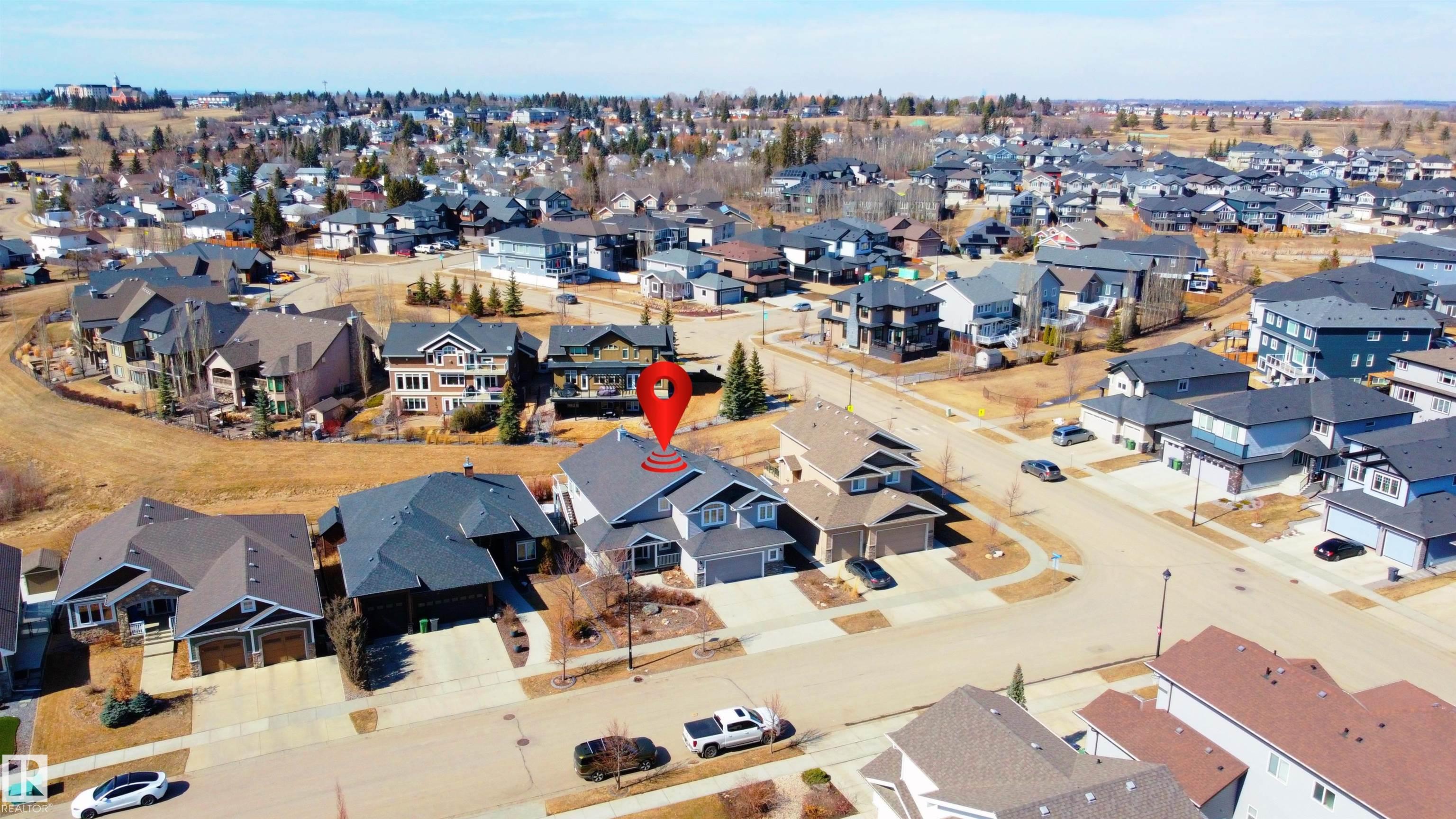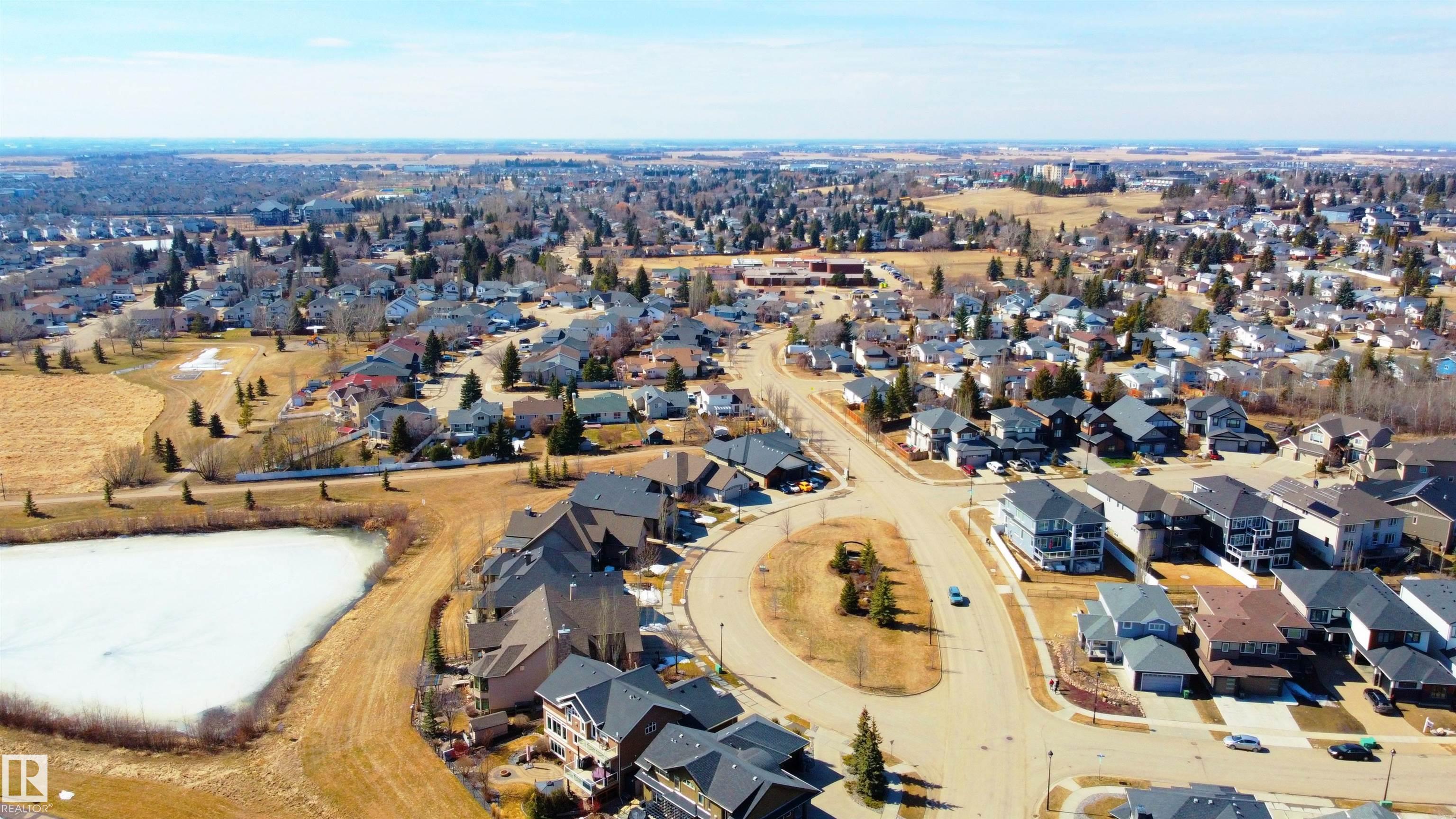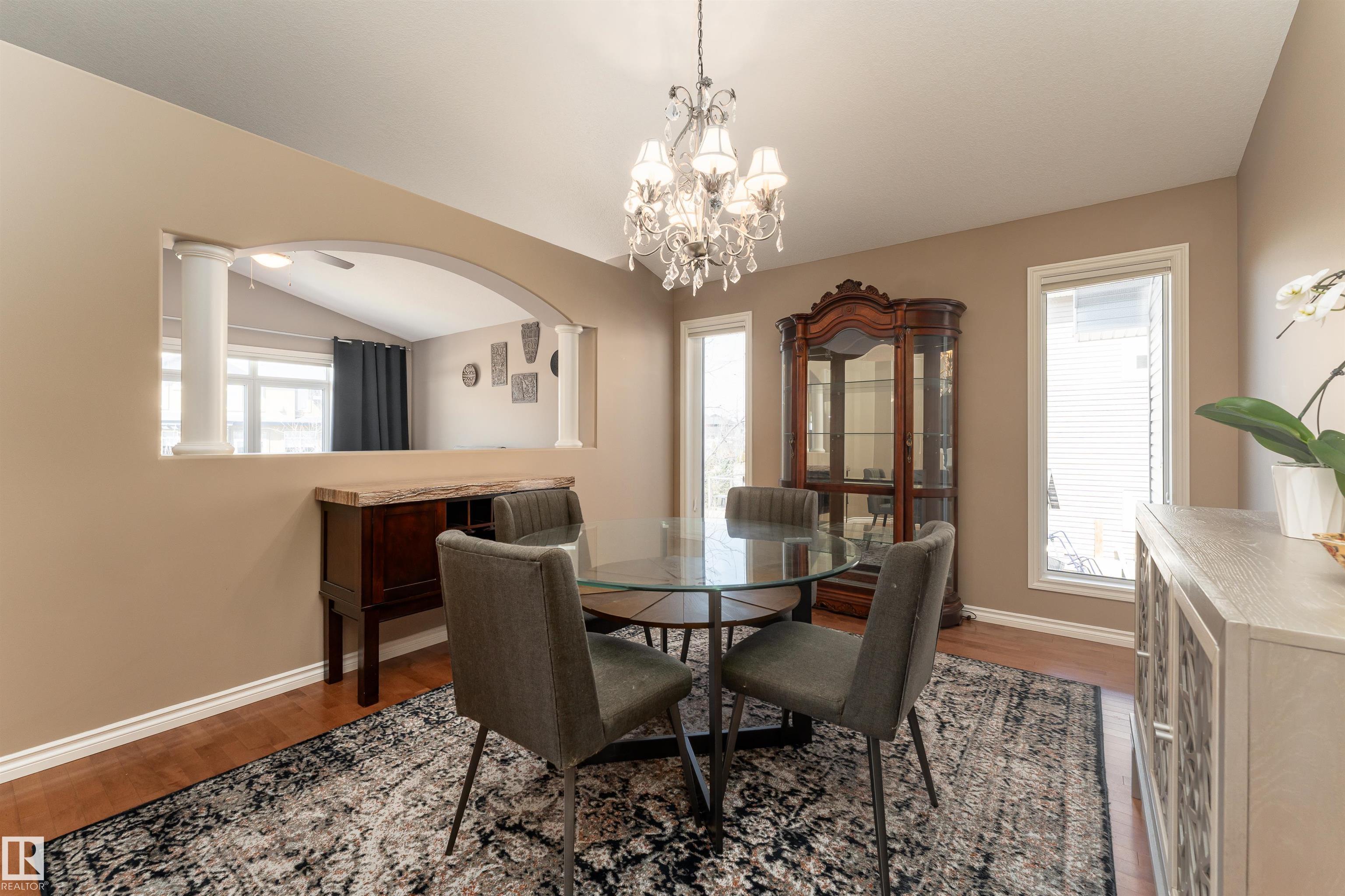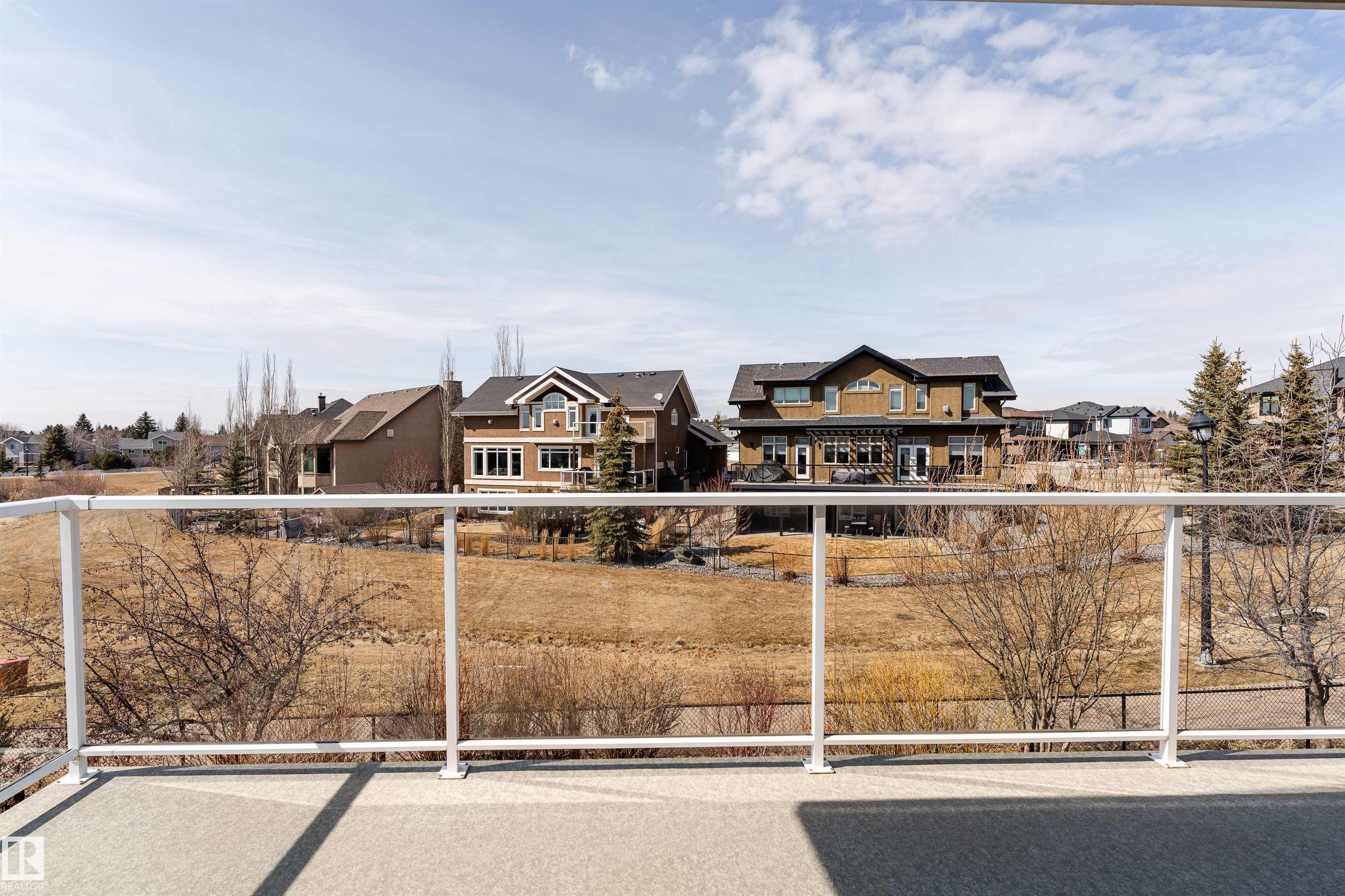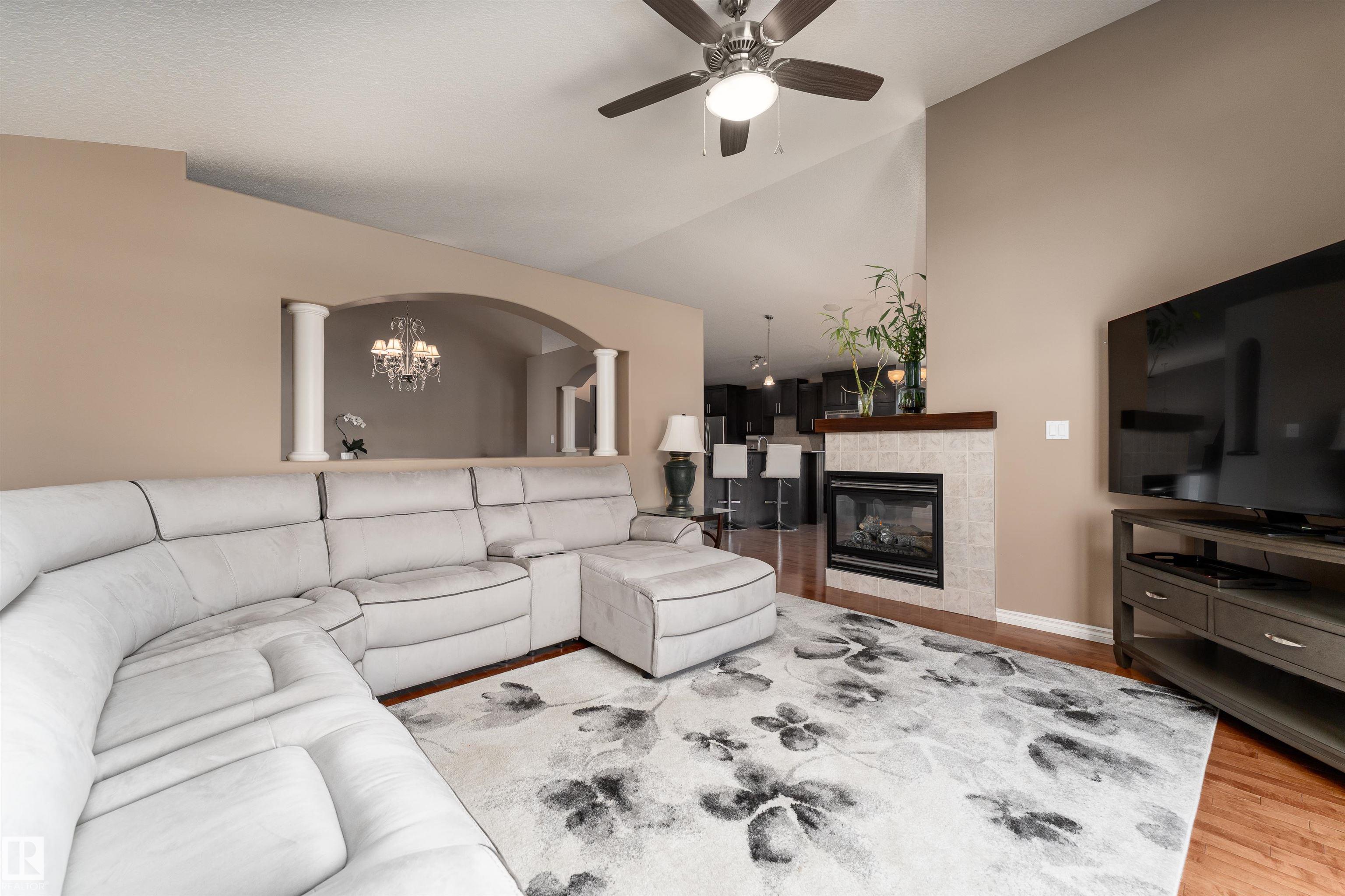 A true outdoor oasis, this luxury walk-out offers a spacious balcony, expansive patio, and prime pond-backing cul-de-sac location. This 1990 sq.ft custom Royer Homes build is meticulously maintained with an open-concept main floor with vaulted ceilings, rich hardwood floors, large windows for natural light, & a striking double-sided gas fireplace anchoring the living and dining areas. The kitchen includes granite countertops, dark cabinetry, central island with wine rack, corner pantry, and new stainless steel appliances. Offering 4 bedrooms and 3 bathrooms, including a spacious primary suite with a luxurious ensuite and soaker tub. The fully finished walk-out basement is built for entertaining with in-floor heating, large rec room, wet bar, and versatile fourth bedroom with Murphy bed. Outdoor living shines with a southwest-facing yard, landscaped grounds, lower patio, and upper balcony overlooking the pond, plus a heated, insulated double garage. A statement home in an unbeatable setting?don?t miss out!