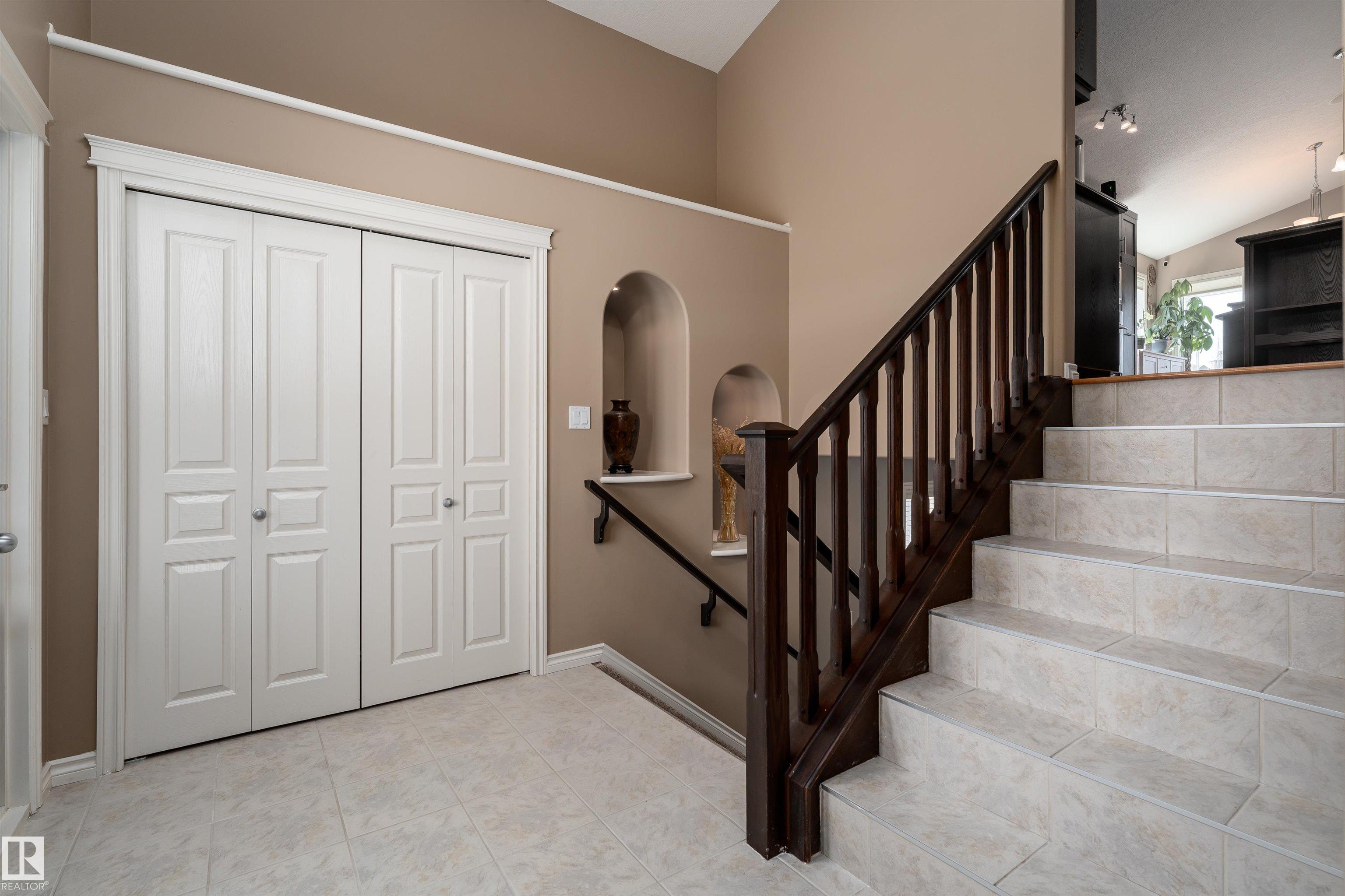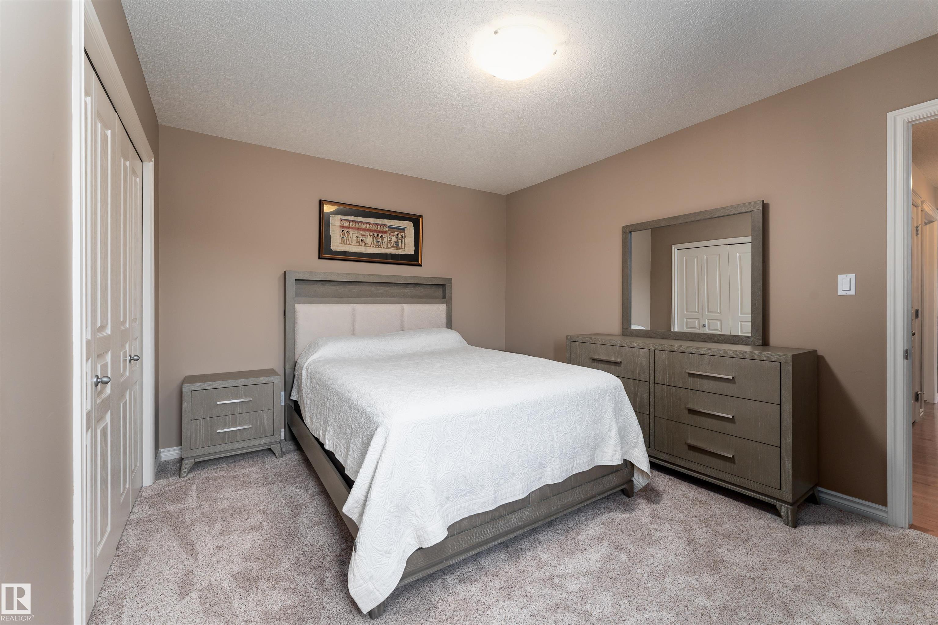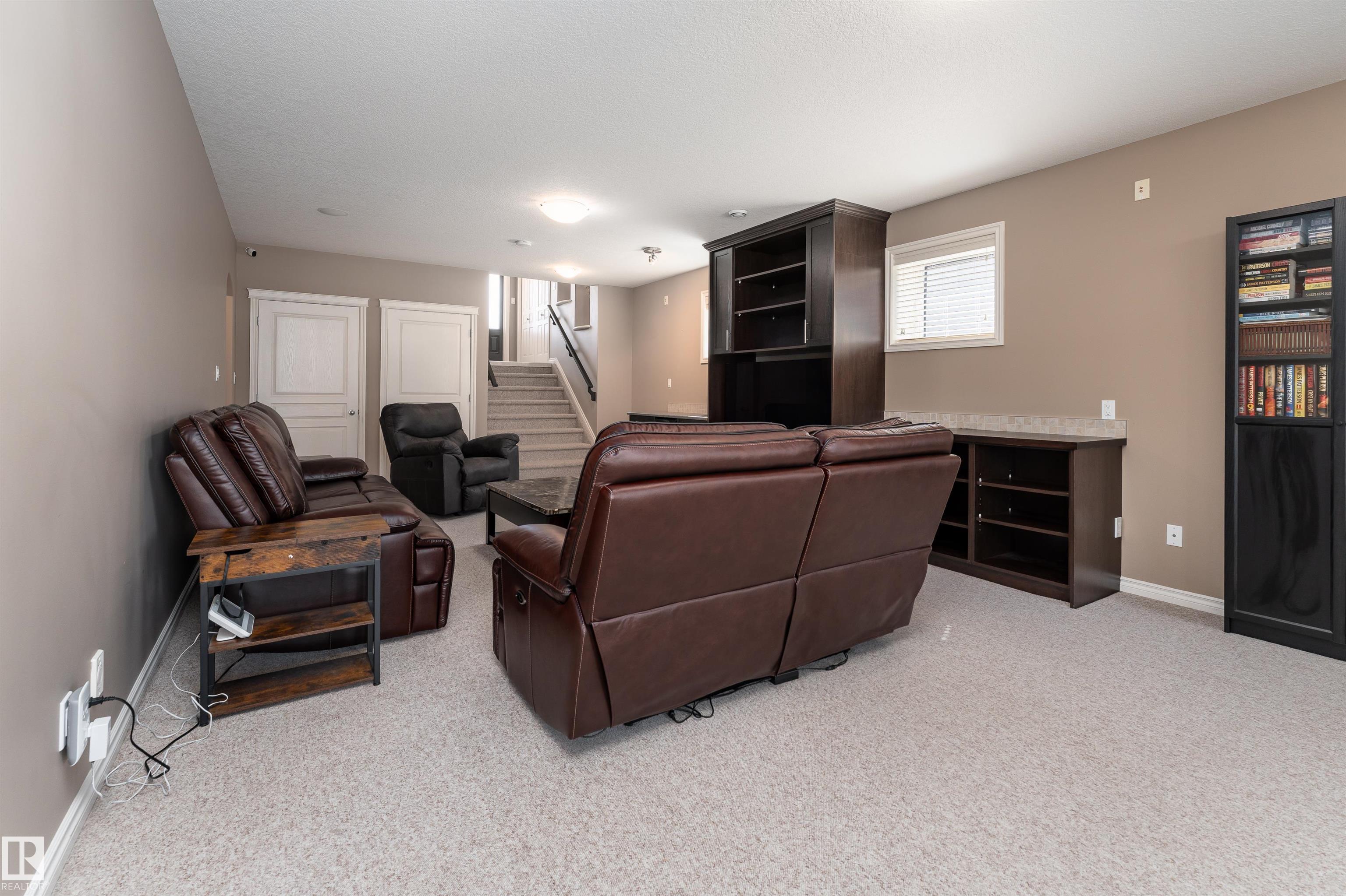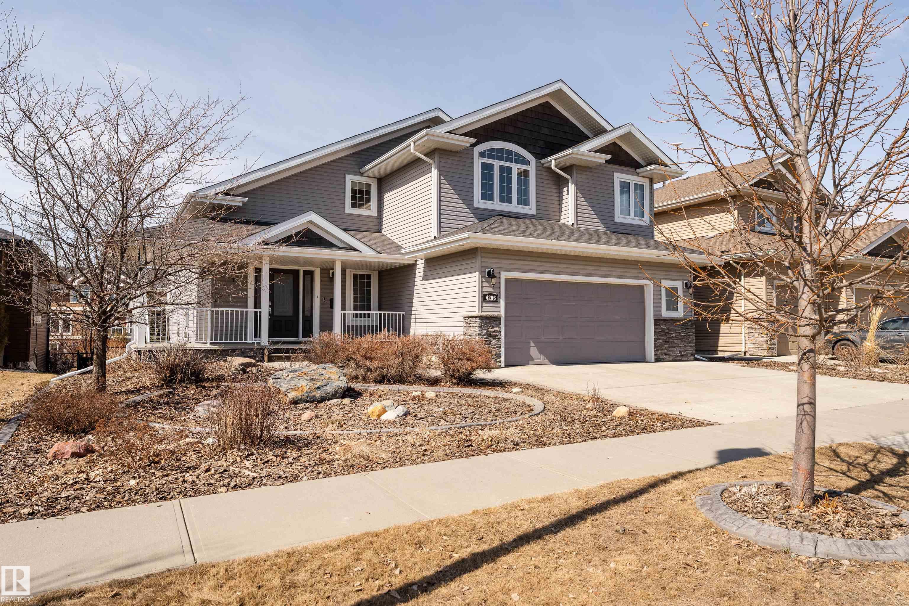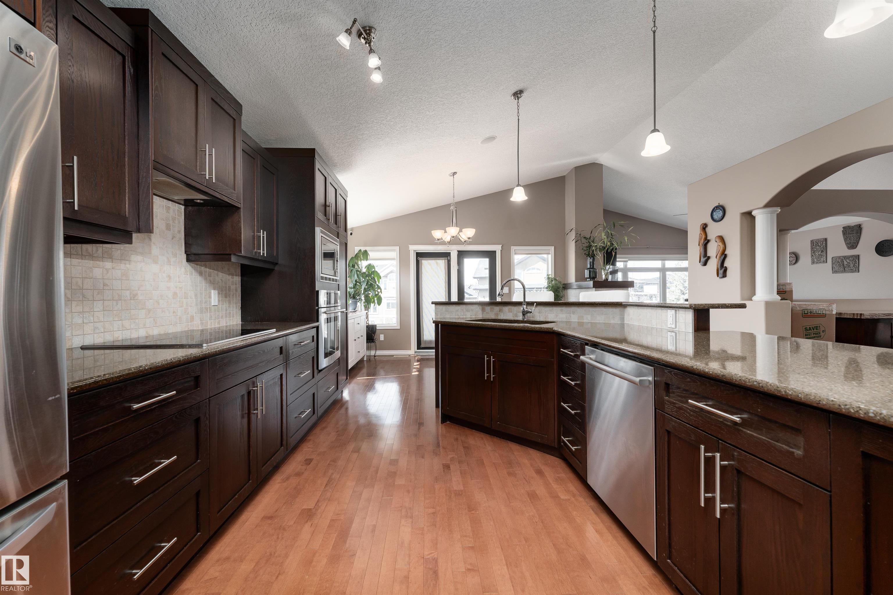 A true outdoor oasis, this luxury walk-out offers a spacious balcony, expansive patio, and prime pond-backing cul-de-sac location. This 1990 sq.ft custom Royer Homes build is meticulously maintained with an open-concept main floor with vaulted ceilings, rich hardwood floors, large windows for natural light, & a striking double-sided gas fireplace anchoring the living and dining areas. The kitchen includes granite countertops, dark cabinetry, central island with wine rack, corner pantry, and new stainless steel appliances. Offering 4 bedrooms and 3 bathrooms, including a spacious primary suite with a luxurious ensuite and soaker tub. The fully finished walk-out basement is built for entertaining with in-floor heating, large rec room, wet bar, and versatile fourth bedroom with Murphy bed. Outdoor living shines with a southwest-facing yard, landscaped grounds, lower patio, and upper balcony overlooking the pond, plus a heated, insulated double garage. A statement home in an unbeatable setting?don?t miss out!