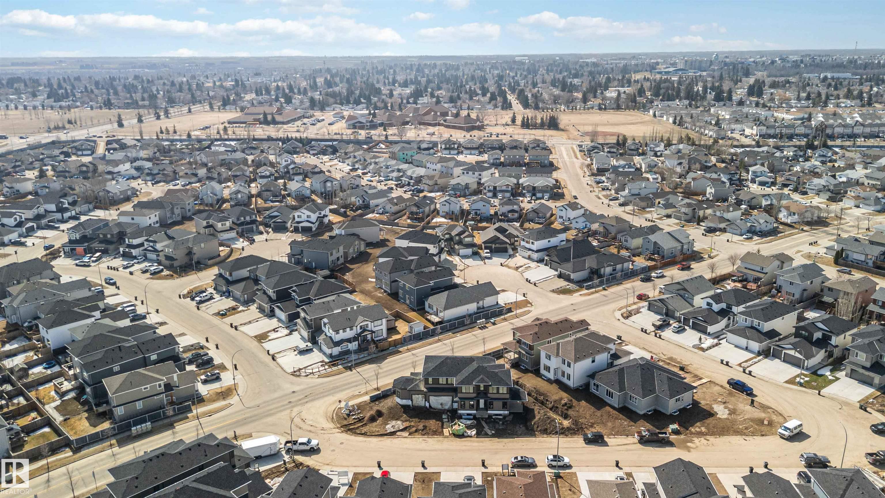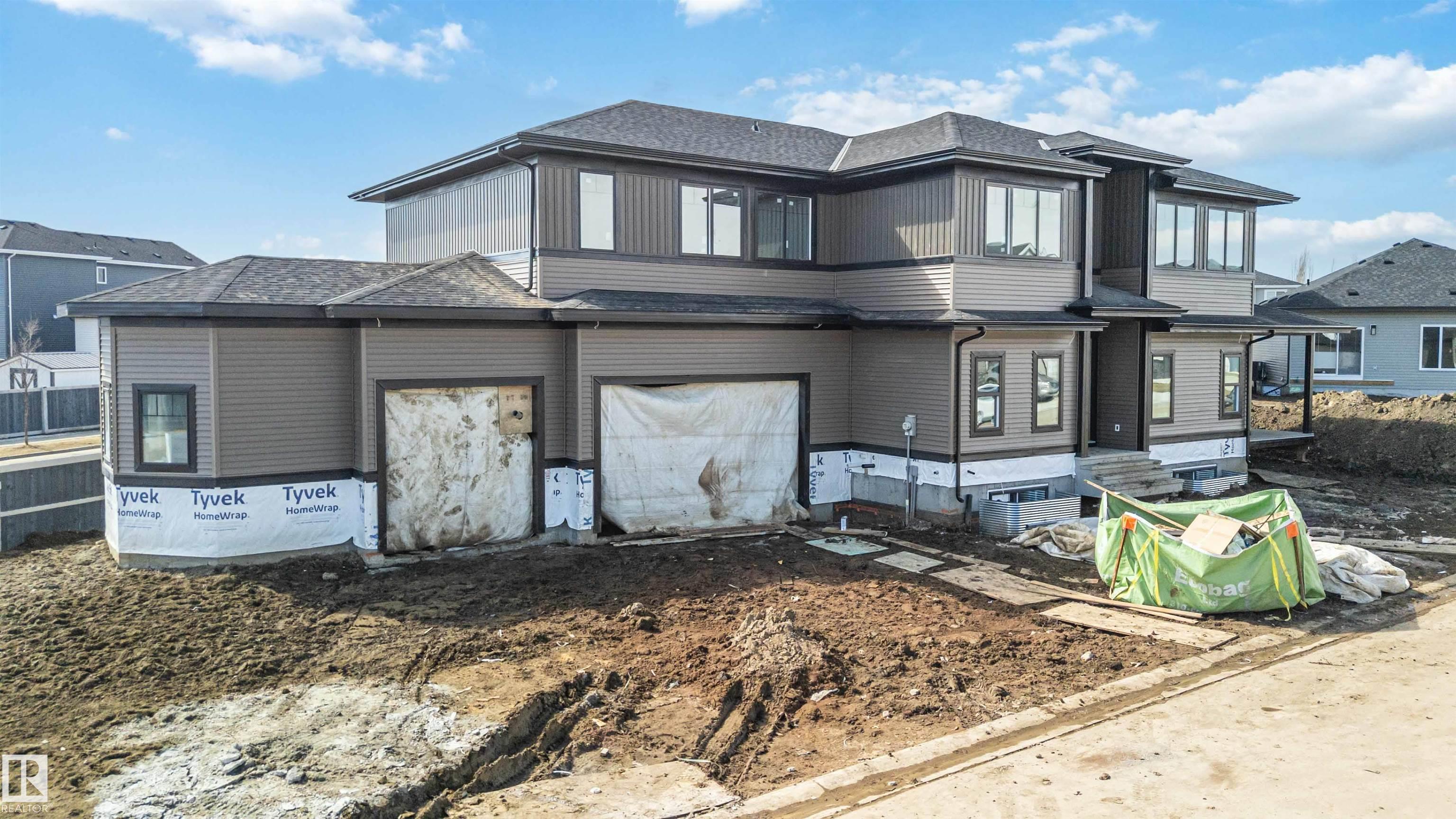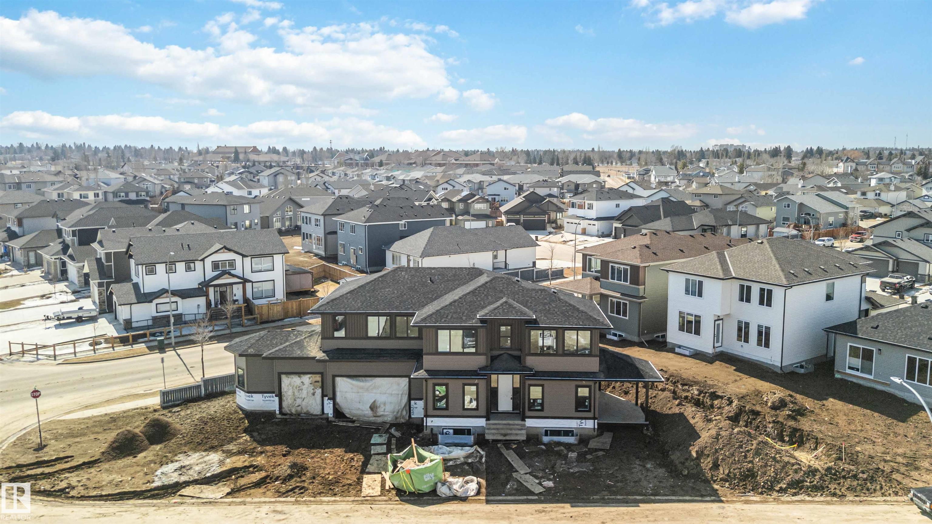 BRAND NEW! GRAND MANOR LIKE Home by local builder LCM Construction, is located on a large corner lot in Hilldowns Spruce Grove! This timeless 2,972 Sq.ft luxury 2-storey home offers presence w/ curb appeal, toasted almond & urban bronze vinyl exterior, black window & door trim, black garage doors, stamped concrete & accent stone. The 3.5 car garage has epoxy flooring, electrical panel & high ceilings for a lift. The main floor w/9 ft ceilings, LVP flooring, flex/office room, mudroom w/built-in bench, 20 ft open-to-below ballroom living room w/ feature wall & 3 sided fireplace, kitchen w/ 9.5 long quartz island, barn style sink, spice kitchen w/sink & beverage cooler, walkthrough pantry, SS built-in appliances, black fixtures & hardware. Upstairs offers an open bonus room, laundry room w/quartz countertop & sink, 3 spacious beds, & private primary bed w/ 5-piece ensuite w/ heated floor, fireplace, 7' soaker tub, enclosed toilet, & large walkthrough closet. Bonus large covered deck & separate grilling deck.