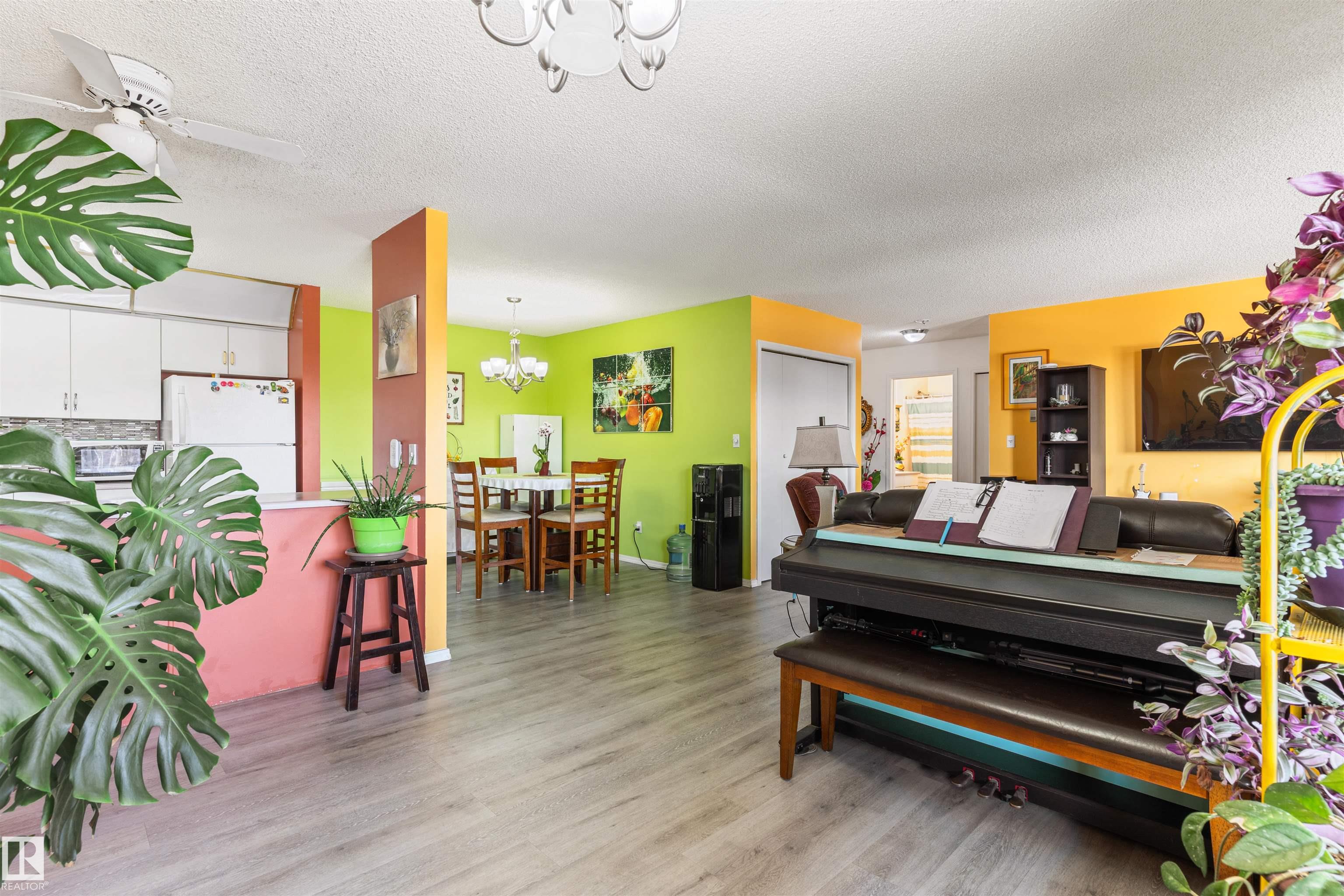 Beautiful 2-bedroom, 2-bath top-floor condo offering a spacious open-concept layout, ideally located just minutes from West Edmonton Mall and a wide range of amenities. This bright and inviting unit features a large entrance, a sun-filled living room with abundant natural light, and a well-appointed kitchen with tasteful backsplash. The generous primary bedroom includes the en-suite bathroom, while the second bedroom is also a great size?perfect for guests, a home office, or family. Recent upgrades include newer flooring in the living and dining areas (approx. 2024), along with updated backsplash and light fixtures (approx. 5 years ago). Additional features include in-suite storage and a functional layout designed for comfortable living. There is also an assigned parking stall. Enjoy access to excellent building amenities, including a swimming pool, jacuzzi, sauna, and exercise room?adding convenience and lifestyle appeal to this fantastic condo.